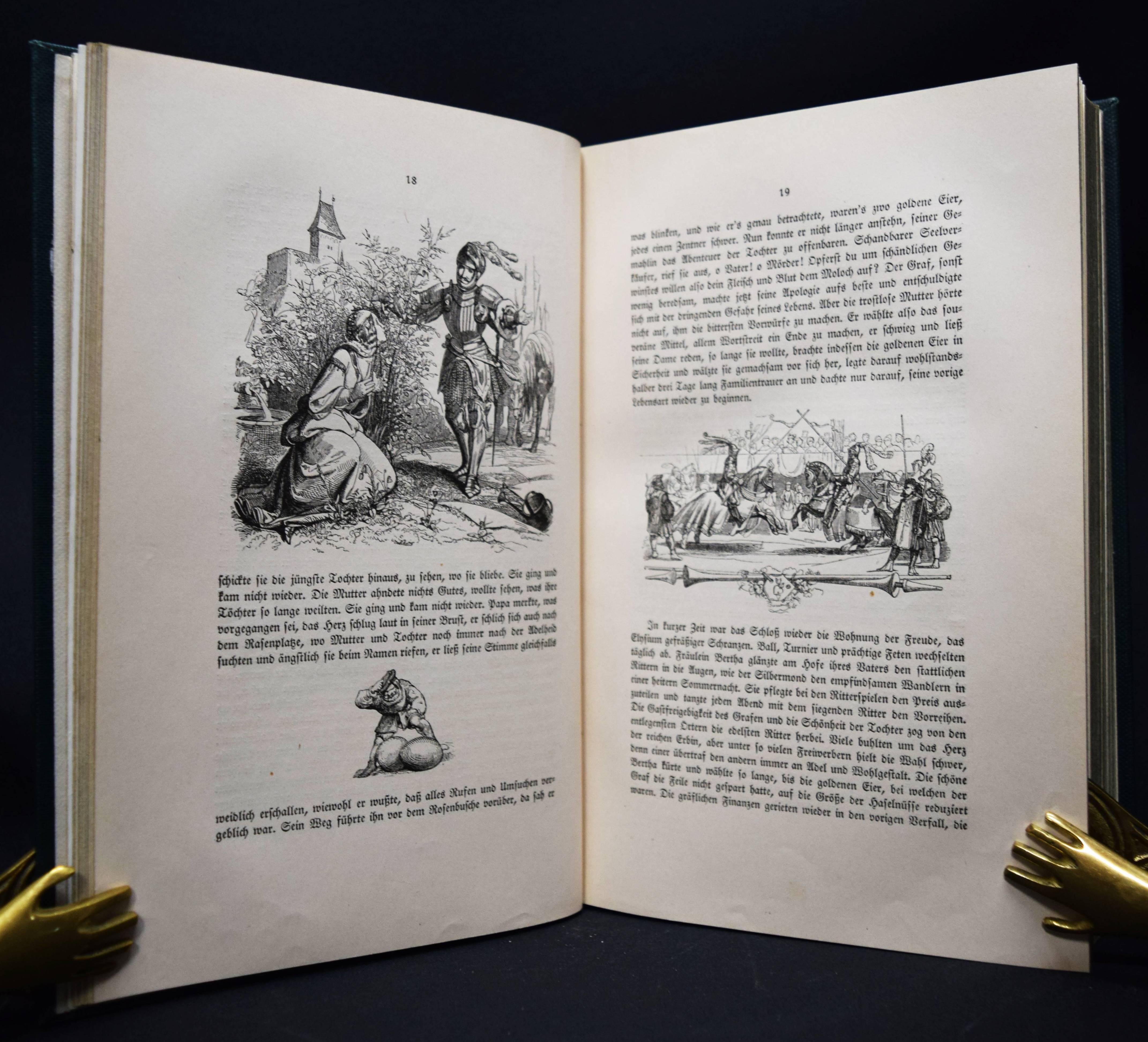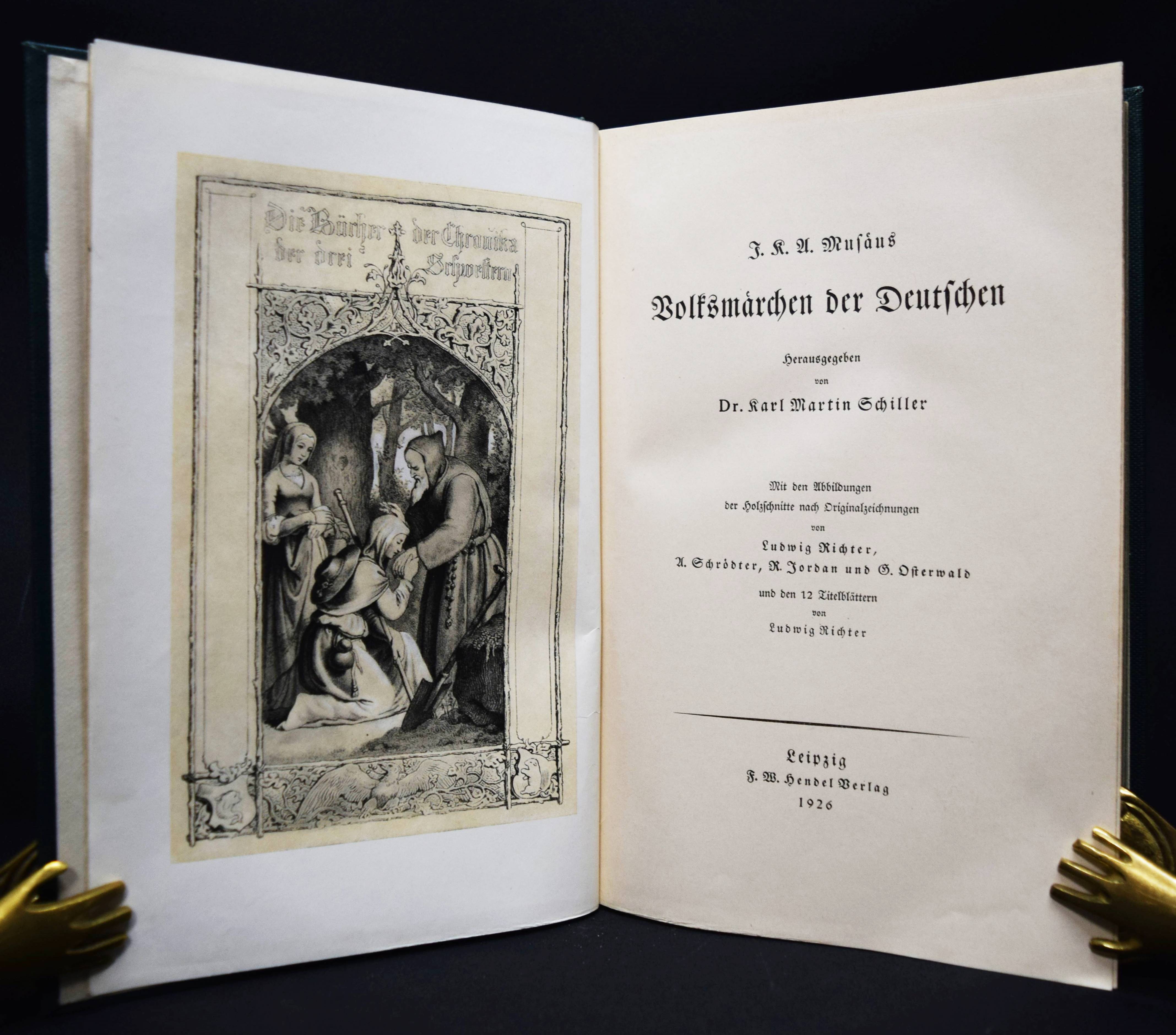 Musäus, J(ohann) K(arl) A(ugust). Volksmärchen der Deutschen. Herausgegeben von Karl Martin Schiller. Leipzig, F. W. Hendel 1926. 4°. XVII, 1 Bl., 642 S., 1 Bl. mit zahlr. Textillustr. von L. Richter, A. Schrödter, R. Jordan und G. Osterwald sowie 12 Tafeln mit Illustr. von L. Richter. Orig.-Leinenband mit goldgepr. Deckel-Vignette und Rückenvergoldung. Gutes Exemplar.
