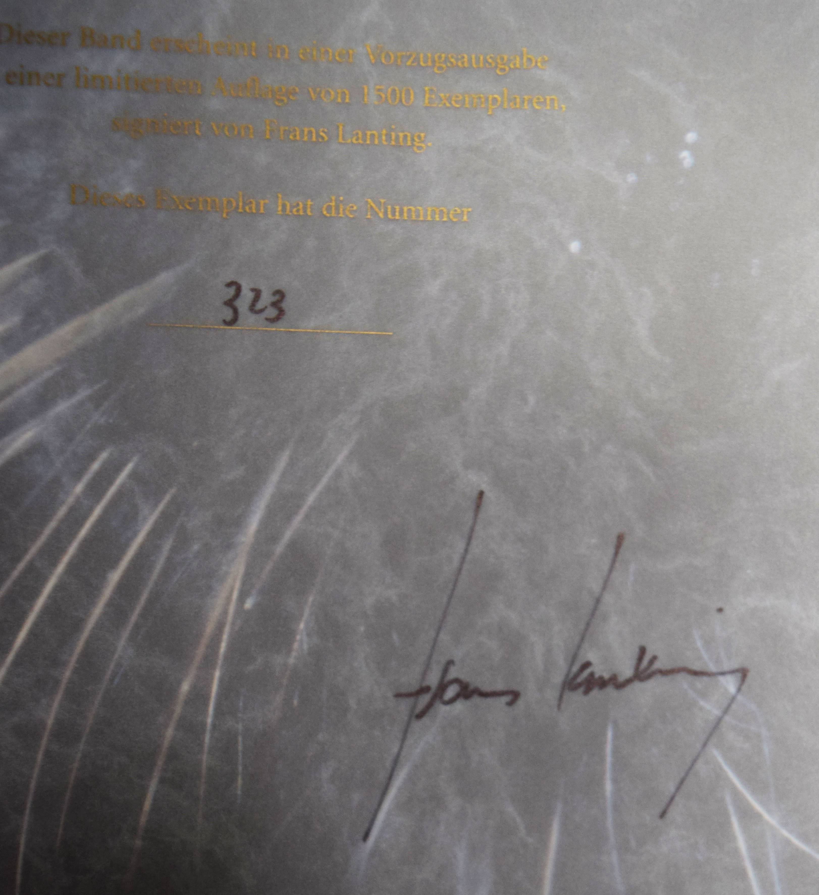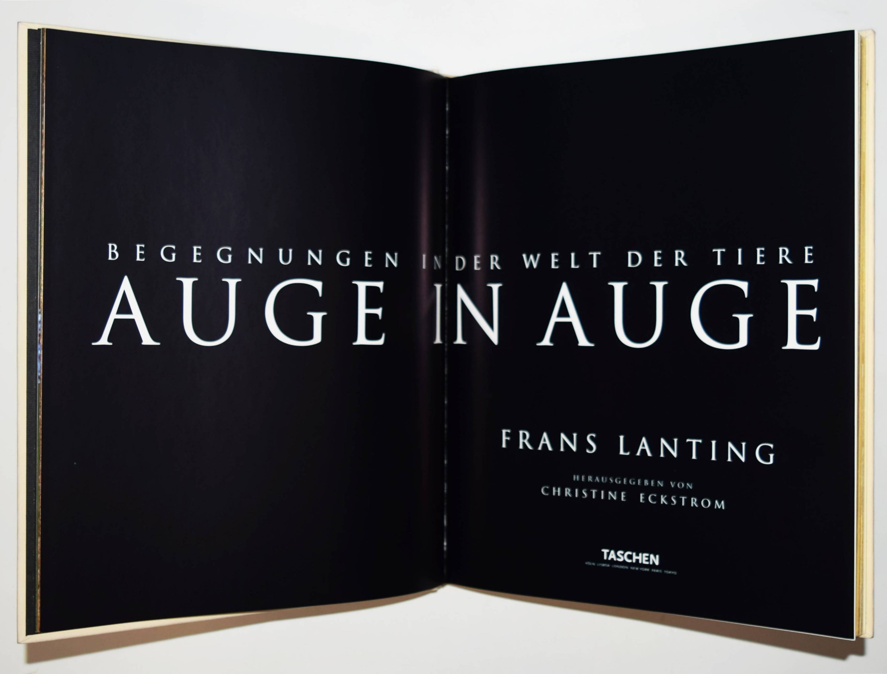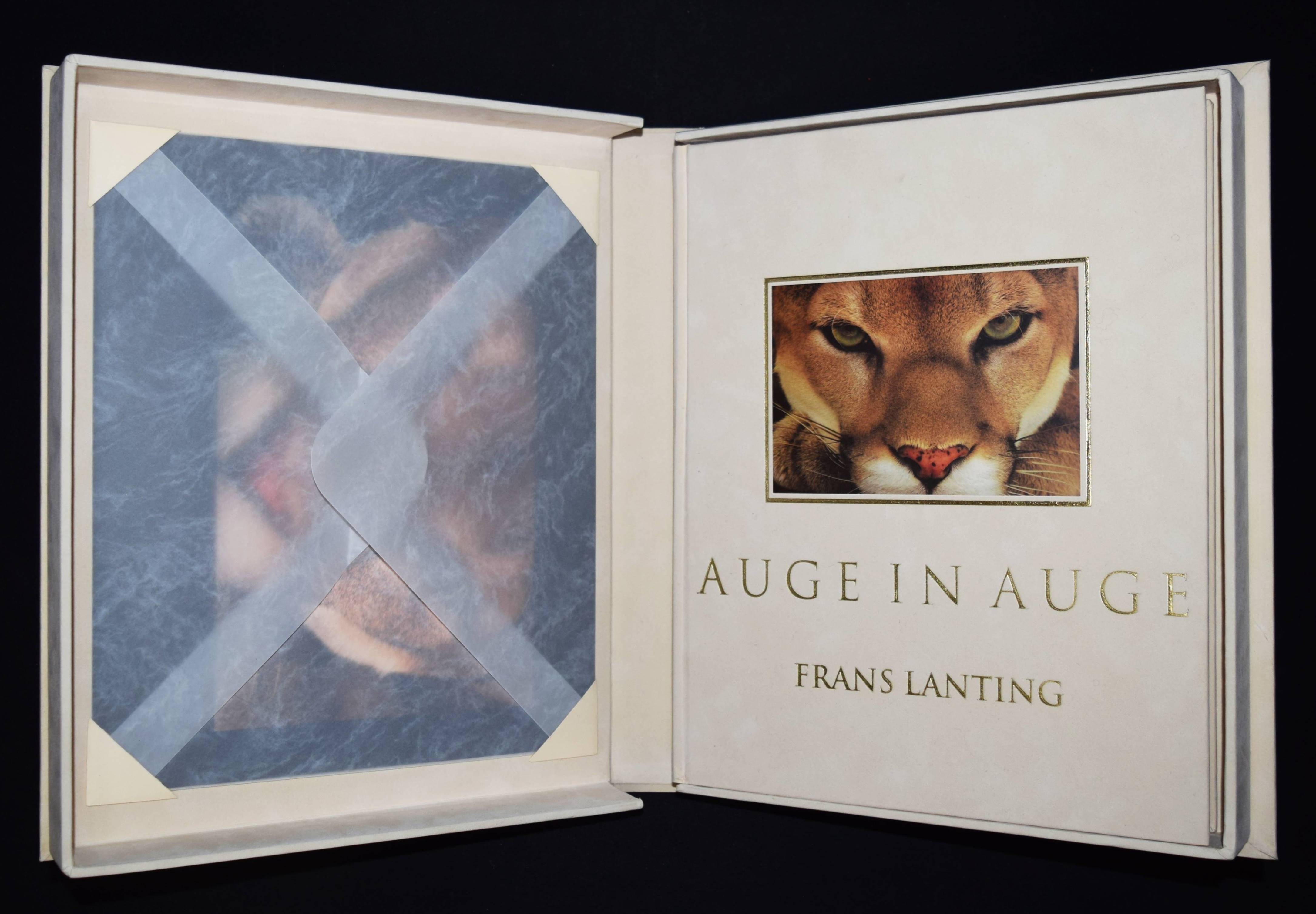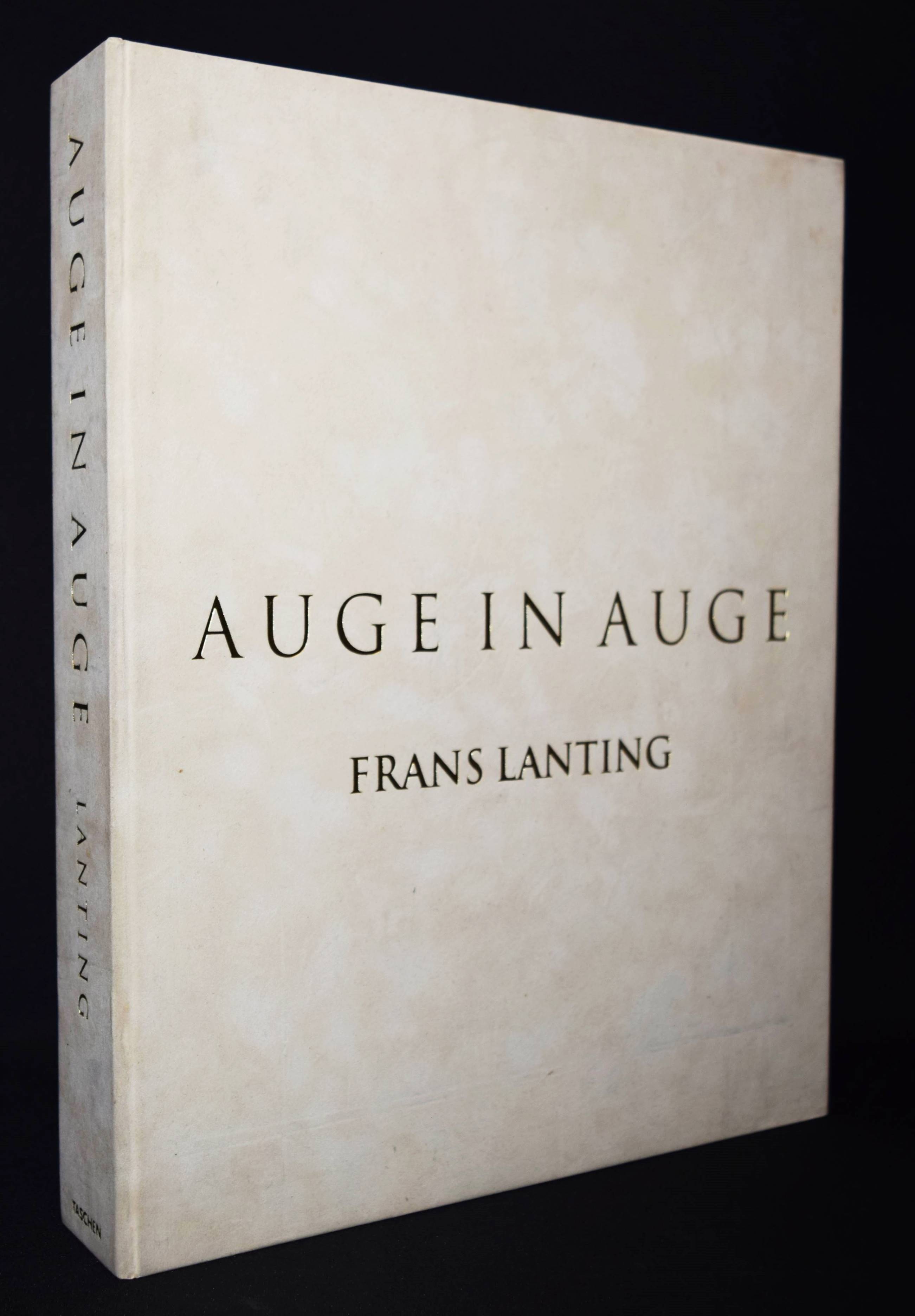Lanting, Frans. Auge in Auge. Begegnungen in der Welt der Tiere. Herausgegeben von Christine Eckstrom. Sonderausgabe. Köln, Lisboa, London, New York, Paris, Tokyo, Benedikt Taschen und Terra Editions (1997). Folio (36 x 30 cm.). 251, (1) S. mit über 140 Farbtafeln und 1 signierten Orig.-Farbphotographie. Beigefarbiger Orig.-Velourlederband mit goldgepr. Rücken- und Deckeltitel, farb. Deckelbild und Goldschnitt, in Velourleder-Buchkassette mit goldgepr. Rücken- und Deckeltitel. Koetzle, Fotografen A-Z 222. – Eines von 1500 Exemplaren der nummerierten Vorzugsausgabe mit der Original-Photographie; im Druckvermerk von F. Lanting signiert. – F. Lanting (geb. 1951 in Rotterdam), „international bekannter Tier- und Landschaftsfotograf mit viel beachteten Buchpublikationen. Herausragender Vertreter einer an Fragen des Umweltschutzes interessierten Wildlife-Fotografie“ (H.-M. Koetzle), „zelebriert die Landschaften und ihre Tier- und Pflanzenwelt mit einer knappen, evokativen Prosa und mit Fotografien, die außergewöhnlich sind, indem sie Bewegung, Form und Farbe festhalten. […] Lantings Aufnahmen verwandeln gewöhnliche, vertraut gewordene Kreaturen in eindringliche neuartige Visionen“ (Georg Schaller in Koetzle). – Die Kassette minimal angestaubt, Rückendeckel des Einbands mit leichten Textabklatsch von beil. Blatt der Terra Editions, gutes Exemplar.