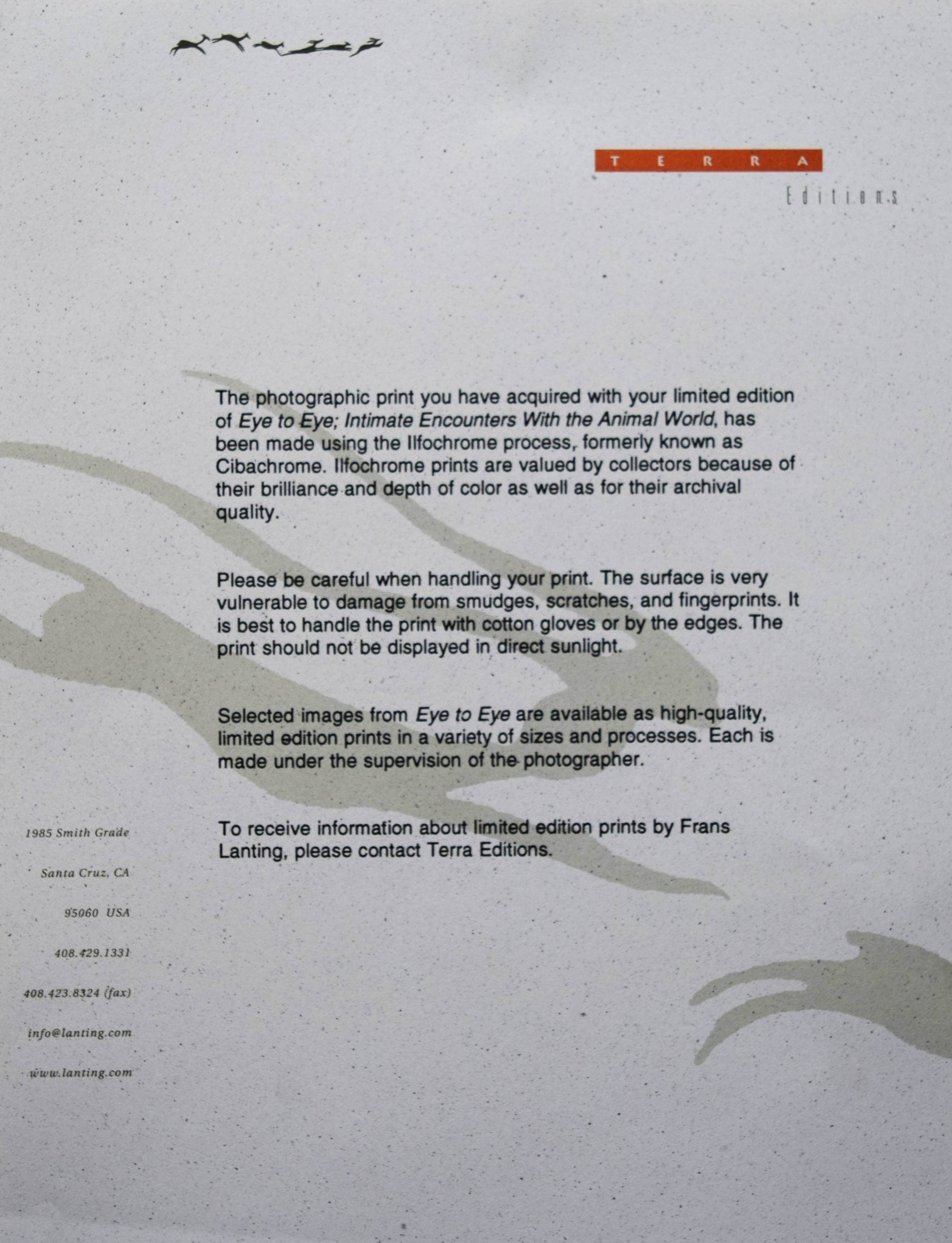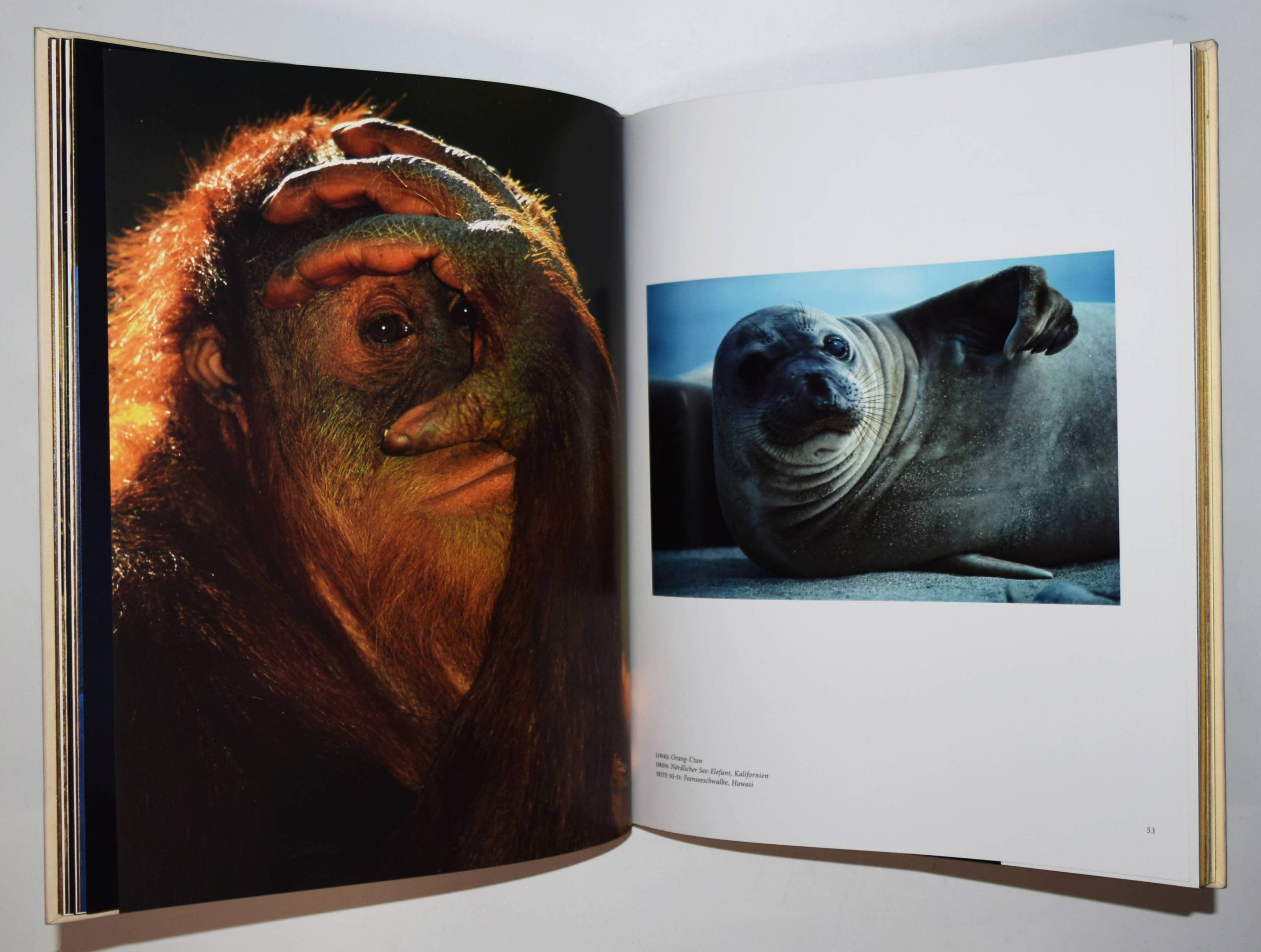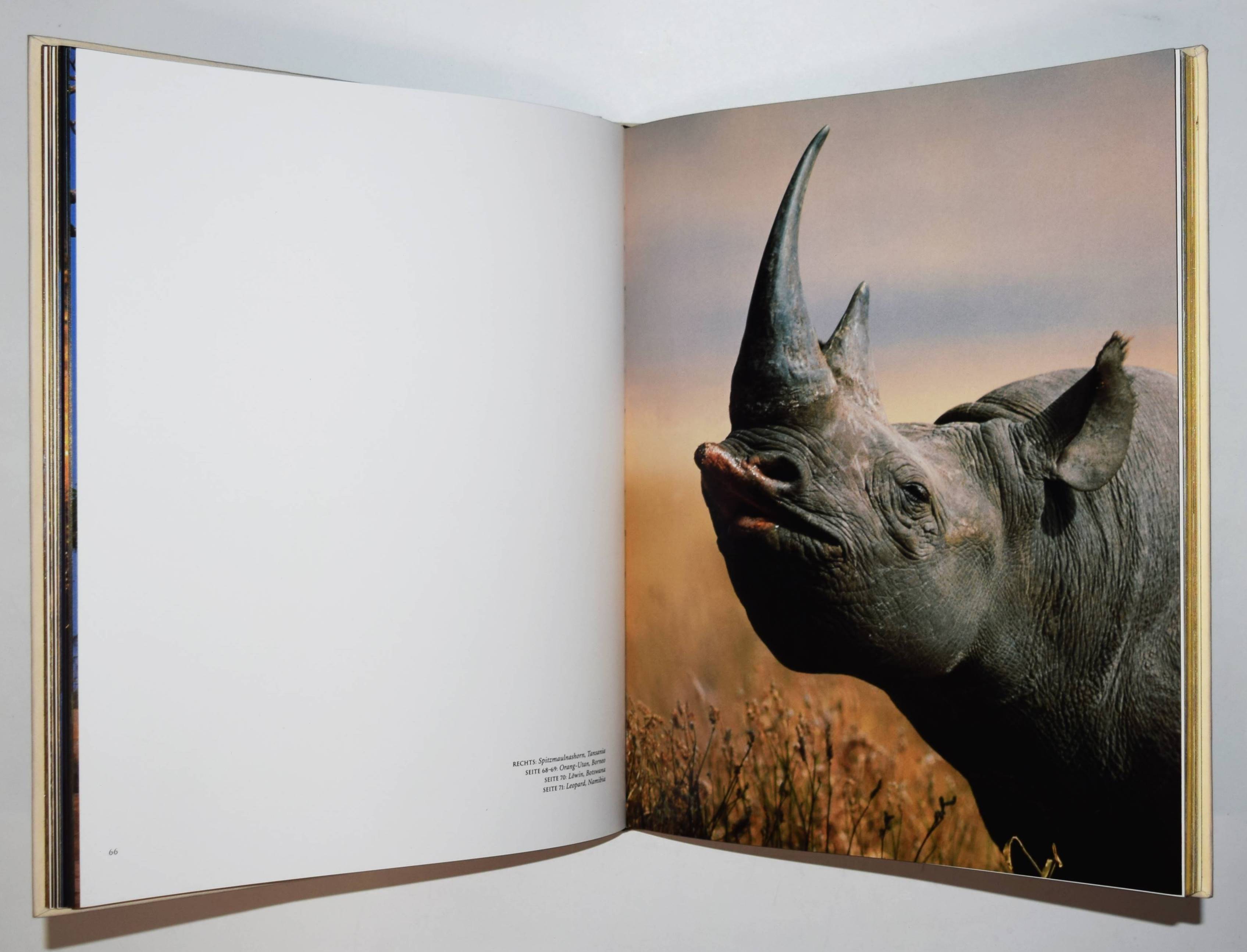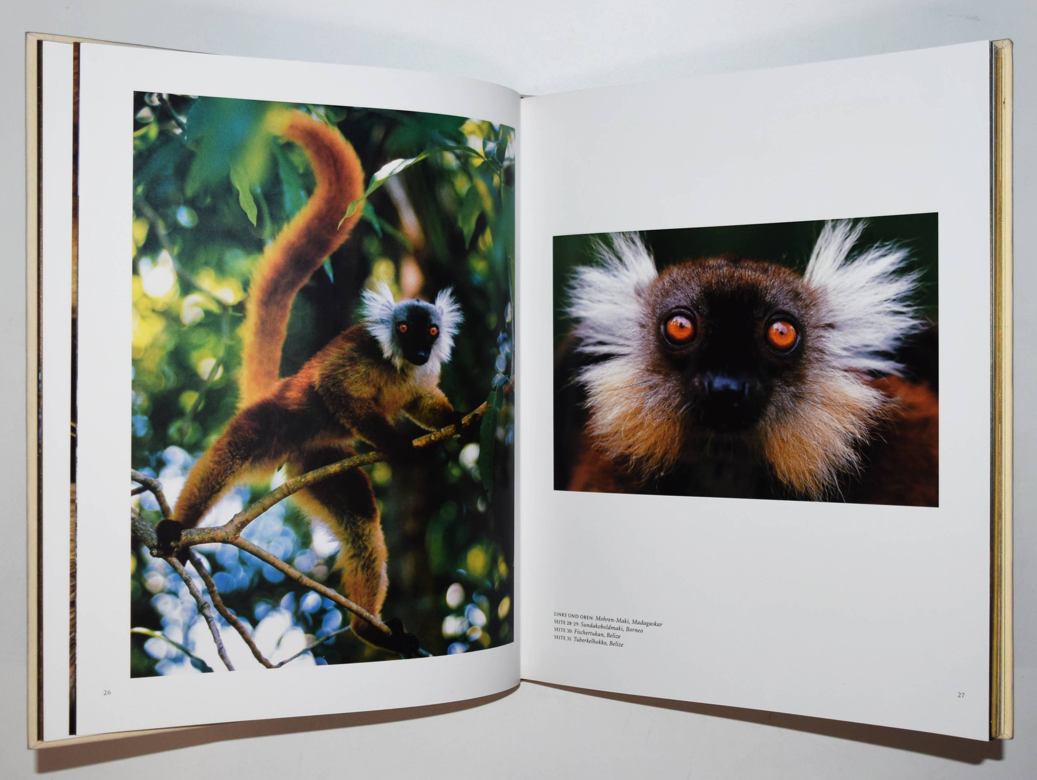 Lanting, Frans. Auge in Auge. Begegnungen in der Welt der Tiere. Herausgegeben von Christine Eckstrom. Sonderausgabe. Köln, Lisboa, London, New York, Paris, Tokyo, Benedikt Taschen und Terra Editions (1997). Folio (36 x 30 cm.). 251, (1) S. mit über 140 Farbtafeln und 1 signierten Orig.-Farbphotographie. Beigefarbiger Orig.-Velourlederband mit goldgepr. Rücken- und Deckeltitel, farb. Deckelbild und Goldschnitt, in Velourleder-Buchkassette mit goldgepr. Rücken- und Deckeltitel. Koetzle, Fotografen A-Z 222. – Eines von 1500 Exemplaren der nummerierten Vorzugsausgabe mit der Original-Photographie; im Druckvermerk von F. Lanting signiert. – F. Lanting (geb. 1951 in Rotterdam), „international bekannter Tier- und Landschaftsfotograf mit viel beachteten Buchpublikationen. Herausragender Vertreter einer an Fragen des Umweltschutzes interessierten Wildlife-Fotografie“ (H.-M. Koetzle), „zelebriert die Landschaften und ihre Tier- und Pflanzenwelt mit einer knappen, evokativen Prosa und mit Fotografien, die außergewöhnlich sind, indem sie Bewegung, Form und Farbe festhalten. […] Lantings Aufnahmen verwandeln gewöhnliche, vertraut gewordene Kreaturen in eindringliche neuartige Visionen“ (Georg Schaller in Koetzle). – Die Kassette minimal angestaubt, Rückendeckel des Einbands mit leichten Textabklatsch von beil. Blatt der Terra Editions, gutes Exemplar.