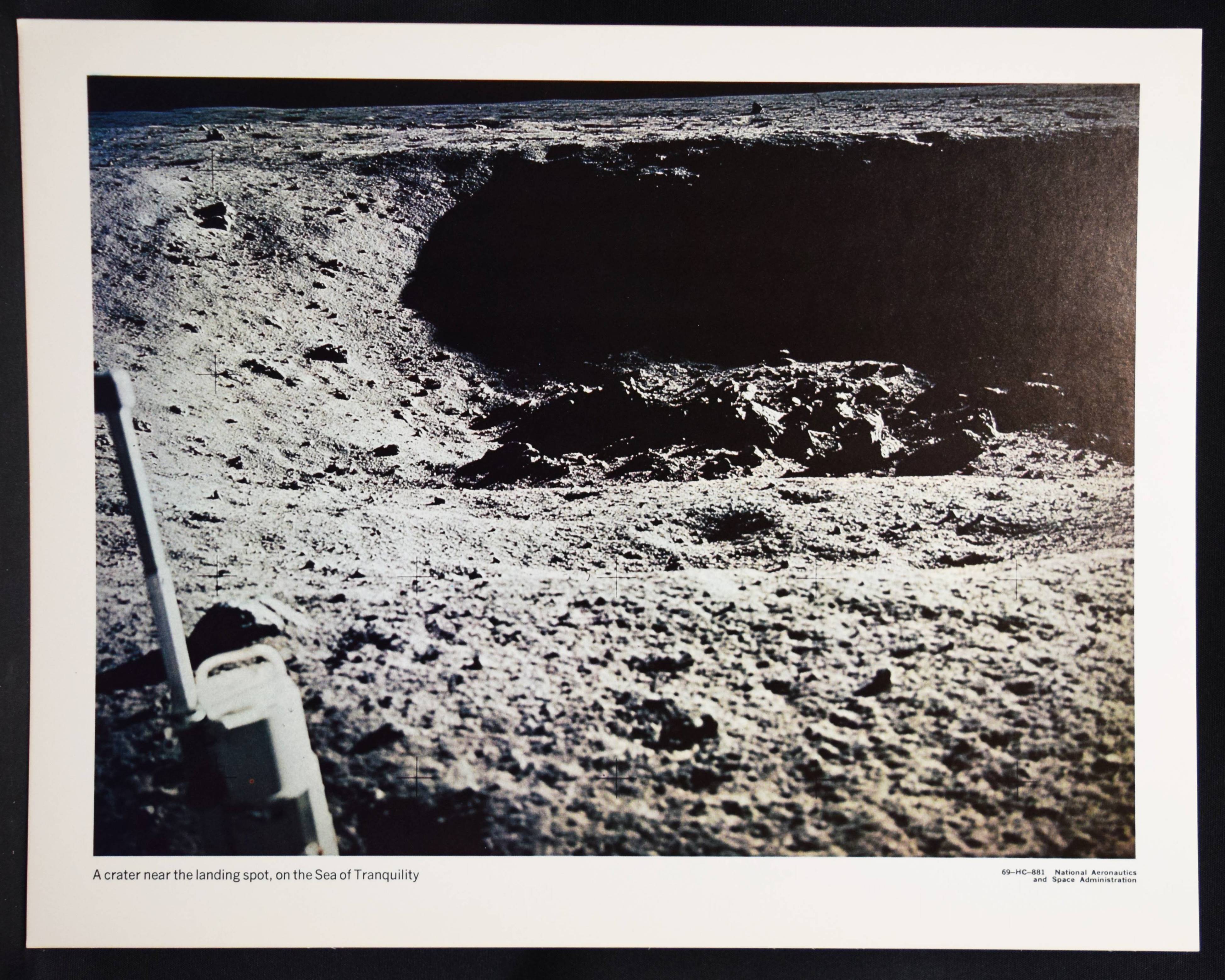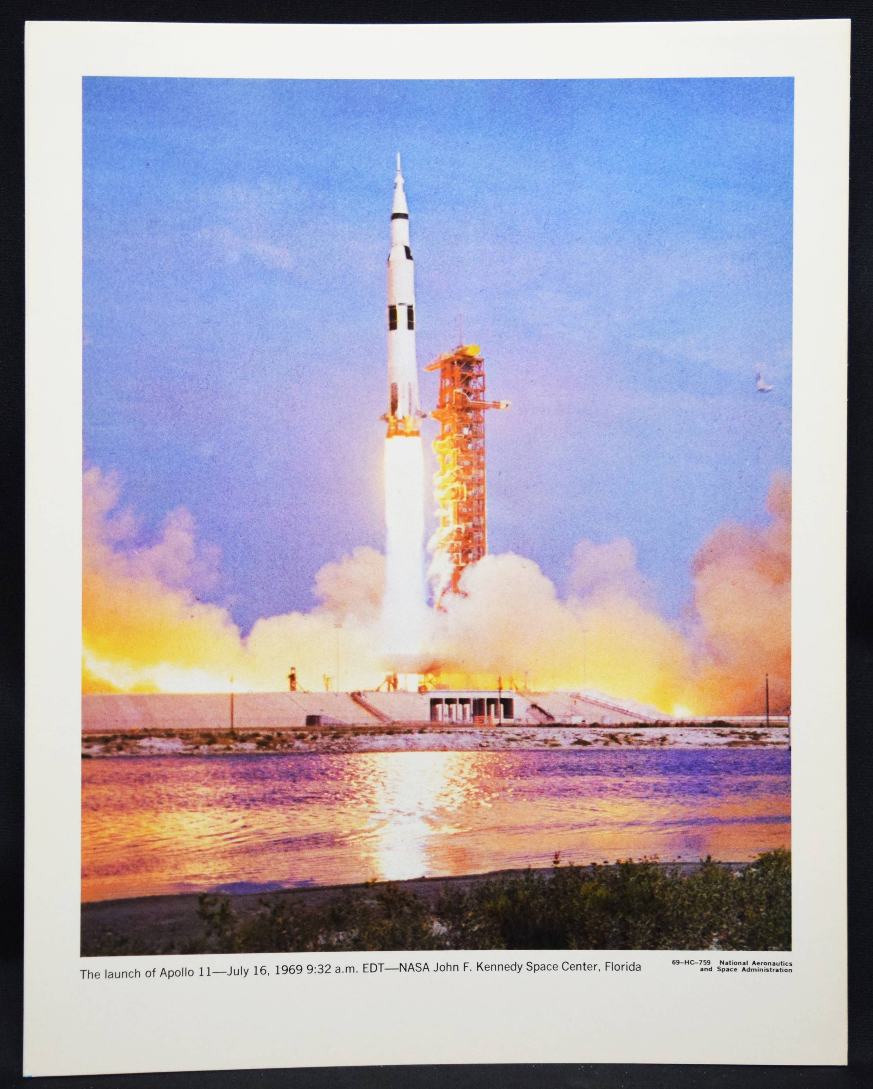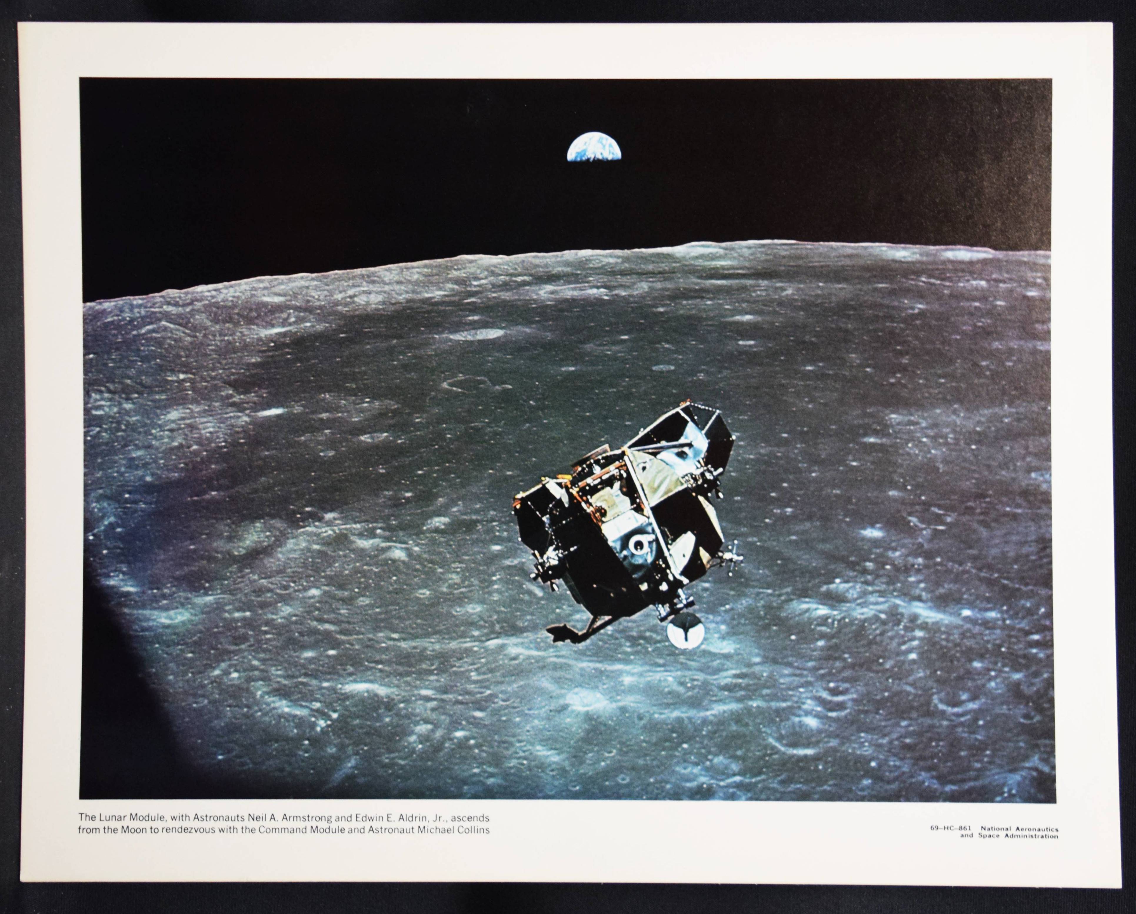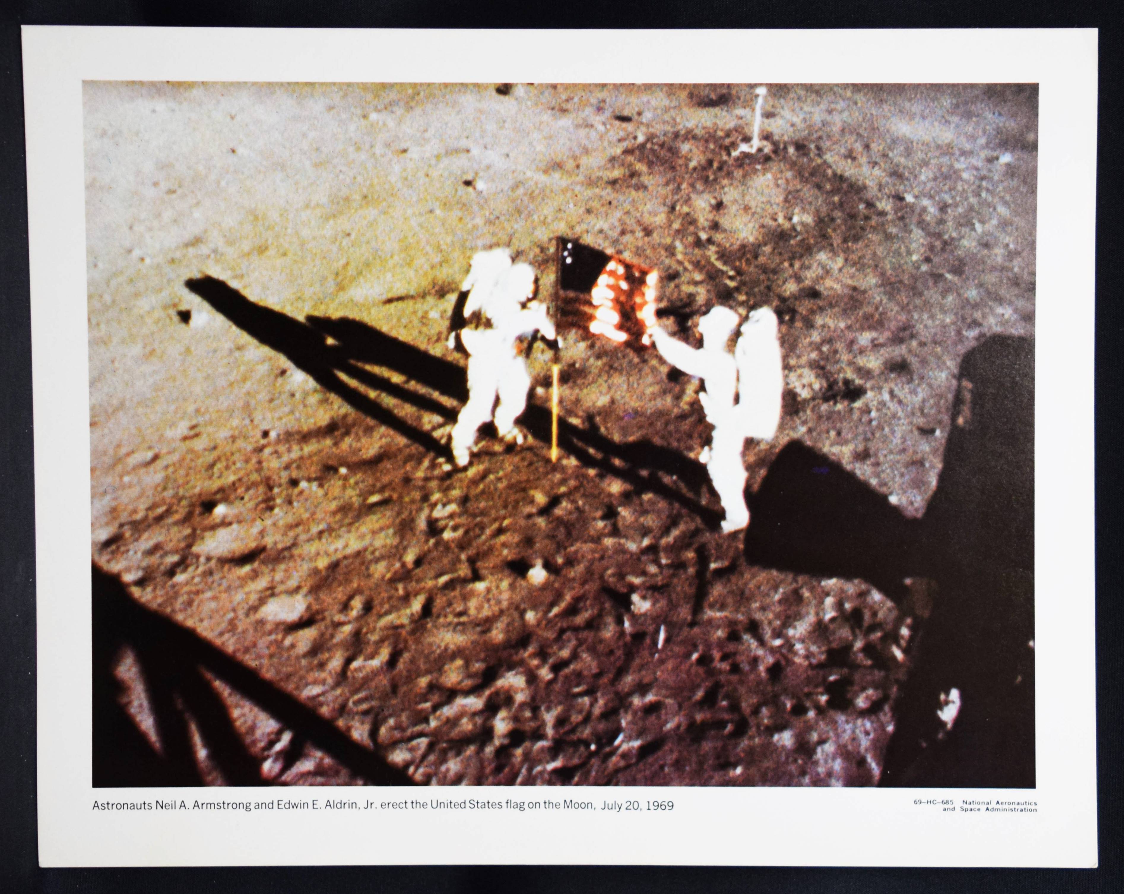 Apollo 11. 12 Farboffset-Photos der NASA zur ersten Mondlandung von Apollo 11. Houston, National Aeronautics and Space Administration (NASA) (um 1970). Blattgröße: 28 x 35,5 cm. Presse-Dokumentation der NASA. – Mit Portaits der Astronauten, Ansicht der Erde von Apollo 11, Ausstieg von E.Aldrin u. verschied. Szenen auf dem Mond, Aufstellen der US-Flagge, Start von Apollo 11, das Lunar-Modul über dem Mond, Krater nahe dem Landungsplatz etc.