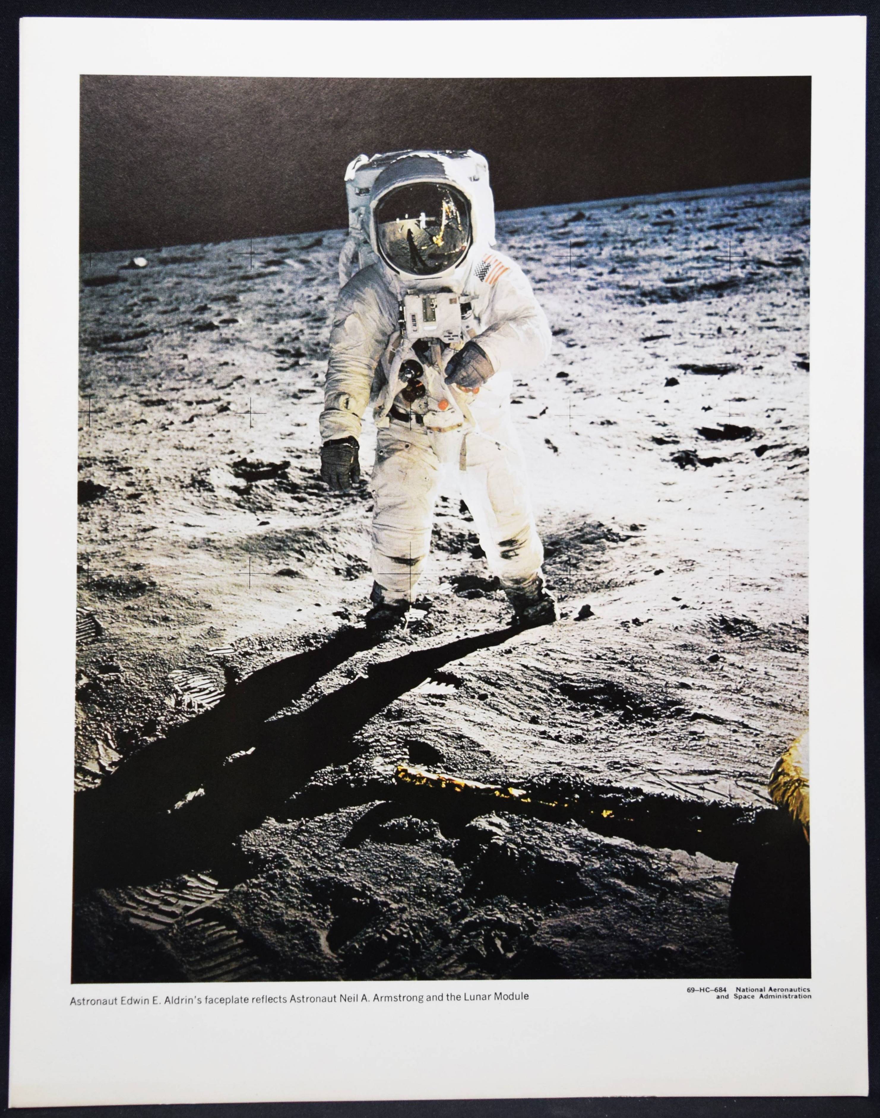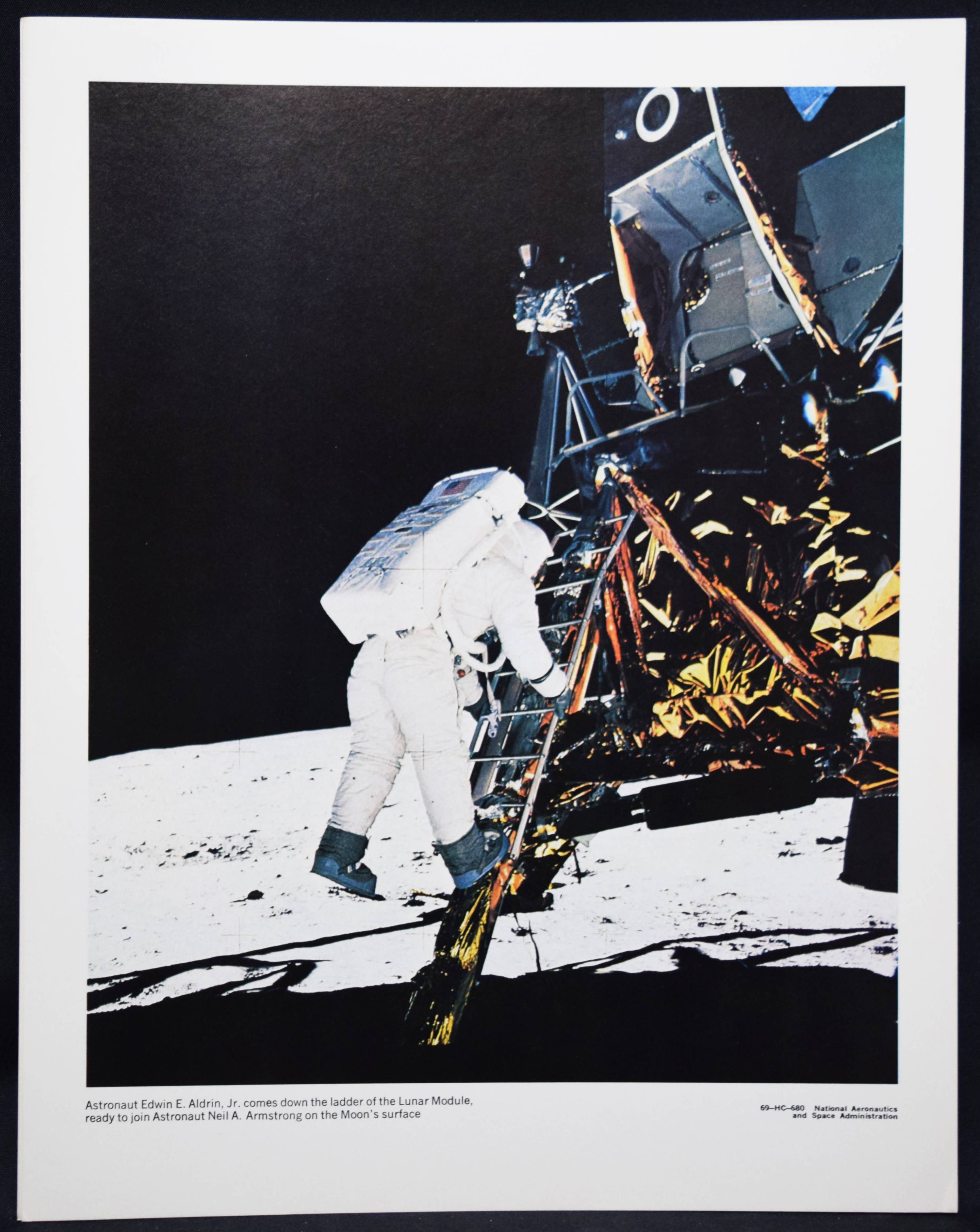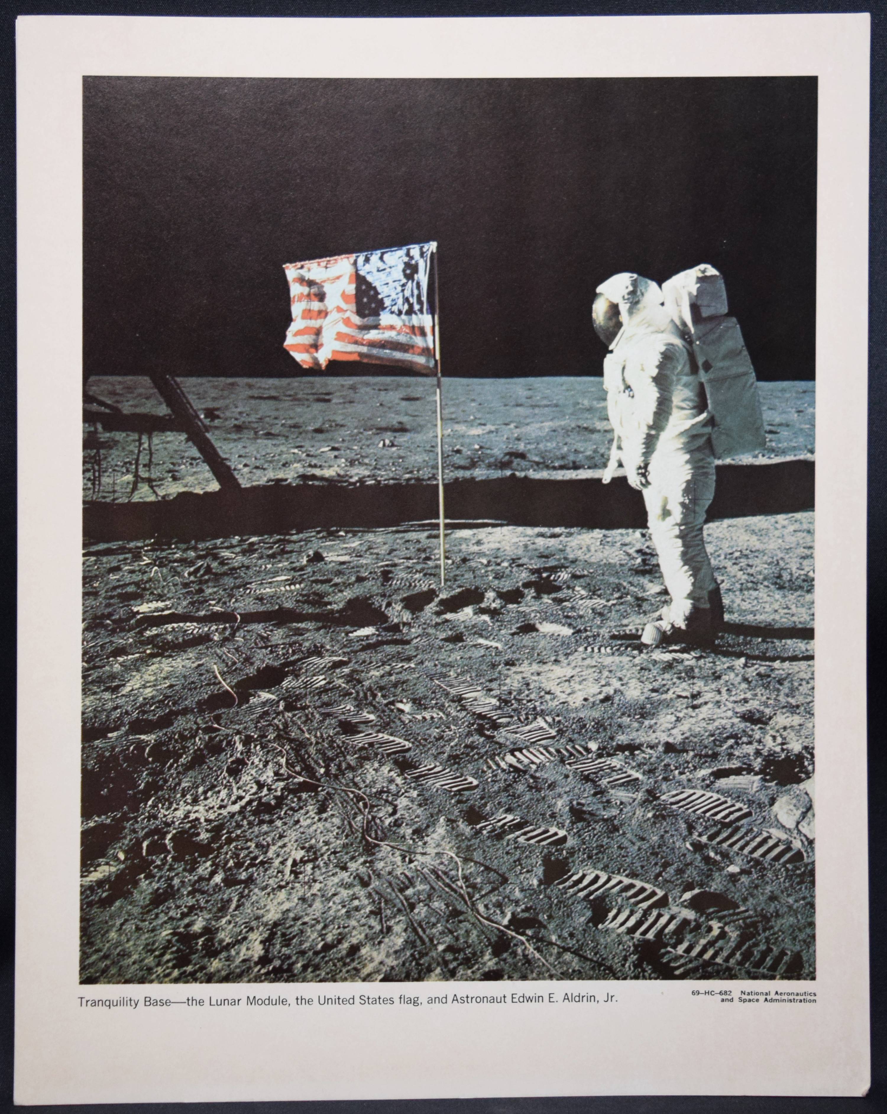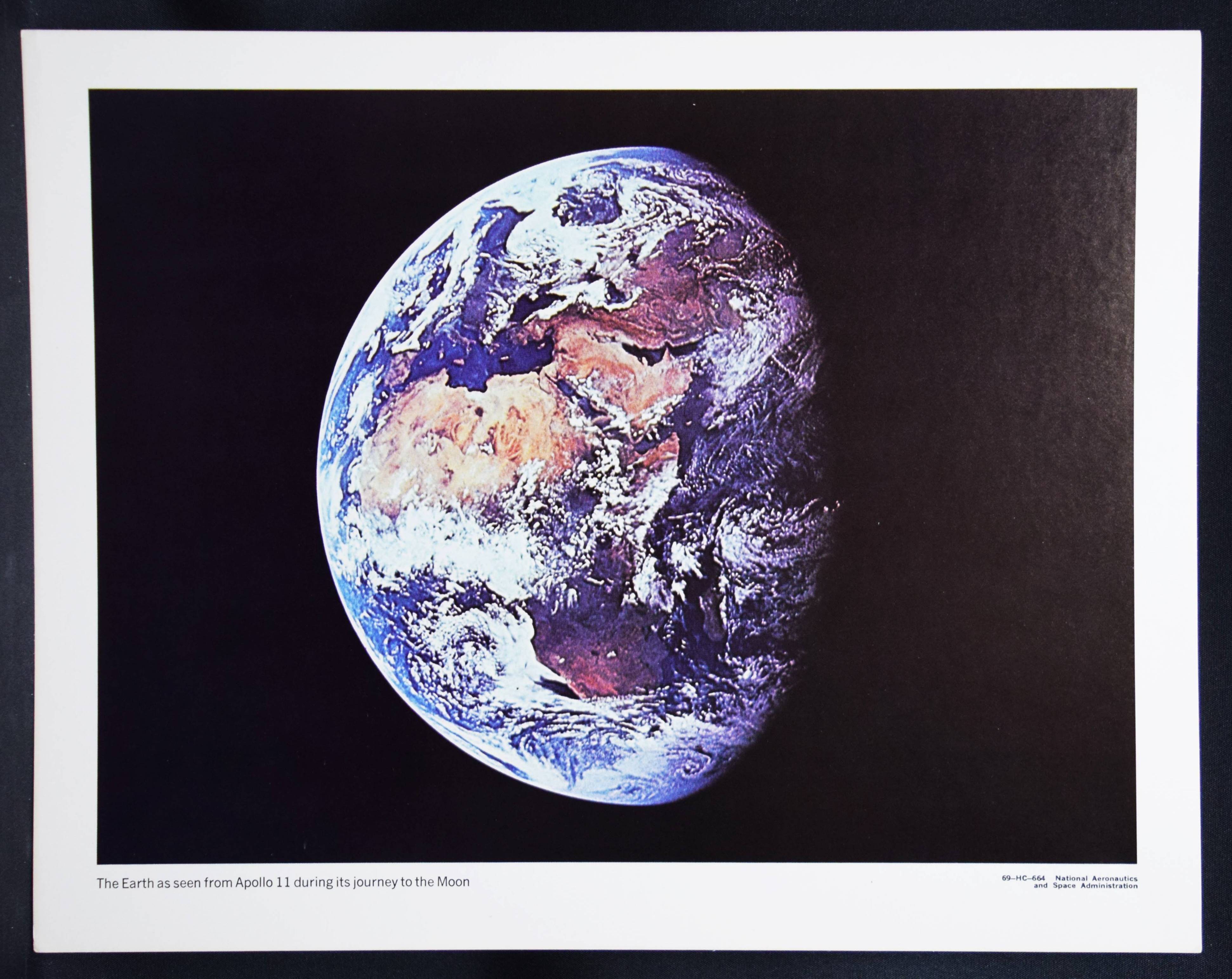 Apollo 11. 12 Farboffset-Photos der NASA zur ersten Mondlandung von Apollo 11. Houston, National Aeronautics and Space Administration (NASA) (um 1970). Blattgröße: 28 x 35,5 cm. Presse-Dokumentation der NASA. – Mit Portaits der Astronauten, Ansicht der Erde von Apollo 11, Ausstieg von E.Aldrin u. verschied. Szenen auf dem Mond, Aufstellen der US-Flagge, Start von Apollo 11, das Lunar-Modul über dem Mond, Krater nahe dem Landungsplatz etc.