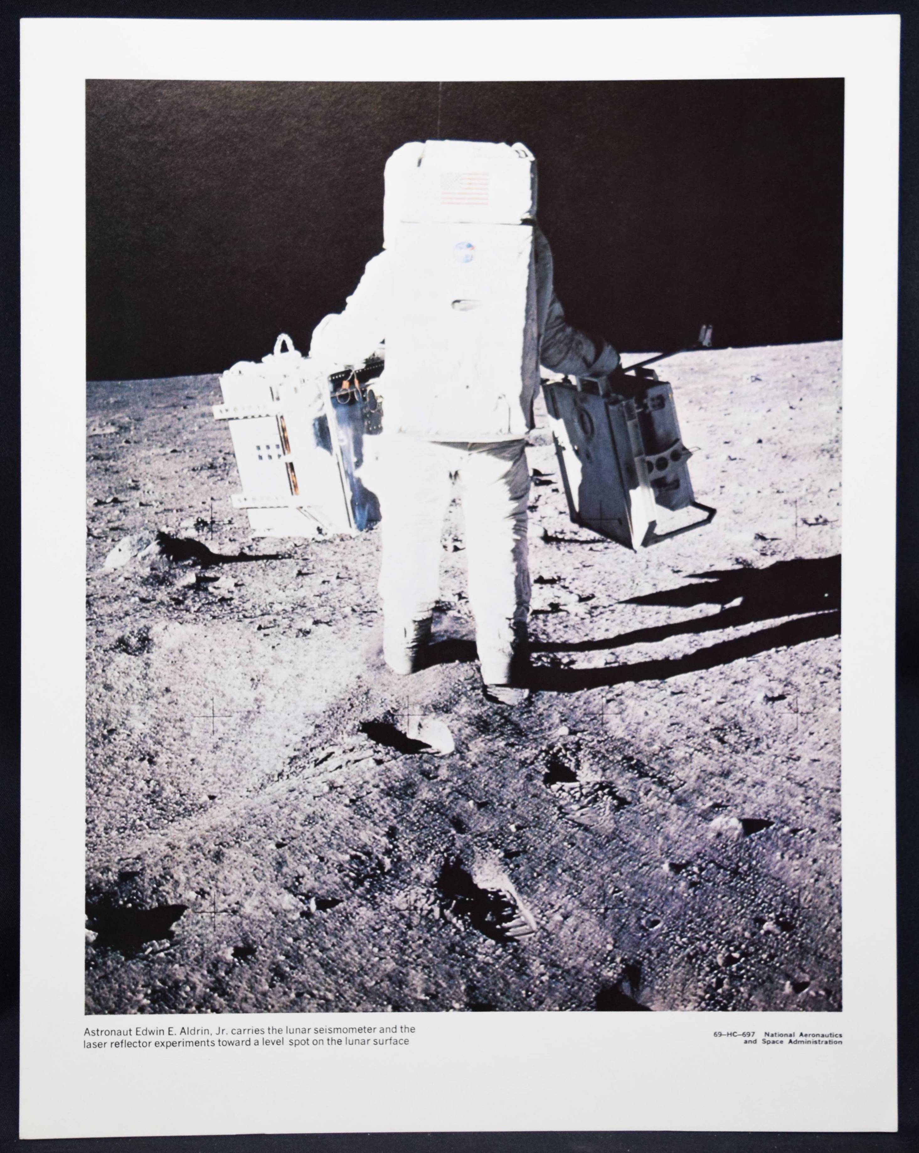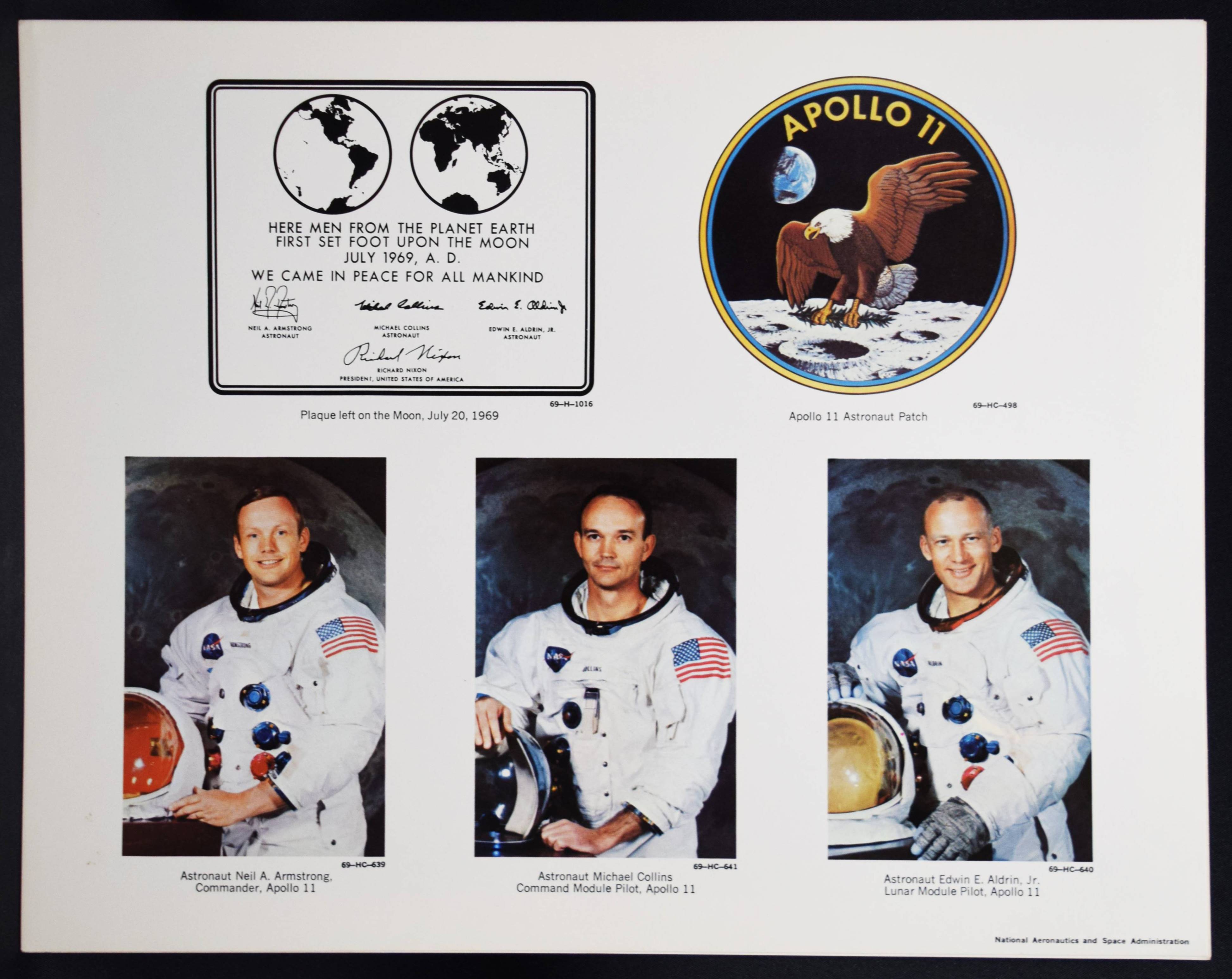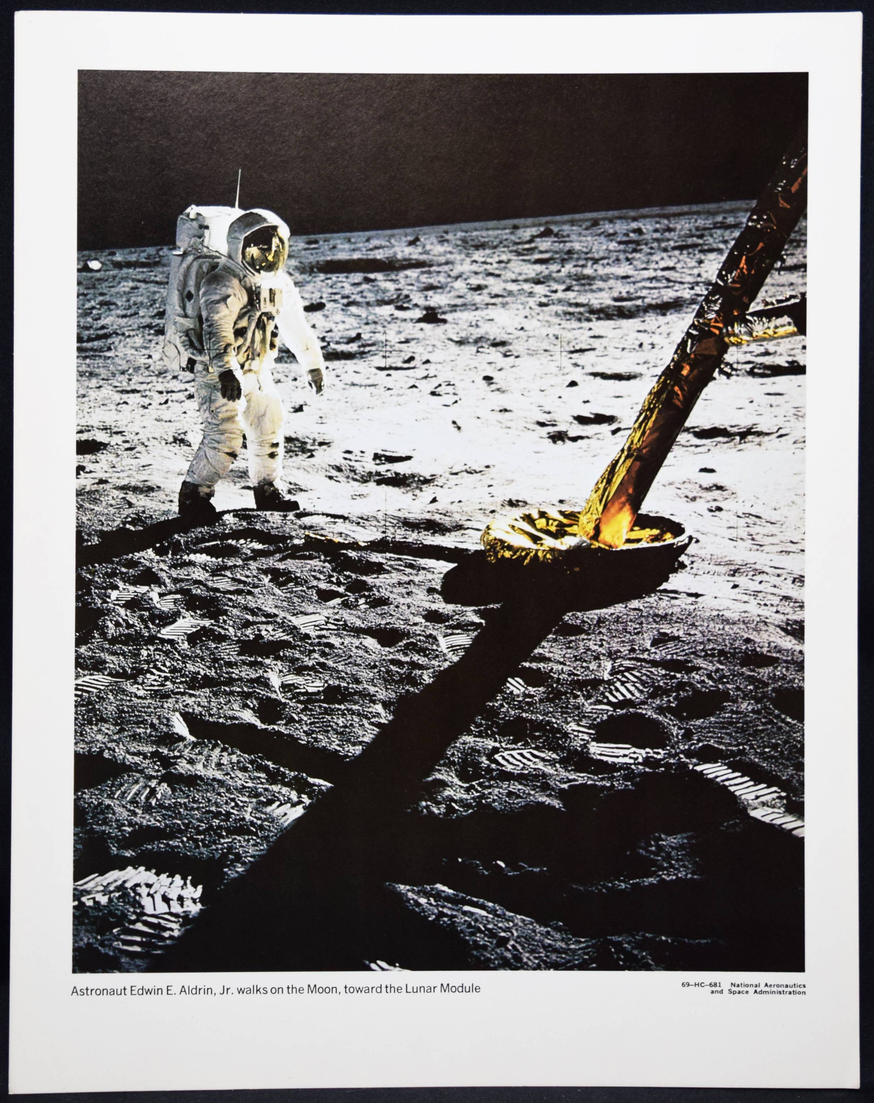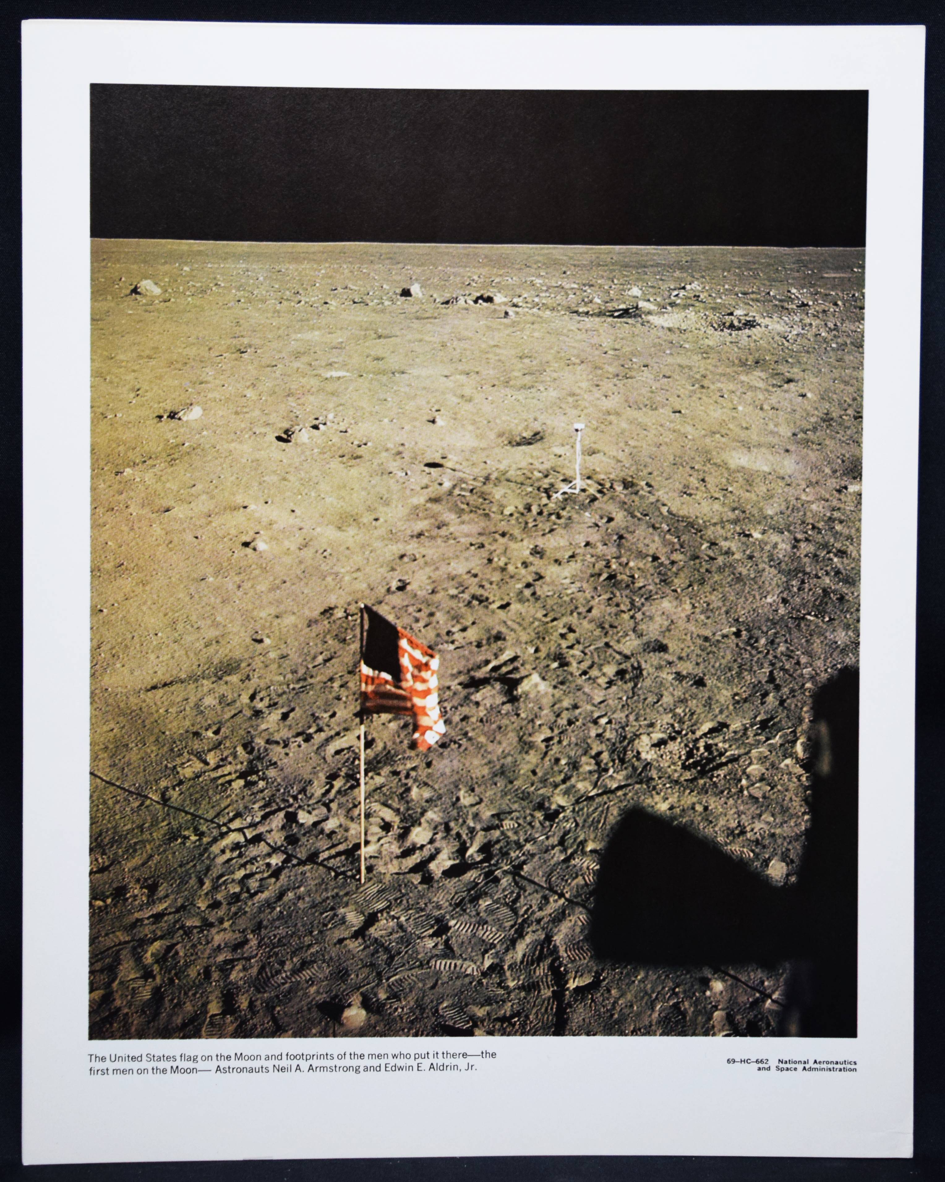 Apollo 11. 12 Farboffset-Photos der NASA zur ersten Mondlandung von Apollo 11. Houston, National Aeronautics and Space Administration (NASA) (um 1970). Blattgröße: 28 x 35,5 cm. Presse-Dokumentation der NASA. – Mit Portaits der Astronauten, Ansicht der Erde von Apollo 11, Ausstieg von E.Aldrin u. verschied. Szenen auf dem Mond, Aufstellen der US-Flagge, Start von Apollo 11, das Lunar-Modul über dem Mond, Krater nahe dem Landungsplatz etc.