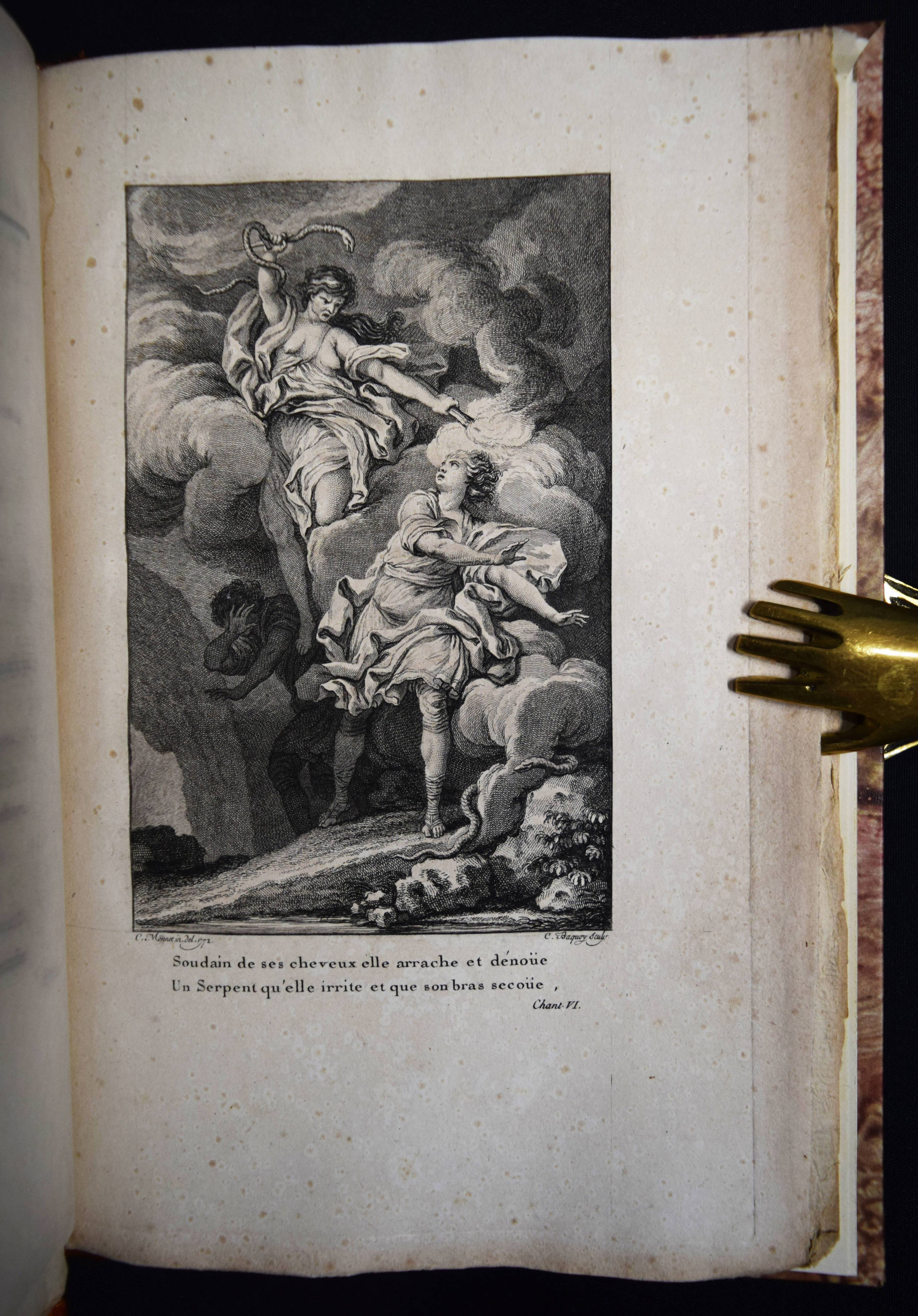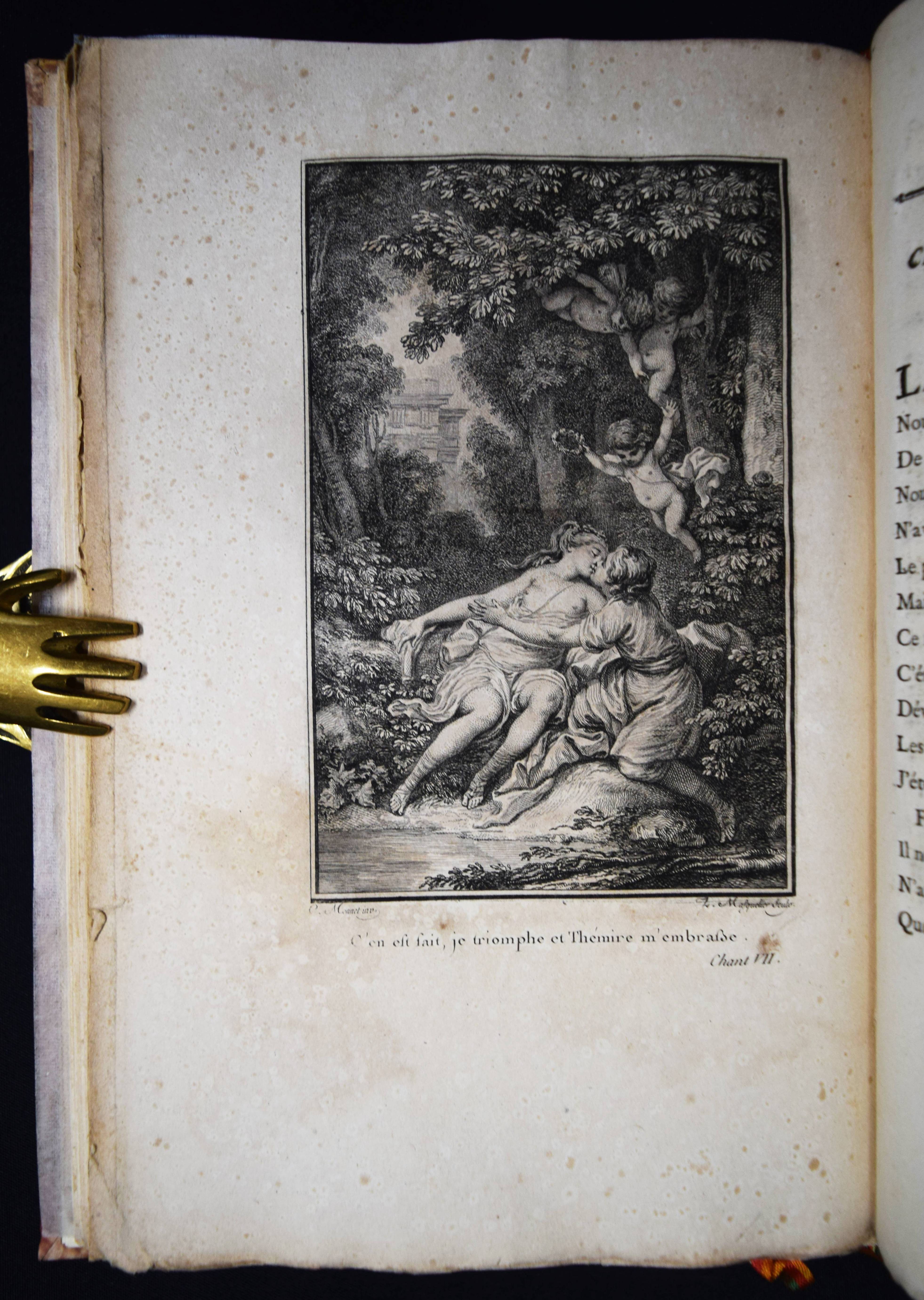 (Montesquieu, Charles de Secondat). Le temple de Gnide. Mis en vers par M. (Charles Phillip) Colardeau. Paris, Le Jay o. J. (1773). 8°. XVI, 88 S. mit gestoch. Titel mit Porträt-Medaillon und 7 Kupfertafeln von Baquoy, Delaunay, Helman, Masquelier, Née und Ponce. Moderner Halblederband mit goldgepr. Rückenvergoldung und 5 unechten Bünden. Cohen/Ricci Sp. 245. Fürstenberg 99. Sander 372. – Versfassung des Werkes von Montesquieu. Eines der seltenen Exemplare ohne Datum, bei denen die Kupfer gegen eine „″reconnaissance““ bezogen werden konnten (vgl. Cohen/R.). – Stellenweise braunfleckig und etwas gebräunt, gutes breitrandiges, seitlich und unten unbeschnittenes Exemplar.