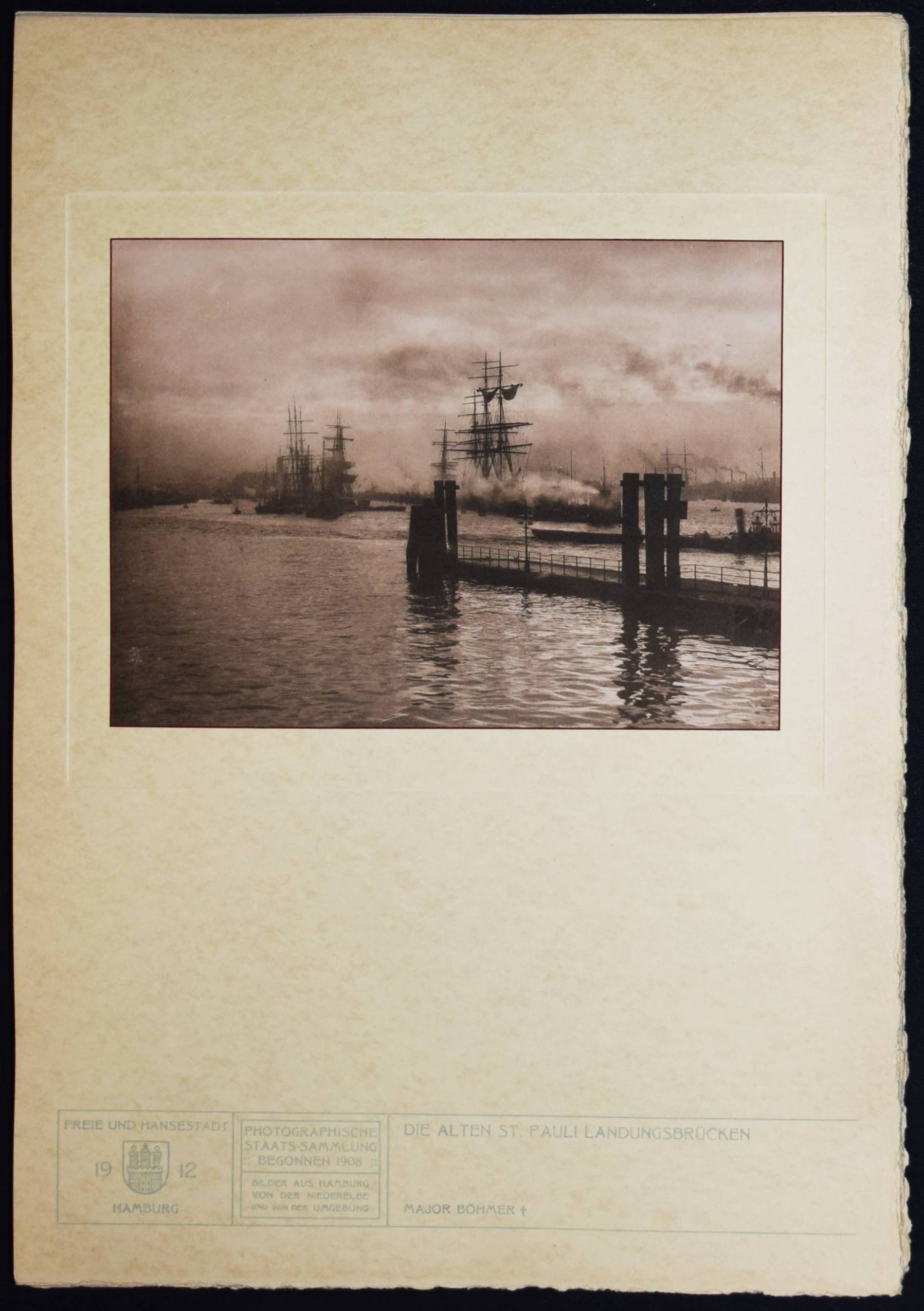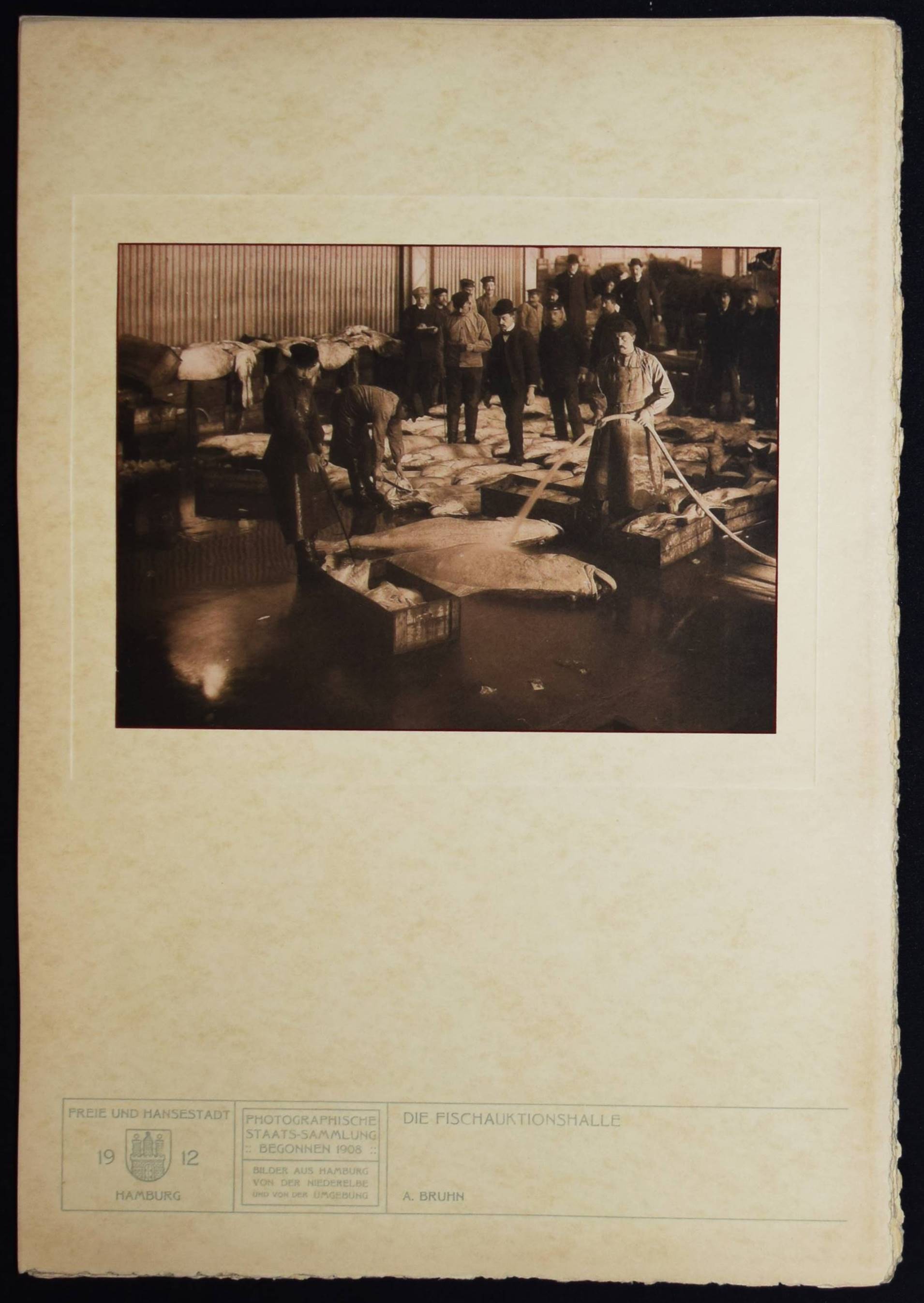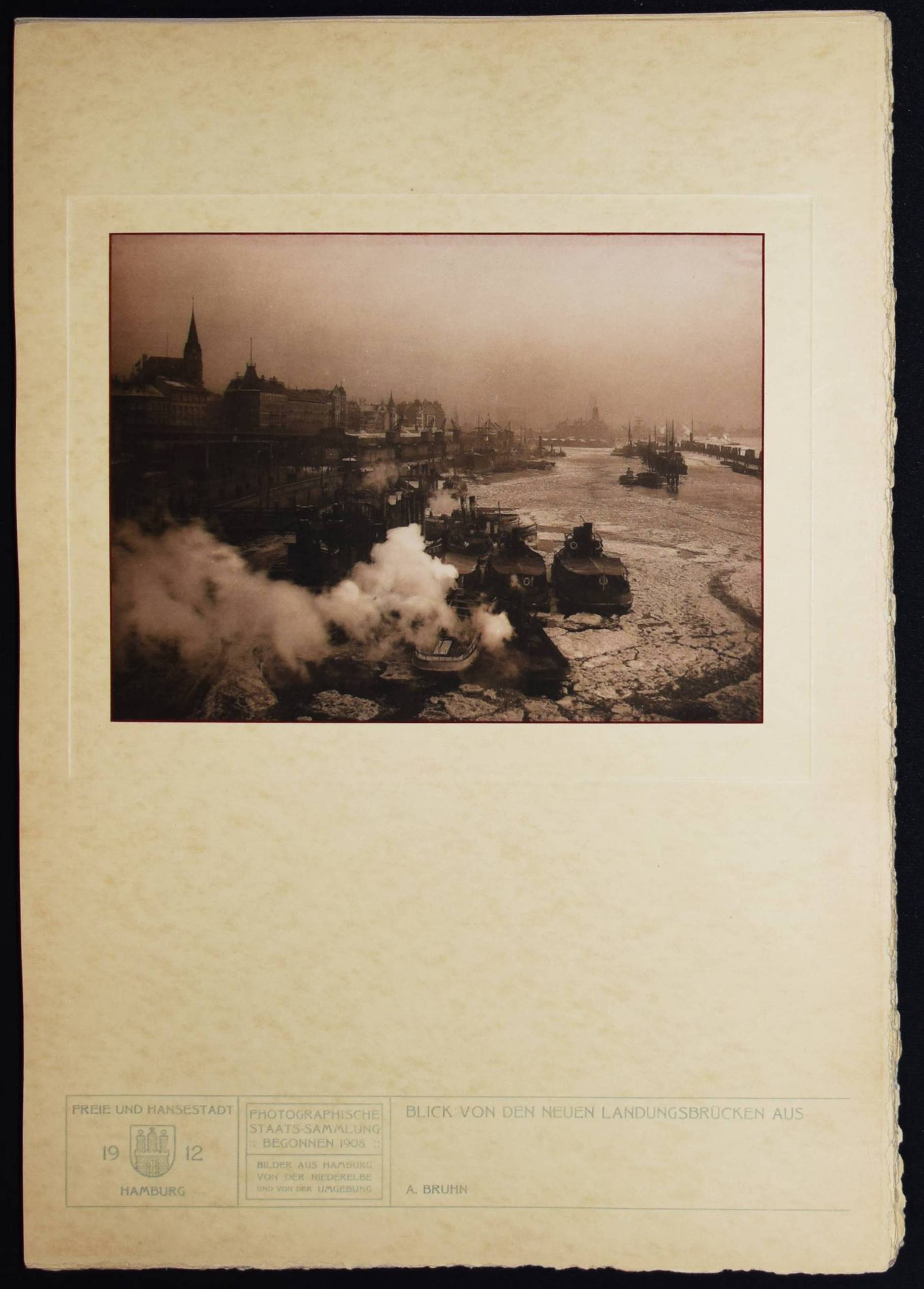 Bruhn – Juhl, Ernst (Wilhelm), (Hrsg.). Hamburg. Land und Leute der Niederelbe. Hamburg, Boysen & Maasch (1912). Imperial-Folio (45 x 32 cm.). [4] Bl. mit mont. fotogr. Titelvignette und 90 Tafeln in Heliographie nach Fotografien von Anton Joachim Christian Bruhn, Rudolf Dührkoop u.a. Orig.-Halbleinen-Flügelmappe mit goldgepr. Deckeltitel und Deckelbild. Heidtmann 15706. Joppien, Kunstphotographie um 1900. Hamburg 1989, S. 78–82, 195. – Eines von 300 Exemplaren. – Mit hervorragenden Aufnahmen der bedeutenden Hamburger Fotografen Anton Joachim Christian Bruhn (78) und Rudolf Dührkoop (6) sowie Aufnahmen von Major Böhmer (Blick von den alten St. Pauli Landungsbrücken 1893), Minya Diez-Dührkoop (2) und Th. und O. Hofmeister. Mit einem Porträt des Hamburger Bürgermeisters Burchard, Trachtendarstellungen aus den Vier- und Marschenlanden, Ansichten der Straßen und Gebäude Hamburgs an der Elbe, den Fleeten und der Alster, von Poppenbüttel, Allermöhe, Volksdorf, Blankenese, Alsterdorf, Altengamme, Moorburg, Cuxhaven u. a. – A. J. C. Bruhn (1868-1928) arbeitete seit 1890 als selbstständiger Fotograf. – Der Hamburger Kaufmann, Kunstsammler und Amateur-Fotograf E. W. Juhl (1850-1915) gilt als einer der wichtigsten Wegbereiter des Piktorialismus in Europa. „Juhl entstammte einer Hamburger Kaufmannsfamilie, war wirtschaftlich unabhängig und setzte sich als Kurator, Ausstellungsorganisator, Redakteur der „Photographischen Rundschau“, Autor und Juror bei internationalen Ausstellungen, aber auch als Sammler für die künstlerische Emanzipation der Fotografie ein. Seine zwischen 1893 und 1911 zusammengetragene Sammlung umfasste rund 800 Werke und gehörte somit zu den umfangreichsten privaten Piktorialismus-Kollektionen seiner Zeit. In Berlin waren Teile der Sammlung erstmals 1910 in einer Ausstellung im Königlichen Kunstgewerbemuseum zu sehen. Nach dem Tod von Ernst Juhl wurde seine Sammlung vom Museum für Kunst und Gewerbe in Hamburg und von der Bibliothek des Berliner Kunstgewerbemuseums, der heutigen Kunstbibliothek, angekauft. Weitere Teile des Nachlasses wurden im Zweiten Weltkrieg zerstört. Die Sammlung Juhl, die nun konservatorisch und wissenschaftlich erschlossen wurde, bildet zusammen mit der Sammlung Matthies-Masuren den Kernbestand der Kunstfotografie um 1900 in der Kunstbibliothek der Staatlichen Museen zu Berlin“ (C. Pfeiffer, U. Rüter u. L. Sprengler, Piktorialismus Portal). – Deckel und Flügel der Mappe teils etwas aufgehellt, sehr gutes Exemplar.