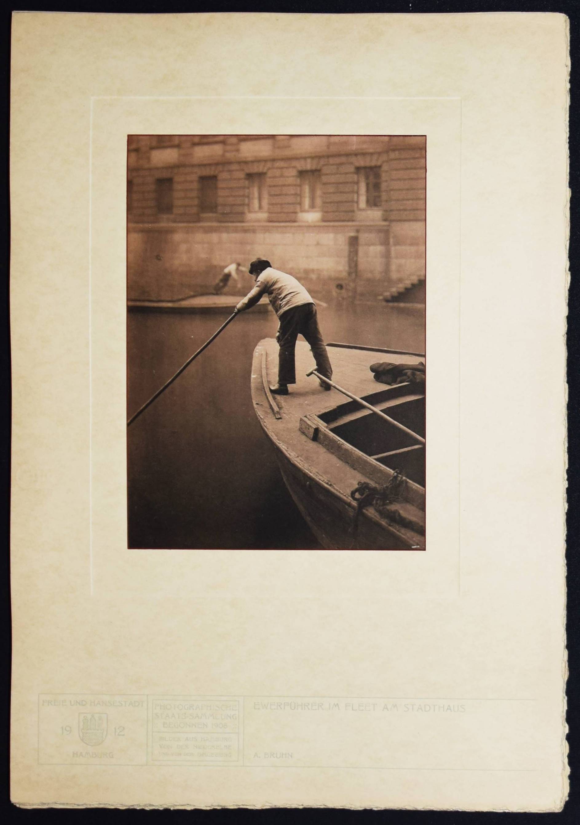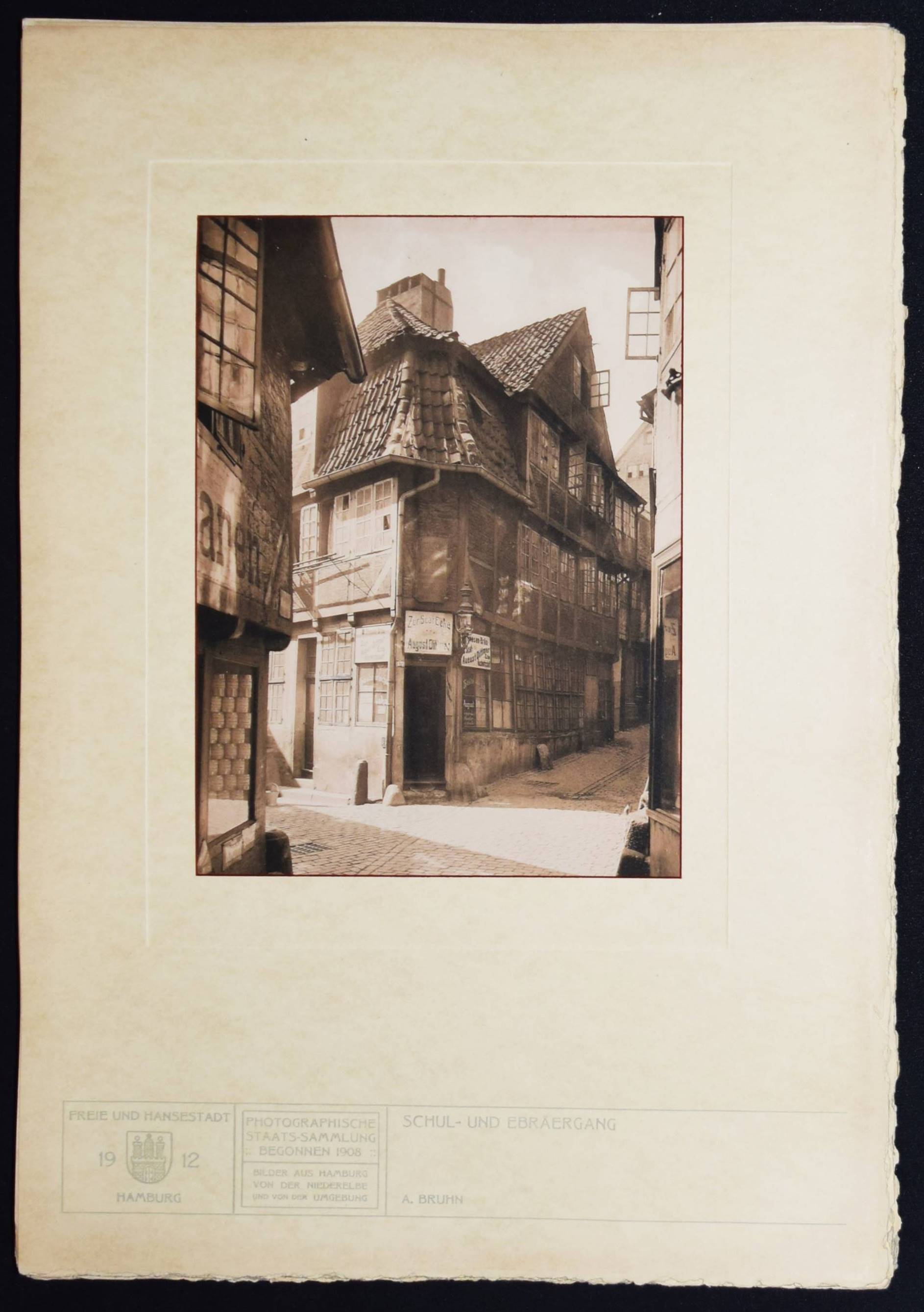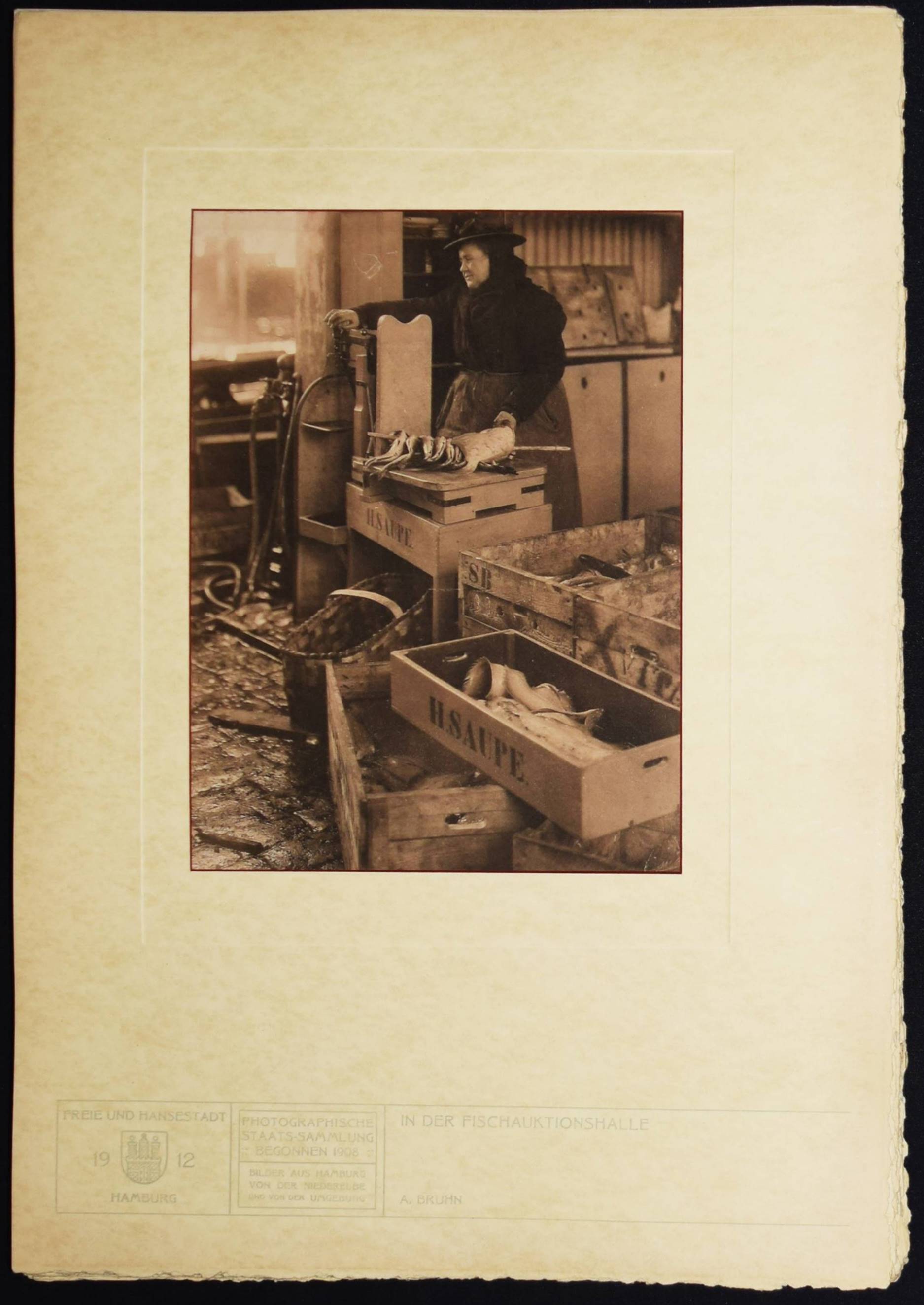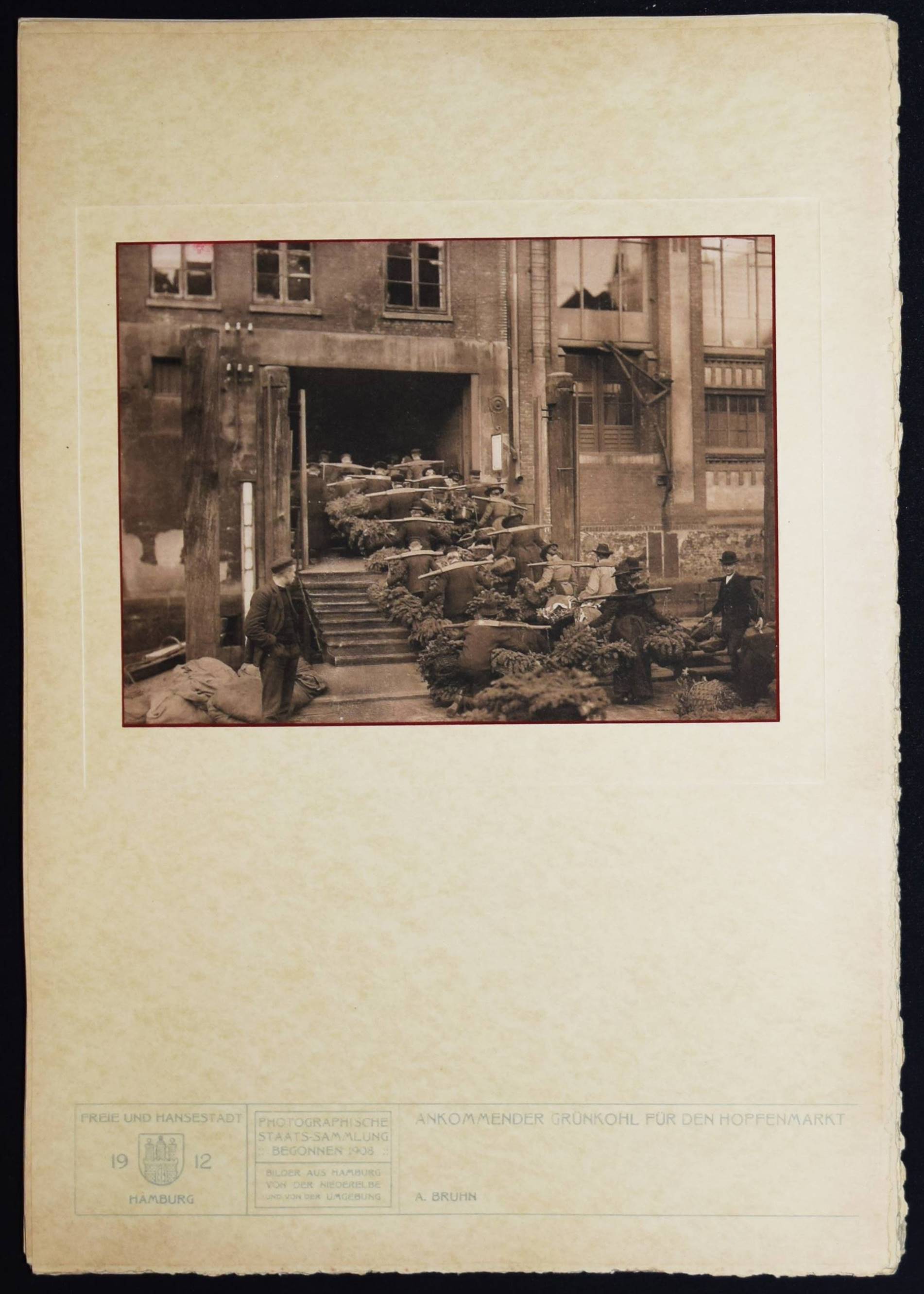 Bruhn – Juhl, Ernst (Wilhelm), (Hrsg.). Hamburg. Land und Leute der Niederelbe. Hamburg, Boysen & Maasch (1912). Imperial-Folio (45 x 32 cm.). [4] Bl. mit mont. fotogr. Titelvignette und 90 Tafeln in Heliographie nach Fotografien von Anton Joachim Christian Bruhn, Rudolf Dührkoop u.a. Orig.-Halbleinen-Flügelmappe mit goldgepr. Deckeltitel und Deckelbild. Heidtmann 15706. Joppien, Kunstphotographie um 1900. Hamburg 1989, S. 78–82, 195. – Eines von 300 Exemplaren. – Mit hervorragenden Aufnahmen der bedeutenden Hamburger Fotografen Anton Joachim Christian Bruhn (78) und Rudolf Dührkoop (6) sowie Aufnahmen von Major Böhmer (Blick von den alten St. Pauli Landungsbrücken 1893), Minya Diez-Dührkoop (2) und Th. und O. Hofmeister. Mit einem Porträt des Hamburger Bürgermeisters Burchard, Trachtendarstellungen aus den Vier- und Marschenlanden, Ansichten der Straßen und Gebäude Hamburgs an der Elbe, den Fleeten und der Alster, von Poppenbüttel, Allermöhe, Volksdorf, Blankenese, Alsterdorf, Altengamme, Moorburg, Cuxhaven u. a. – A. J. C. Bruhn (1868-1928) arbeitete seit 1890 als selbstständiger Fotograf. – Der Hamburger Kaufmann, Kunstsammler und Amateur-Fotograf E. W. Juhl (1850-1915) gilt als einer der wichtigsten Wegbereiter des Piktorialismus in Europa. „Juhl entstammte einer Hamburger Kaufmannsfamilie, war wirtschaftlich unabhängig und setzte sich als Kurator, Ausstellungsorganisator, Redakteur der „Photographischen Rundschau“, Autor und Juror bei internationalen Ausstellungen, aber auch als Sammler für die künstlerische Emanzipation der Fotografie ein. Seine zwischen 1893 und 1911 zusammengetragene Sammlung umfasste rund 800 Werke und gehörte somit zu den umfangreichsten privaten Piktorialismus-Kollektionen seiner Zeit. In Berlin waren Teile der Sammlung erstmals 1910 in einer Ausstellung im Königlichen Kunstgewerbemuseum zu sehen. Nach dem Tod von Ernst Juhl wurde seine Sammlung vom Museum für Kunst und Gewerbe in Hamburg und von der Bibliothek des Berliner Kunstgewerbemuseums, der heutigen Kunstbibliothek, angekauft. Weitere Teile des Nachlasses wurden im Zweiten Weltkrieg zerstört. Die Sammlung Juhl, die nun konservatorisch und wissenschaftlich erschlossen wurde, bildet zusammen mit der Sammlung Matthies-Masuren den Kernbestand der Kunstfotografie um 1900 in der Kunstbibliothek der Staatlichen Museen zu Berlin“ (C. Pfeiffer, U. Rüter u. L. Sprengler, Piktorialismus Portal). – Deckel und Flügel der Mappe teils etwas aufgehellt, sehr gutes Exemplar.