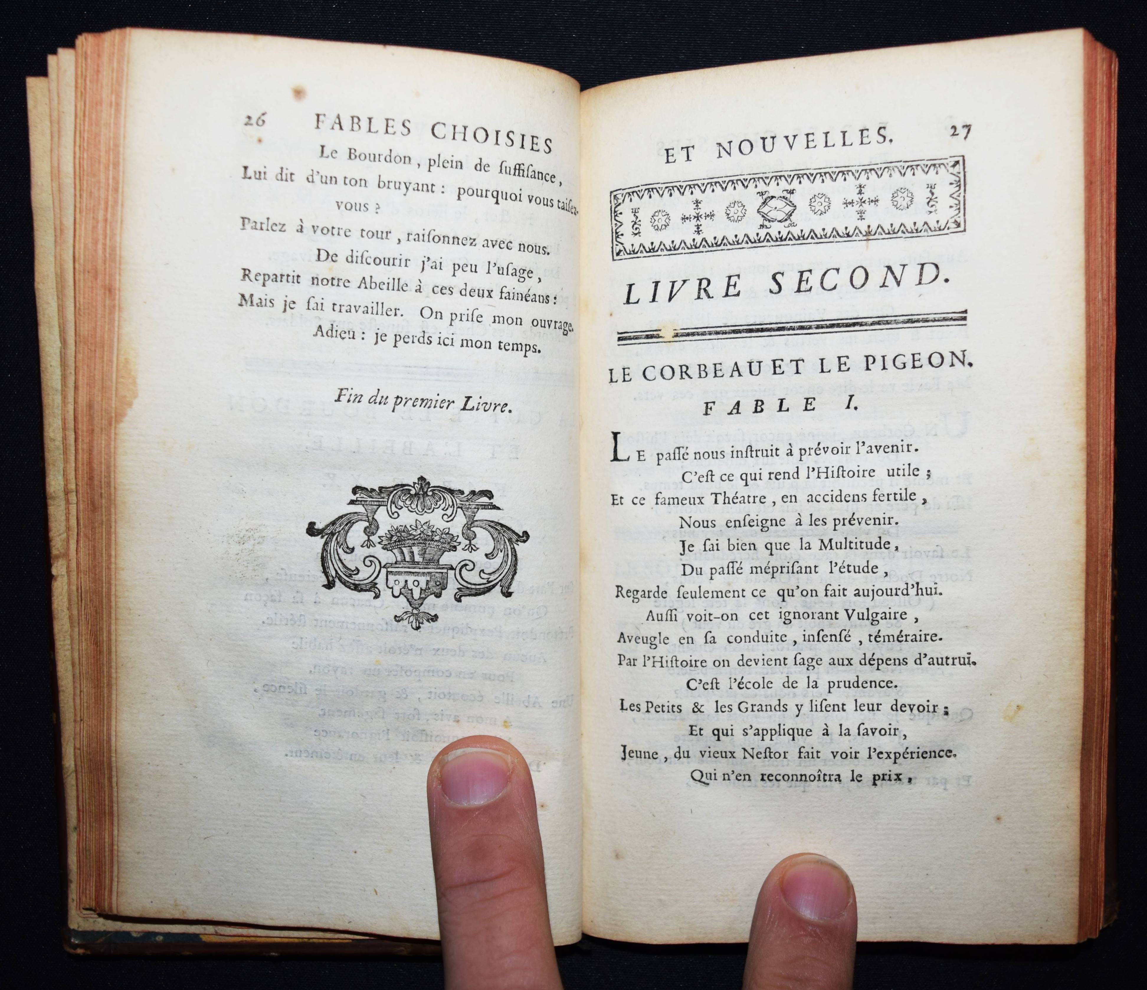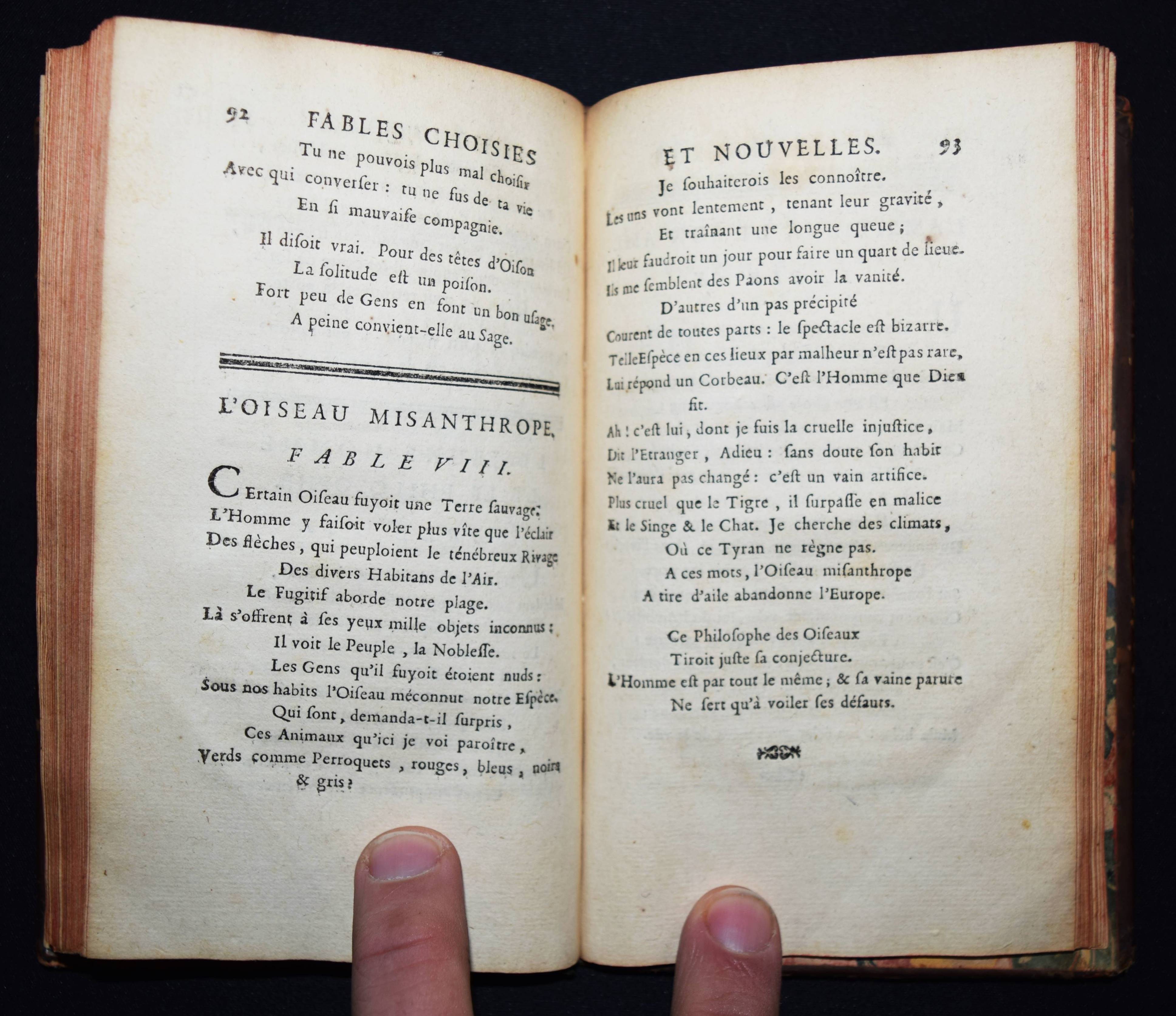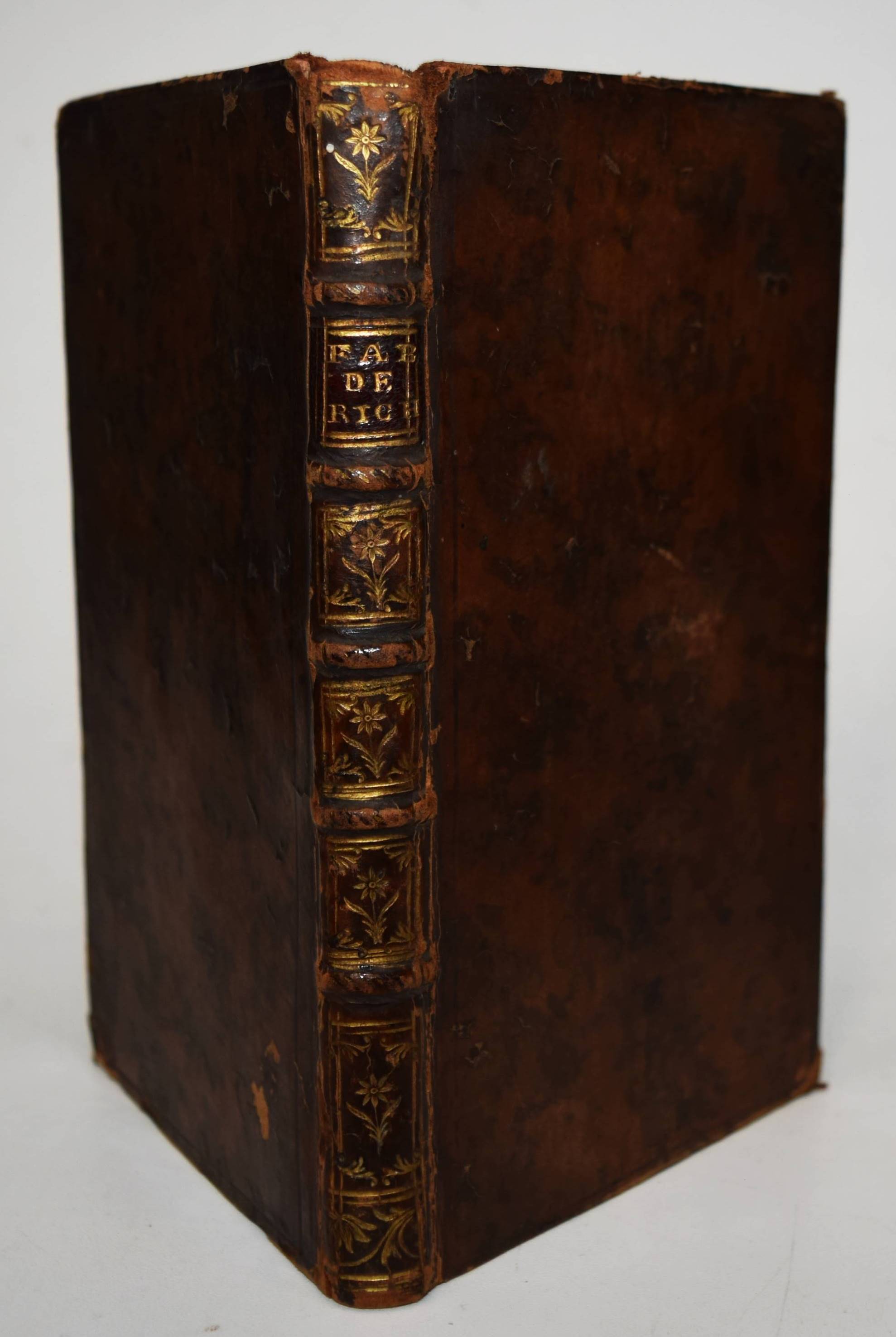 Richer, Henri. Fables choisies et nouvelles, mises en vers, dédiées à son Altesse Serenissime Monseigneur le Comte de La Marche. Avec la vie d’Esope, tirée de Plutarque & d’autres auteurs. Paris, veuve Pissot & Bullot 1744. Kl.-8°. XX, 116 S., [2] Bl. mit gestoch. Frontispiz von J(ean)-B(aptiste) Oudry. Kalbslederband der Zeit mit goldgepr. Rückenschild und floraler Rückenvergoldung. Vgl. Bodemann 129.1 (spätere Gesamtausgabe). – Seltene erste Ausgabe des zweiten Teils der Fabelsammlung mit 22 Fabeln. Der erste Teil erschien 1729. 1748 erschien eine Gesamtausgabe. – Die Fabeln „in freien Versen, z. T. nach traditionellen Motiven, stark orientiert am Vorbild La Fontaine“ (W. Metzner). – Gelenke und Kanten etwas berieben, gutes dekorativ gebundenes Exemplar.