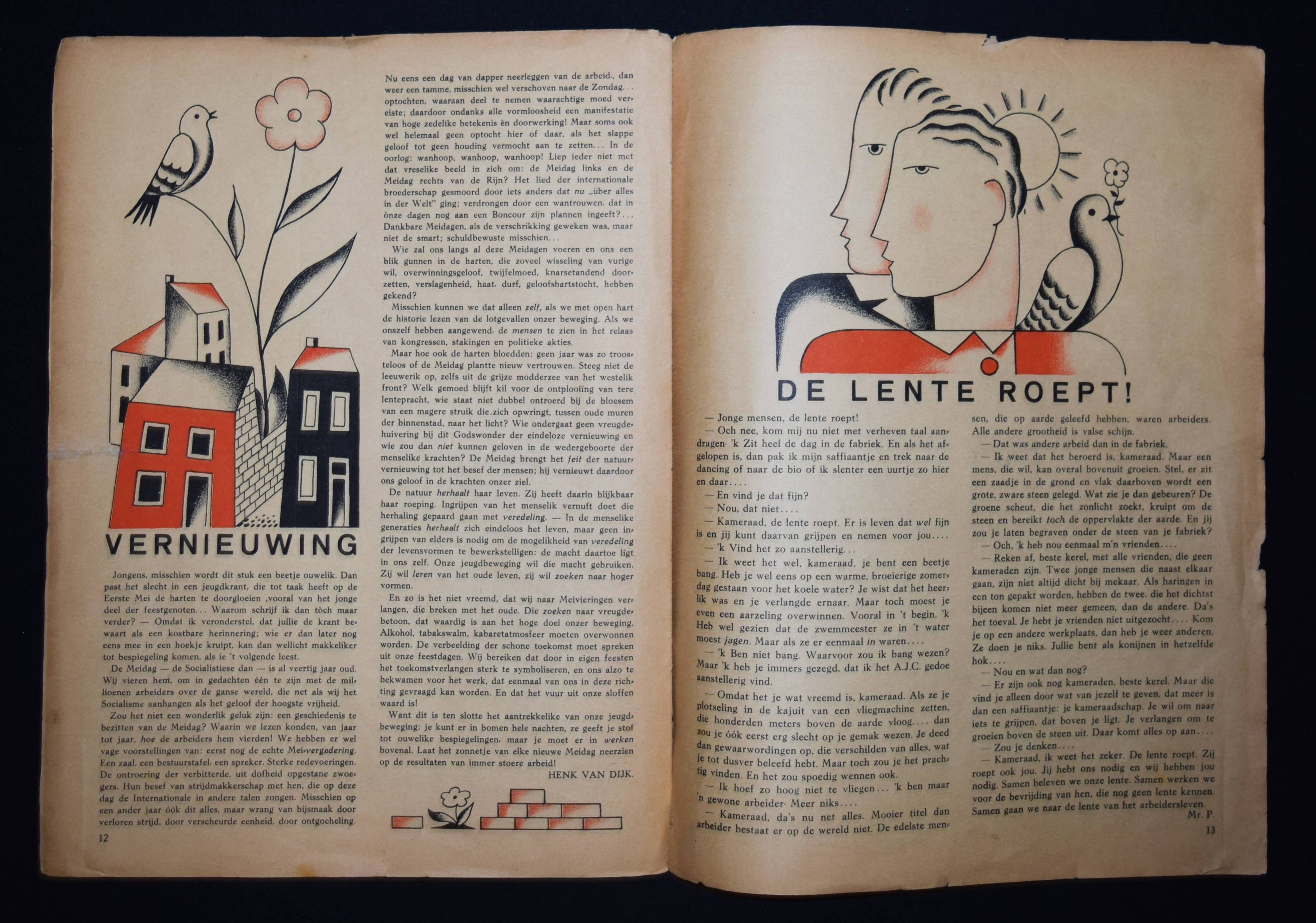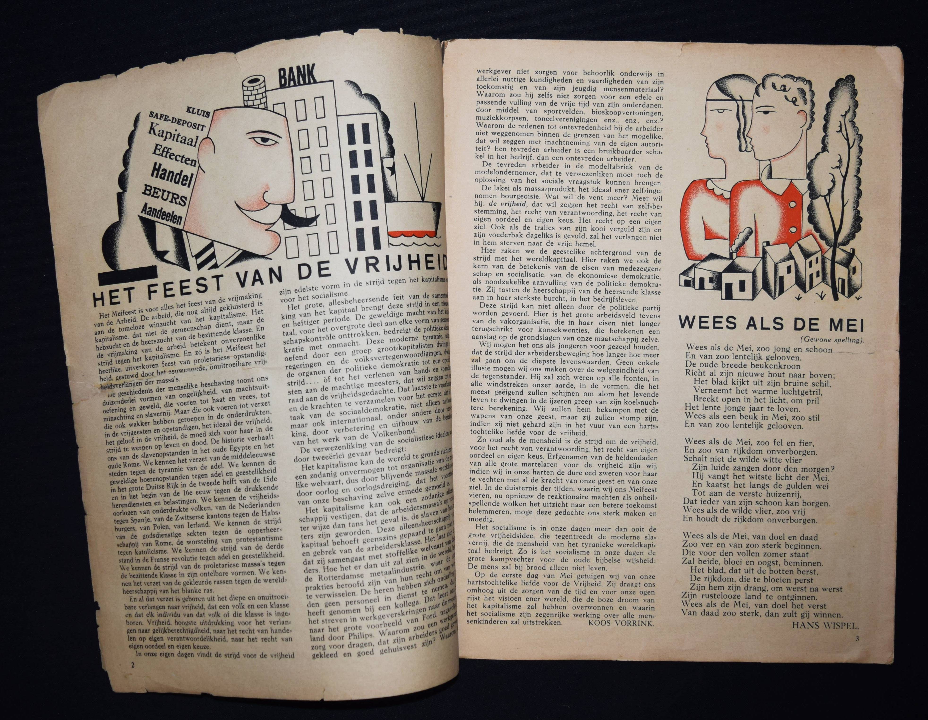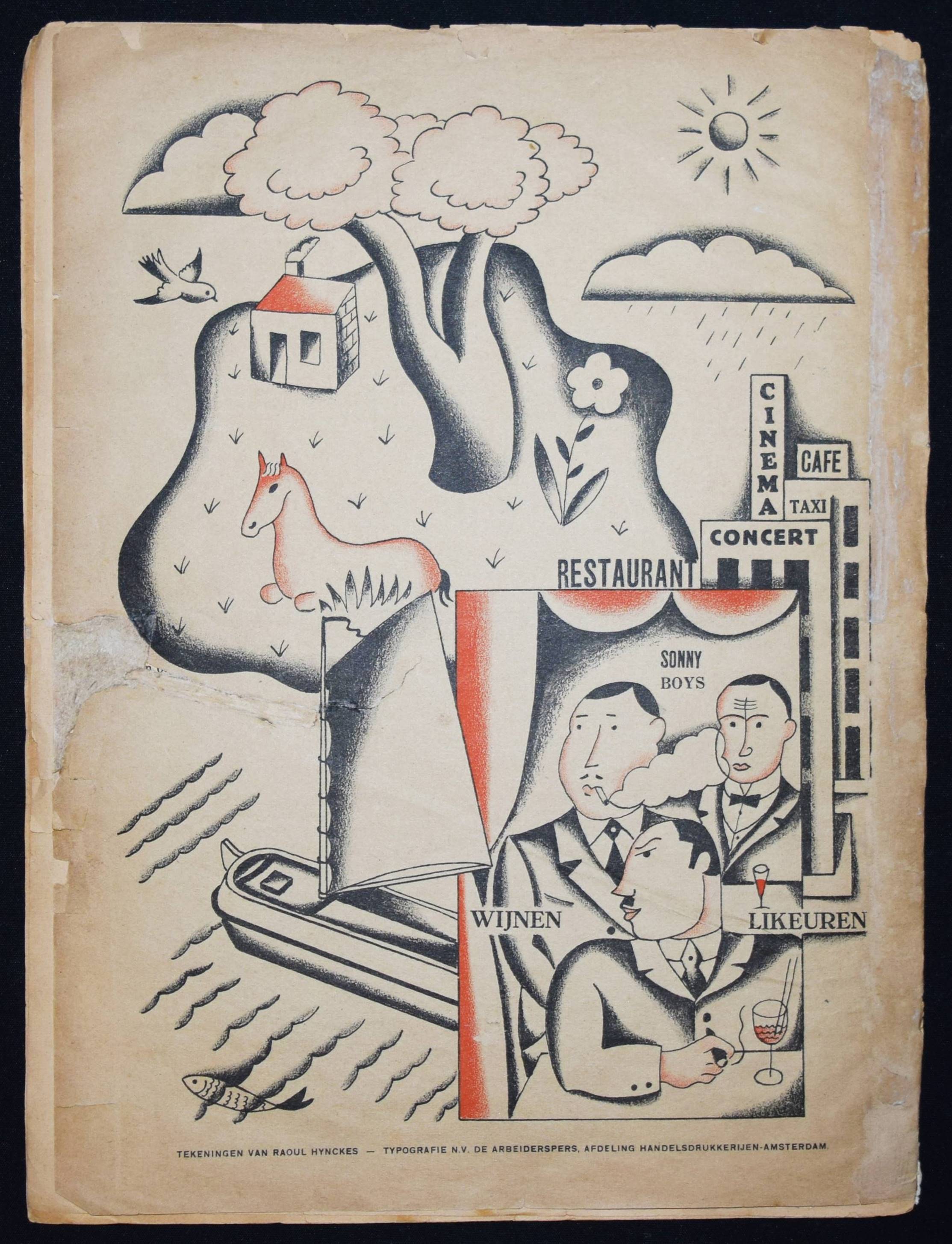 Vorrink, (Jacobus Jan) Koos (Hrsg.). De Meiroep. Uitgave van de Arbeiders Jeugd Centrale (AJC). Amsterdam, Afdeling Handelsdrukkerijen o. J. (um 1930). Gr.-4° (32,3 x 24,5 cm.). 15, (1) S. (inkl. Umschlag) mit 10 Illustrationen in Rot und Schwarz von Raoul Hynckes und 1 doppelblattgr. Fotomontage. Illustr. OBr. Sehr seltene niederländische sozialistische Jugendzeitschrift. Mit Beiträgen von J. J. K. Vorrink, Hans Wispel, Theo Thijssen, J. F. Ankersmit, Klaas Toornstra, Piet Bakker, Henk van Dijk, Herman Molendijk und Henk van Laar. – „Die Arbeiders Jeugd Centrale (AJC) war zwischen 1918 und 1959 eine sozialistische Jugendbewegung, die von der Sozialdemokratischen Arbeiterpartei (SDAP) und dem niederländischen Gewerkschaftsverband (NVV) gegründet wurde. Ziel des AJC war es, die Jugend der Arbeiterklasse auszubilden und zu fördern. Das sozialistische Kulturideal wurde mit traditionellen Sitten, ohne Alkohol und Tabak sowie mit körperlicher Bewegung, Volkstanz, Musik und Laienspielen verwirklicht. … Koos Vorrink (1891–1955) war ein inspirierender Anführer des AJC. Von 1927 bis 1934 war er Bundesvorsitzender. Er bat den ehemaligen Lehrer und Musiker Piet Tiggers (1891-1968), die Musikarbeit im AJC aufzubauen; Seine Frau Line Hoven sorgte für den Volkstanz bei den Führungskursen“ (Wikipedia). – Mit hervorragenden Illustrationen des belgisch-niederl. Künstlers R. Hynckes (1893-1973), einer der wichtigsten Vertreter des magischen Realismus. – Umschlag mit Randläsuren, größerer Randeinriss bei allen Blättern geschlossen (geringf. Textverlust auf letzten Seite), papierbedingt etwas gebräunt, sonst gut erhalten.