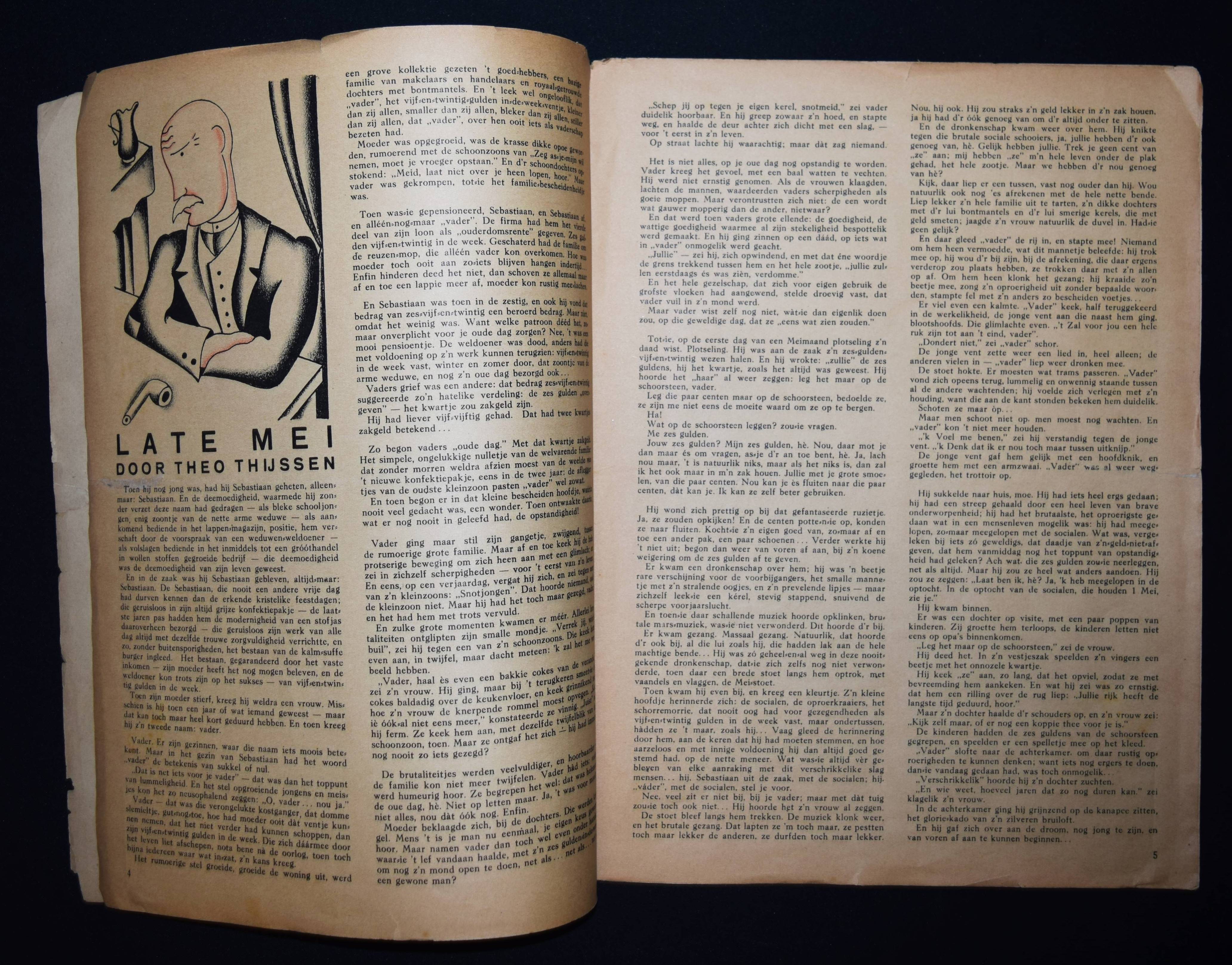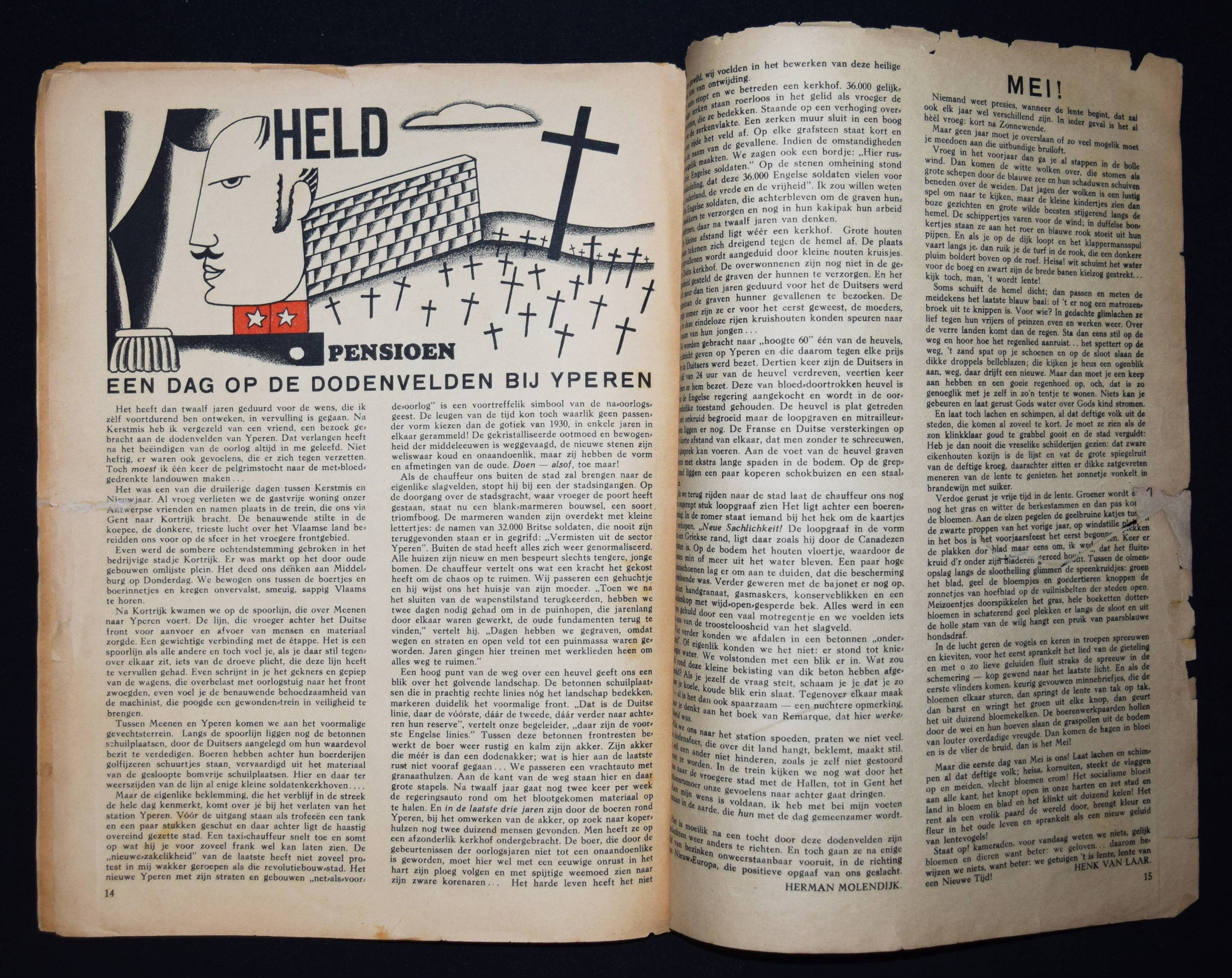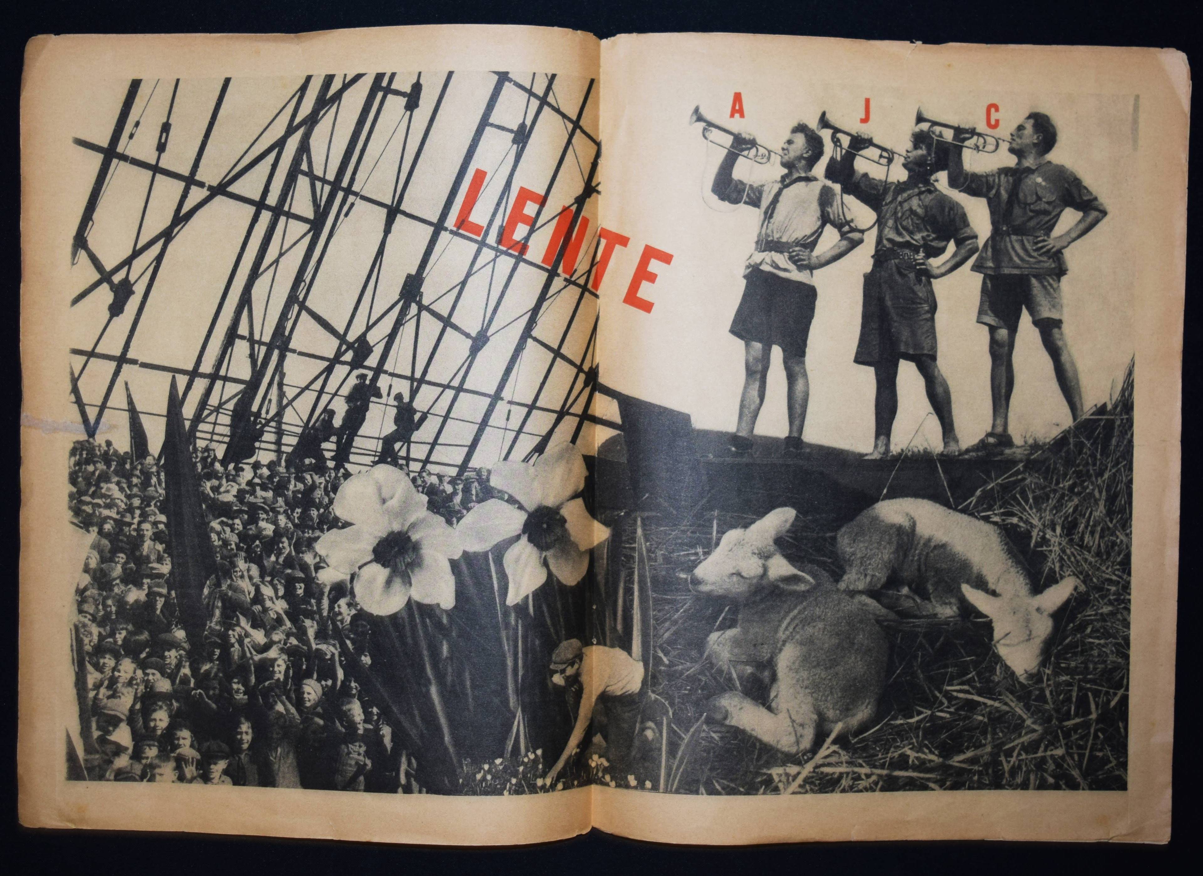 Vorrink, (Jacobus Jan) Koos (Hrsg.). De Meiroep. Uitgave van de Arbeiders Jeugd Centrale (AJC). Amsterdam, Afdeling Handelsdrukkerijen o. J. (um 1930). Gr.-4° (32,3 x 24,5 cm.). 15, (1) S. (inkl. Umschlag) mit 10 Illustrationen in Rot und Schwarz von Raoul Hynckes und 1 doppelblattgr. Fotomontage. Illustr. OBr. Sehr seltene niederländische sozialistische Jugendzeitschrift. Mit Beiträgen von J. J. K. Vorrink, Hans Wispel, Theo Thijssen, J. F. Ankersmit, Klaas Toornstra, Piet Bakker, Henk van Dijk, Herman Molendijk und Henk van Laar. – „Die Arbeiders Jeugd Centrale (AJC) war zwischen 1918 und 1959 eine sozialistische Jugendbewegung, die von der Sozialdemokratischen Arbeiterpartei (SDAP) und dem niederländischen Gewerkschaftsverband (NVV) gegründet wurde. Ziel des AJC war es, die Jugend der Arbeiterklasse auszubilden und zu fördern. Das sozialistische Kulturideal wurde mit traditionellen Sitten, ohne Alkohol und Tabak sowie mit körperlicher Bewegung, Volkstanz, Musik und Laienspielen verwirklicht. … Koos Vorrink (1891–1955) war ein inspirierender Anführer des AJC. Von 1927 bis 1934 war er Bundesvorsitzender. Er bat den ehemaligen Lehrer und Musiker Piet Tiggers (1891-1968), die Musikarbeit im AJC aufzubauen; Seine Frau Line Hoven sorgte für den Volkstanz bei den Führungskursen“ (Wikipedia). – Mit hervorragenden Illustrationen des belgisch-niederl. Künstlers R. Hynckes (1893-1973), einer der wichtigsten Vertreter des magischen Realismus. – Umschlag mit Randläsuren, größerer Randeinriss bei allen Blättern geschlossen (geringf. Textverlust auf letzten Seite), papierbedingt etwas gebräunt, sonst gut erhalten.