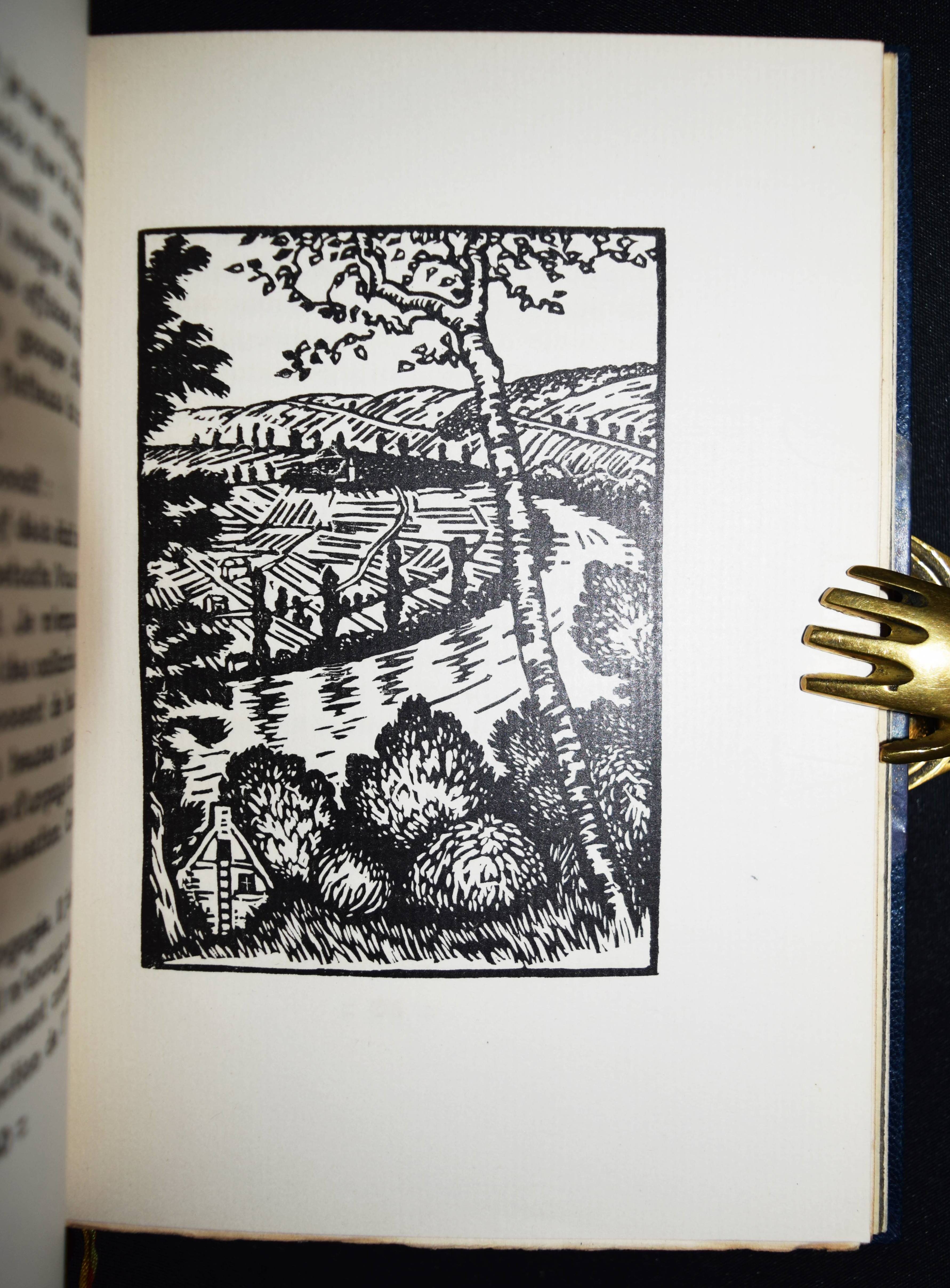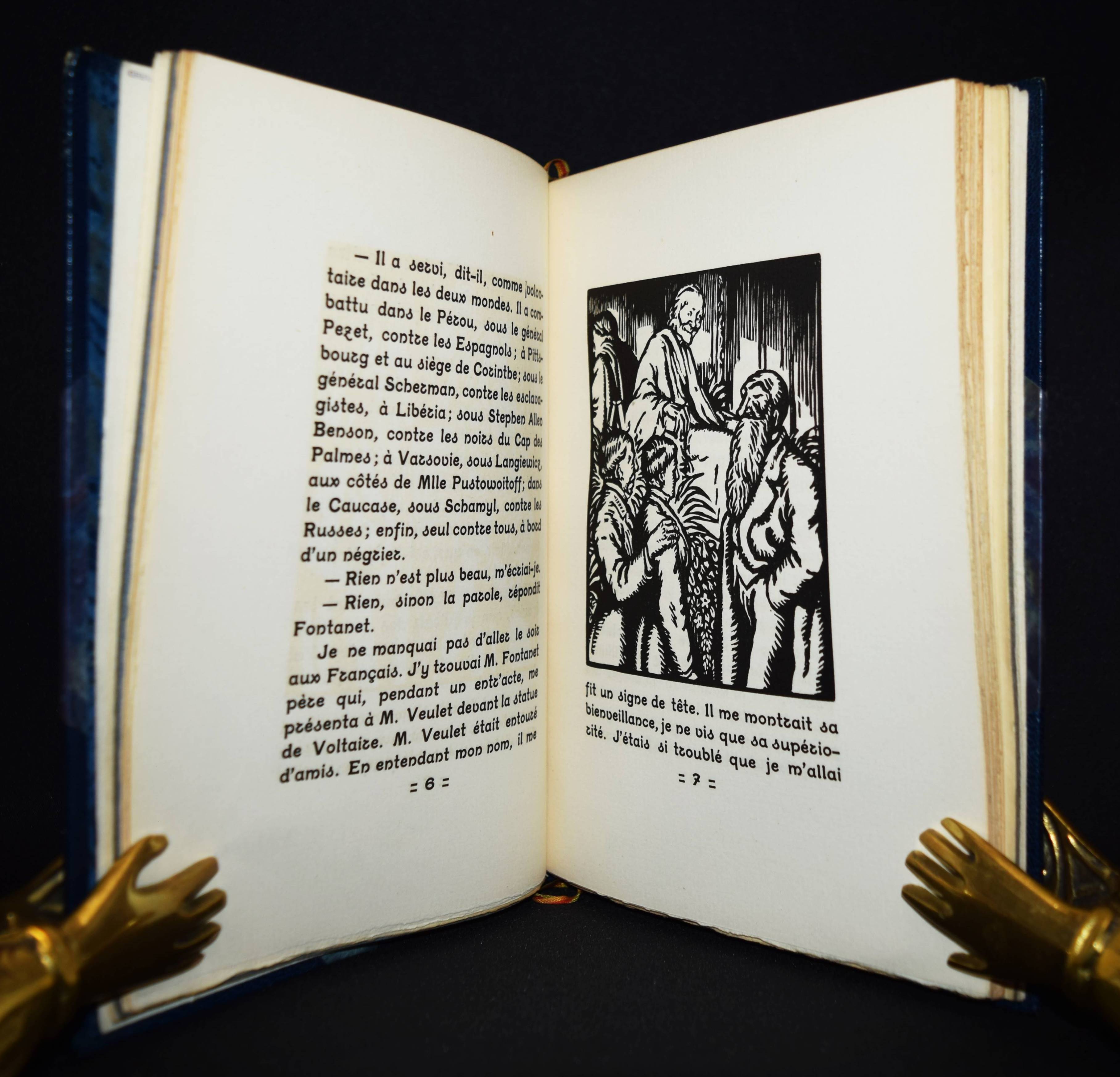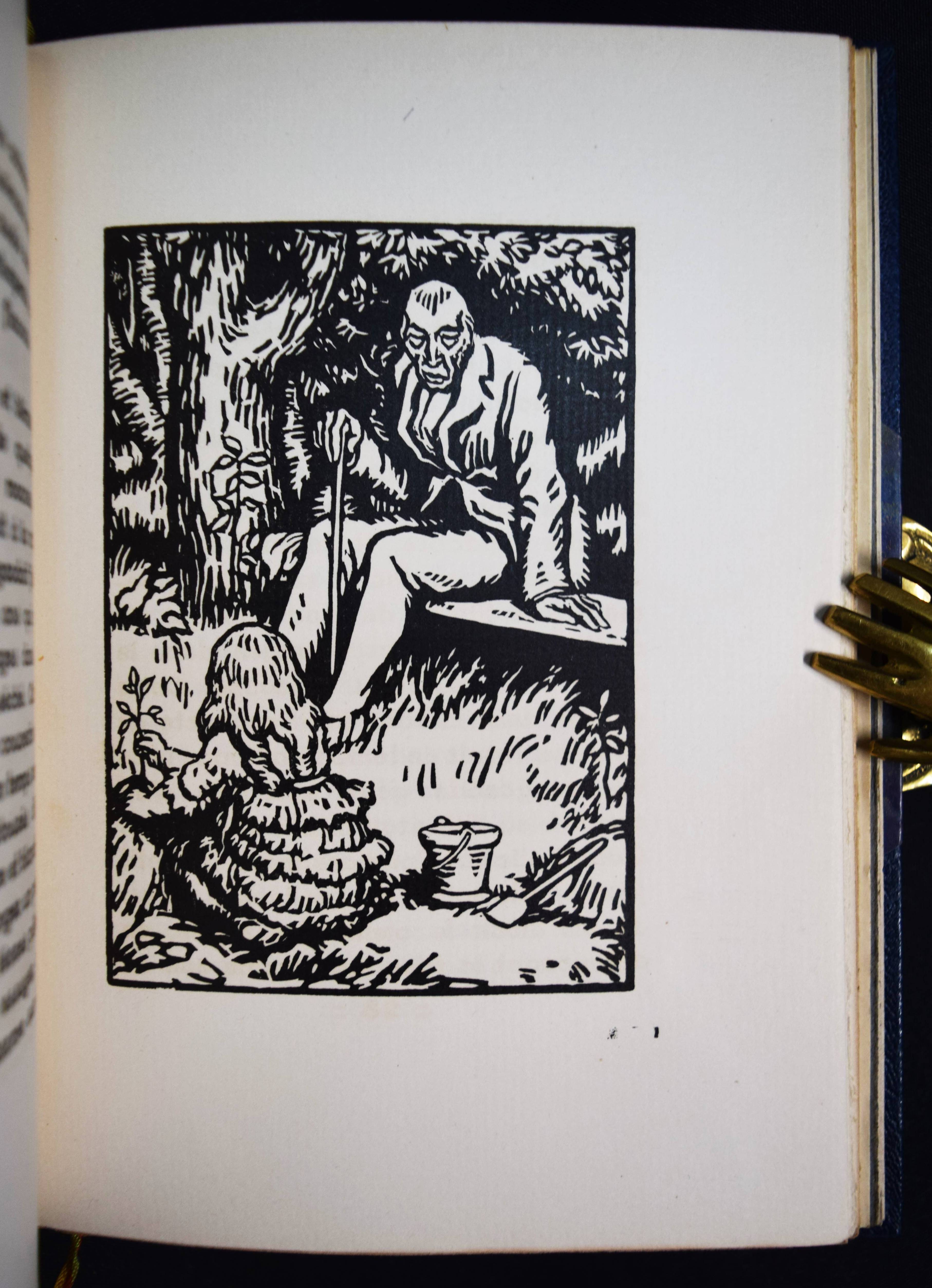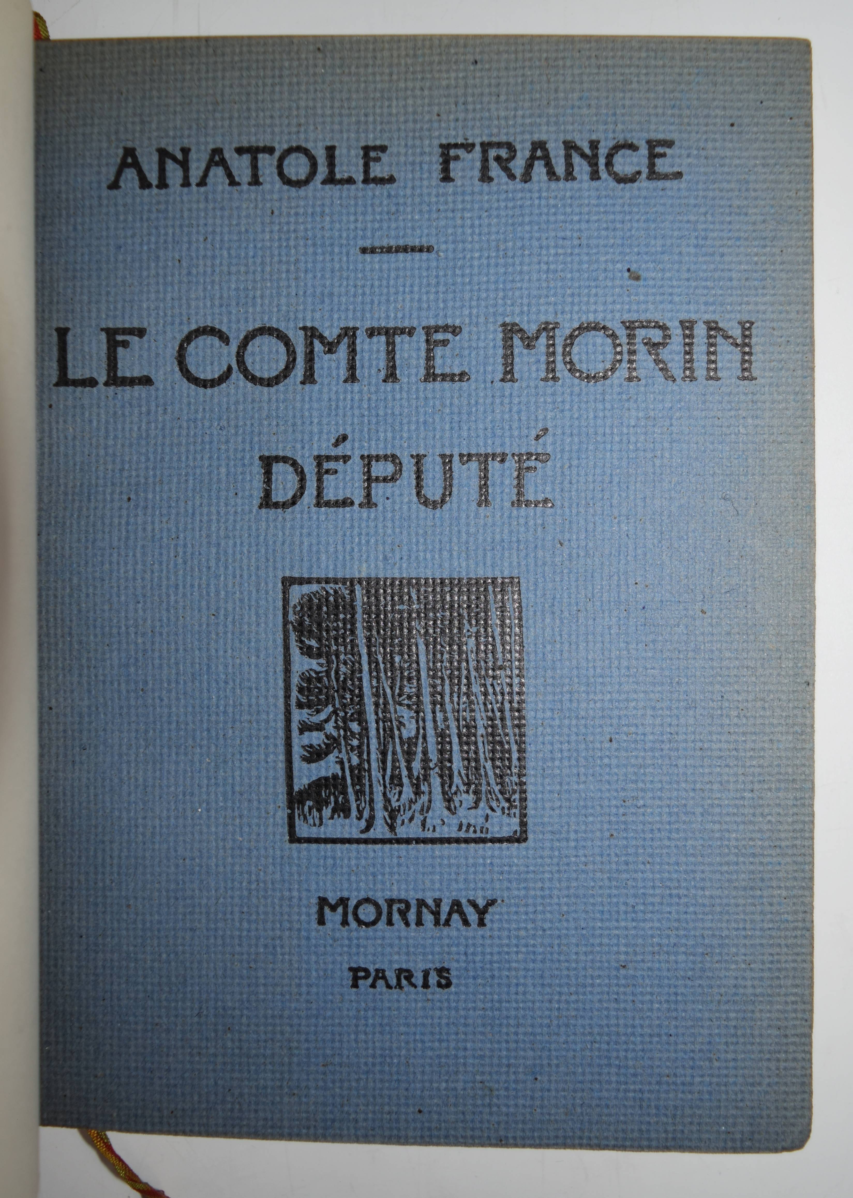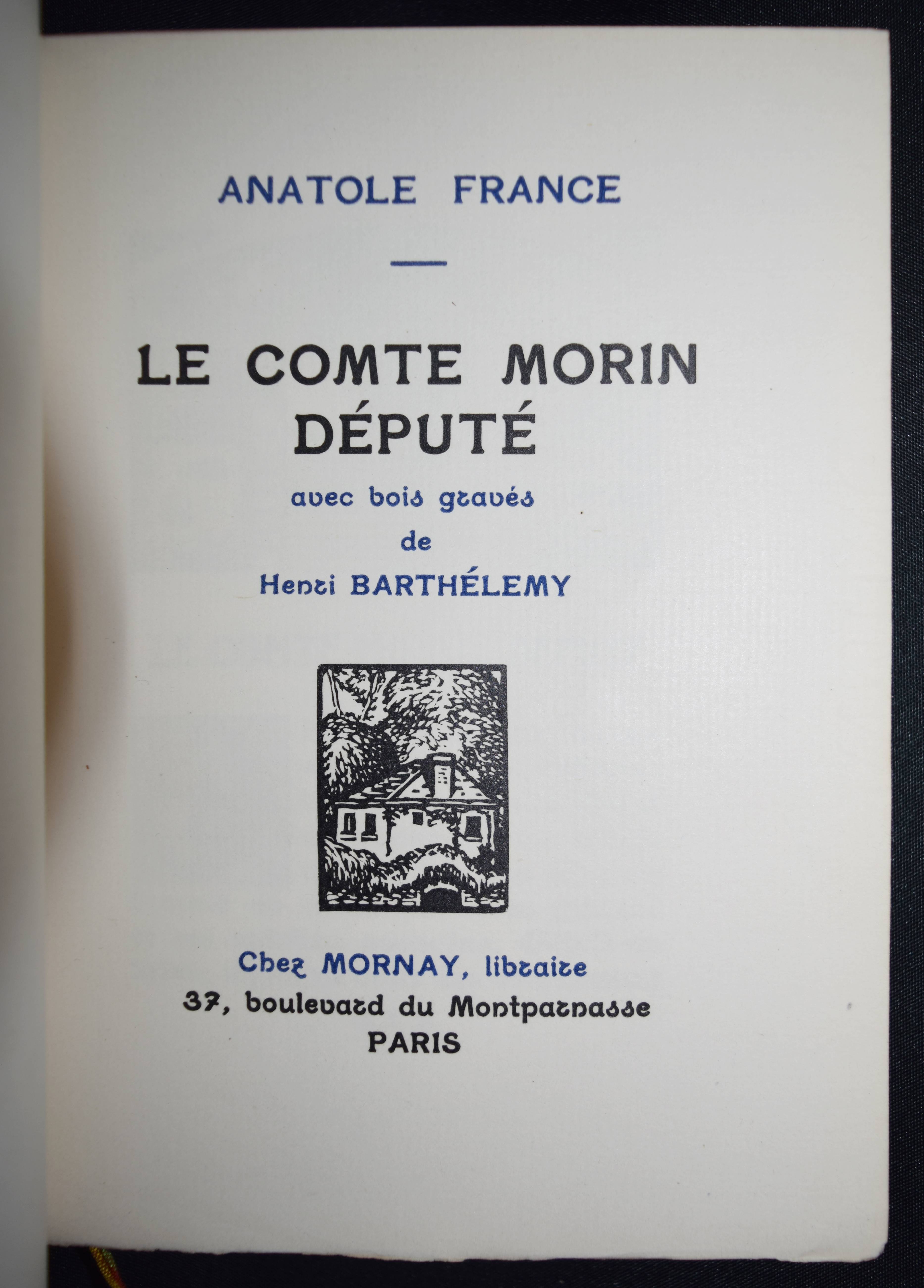 France, Anatole. Le comte Morin député. Avec bois gravés de Henri Barthélemy. Paris, Mornay (1921). 8°. [3] Bl., 68 S., [2] Bl. mit 19 Orig.-Holzschnitten (17 im Text und 2 auf dem Umschlag), alle Holzschnitte nochmals als Suite beigebunden. Dunkelblauer Halbmaroquinband der Zeit mit goldgepr. Rückentitel, dekorativer Rückenvergoldung, Deckelfiletten und Kopfgoldschnitt (signiert: (Henri) Creuzevault, Orig.-Umschlag beigebunden). Eines von 643 num. Exemplaren auf Hollande van Gelder (Gesamtauflage 735 Exemplare). – Mit einer Suite der Holzschnitte des franz. Illustrators H. Barhélemy (1884-1977). – Sehr schönes Exemplar in einem Meistereinband des berühmten franz. Buchbinders H. Creuzevault (1905-1971), der mehrfach ausgezeichnet wurde u.a. mit dem „Premier Prix de reliure“ auf der Exposition Internationale in Paris 1937.