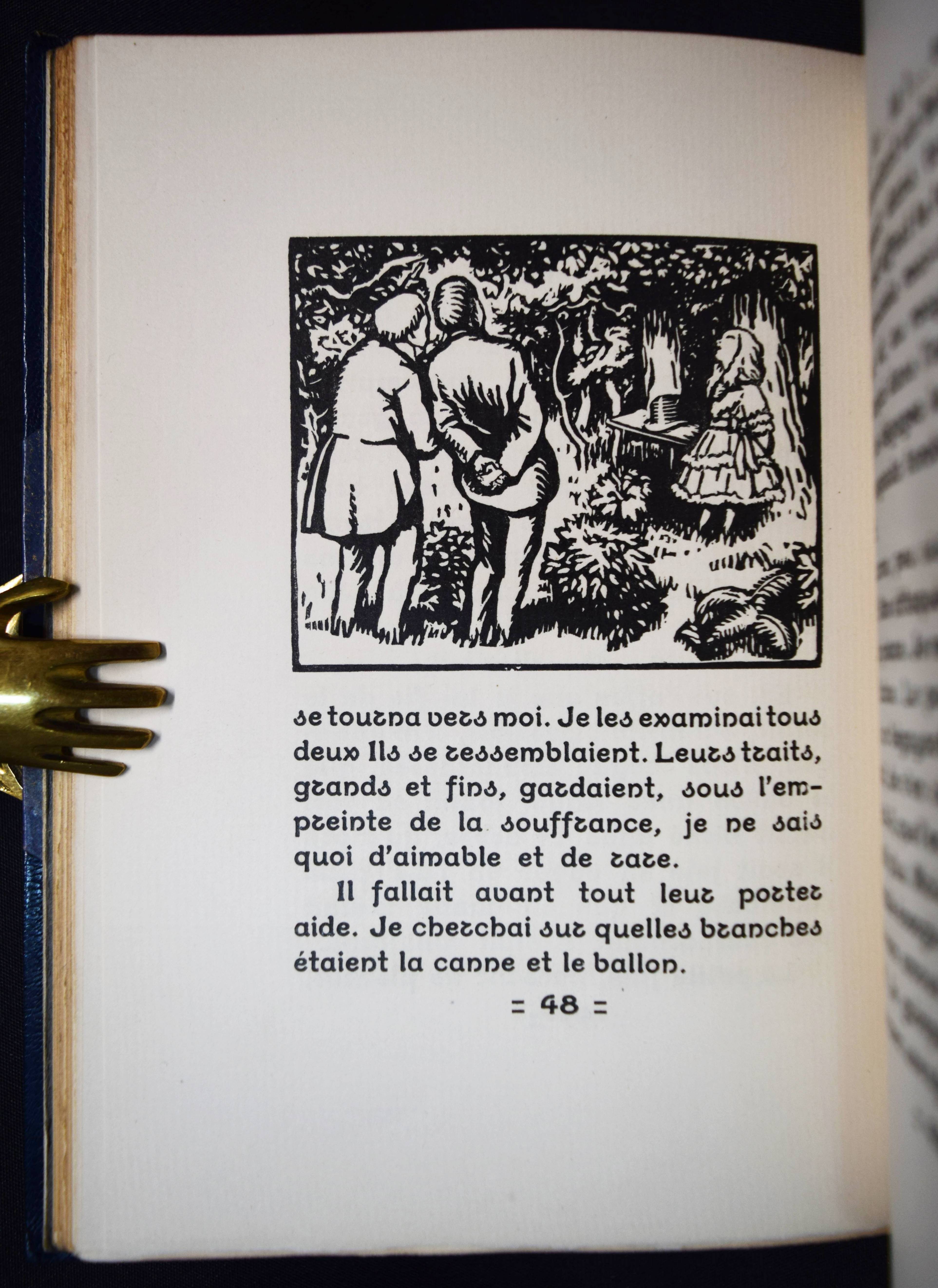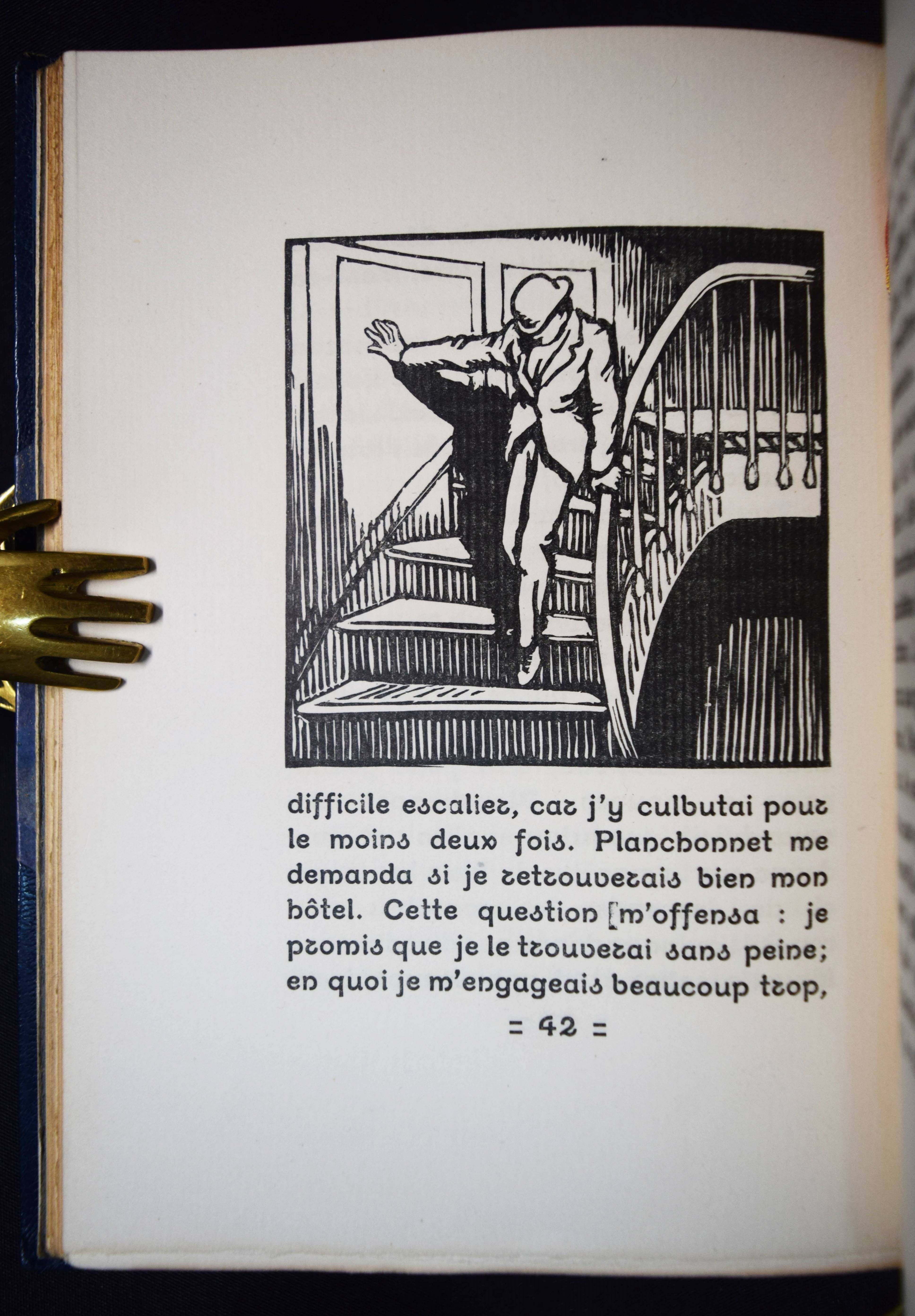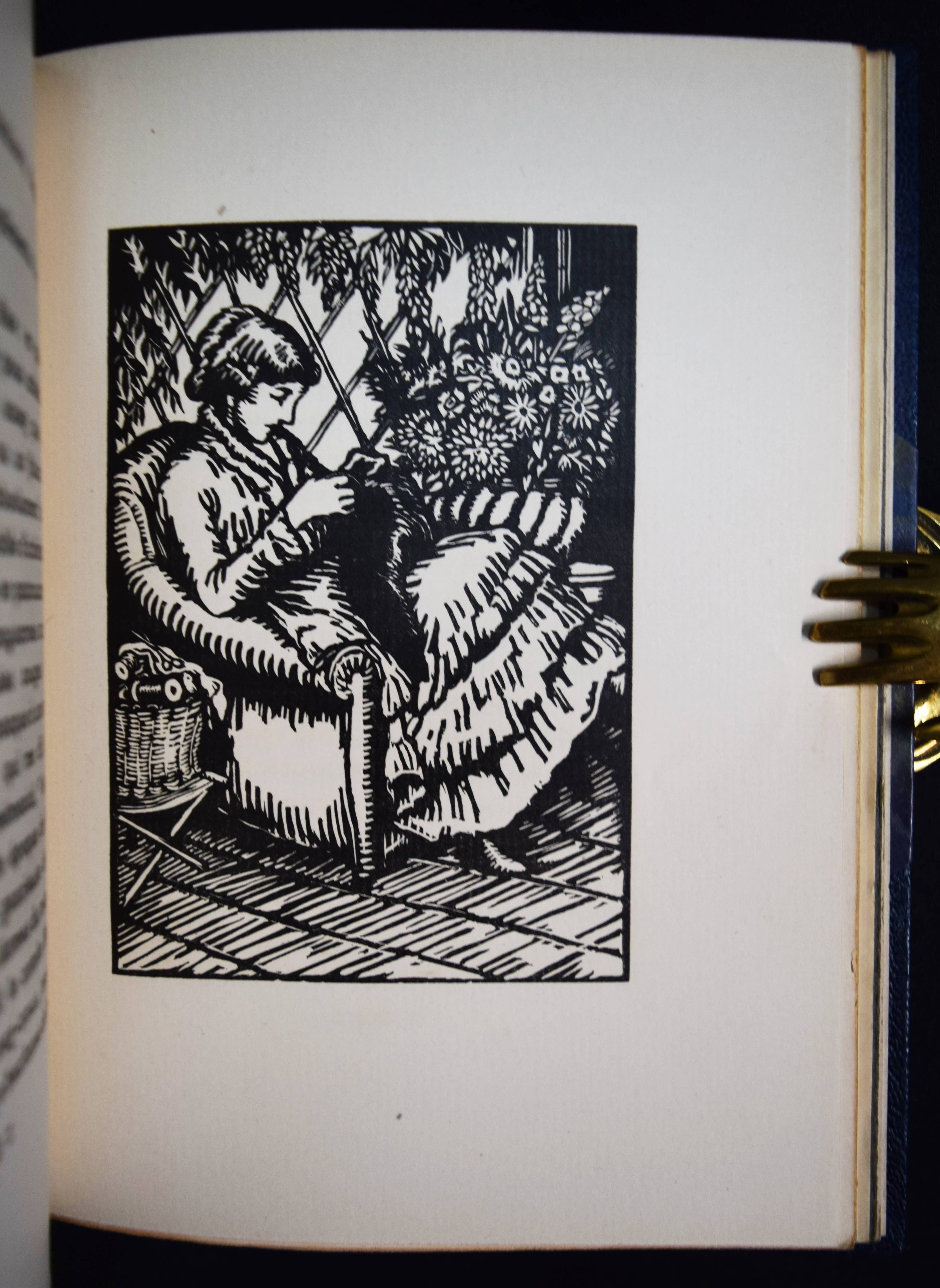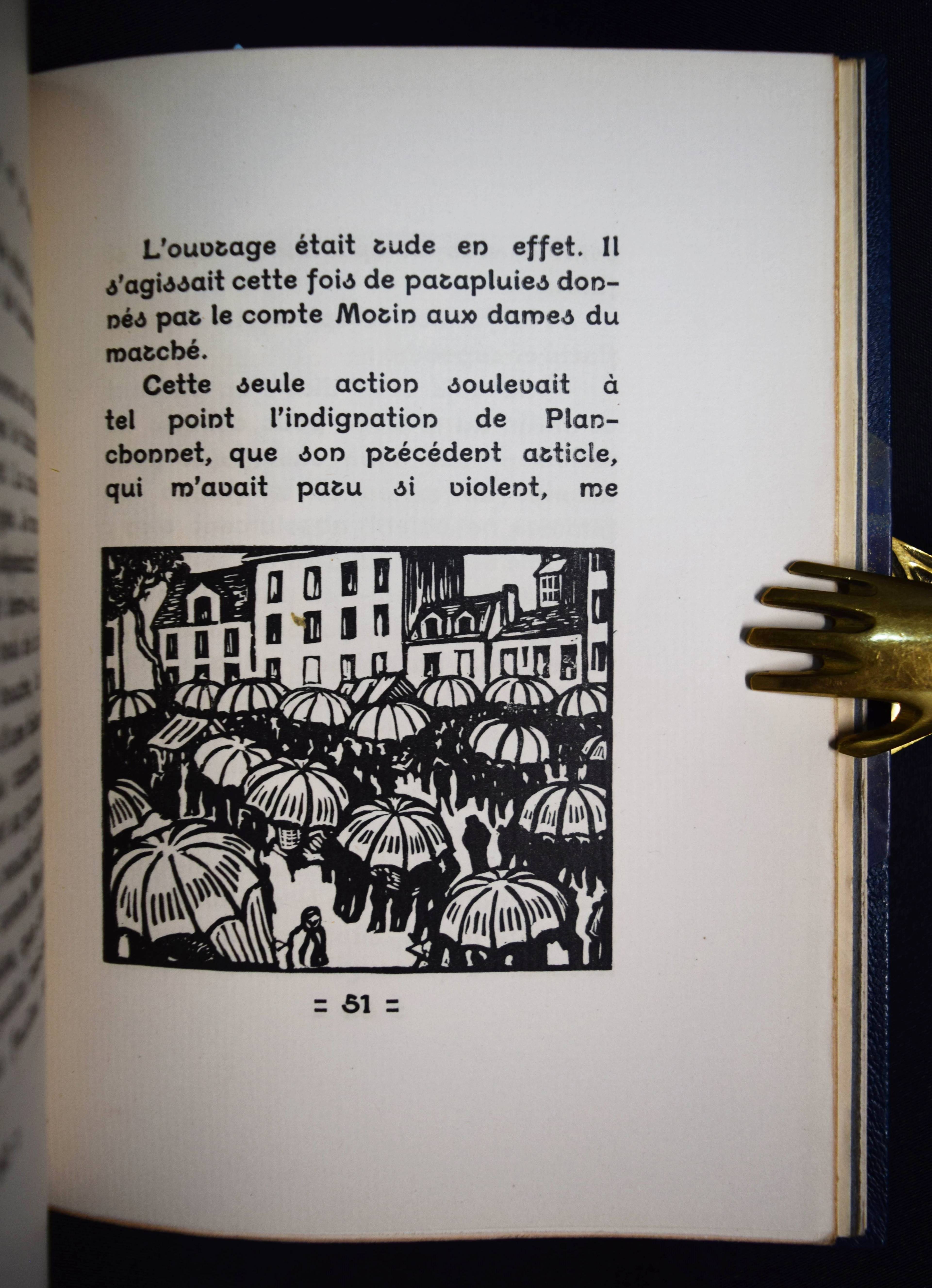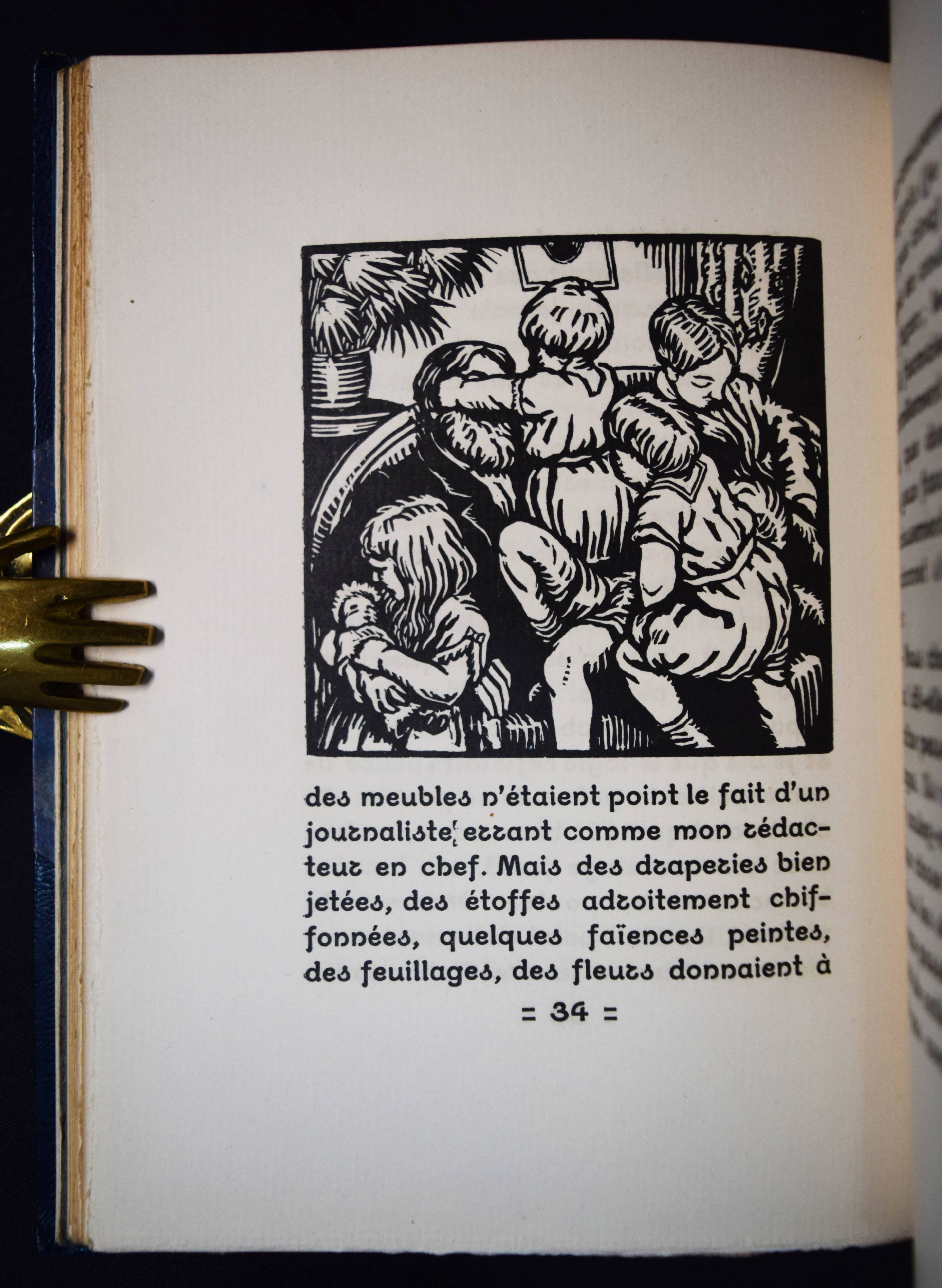 France, Anatole. Le comte Morin député. Avec bois gravés de Henri Barthélemy. Paris, Mornay (1921). 8°. [3] Bl., 68 S., [2] Bl. mit 19 Orig.-Holzschnitten (17 im Text und 2 auf dem Umschlag), alle Holzschnitte nochmals als Suite beigebunden. Dunkelblauer Halbmaroquinband der Zeit mit goldgepr. Rückentitel, dekorativer Rückenvergoldung, Deckelfiletten und Kopfgoldschnitt (signiert: (Henri) Creuzevault, Orig.-Umschlag beigebunden). Eines von 643 num. Exemplaren auf Hollande van Gelder (Gesamtauflage 735 Exemplare). – Mit einer Suite der Holzschnitte des franz. Illustrators H. Barhélemy (1884-1977). – Sehr schönes Exemplar in einem Meistereinband des berühmten franz. Buchbinders H. Creuzevault (1905-1971), der mehrfach ausgezeichnet wurde u.a. mit dem „Premier Prix de reliure“ auf der Exposition Internationale in Paris 1937.