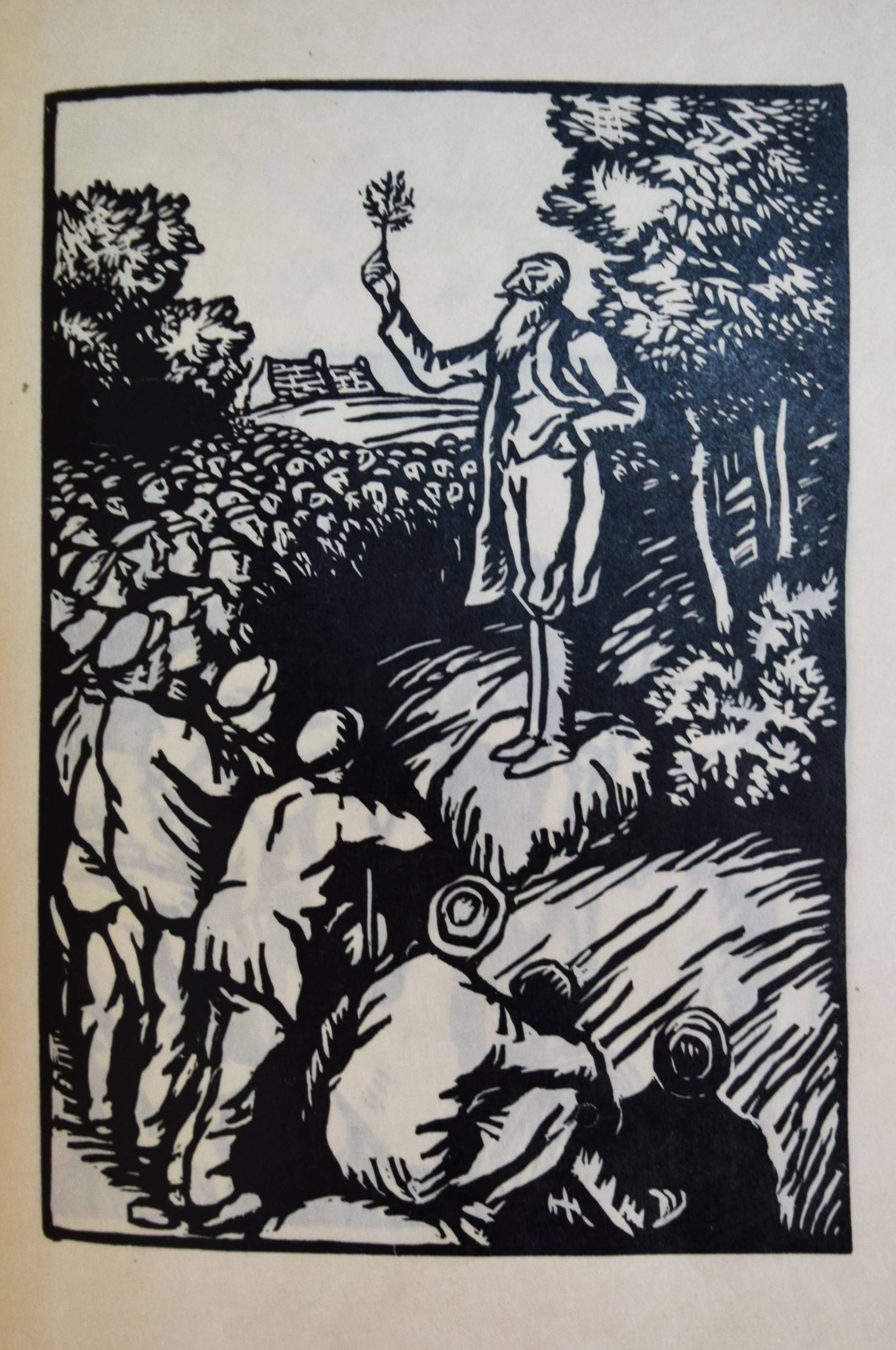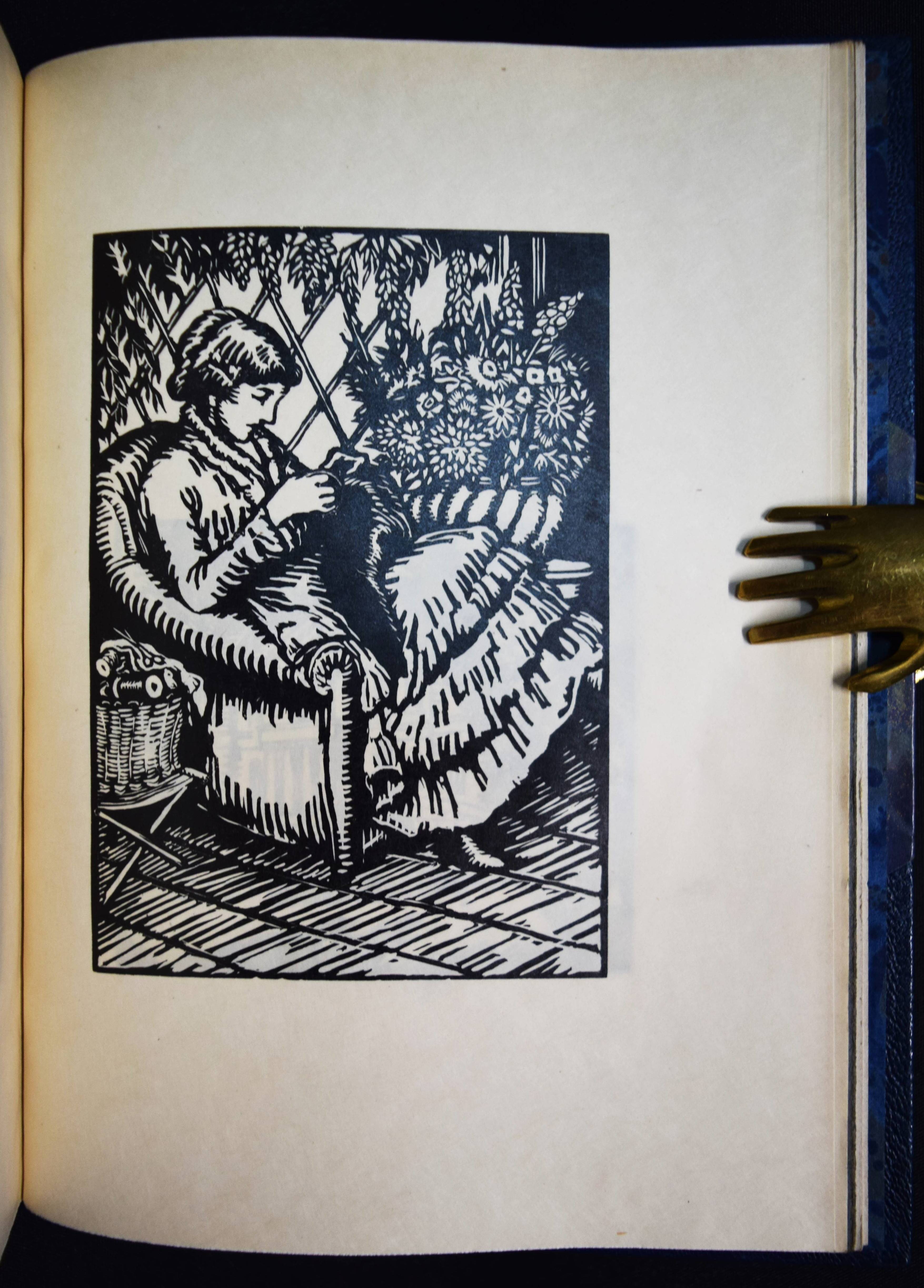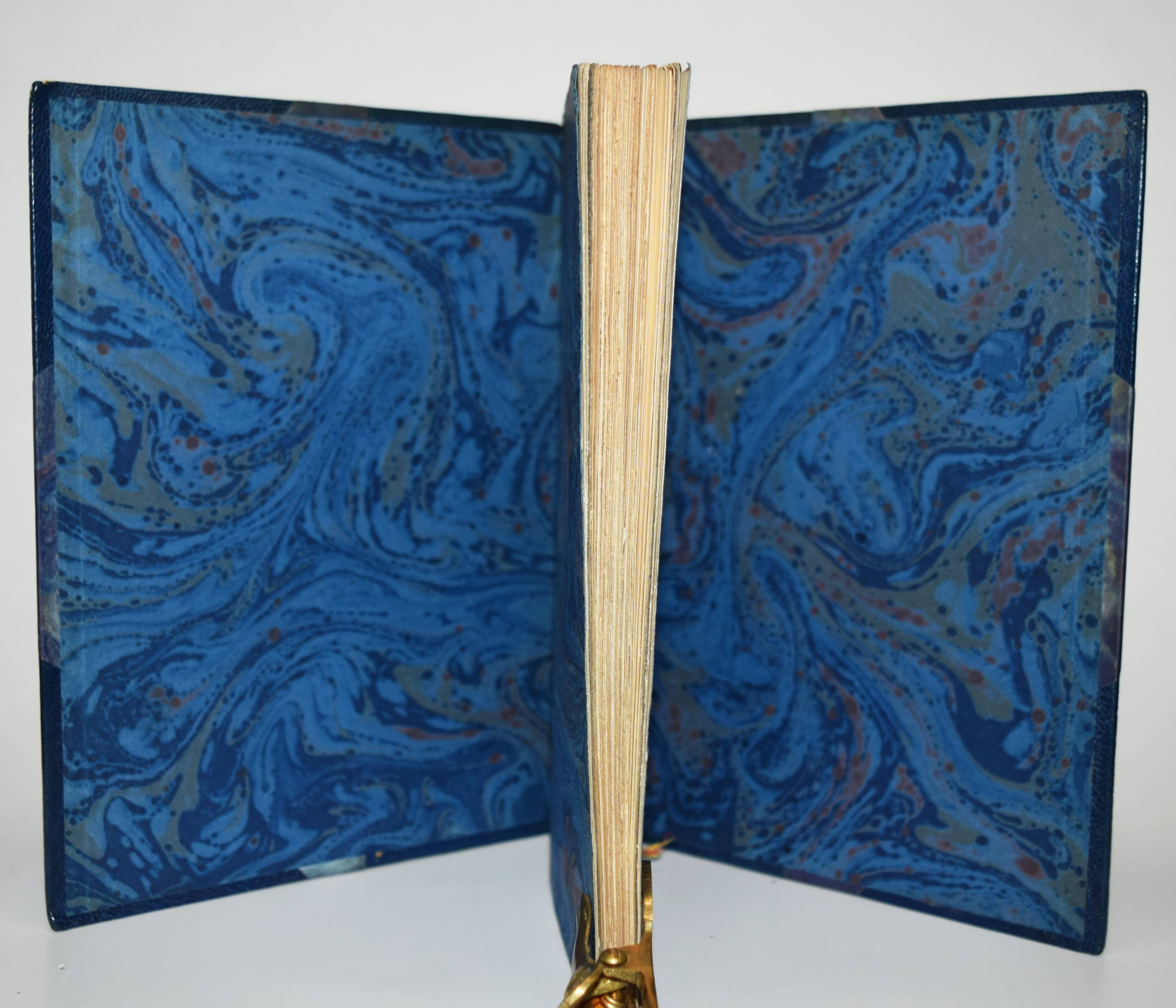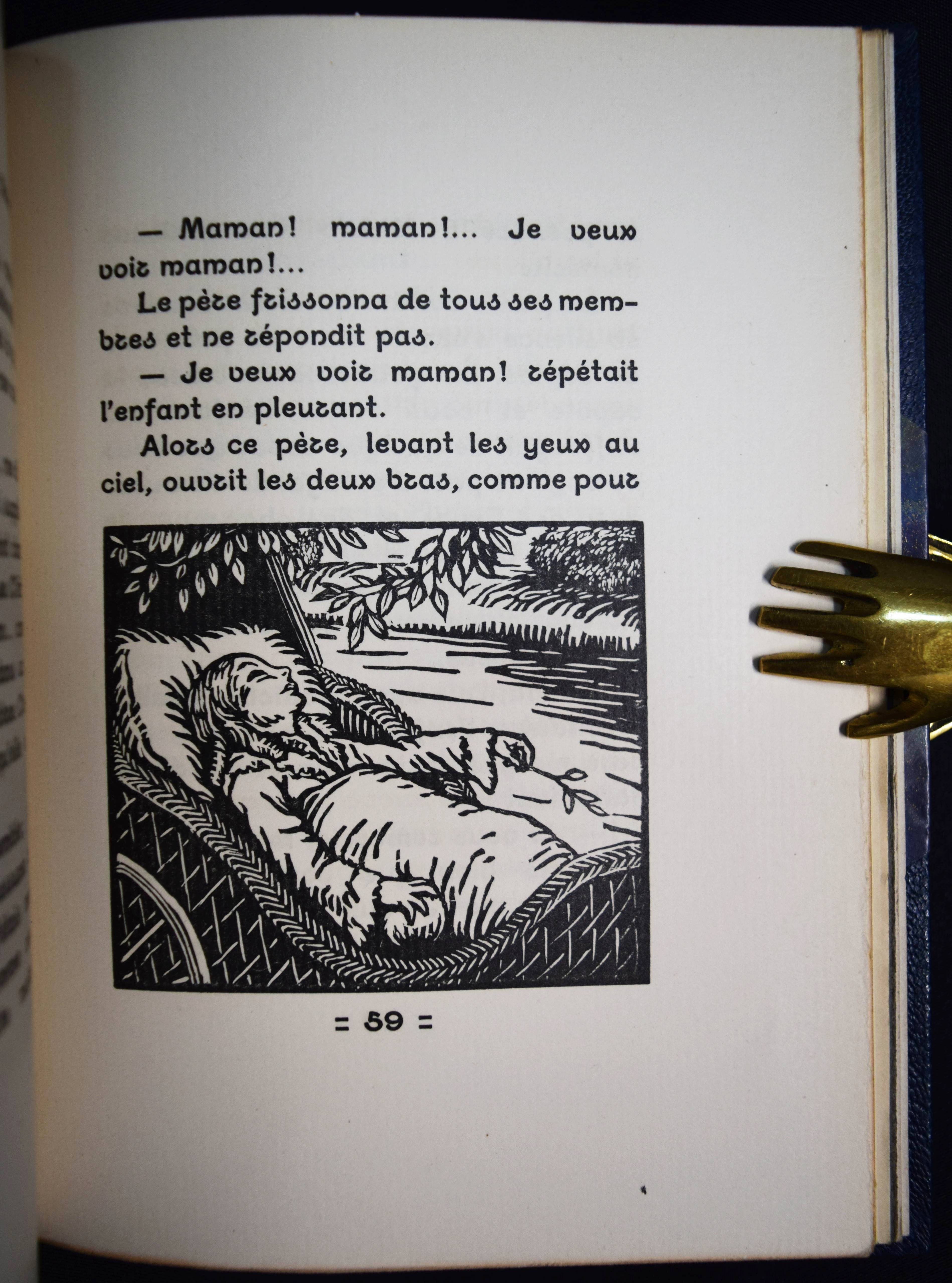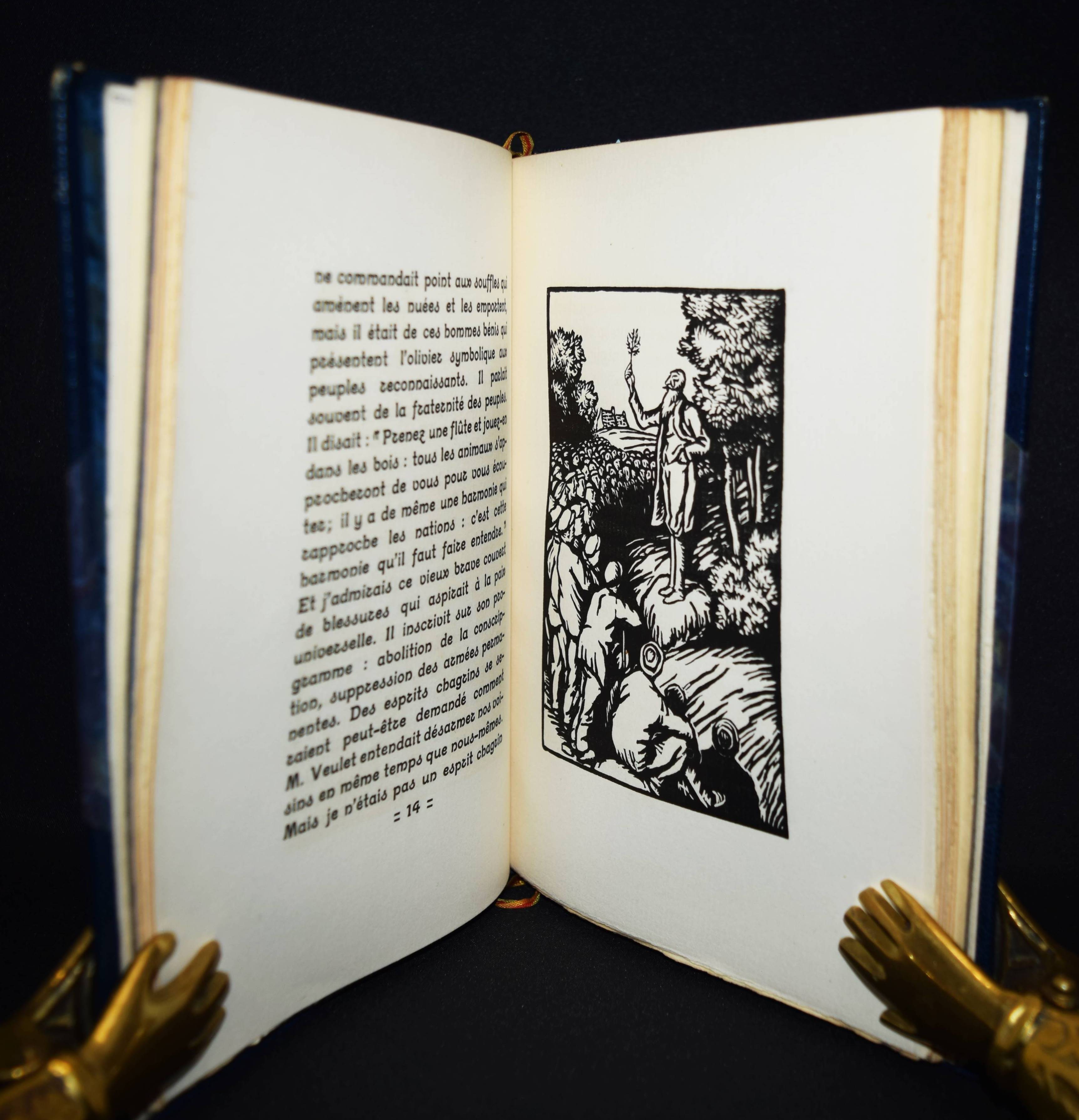 France, Anatole. Le comte Morin député. Avec bois gravés de Henri Barthélemy. Paris, Mornay (1921). 8°. [3] Bl., 68 S., [2] Bl. mit 19 Orig.-Holzschnitten (17 im Text und 2 auf dem Umschlag), alle Holzschnitte nochmals als Suite beigebunden. Dunkelblauer Halbmaroquinband der Zeit mit goldgepr. Rückentitel, dekorativer Rückenvergoldung, Deckelfiletten und Kopfgoldschnitt (signiert: (Henri) Creuzevault, Orig.-Umschlag beigebunden). Eines von 643 num. Exemplaren auf Hollande van Gelder (Gesamtauflage 735 Exemplare). – Mit einer Suite der Holzschnitte des franz. Illustrators H. Barhélemy (1884-1977). – Sehr schönes Exemplar in einem Meistereinband des berühmten franz. Buchbinders H. Creuzevault (1905-1971), der mehrfach ausgezeichnet wurde u.a. mit dem „Premier Prix de reliure“ auf der Exposition Internationale in Paris 1937.