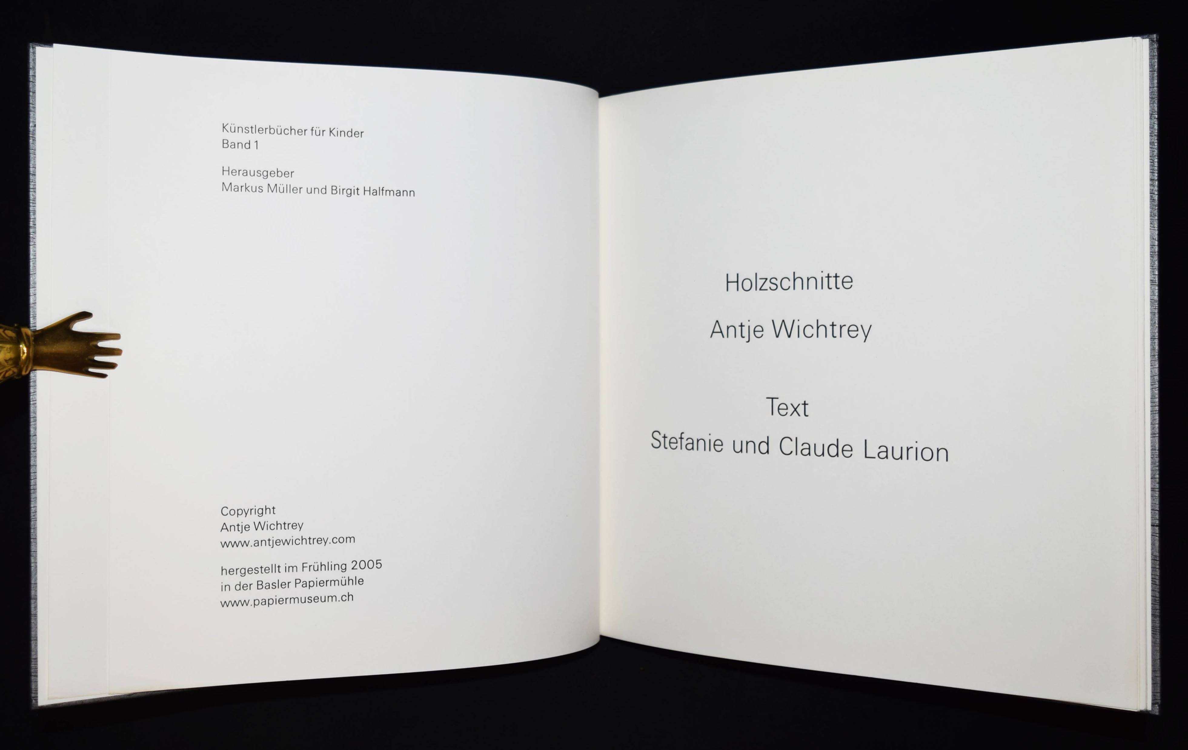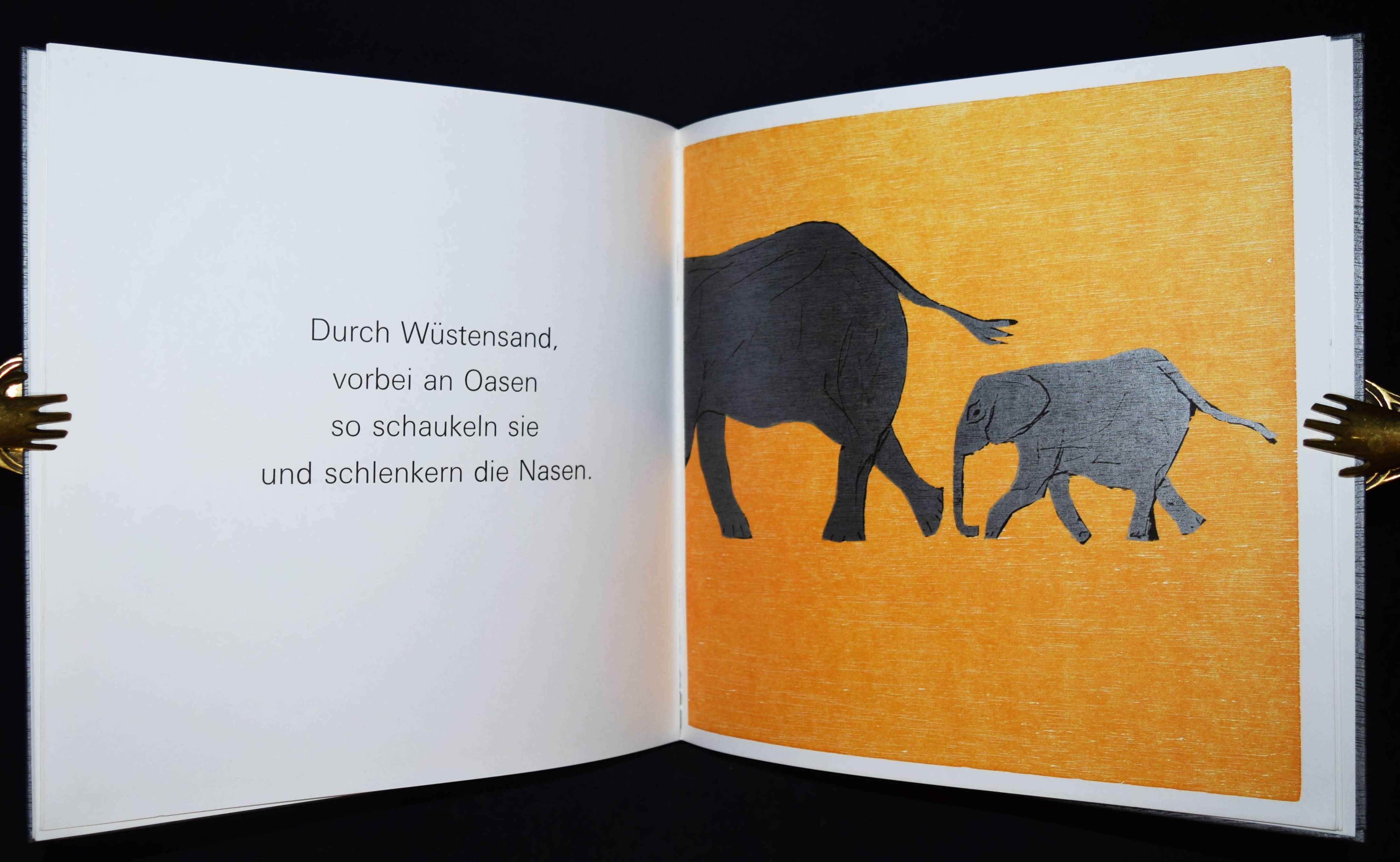 Laurion, Stefanie und Claude. Elefanten. Holzschnitte Antje Wichtrey. Basel, Basler Papiermühle (2005). Gr.-4° (32 x 32 cm.). [24] S. mit 12 Orig.-Holzschnitten (davon 2 auf den Deckeln). Illustr. Orig.-Halbleinenband. (Künstlerbücher für Kinder, Band 1). In limitierter Auflage von 1000 Exemplaren hergestelltes Künstler-Bilderbuch. – In der Basler Papiermühle von Original-Holzstöcken gedruckt. Buchbindearbeiten durch die Buchbinderei Burkhardt AG in Mönchaltdorf. – Die Münchner Malerin und Holzschneiderin A. Wichtrey (geb. 1966) lebt und arbeitet in Granada und München. „Seit 1989 widmet sie sich überwiegend dem Holzschnitt und erzielt eine ganz eigene Wirkung durch virtuos belebte Flächen. Von dieser Technik ausgehend entwickelte sie ihr Elefantenbuch: Ein wunderschönes Buch mit den Original-Holzschnitten der Künstlerin“ (Verlagswerbung). – Sehr gutes Exemplar.
