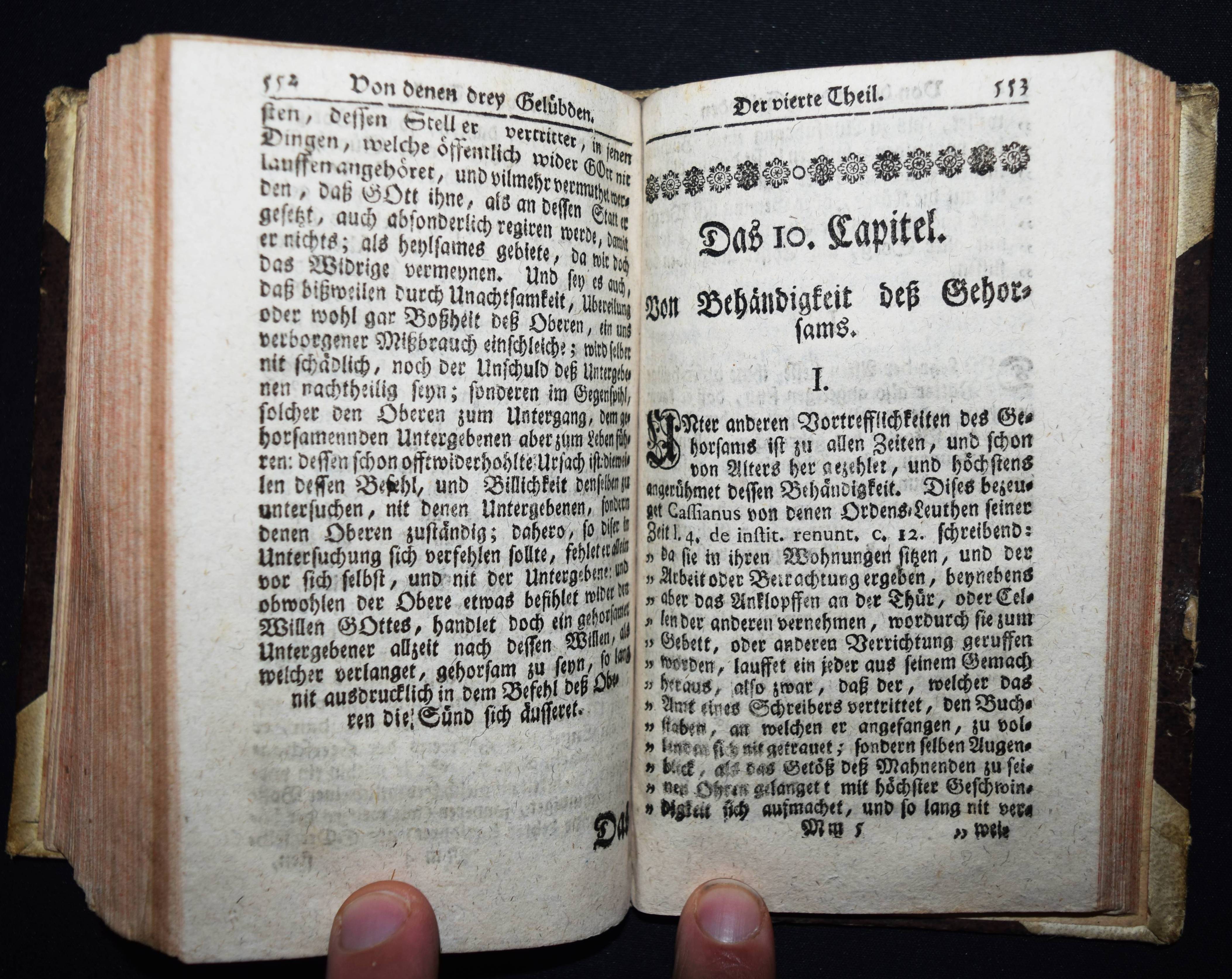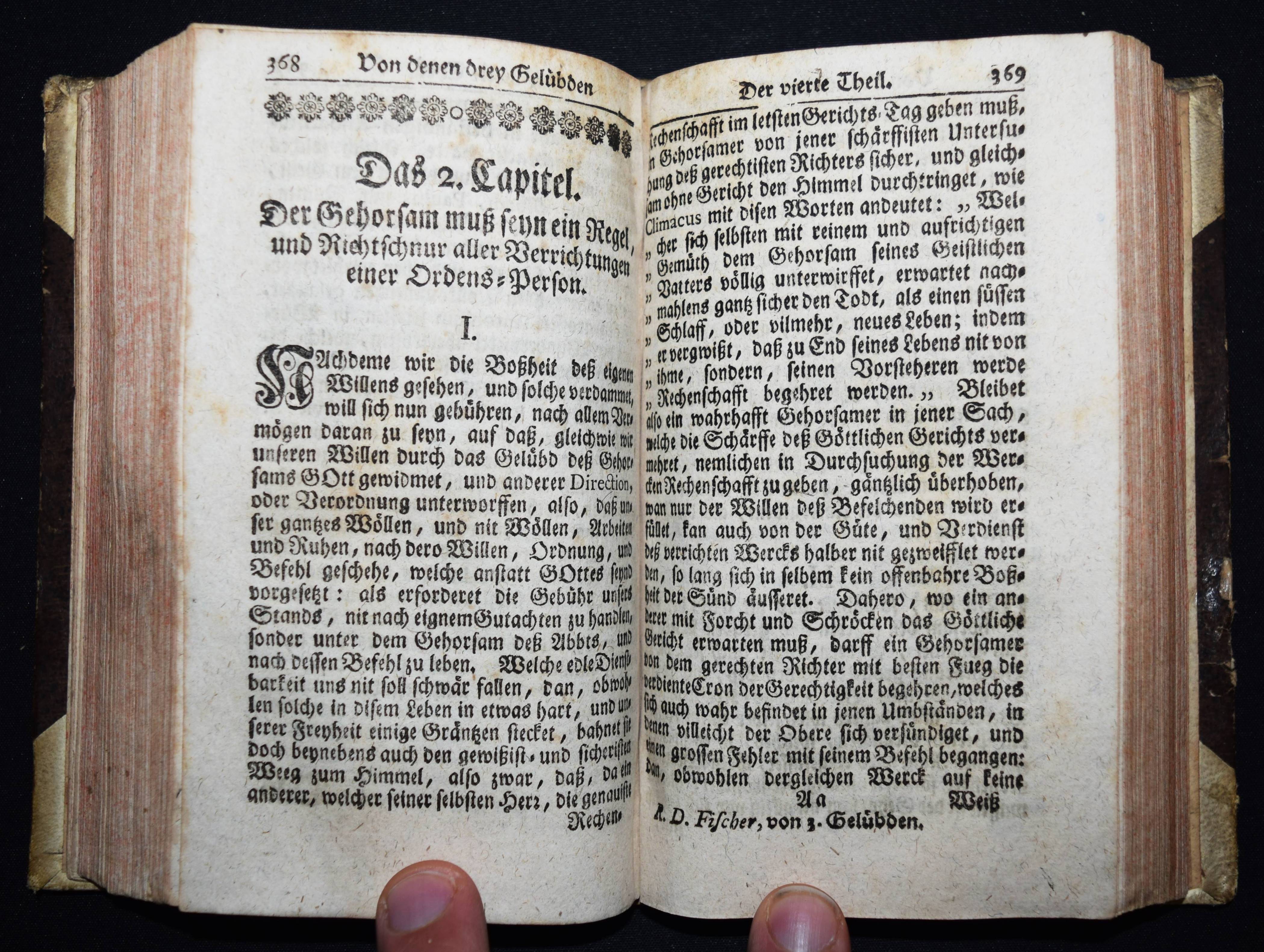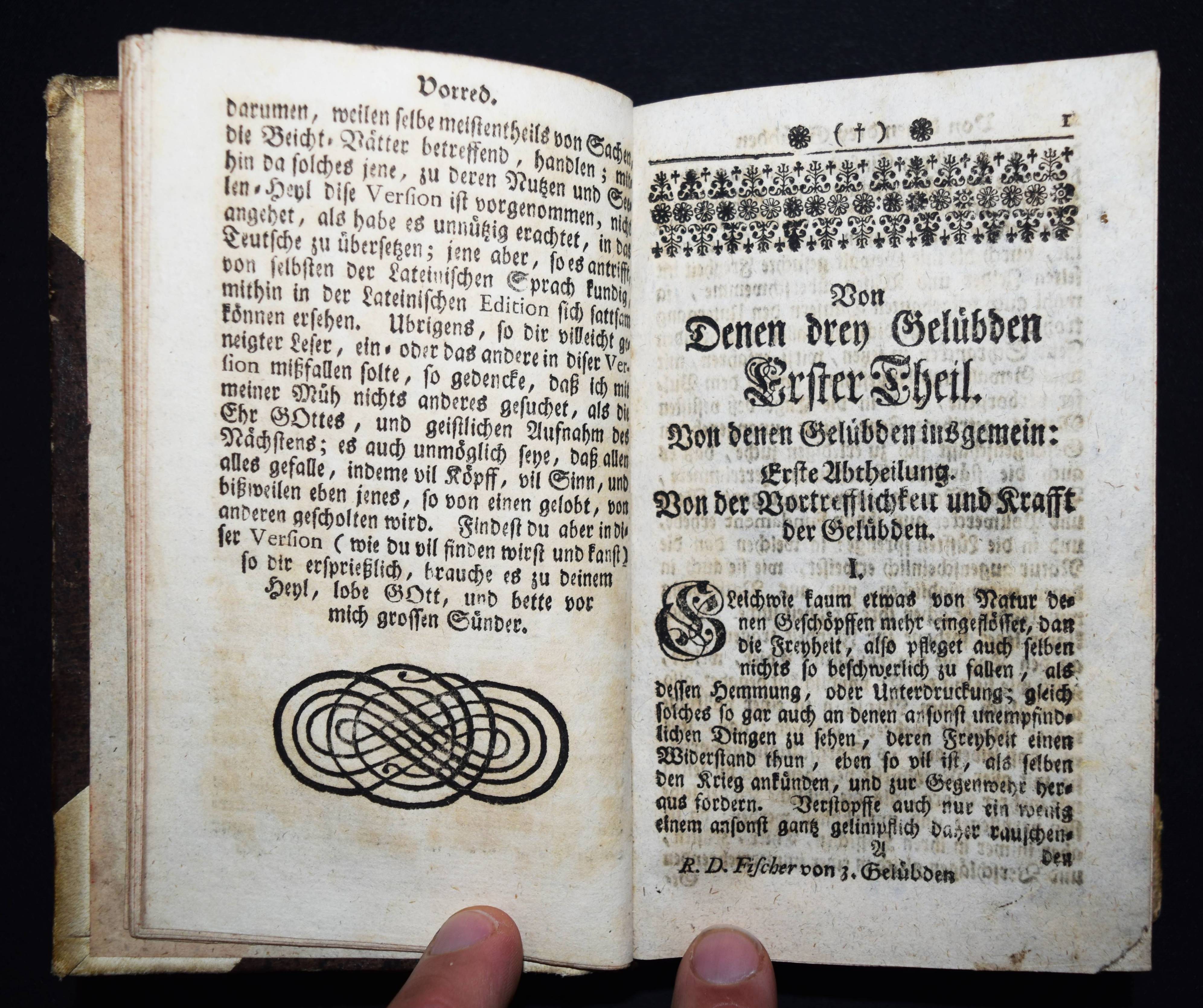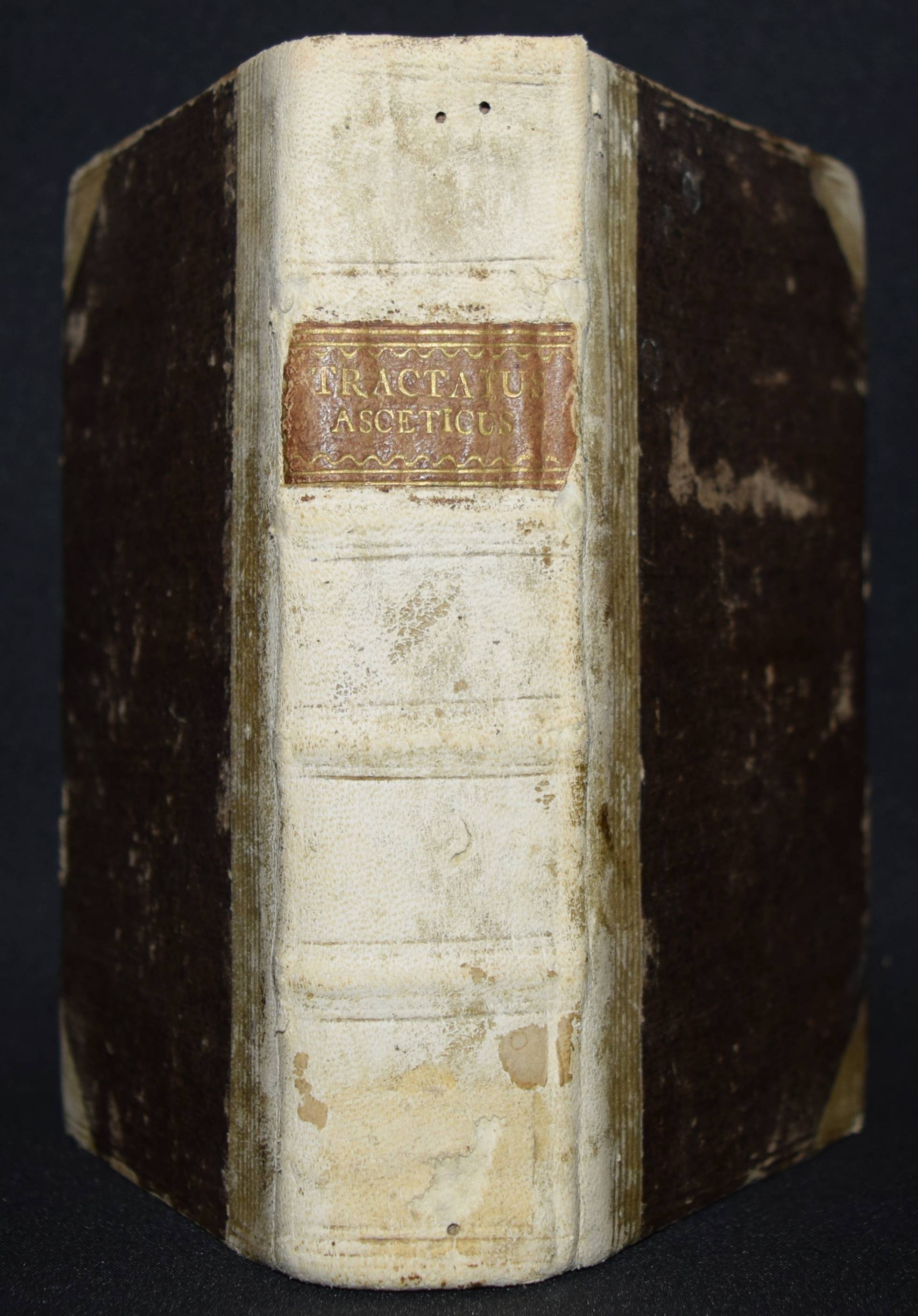 Fischer, Anselm. Tractatus Asceticus, Das ist: Gründliche Abhandlung von denen drey heiligen Ordens-Gelübden. Ehemals in Latein heraus gegeben. Nun in das Teutsche übersetzet, durch Udalricum (Ulrich) Appel. 4 Teile in 1 Band. München und Stadt am Hoff, Johann Gastl 1749. Kl.-8°. [8] Bl., 642 S., [2] Bl. mit Titel in Rot und Schwarz. Halblederband der Zeit mit goldgepr. Rückenschild. VD18 12040355. – Erste deutsche Ausgabe. Die lateinische Orig.-Ausgabe erschien 1706 in Dillingen. – Einband etwas berieben, zeitgenöss. Besitzvermerk auf dem Vorsatz, Stempel auf dem Titelblatt, gutes Exemplar.