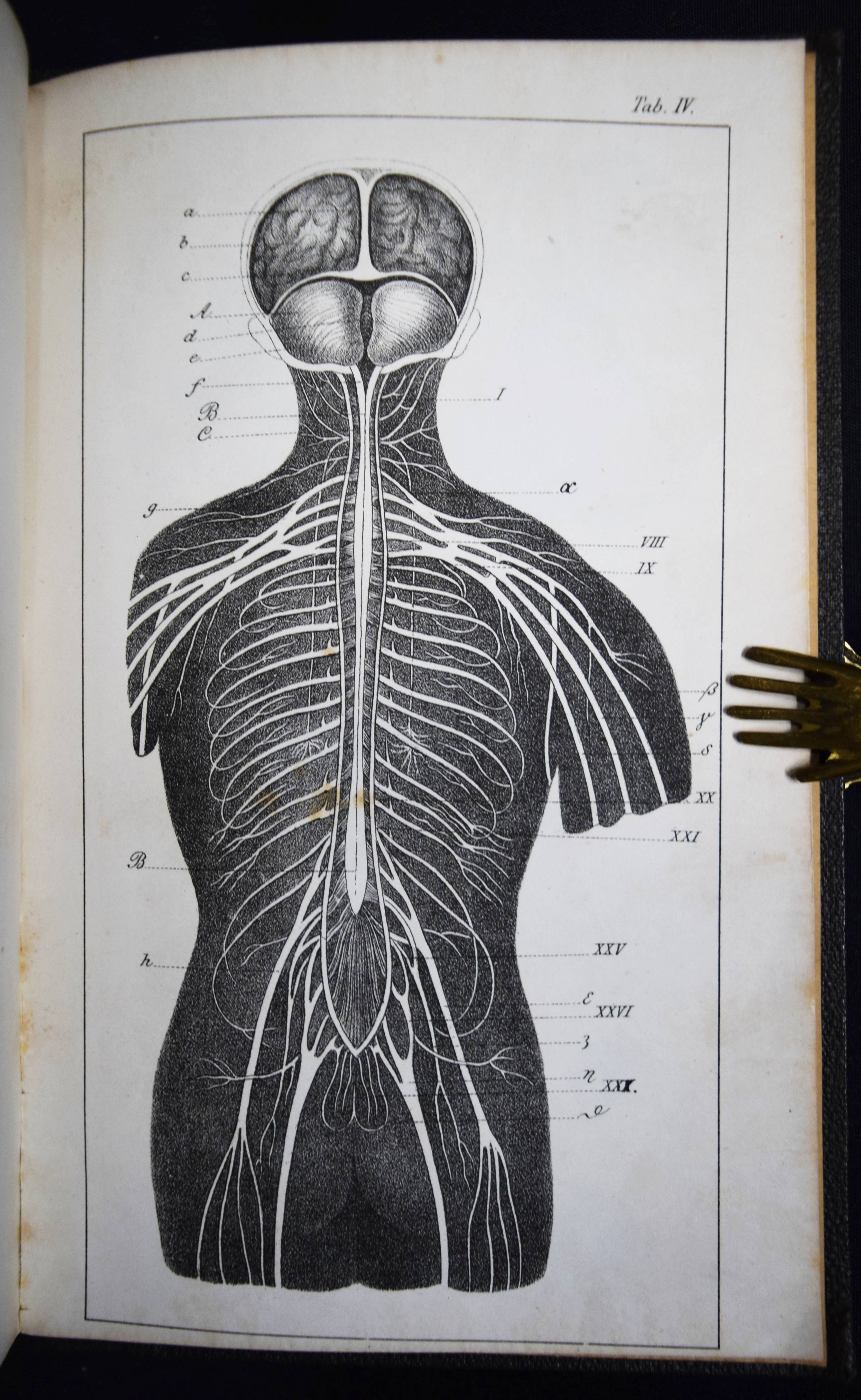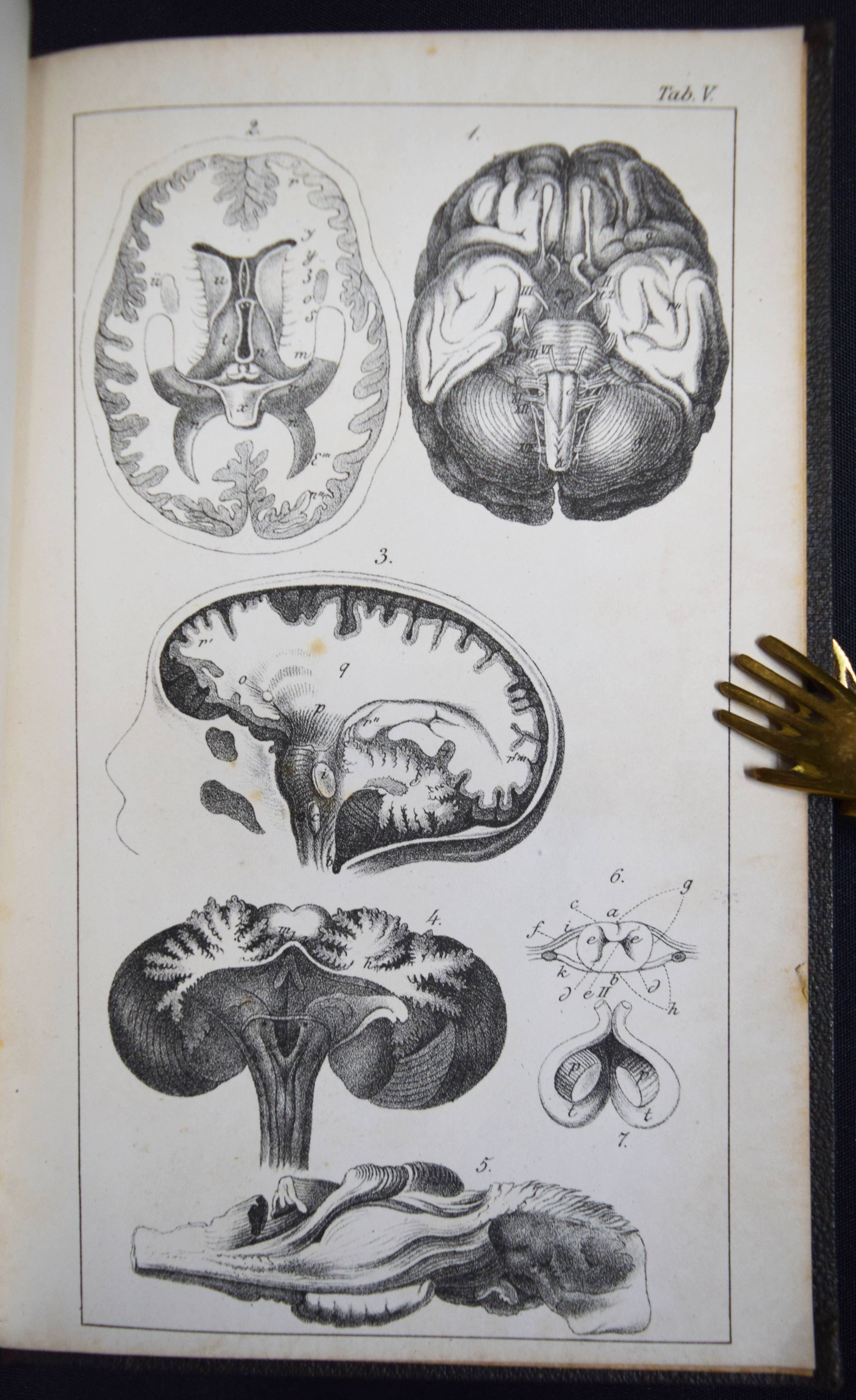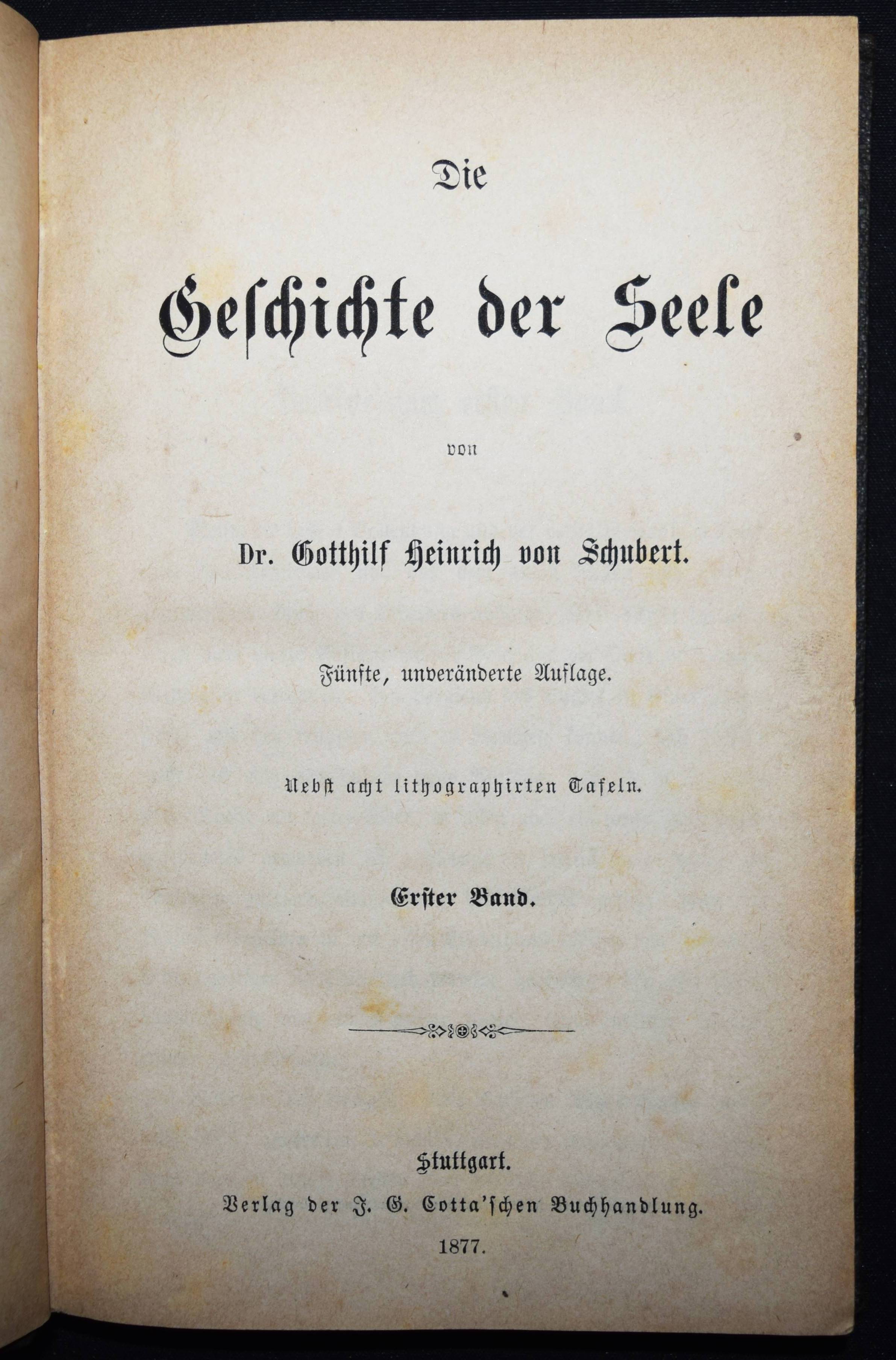 Schubert, Gotthilf Heinrich v. Die Geschichte der Seele. Nebst acht lithographirten Tafeln. 5. unveränderte Auflage. 2 Bände. Stuttgart u. Tübingen, J. G. Cotta 1833. 8°. XIV, 352 S.; XVI, 574 S. mit 8 (1 zweifarb.) lithogr. Tafeln. Orig.-Leinenbände mit goldgepr. Rückentiteln und Linienvergoldung. ADB XXXII, 631 ff. Bonin S. 286 f., Goed. V, 14, 5 u. Ziegenfuß II, 493 und Kiesewetter 425 (Die Krankheiten und Störungen der menschlichen Seele, Stgt. 1845). – Stark vermehrte Ausgabe, die Originalausgabe von 1830 (erschien noch ohne die Tafeln). – Von G. H. v. Schubert (1780-1860) „selbst als das Hauptwerk seiner wissenschaftlichen Thätigkeit bezeichnet“ (ADB). – Name auf dem Vorsatz, durchgehend papierbedingt gebräunt, gutes Exemplar.