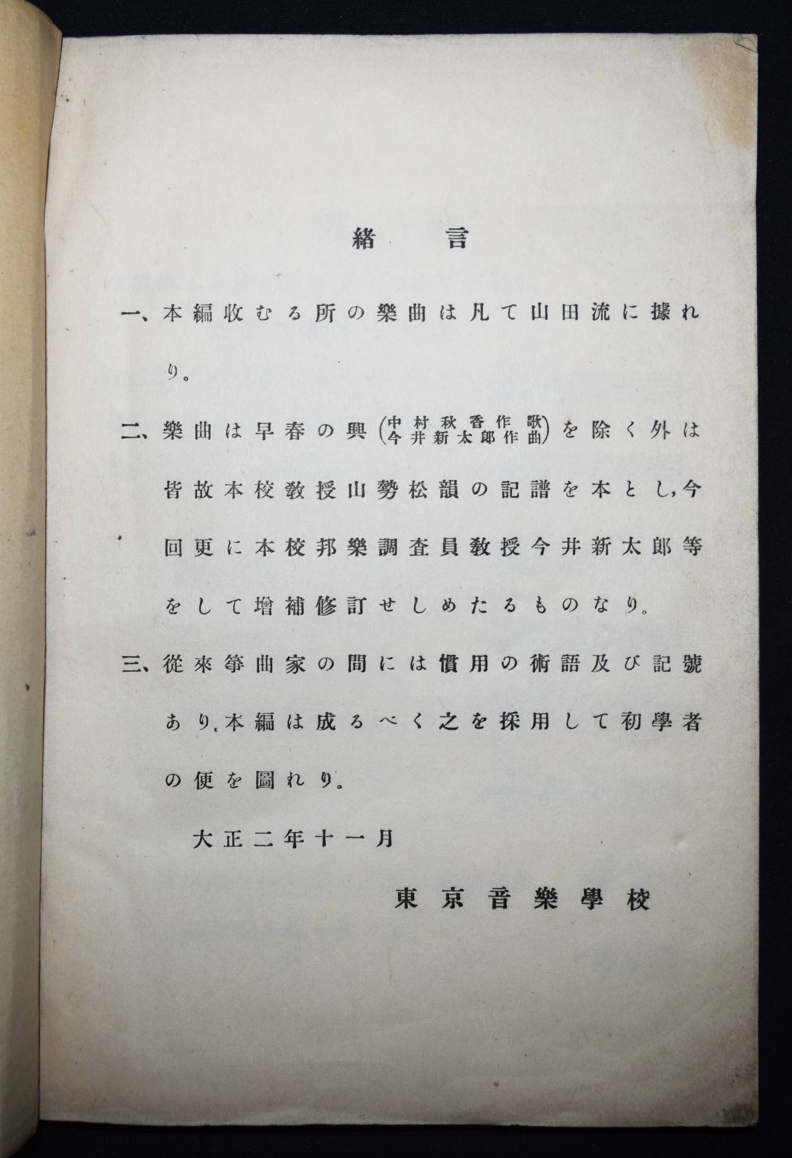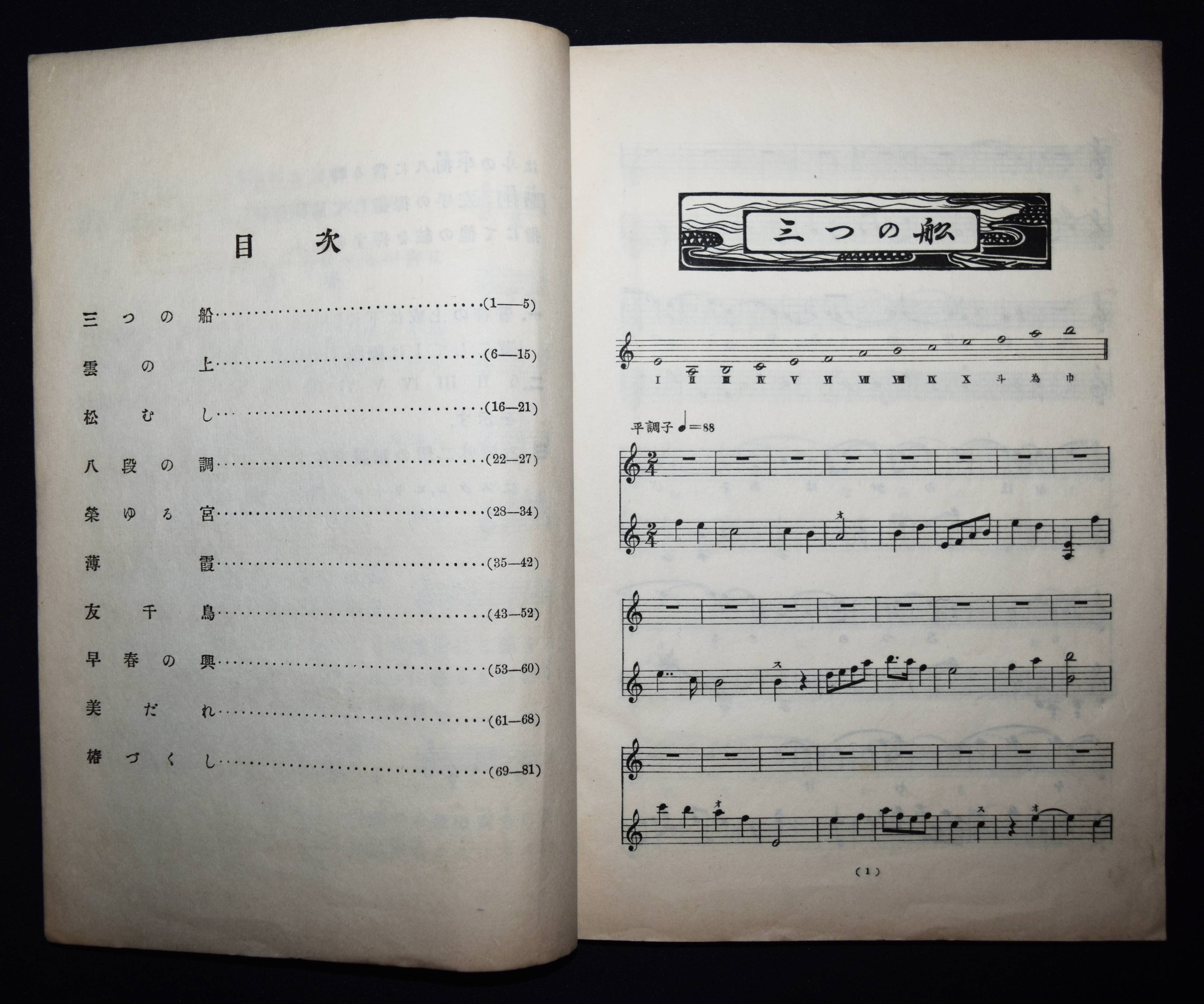 Kinsaku. Zweite Lieder-Sammlung der Musikschule, Tokio (japanisch). Tokio, Dainippon Books Co. Ltd. 11. Februar 1919. 8°. [52] Bl. mit Musiknoten und einigen Kopfvignetten. Typogr. Orig.-Papierumschlag (als Blockbuch gebunden). Seltene japanische Lieder-Sammlung. – Sehr gut erhalten.