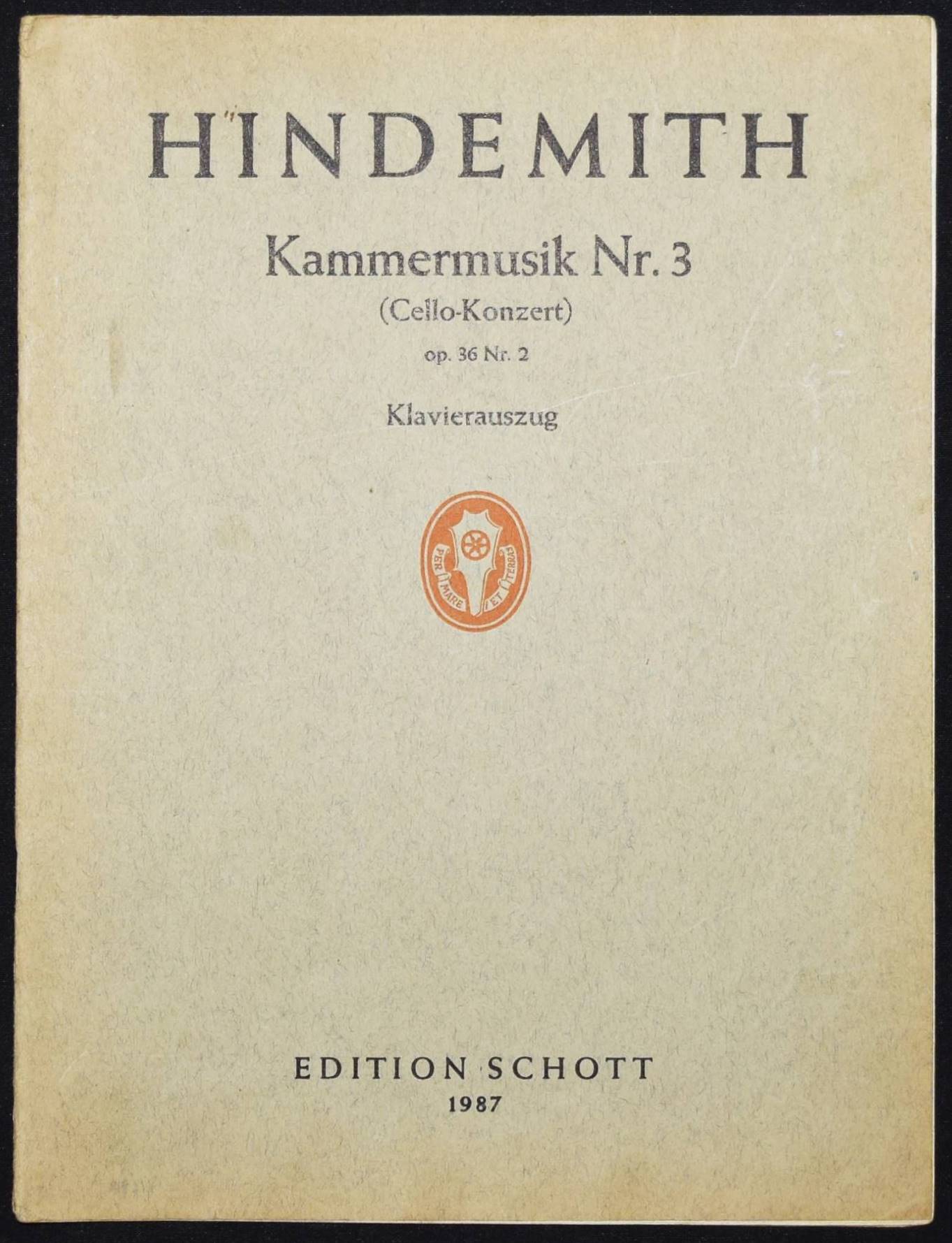Hindemith, Paul. Kammermusik Nr. 3 (Cello-Konzert). Für obligates Violoncello und 10 Solo-Instrumente. Opus 36, Nr. 2. Klavierauszug und Violocello-Solo. 2 Bände. Mainz, B. Schott (um 1930). 4°. 23, (1) S.; 12 S. Orig.-Karton- bzw. Broschurumschlag. (Platten-Nr. 31300 und 31298). Von Paul Hindemith auf dem Titelblatt signiert. – Die erste Ausgabe der Partitur erschien am 4. Mai 1925 und als Klavierauszug mit beigelegter Solo-Stimme: Ende August / Anfang September 1924. Der vorliegende Klavierauszug mit der Verlagsnummer 1987 auf dem Vorderdeckel. Außerdem erschienen noch zwei Studienpartituren (Edition Schott 3441 und Edition Eulenberg No. 1465). Mit der gedruckten Widmung auf dem Titel „Für Elsa und Willi Hof“. – Beide Titelblatter mit Besitzvermerk „Wolfgang Bogner“ (Violonchellist in Bayreuth und Zürich, Bayerisches Musiker-Lexikon Online).