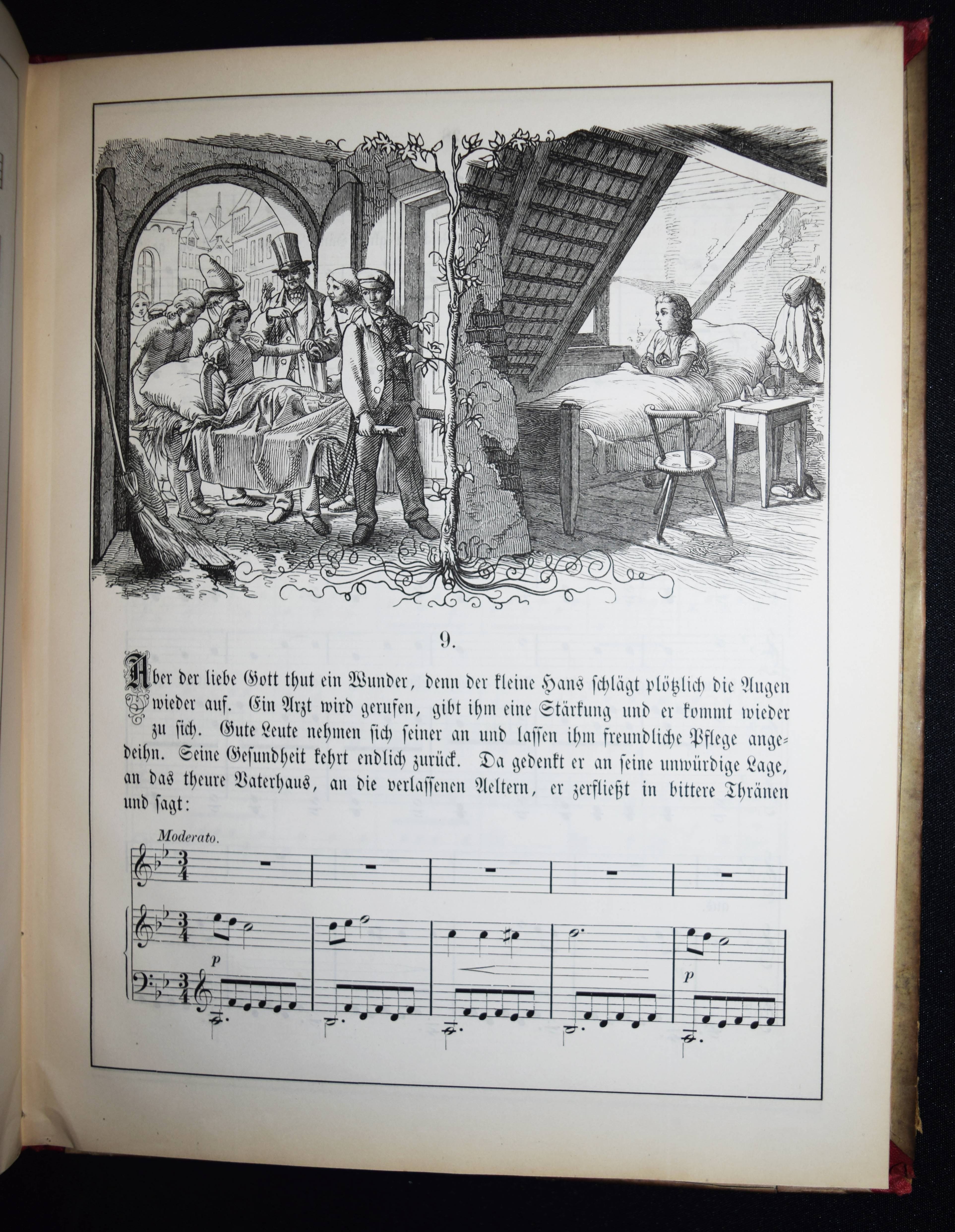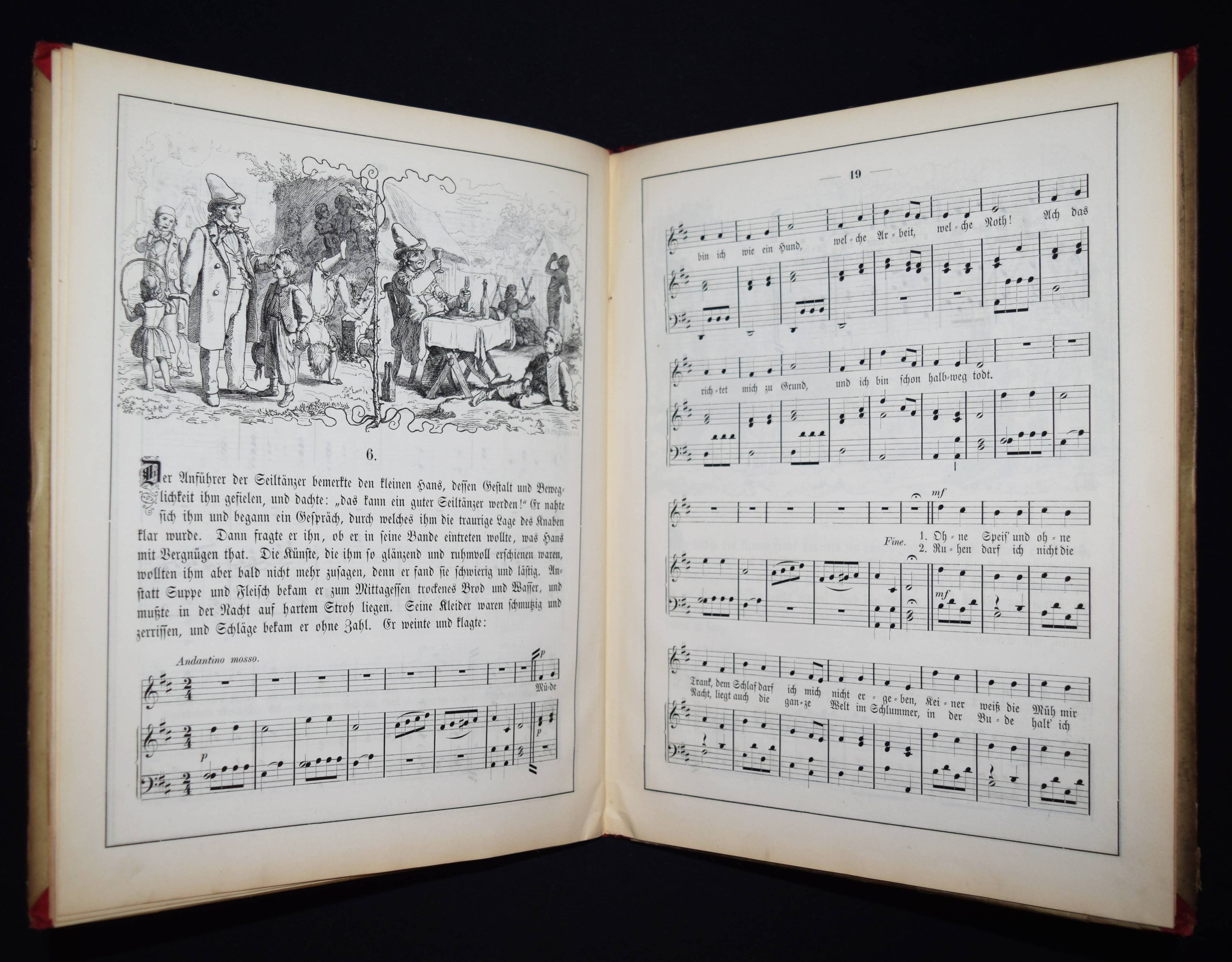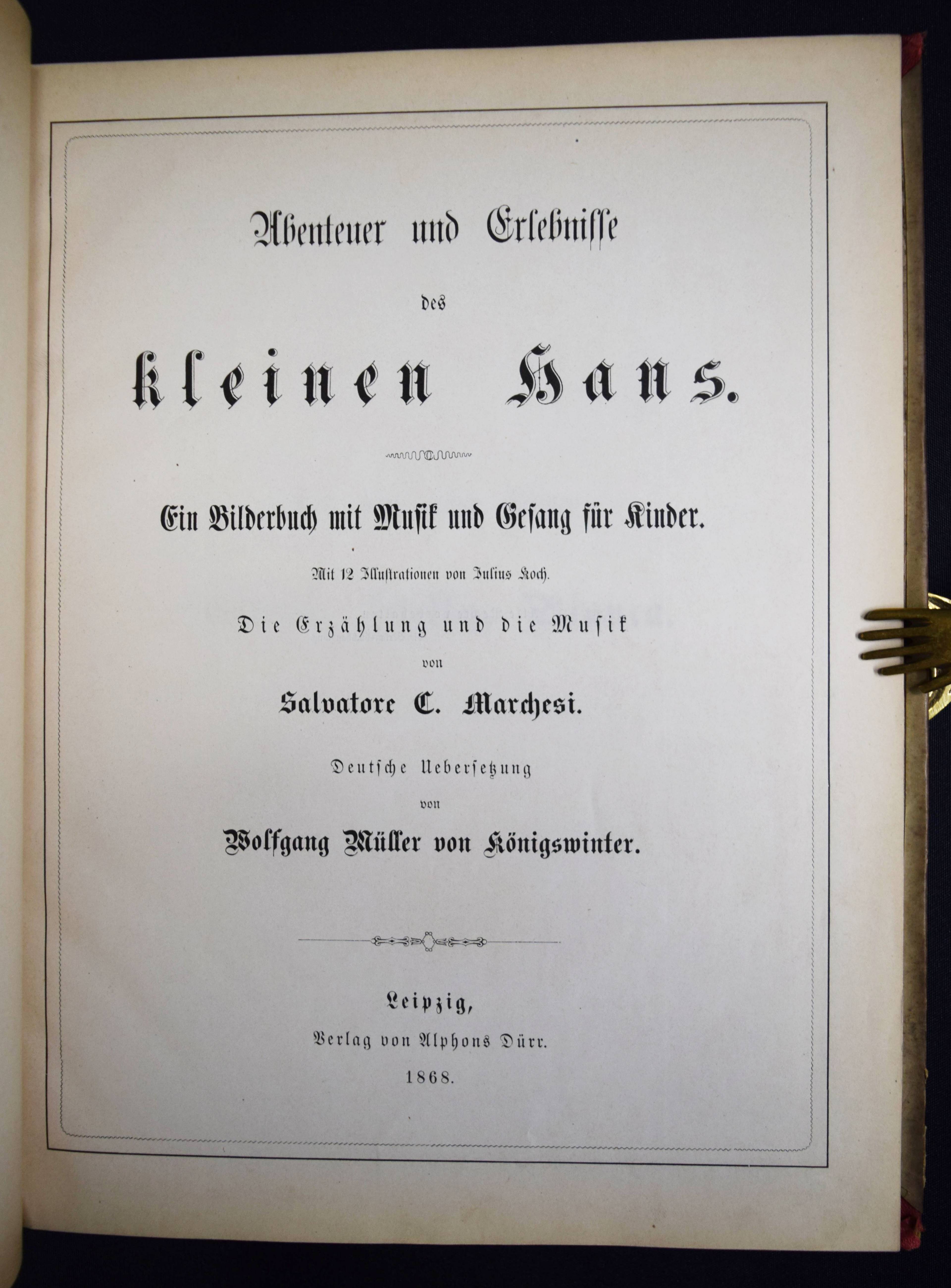 Marchesi, Salvatore (Cavaliere de) C(astrone). Abenteuer und Erlebnisse des kleinen Hans. Ein Bilderbuch mit Musik und Gesang für Kinder. Deutsche Uebersetzung von Wolfgang Müller von Königswinter. Leipzig, Alphons Dürr 1868. 4°. [2] Bl., 40 S. mit 12 halbs. Holzschnitt-Illustrationen von Julius Koch und Musiknoten. Typogr. Orig.-Halbleinenband. Bilderwelt 394. Doderer-Müller 120. Dürr-Verlags-Katalog S. 133. Hobrecker, Braunschweig 4982. Klotz 4401/1. Rümann, Illustr. Bücher 1121. Seebaß II, 1231. Wegehaupt IV, 1368. – Erste und einzige deutsche Ausgabe. – „Rar! …Moralisch-erbauliches, aber originelles Kinderbuch. Jedem Erlebnis des kleinen Hans folgt ein Lied; die Melodien sind sehr sangbar und leicht für Singstimme und Klavier gesetzt. Auch die etwa halbseitengroßen Holzschnitte sind sehr bemerkenswert.“ (A. Seebaß). – Salvatore Cavaliere de Castrone, Marchese della Rajata (1822-1908) studierte Jura, Philosophie und Gesang unter P. Raimondi (in Palermo) und F. Lamperti (in Mailand); er mußte wegen seiner Beteiligung an der Revolution von 1848 Italien verlassen und emigrierte nach New York. Dort debütierte als Opernsänger (Ernani von Verdi). Nach Europa zurückgekehrt, studierte er in Paris bei M. Garcia weiter und ging dann als Sänger und Gesangslehrer nach London. Nach seiner Heirat mit Mathilde Marchesi-Graumann unternahmen sie gemeinsam Konzertreisen durch Deutschland, England, Belgien und Italien. Er komponierte Kanzonen und übersetzte deutsche (u.a. Wagners „Lohengrin“ u. „Tannhäuser“) und französische Libretti ins Italienische und gab wie auch seine Frau eine Gesangsschule heraus. (Vgl. MGG VIII, 1624). – Einband stockfl. und angestaubt, Innengelenke mit Filmoplaststreifen überklebt, Besitzvermerk auf dem Vorsatz, sonst gutes sauberes Exemplar.