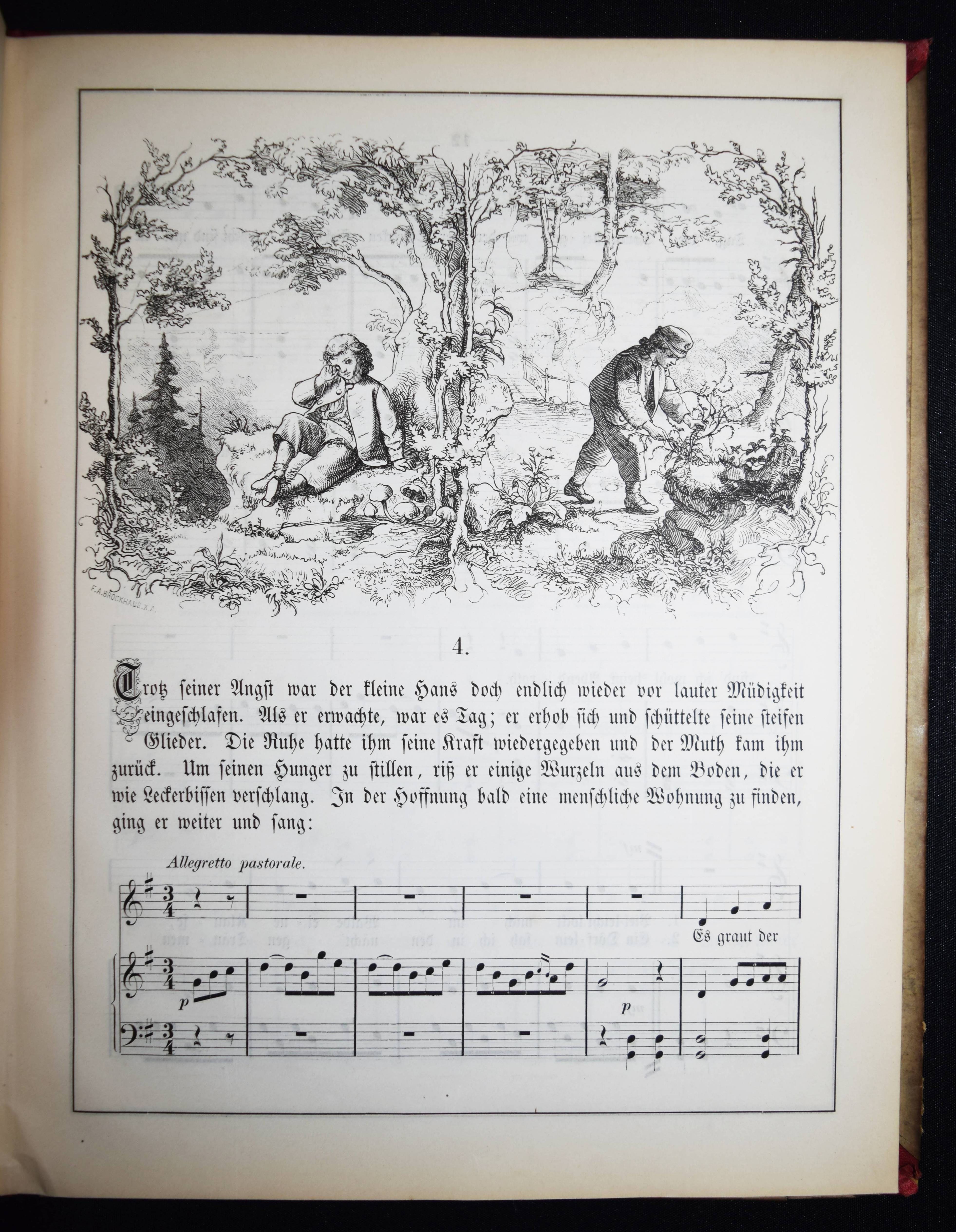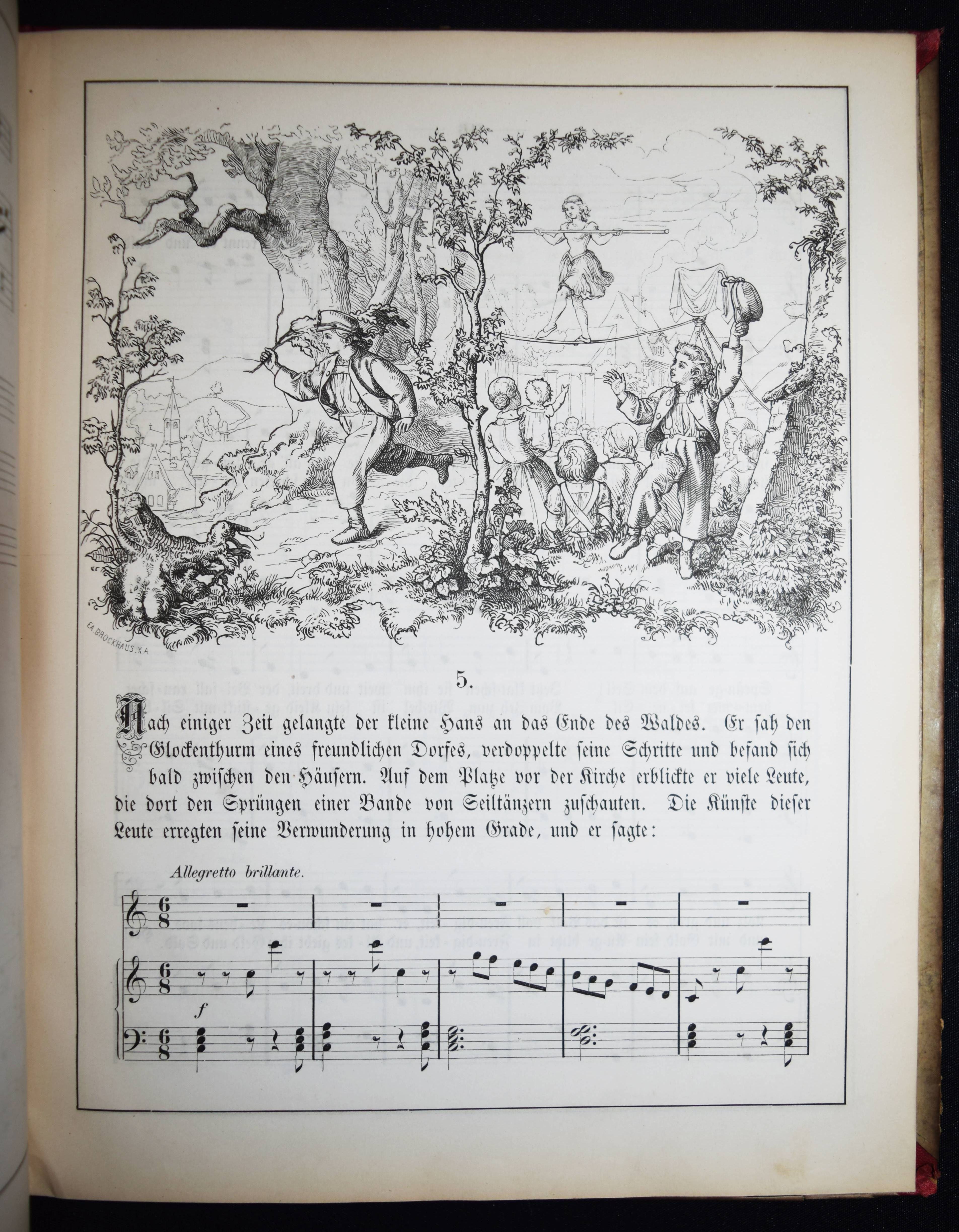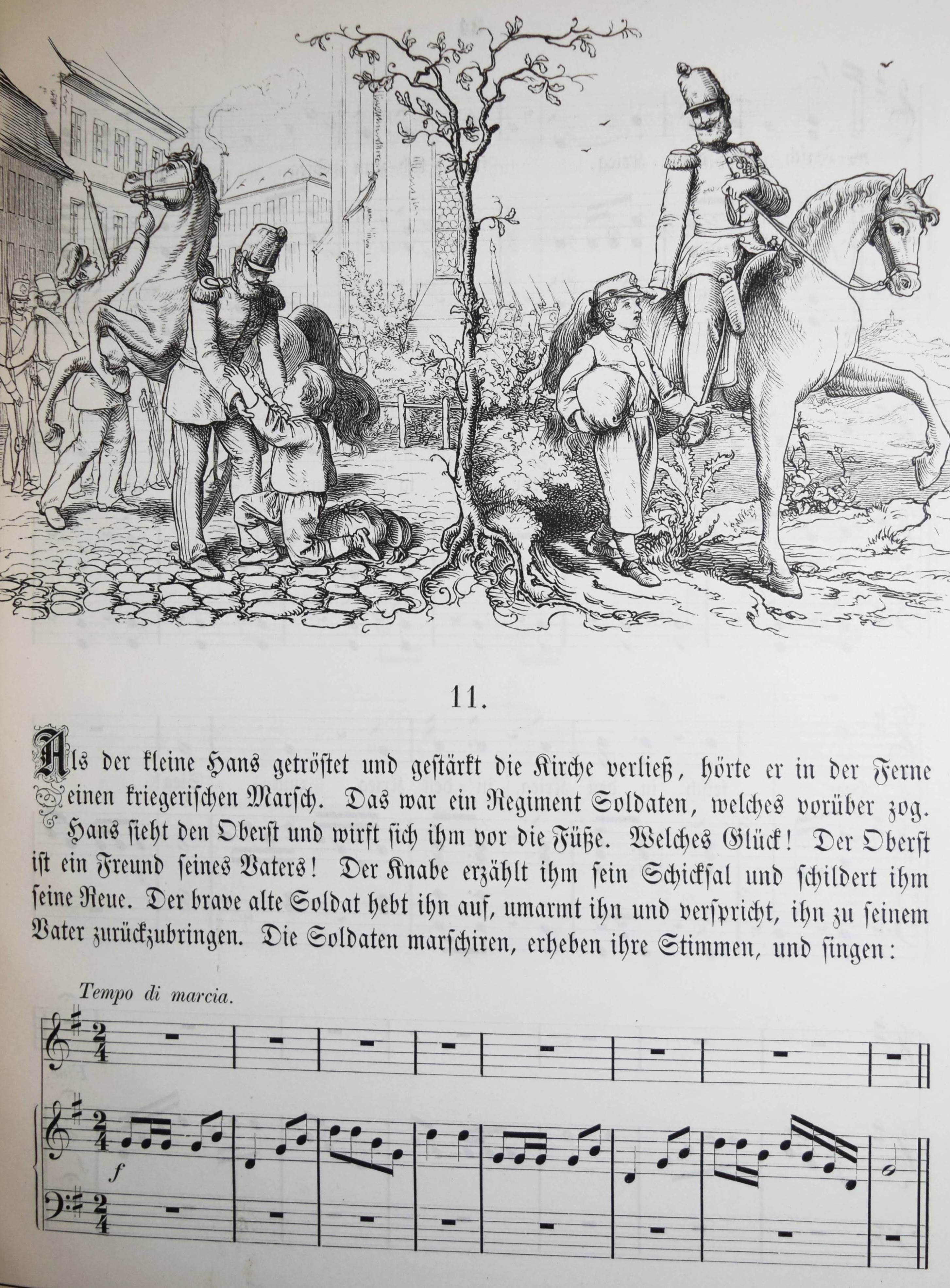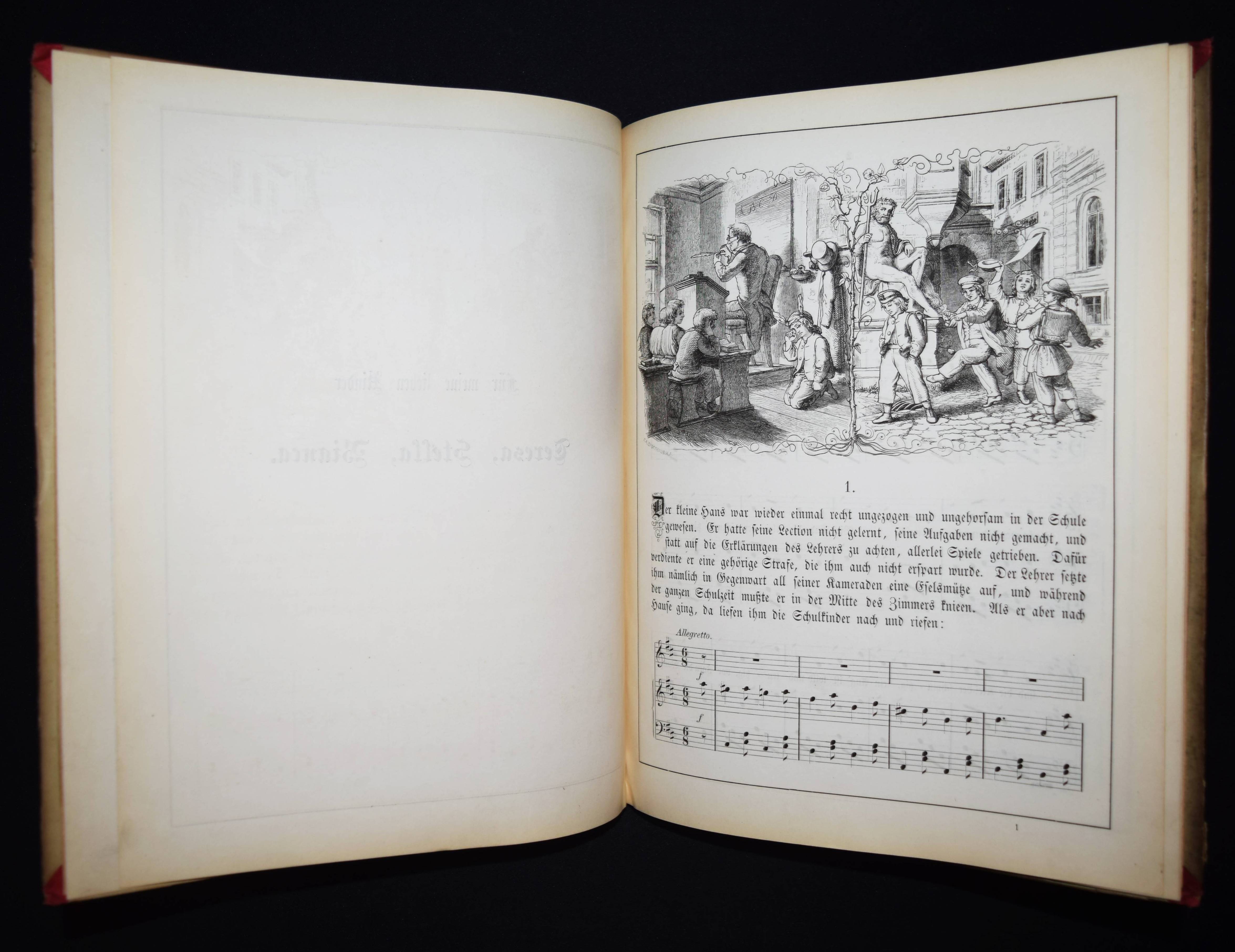 Marchesi, Salvatore (Cavaliere de) C(astrone). Abenteuer und Erlebnisse des kleinen Hans. Ein Bilderbuch mit Musik und Gesang für Kinder. Deutsche Uebersetzung von Wolfgang Müller von Königswinter. Leipzig, Alphons Dürr 1868. 4°. [2] Bl., 40 S. mit 12 halbs. Holzschnitt-Illustrationen von Julius Koch und Musiknoten. Typogr. Orig.-Halbleinenband. Bilderwelt 394. Doderer-Müller 120. Dürr-Verlags-Katalog S. 133. Hobrecker, Braunschweig 4982. Klotz 4401/1. Rümann, Illustr. Bücher 1121. Seebaß II, 1231. Wegehaupt IV, 1368. – Erste und einzige deutsche Ausgabe. – „Rar! …Moralisch-erbauliches, aber originelles Kinderbuch. Jedem Erlebnis des kleinen Hans folgt ein Lied; die Melodien sind sehr sangbar und leicht für Singstimme und Klavier gesetzt. Auch die etwa halbseitengroßen Holzschnitte sind sehr bemerkenswert.“ (A. Seebaß). – Salvatore Cavaliere de Castrone, Marchese della Rajata (1822-1908) studierte Jura, Philosophie und Gesang unter P. Raimondi (in Palermo) und F. Lamperti (in Mailand); er mußte wegen seiner Beteiligung an der Revolution von 1848 Italien verlassen und emigrierte nach New York. Dort debütierte als Opernsänger (Ernani von Verdi). Nach Europa zurückgekehrt, studierte er in Paris bei M. Garcia weiter und ging dann als Sänger und Gesangslehrer nach London. Nach seiner Heirat mit Mathilde Marchesi-Graumann unternahmen sie gemeinsam Konzertreisen durch Deutschland, England, Belgien und Italien. Er komponierte Kanzonen und übersetzte deutsche (u.a. Wagners „Lohengrin“ u. „Tannhäuser“) und französische Libretti ins Italienische und gab wie auch seine Frau eine Gesangsschule heraus. (Vgl. MGG VIII, 1624). – Einband stockfl. und angestaubt, Innengelenke mit Filmoplaststreifen überklebt, Besitzvermerk auf dem Vorsatz, sonst gutes sauberes Exemplar.