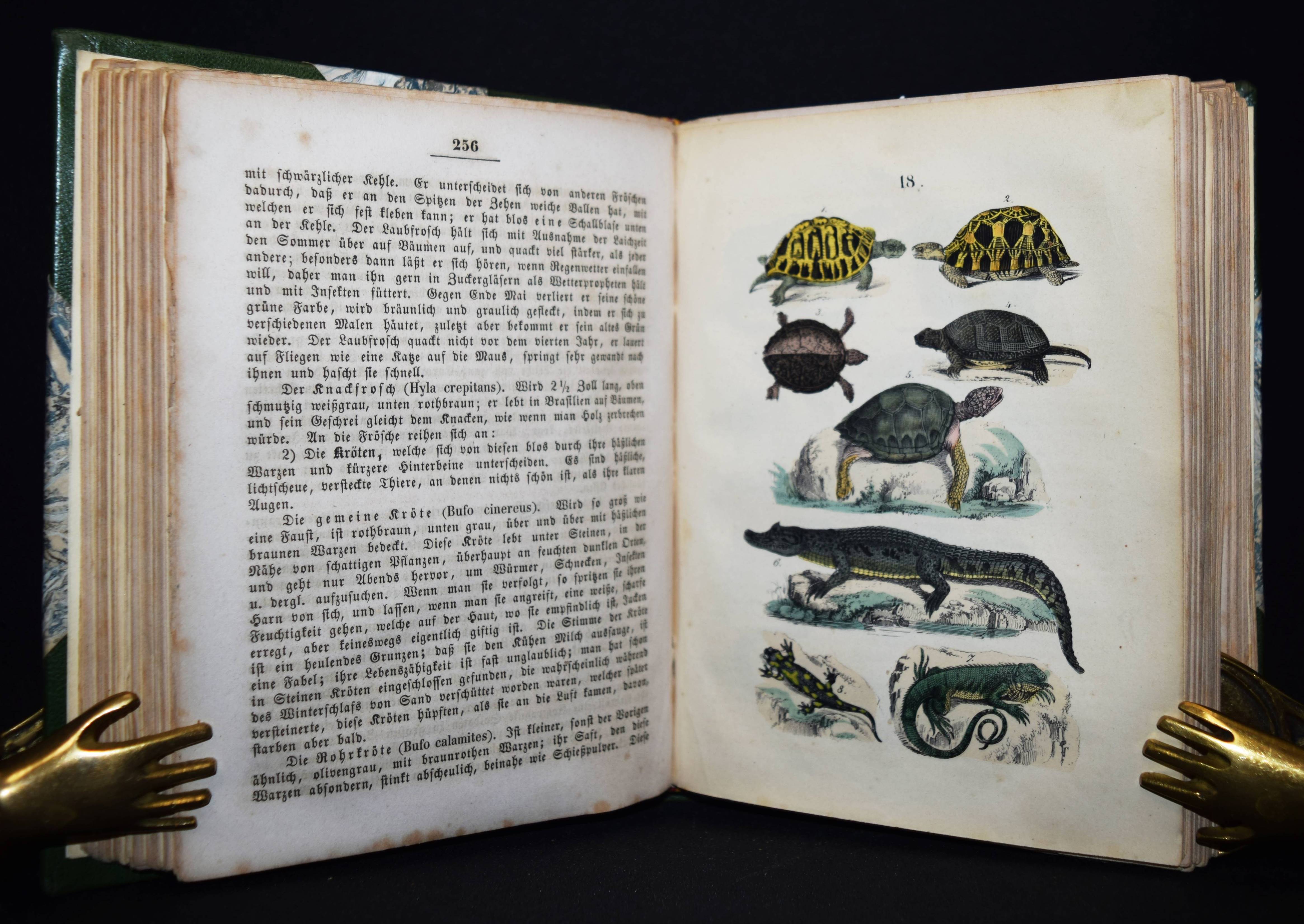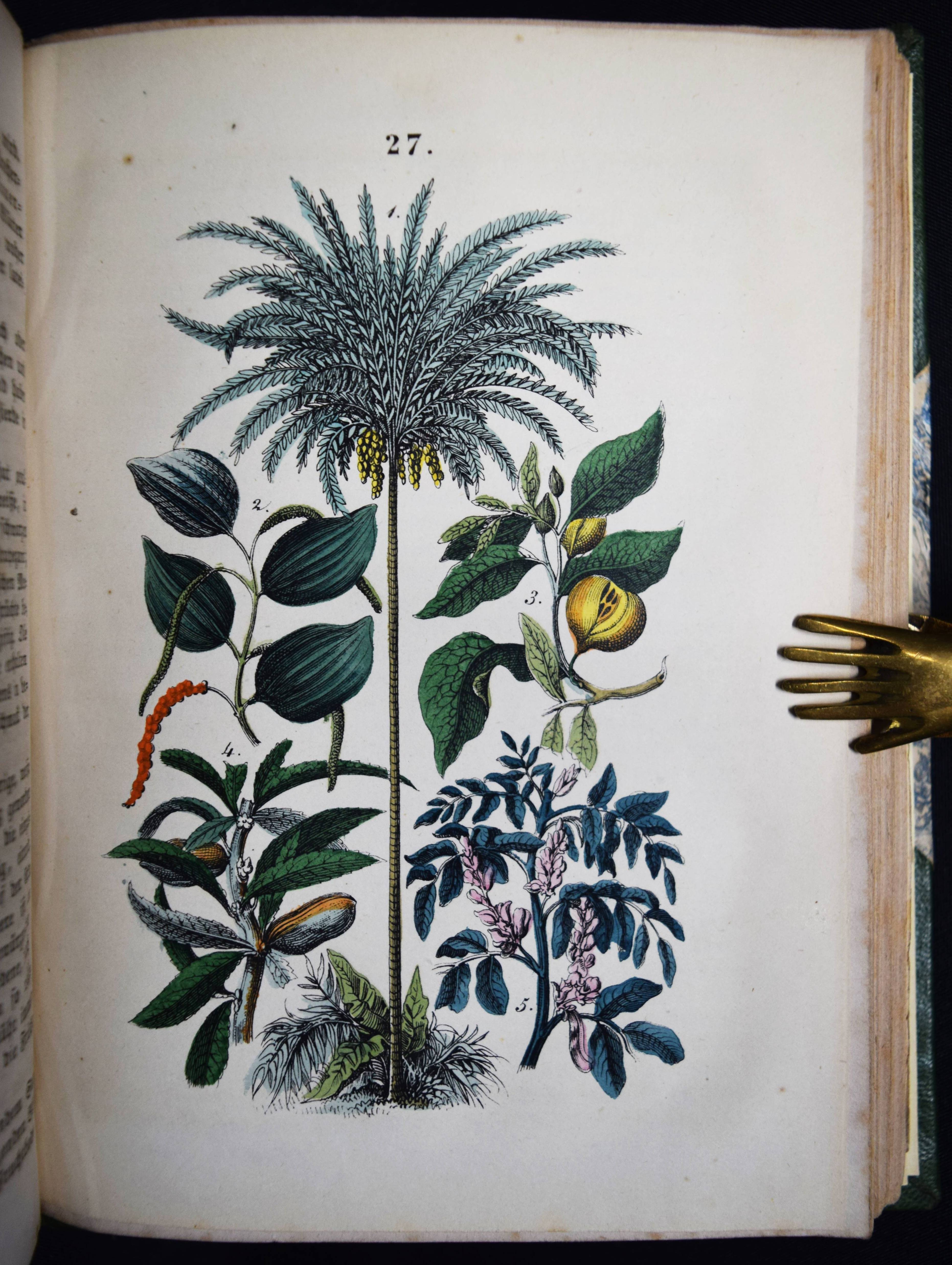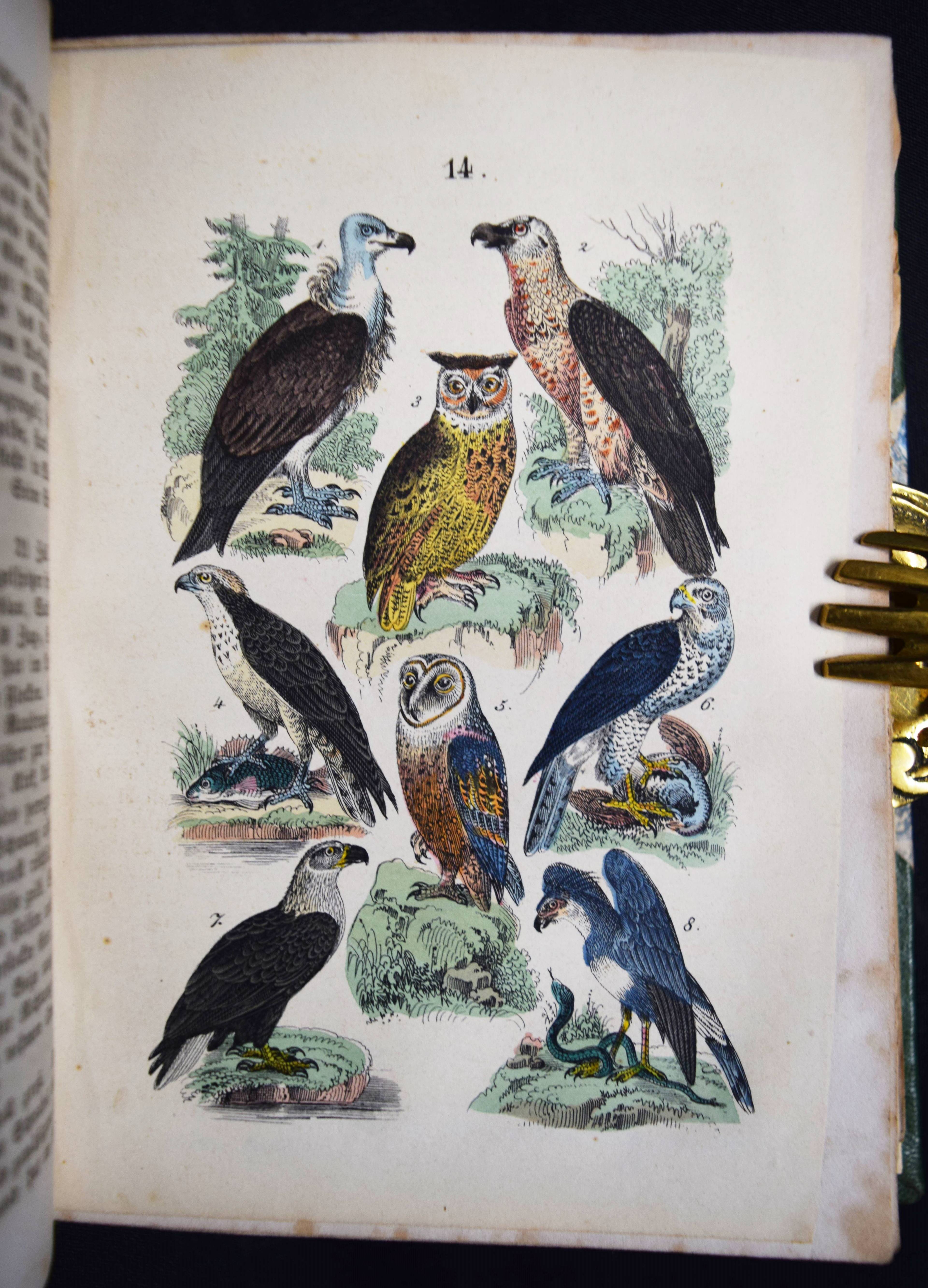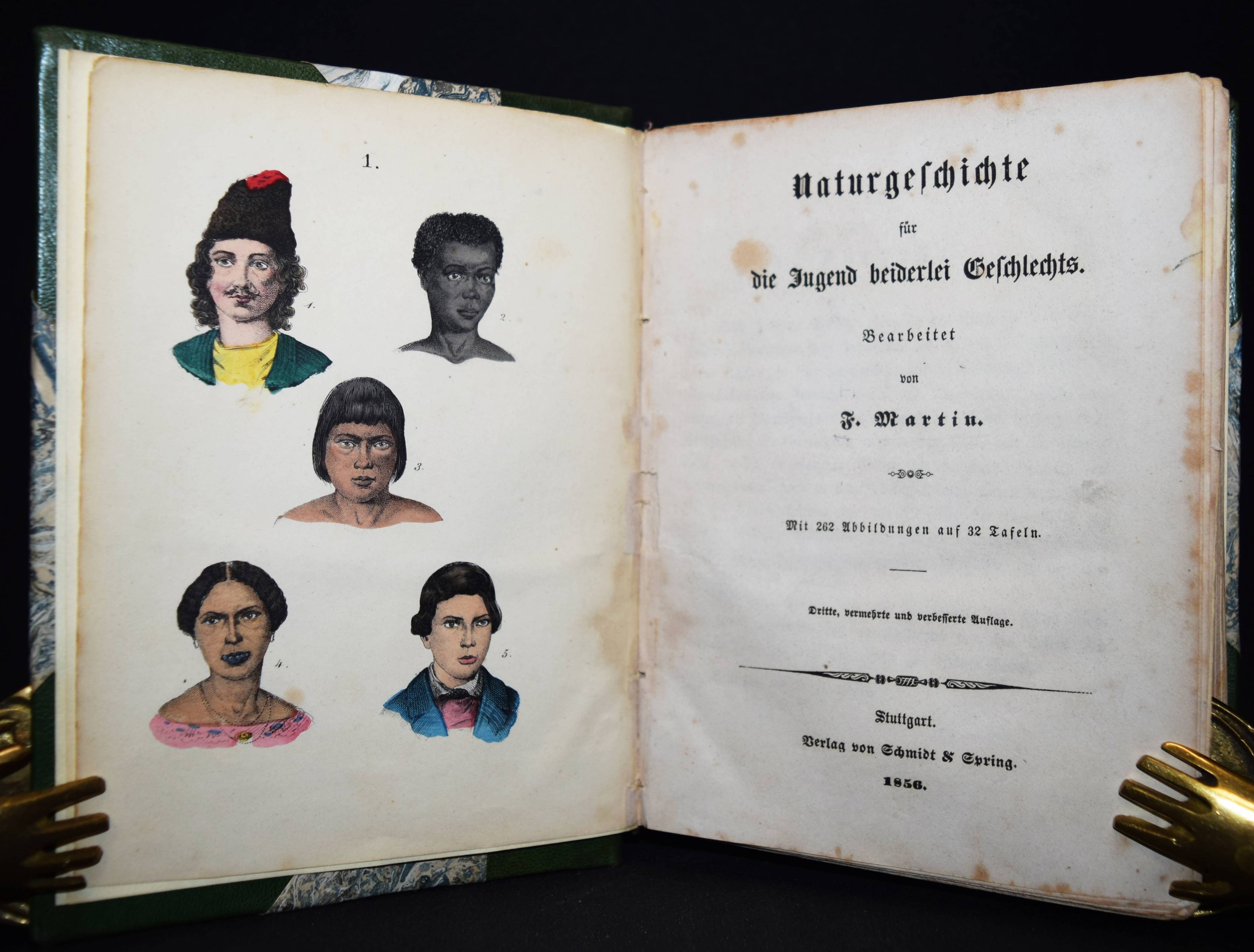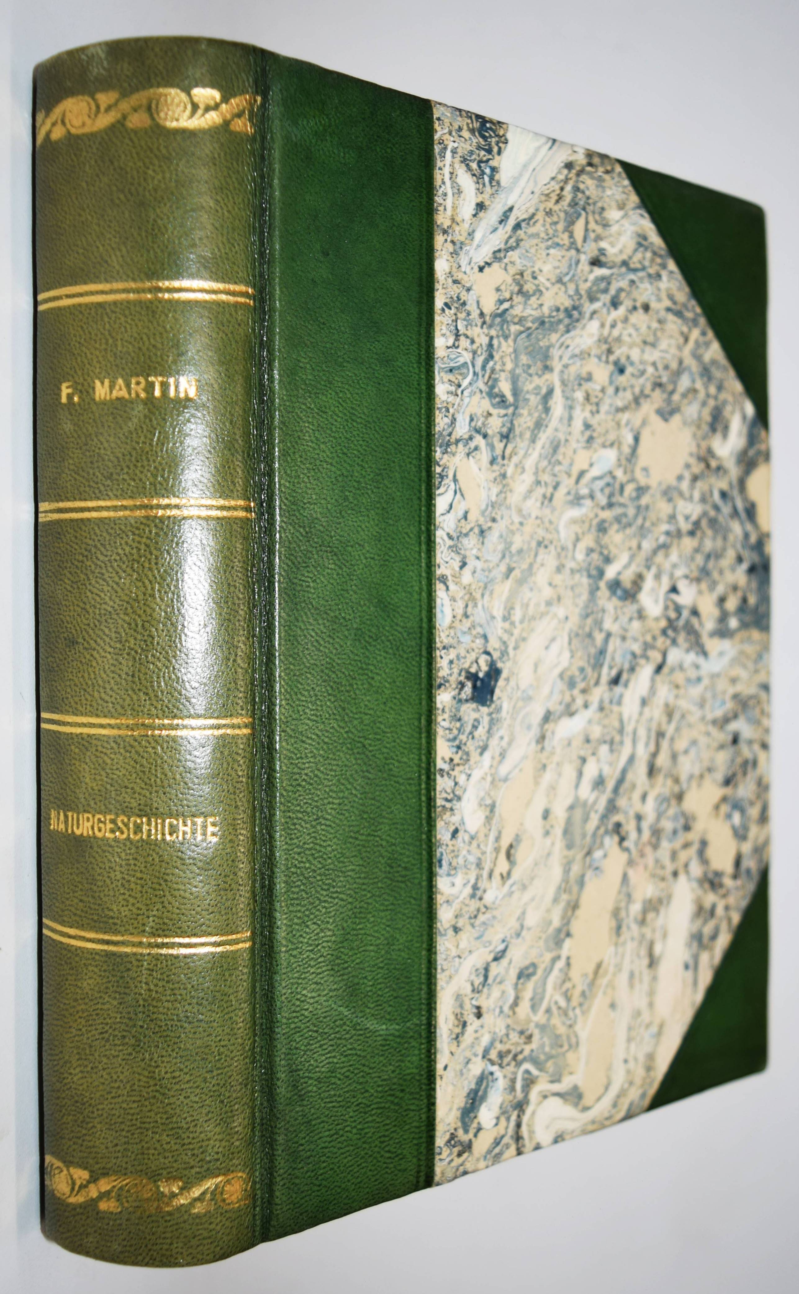 Martin, F(elix). Naturgeschichte für die Jugend beiderlei Geschlechts. 3., verm. und verb. Aufl. Stuttgart, Schmidt & Spring 1856. 8°. [2] Bl., 564 S. mit 262 meist handkol. Abbildungen auf 32 lithogr. Tafeln. Moderner Halblederband mit goldgepr. Rückentitel und Linienvergoldung. LKJ II, 541. Nissen, ZBI 2708. Seebaß II, 1245 (4. Auflage). Wegehaupt I, 1374 (erste Ausgabe von 1844). – Gegenüber der ersten Ausgabe um 8 Tafeln und ca. 100 S. erweitert. – Eine der erfolgreichsten Naturgeschichten für Kinder im 19. Jahrhundert. Die schönen sauber kolorierten Tafeln zeigen „Menschenracen“ (Frontispiz), Tiere und Pflanzen. – Einband und Vorsätze fachgerecht erneuert, Textteil teils stärker braunfleckig, die Tafeln sauber, gutes Exemplar.