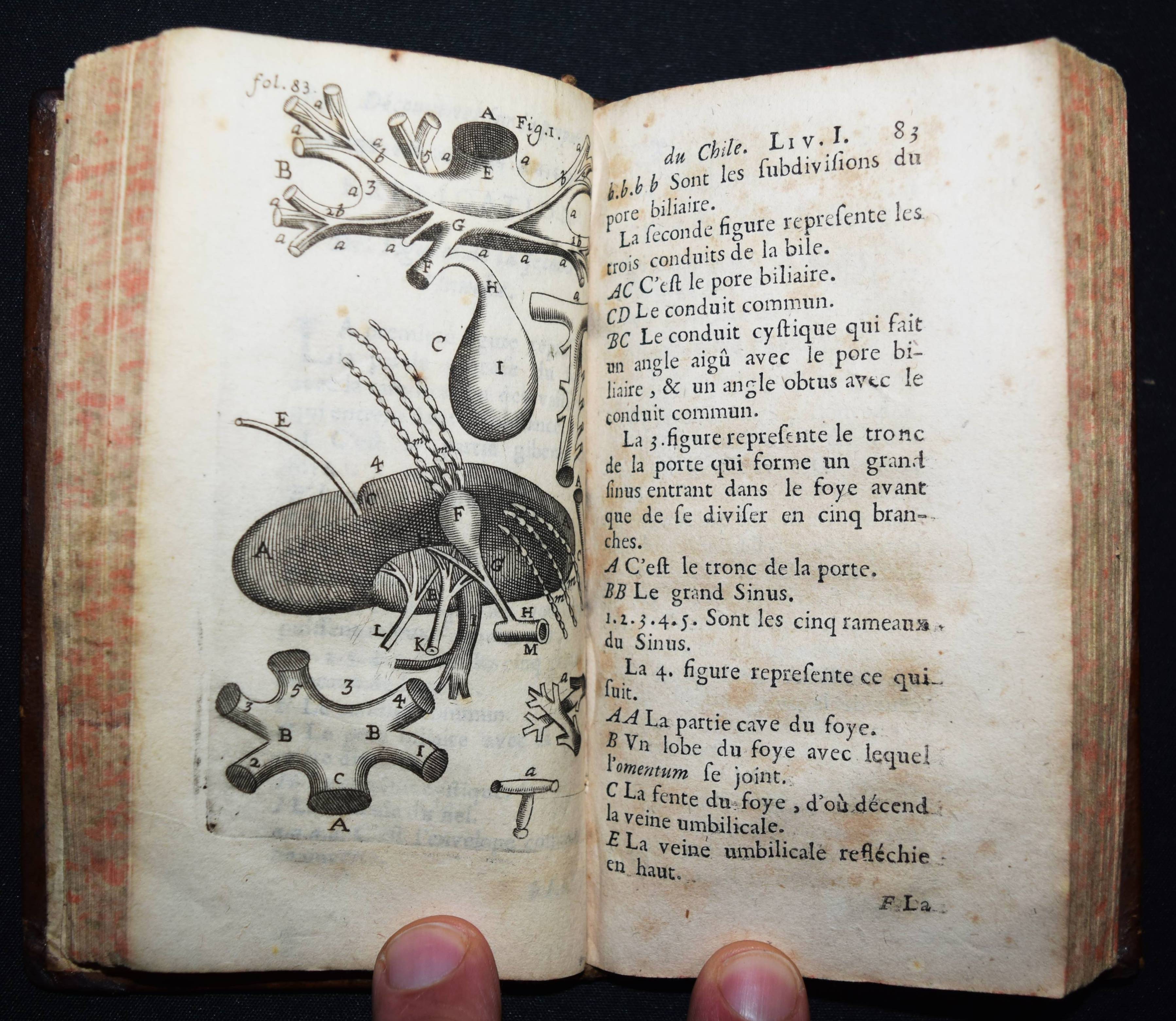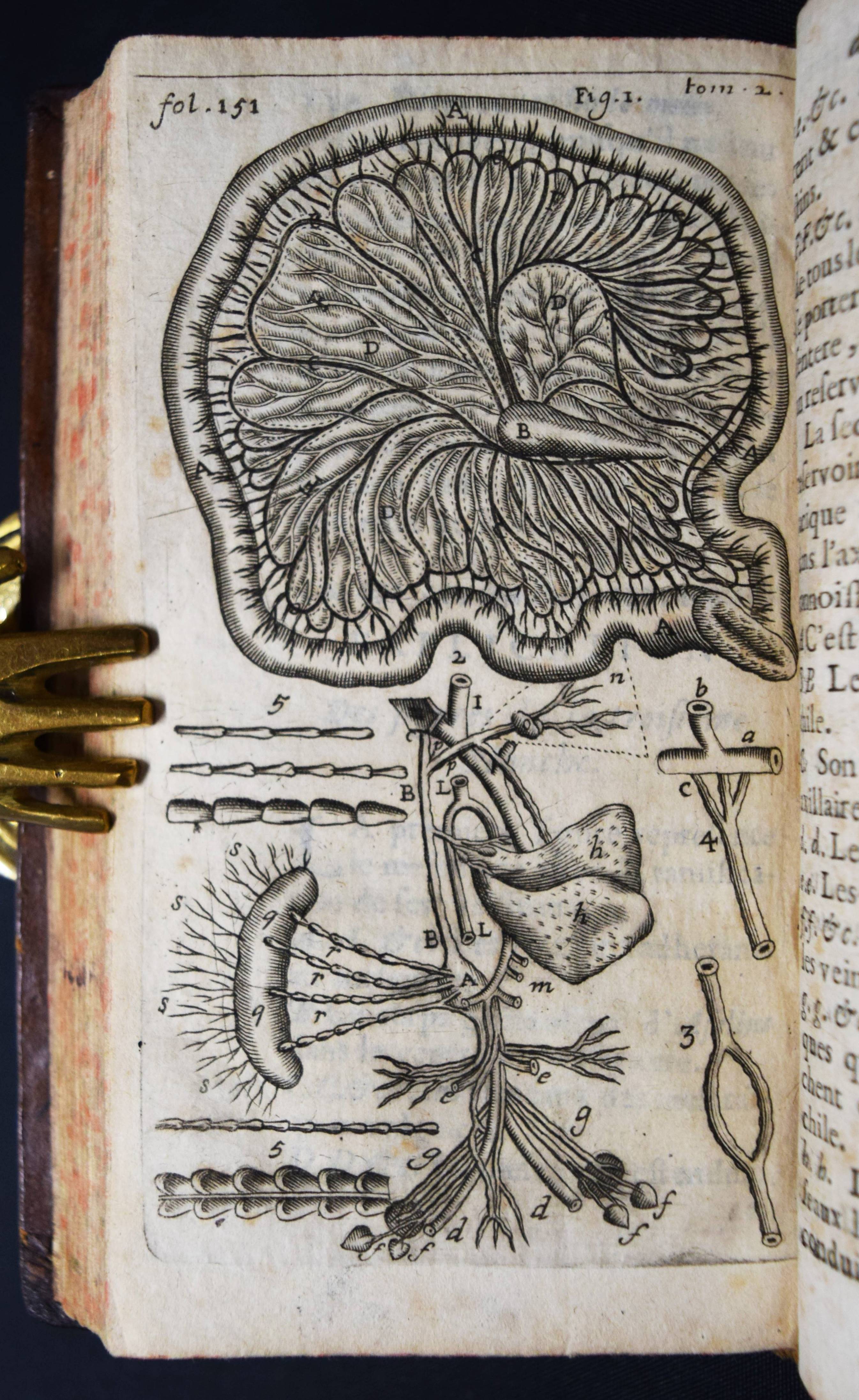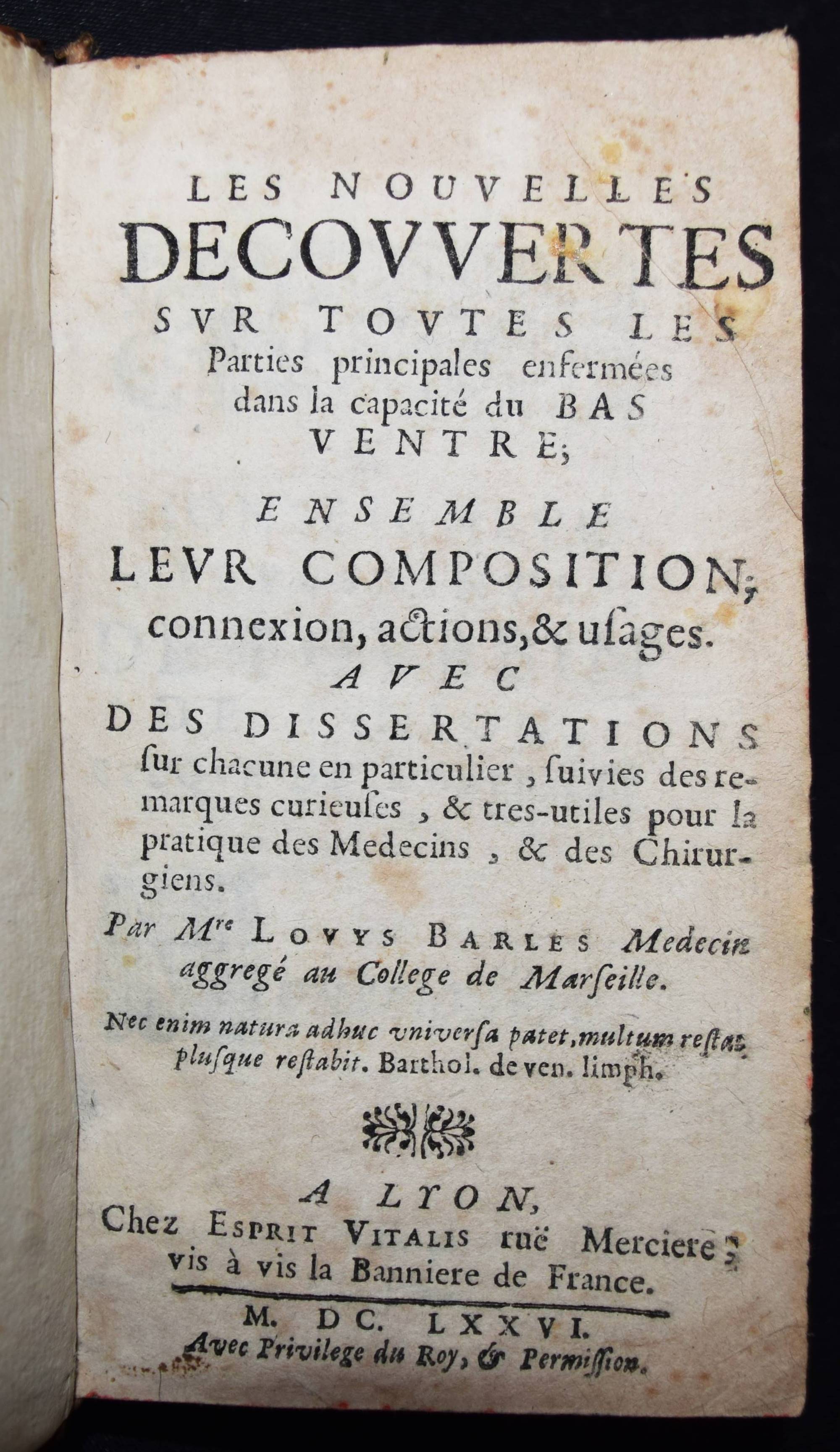 Barles, Louis. Les nouvelles decouvertes sur toutes les parties principales enfermées dans la capacité du bas ventre. Ensemble leur composition, connexion, actions, et usages. Avec des dissertationes sur chaqune en particulier, suivies des remarques curieuses tres-uliles pour la pratique des medicins, & chirurgiens. Lyon, Esprit Vitalis 1676. 12° (15 x 8,5 cm.). [18] Bl., 275 S. mit 4 Kupfertafeln. Kalbslederband der Zeit mit goldgepr. Rückenschild und floraler Rückenvergoldung. Hirsch/Hübotter I, 295. Krivatsy 707. Wellcome II, 102. – Zweite Ausgabe der zuerst 1773 erschienenen Abhandlung über die Unterleibsorgane. Erschien als Band II der Werke des franz. Anatomen L. Barles, tätig am College de Marseille. – Eventuell fehlt ein Portrait-Frontispiz, stellenweise etwas braunfleckig, gutes Exemplar.
