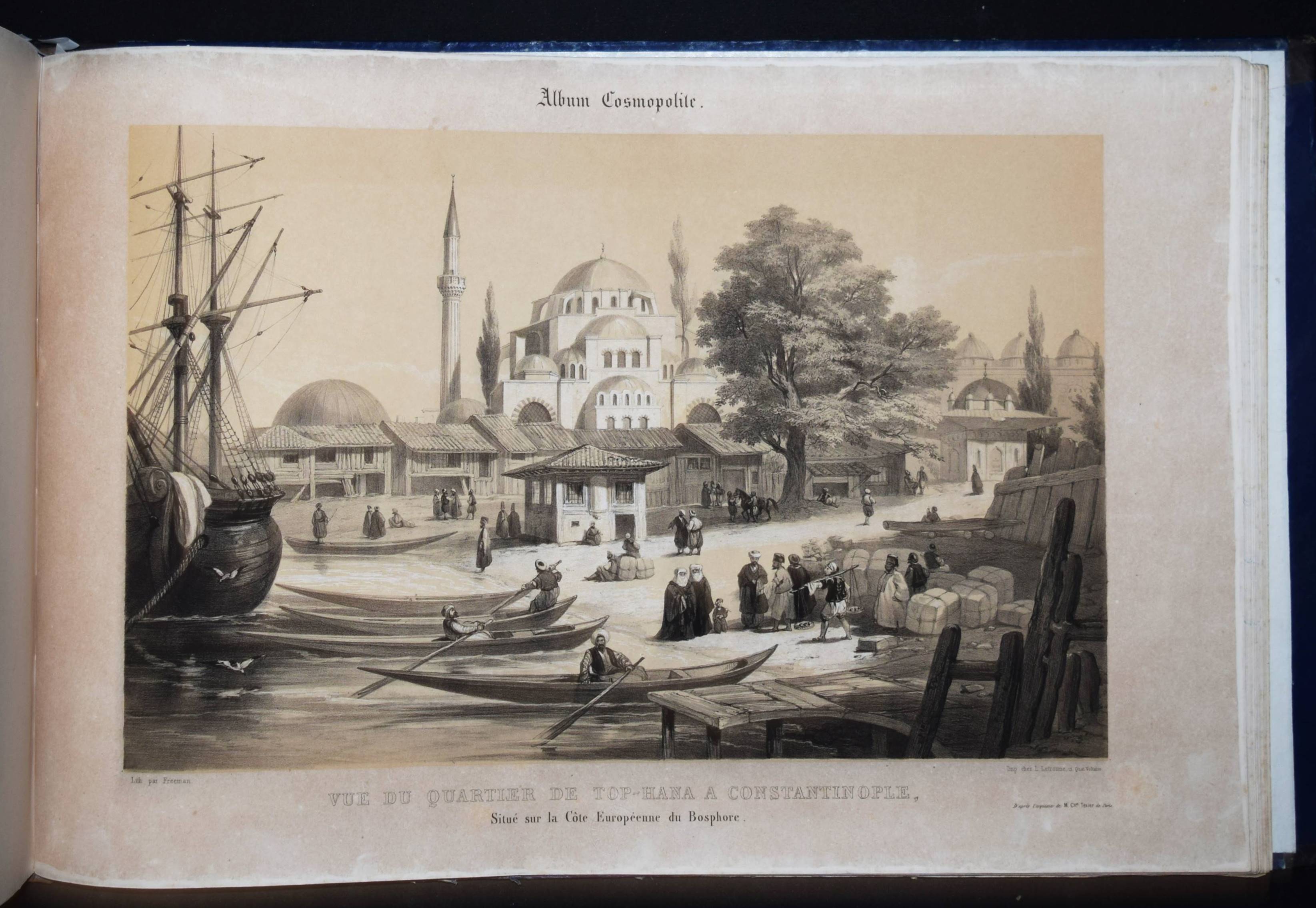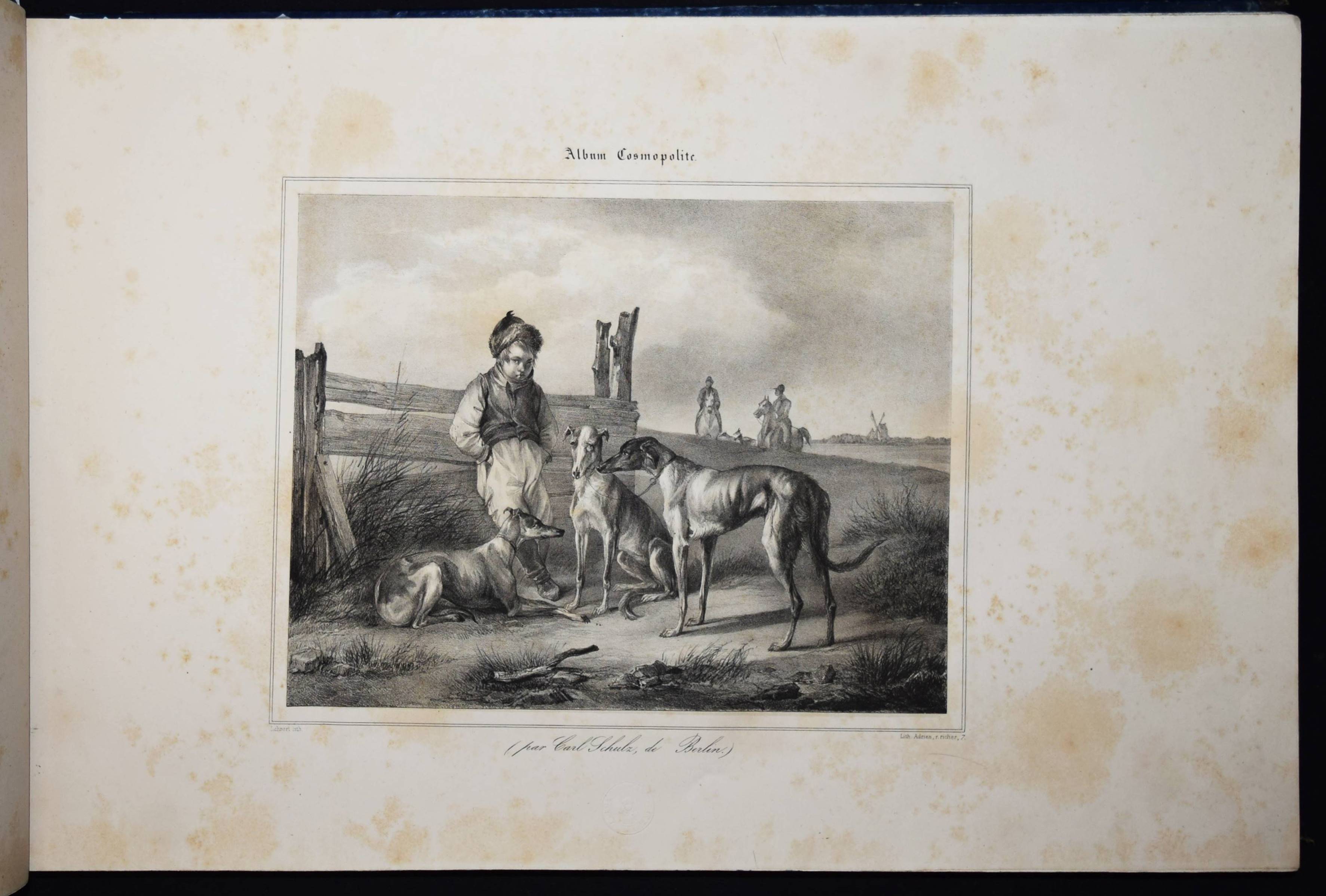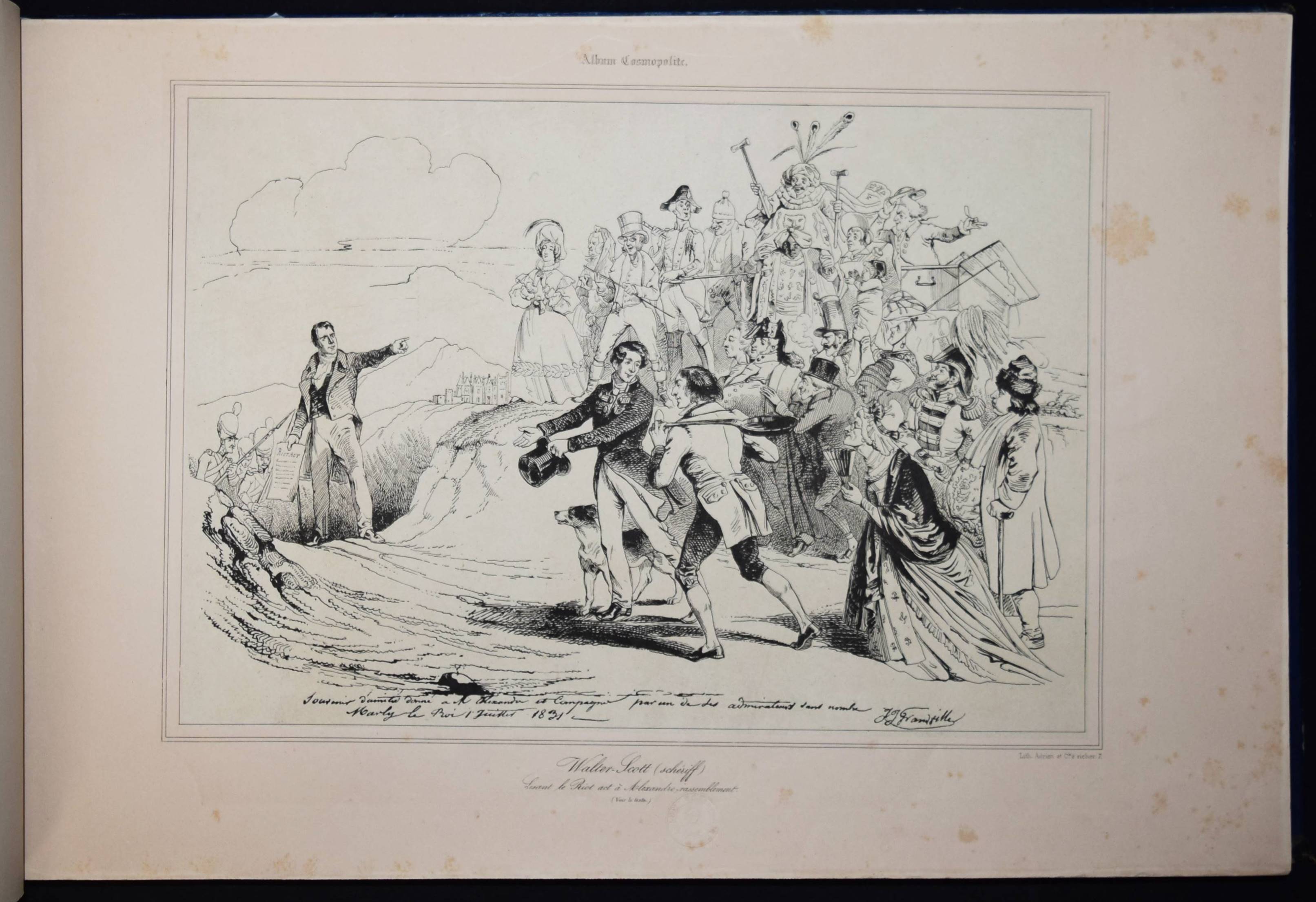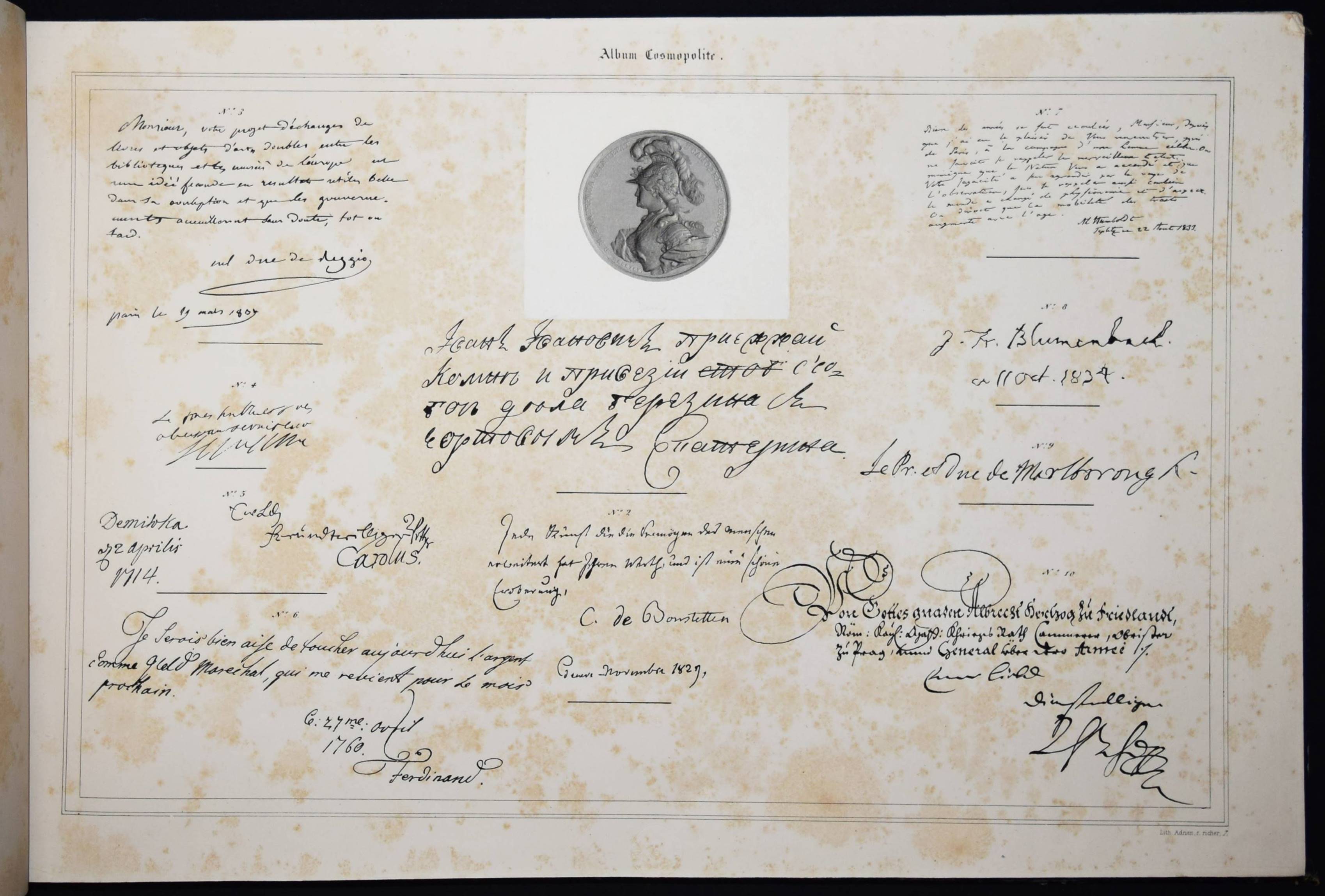 Henrichs, P. (Ed.). Album cosmopolite, ou choix des collections de M. Alexandre Vattemare. Composé de sujets historiques et religieux, paysages, marines, intirieurs, costumes et scines de moeurs, fleurs, medailles … tous originaux, dessinés par les principaux artistes de l’Europe. … Accompagné de textes et fac-simile d’autographes … Gravé et lithographé par les plus habiles artistes. Paris, Béthune et Plon 1837-(1839). Quer-Folio (36,5 x 56,5 cm.). [246] S. mit 75 (2 handkol.) lithogr. Tafeln und 22 lithogr. Autographen-Tafeln. Halblederband der Zeit mit goldgepr. Rückentitel und Romantikervergoldung. Einzige Ausgabe des seltenen Pracht-Albums. Der franz. Philantrop und Kunstmäzen Alexandre Vattemare (1796-1864), der als Bauchredner weltweit berühmt war, präsentiert hier eine der bedeutendsten Privatsammlungen des 19. Jahrhunderts mit Autographen, Medaillien und Zeichnungen. – Mit Lithographien von Champin, Cuvelier, André Durand, Freeman, Granet, Grevedon, Gsell, Jaime, Julien, Lassalle, Lebnert, Maggiolo, Maurin ainé, Raffert, Saint-Aulaire, Schinck, Tirpenne nach Zeichnungen von Eduard v. Bendemann, Auguste Callcott, Amaury Duval, Jacob Genssler, Grandville (″Walter Scott Scherif, liesant le Riot-Act à Alexandre Rassemblement“), Victor Hugo (erste Veröffentlichung von 2 Zeichnungen), Li-Lian-Tun (″Vue intérieure d’un théatre au Japon“), Ernst Meyer, Pinelli, Simon Quaglio, Moritz Retzsch, Julius Schnorr, Thédore de Tostoy, David Wilkie u.a. Außerdem Autographen von Alexander I., Zar von Russland, Beethoven, Lucien Bonaparte, Katharina der Großen, Oliver Chromwell, Erasmus von Rotterdam, Friedrich II., Goethe, Alexander v. Humboldt, Melanchthon, Moliere, Napoleon I., Puschkin, Rabelais, Rubens, Schiller, Washington u.v.m. Subskribiert wurde das Album von zahlr. wichtigen Staats-Oberhäuptern der ganzen Welt, darunter Präsident van Buren (USA), Leopold I. (Belgien), das franz. Königshaus, Königin Victoria (GB) und Sultan Mahmoud II. (Türkei), außerdem von allen deutschen Herrscherhäusern und den Hansestädten Bremen und Hamburg. – A. Vattemare hat während seiner Reisen auch Museen und Bibliotheken in der ganzen Welt besucht und einen hohen Grad an Duplizierung in Sammlungen festgestellt. „Er entwickelte ein neues System des kulturellen Austauschs von Gegenständen zwischen Bibliotheken und Museen, das er jahrzehntelang energisch förderte. Er nutzte seinen Ruhm als Bauchredner, um sein vorgeschlagenes kulturelles Austauschsystem zu fördern. Seine Vorschläge wurden in den Vereinigten Staaten und Kanada besser aufgenommen als in Frankreich. Er reiste in 13 Staaten und nach Kanada. Bis 1843 hatte er „1.800 Bände, 500 Münzen, 250 Gravuren und zahlreiche mineralogische und naturhistorische Exemplare“ nach Frankreich gebracht. Vattemare gilt als Initiator des Ausbaus des Bibliothekssystems in den Vereinigten Staaten, und sein Tauschsystem gilt als Vorläufer späterer kultureller Tauschsysteme, darunter der UNESCO . Bücher und andere Dokumente, die über Vattemares System ausgetauscht wurden, sind noch heute in Bibliotheken auf der ganzen Welt zu finden, insbesondere in Boston und Paris. Diese Sammlungen umfassen viele seltene und wertvolle Veröffentlichungen, die für moderne Historiker von großem Interesse sind.“ (Wikipedia). – Einband etwas berieben, durchgehend etwas braunfleckig, gutes Exemplar.