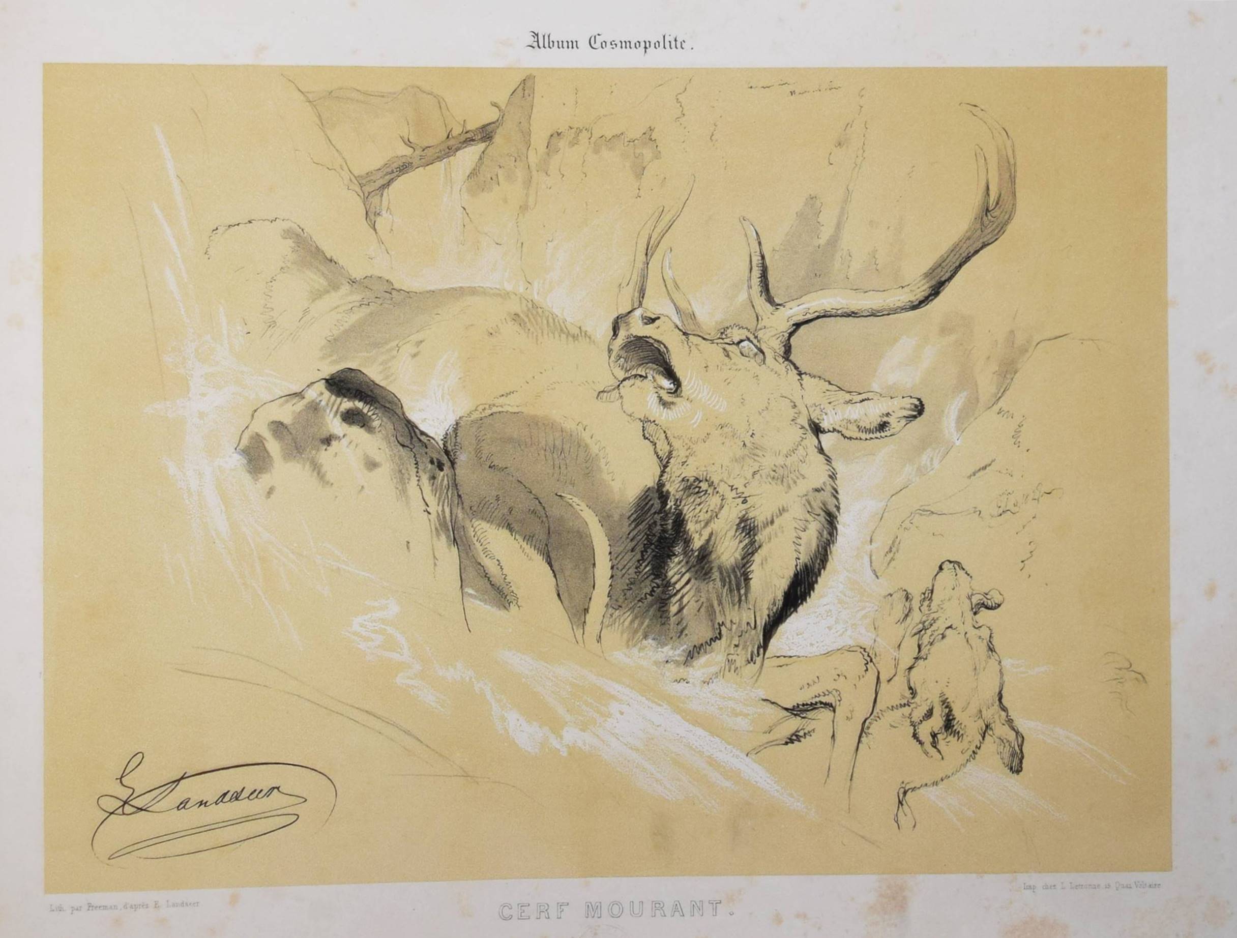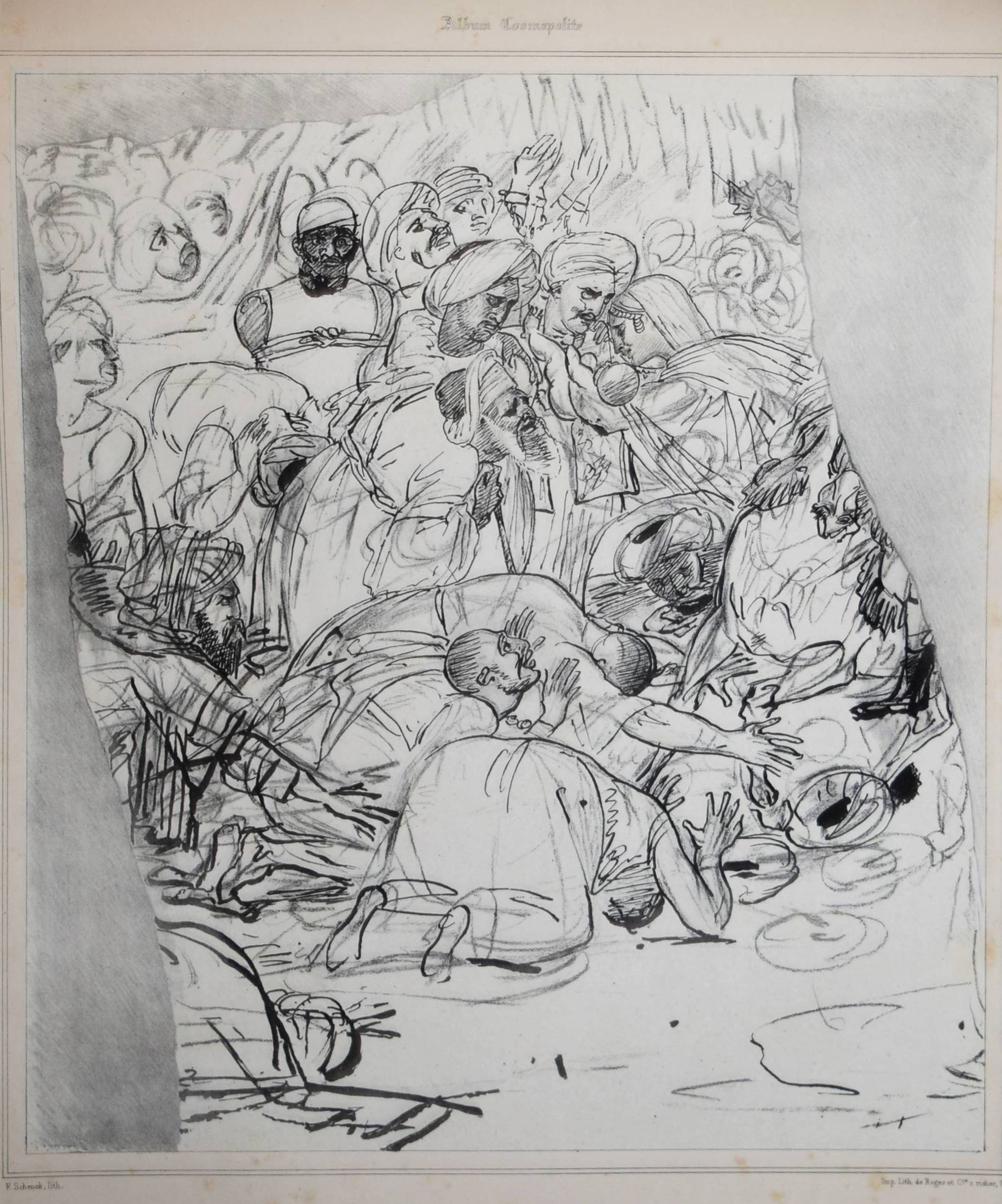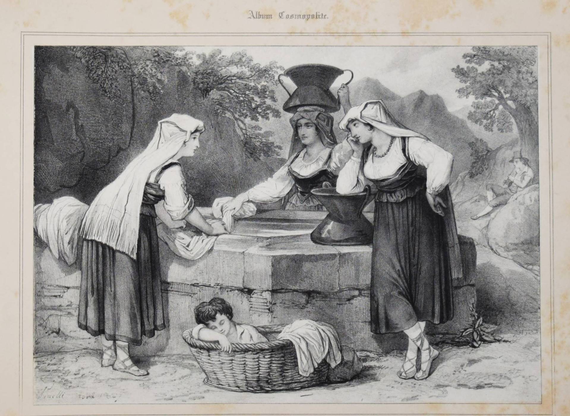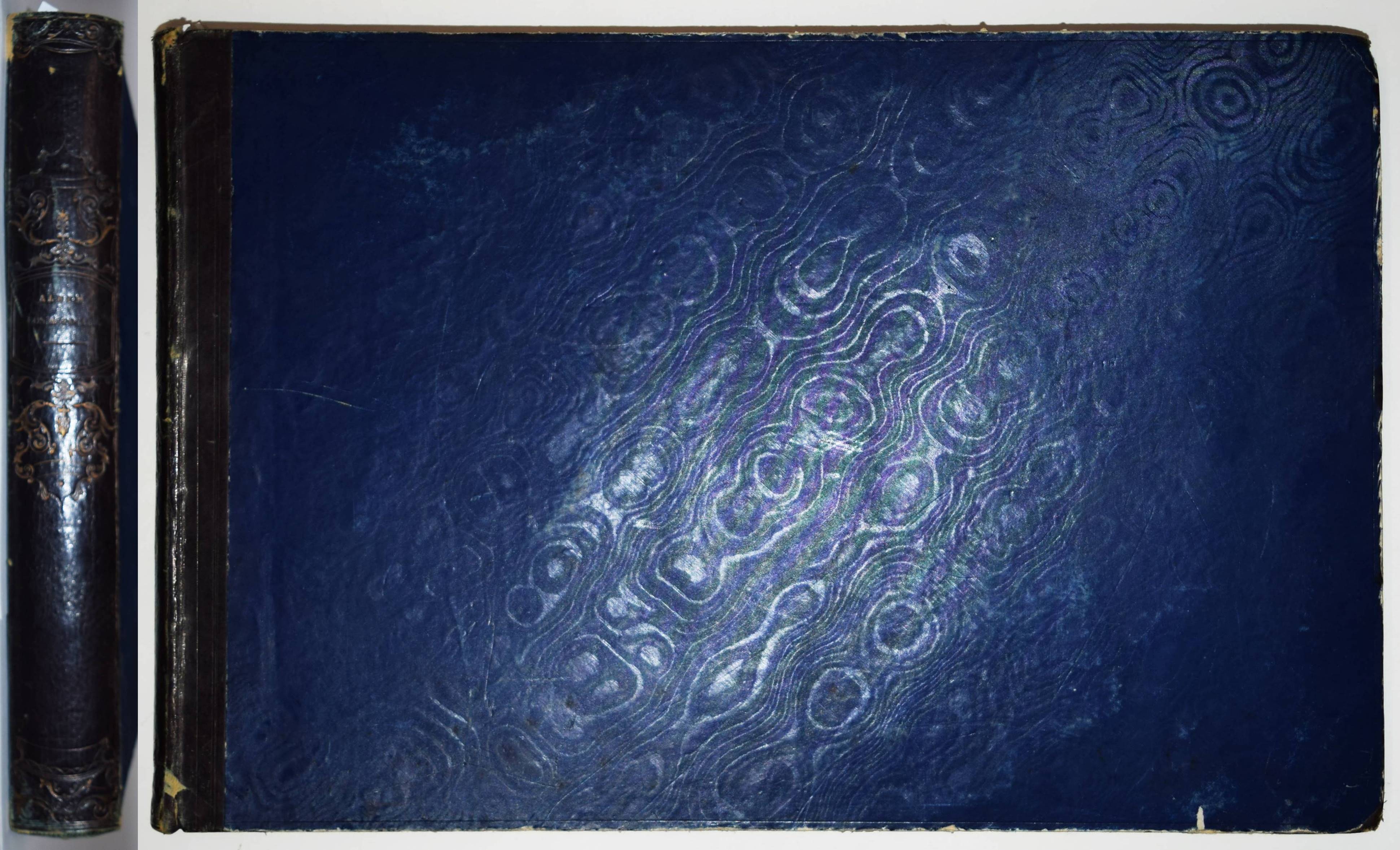 Henrichs, P. (Ed.). Album cosmopolite, ou choix des collections de M. Alexandre Vattemare. Composé de sujets historiques et religieux, paysages, marines, intirieurs, costumes et scines de moeurs, fleurs, medailles … tous originaux, dessinés par les principaux artistes de l’Europe. … Accompagné de textes et fac-simile d’autographes … Gravé et lithographé par les plus habiles artistes. Paris, Béthune et Plon 1837-(1839). Quer-Folio (36,5 x 56,5 cm.). [246] S. mit 75 (2 handkol.) lithogr. Tafeln und 22 lithogr. Autographen-Tafeln. Halblederband der Zeit mit goldgepr. Rückentitel und Romantikervergoldung. Einzige Ausgabe des seltenen Pracht-Albums. Der franz. Philantrop und Kunstmäzen Alexandre Vattemare (1796-1864), der als Bauchredner weltweit berühmt war, präsentiert hier eine der bedeutendsten Privatsammlungen des 19. Jahrhunderts mit Autographen, Medaillien und Zeichnungen. – Mit Lithographien von Champin, Cuvelier, André Durand, Freeman, Granet, Grevedon, Gsell, Jaime, Julien, Lassalle, Lebnert, Maggiolo, Maurin ainé, Raffert, Saint-Aulaire, Schinck, Tirpenne nach Zeichnungen von Eduard v. Bendemann, Auguste Callcott, Amaury Duval, Jacob Genssler, Grandville (″Walter Scott Scherif, liesant le Riot-Act à Alexandre Rassemblement“), Victor Hugo (erste Veröffentlichung von 2 Zeichnungen), Li-Lian-Tun (″Vue intérieure d’un théatre au Japon“), Ernst Meyer, Pinelli, Simon Quaglio, Moritz Retzsch, Julius Schnorr, Thédore de Tostoy, David Wilkie u.a. Außerdem Autographen von Alexander I., Zar von Russland, Beethoven, Lucien Bonaparte, Katharina der Großen, Oliver Chromwell, Erasmus von Rotterdam, Friedrich II., Goethe, Alexander v. Humboldt, Melanchthon, Moliere, Napoleon I., Puschkin, Rabelais, Rubens, Schiller, Washington u.v.m. Subskribiert wurde das Album von zahlr. wichtigen Staats-Oberhäuptern der ganzen Welt, darunter Präsident van Buren (USA), Leopold I. (Belgien), das franz. Königshaus, Königin Victoria (GB) und Sultan Mahmoud II. (Türkei), außerdem von allen deutschen Herrscherhäusern und den Hansestädten Bremen und Hamburg. – A. Vattemare hat während seiner Reisen auch Museen und Bibliotheken in der ganzen Welt besucht und einen hohen Grad an Duplizierung in Sammlungen festgestellt. „Er entwickelte ein neues System des kulturellen Austauschs von Gegenständen zwischen Bibliotheken und Museen, das er jahrzehntelang energisch förderte. Er nutzte seinen Ruhm als Bauchredner, um sein vorgeschlagenes kulturelles Austauschsystem zu fördern. Seine Vorschläge wurden in den Vereinigten Staaten und Kanada besser aufgenommen als in Frankreich. Er reiste in 13 Staaten und nach Kanada. Bis 1843 hatte er „1.800 Bände, 500 Münzen, 250 Gravuren und zahlreiche mineralogische und naturhistorische Exemplare“ nach Frankreich gebracht. Vattemare gilt als Initiator des Ausbaus des Bibliothekssystems in den Vereinigten Staaten, und sein Tauschsystem gilt als Vorläufer späterer kultureller Tauschsysteme, darunter der UNESCO . Bücher und andere Dokumente, die über Vattemares System ausgetauscht wurden, sind noch heute in Bibliotheken auf der ganzen Welt zu finden, insbesondere in Boston und Paris. Diese Sammlungen umfassen viele seltene und wertvolle Veröffentlichungen, die für moderne Historiker von großem Interesse sind.“ (Wikipedia). – Einband etwas berieben, durchgehend etwas braunfleckig, gutes Exemplar.