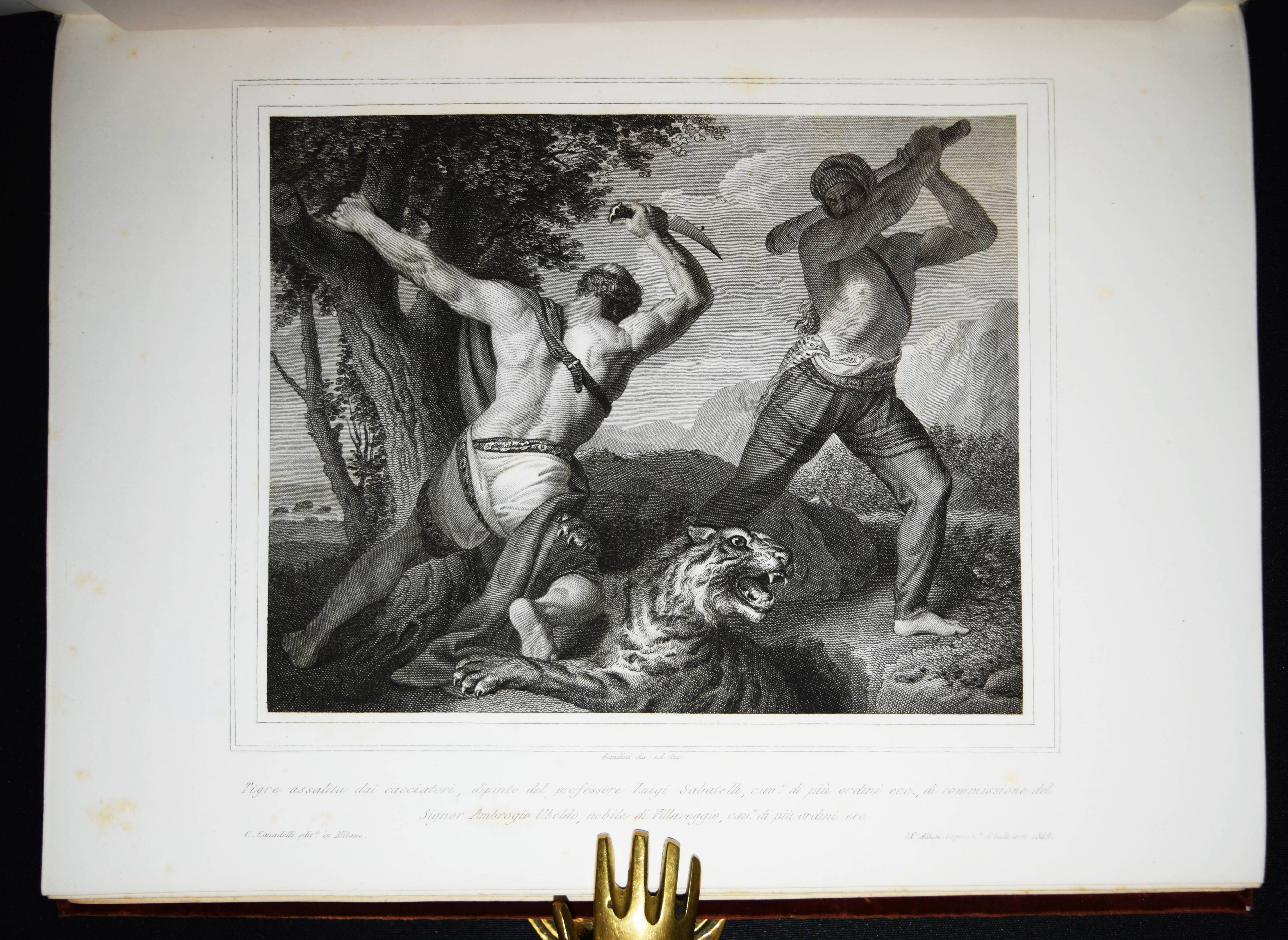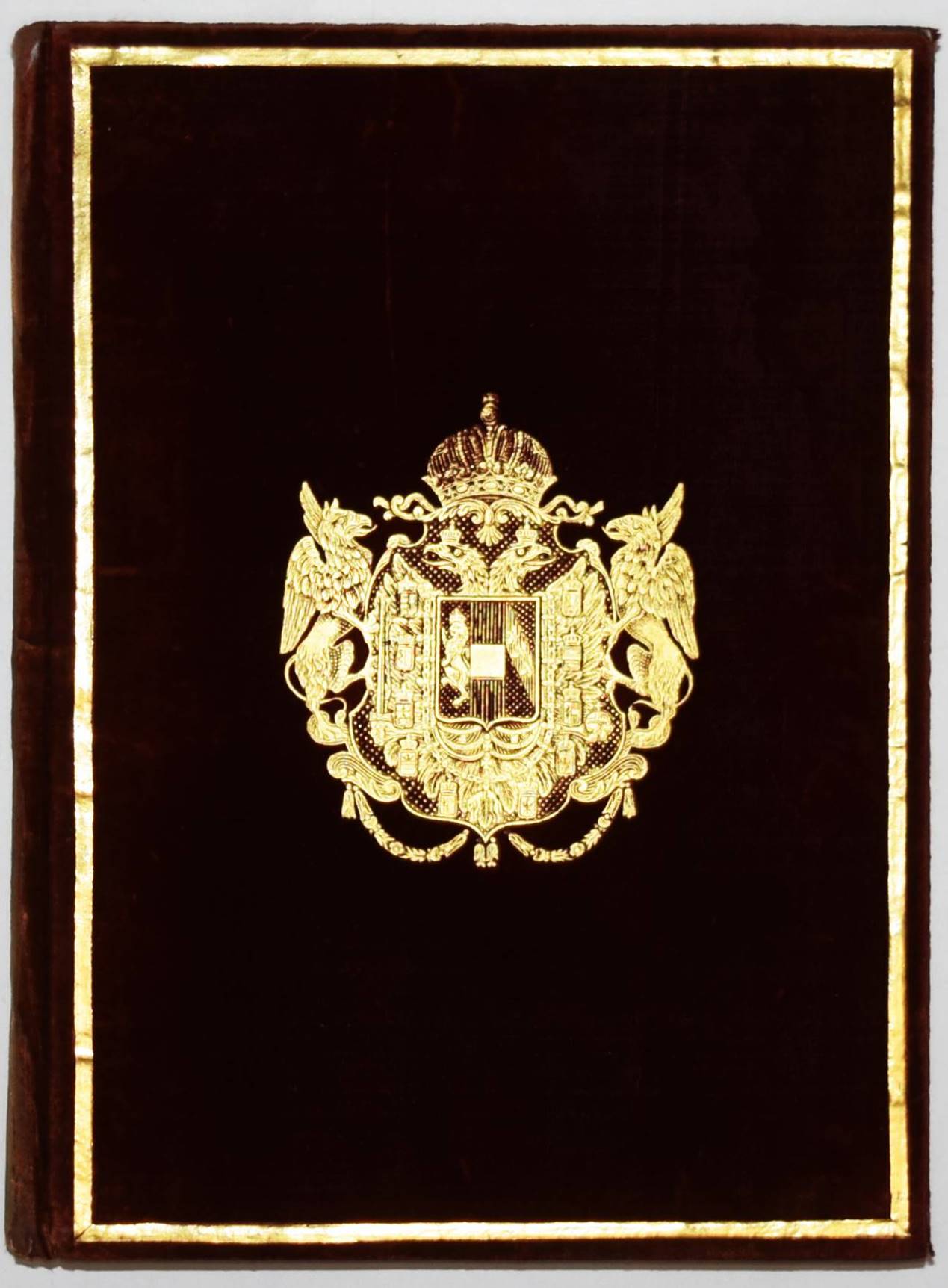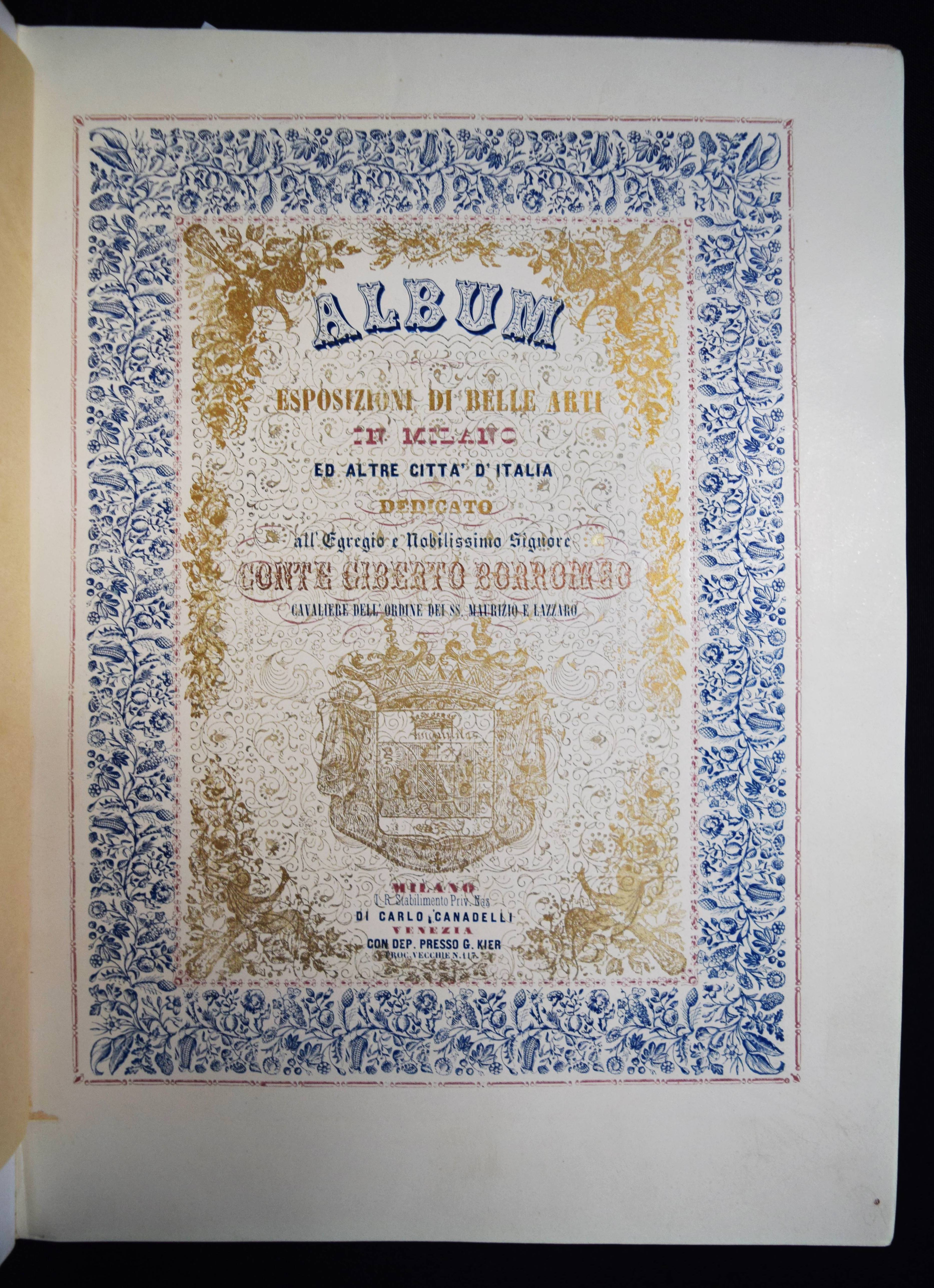 Villani, Filippo (Compilatore). Album esposizioni di belle arti in Milano ed altre citta d’Italia (Frontispiz). Esposizione di belle arti in Milano ed altre citta d’Italia 1845. Anno IX. Milano, Carlo Canadelli (1845). 4° (26,5 x 19,5 cm.). [2] Bl., 125 S., [3] Bl. mit farblithogr. typogr. Frontispiz und 18 Radierungen. Dunkelroter Samteinband mit goldgepr. Wappen auf dem Vorderdeckel, goldgepr. Deckelfiletten und Goldschnitt. Prachtvoll ausgestatteter Katalog zur 9. Mailänder Kunstausstellung. – Mit Radierungen nach Gemälden von Francesco Hayez (2), Carlo Gaggi, Francesco Podesti, Eliseo Sala, Eugenio Bosa, Rinaldo Belgiojoso, Camillo Brozzoni, Luigi Bisi, Luigi Sabatelli, Eugenio Isabey, Natale Schiavoni, Guiseppe Canella, Giuseppe Molteni, Remigio Van-Haanen, Angelo Inganni und Francesco Gonin. – Rücken ausgebleicht und berieben, sonst sehr gut erhalten.
