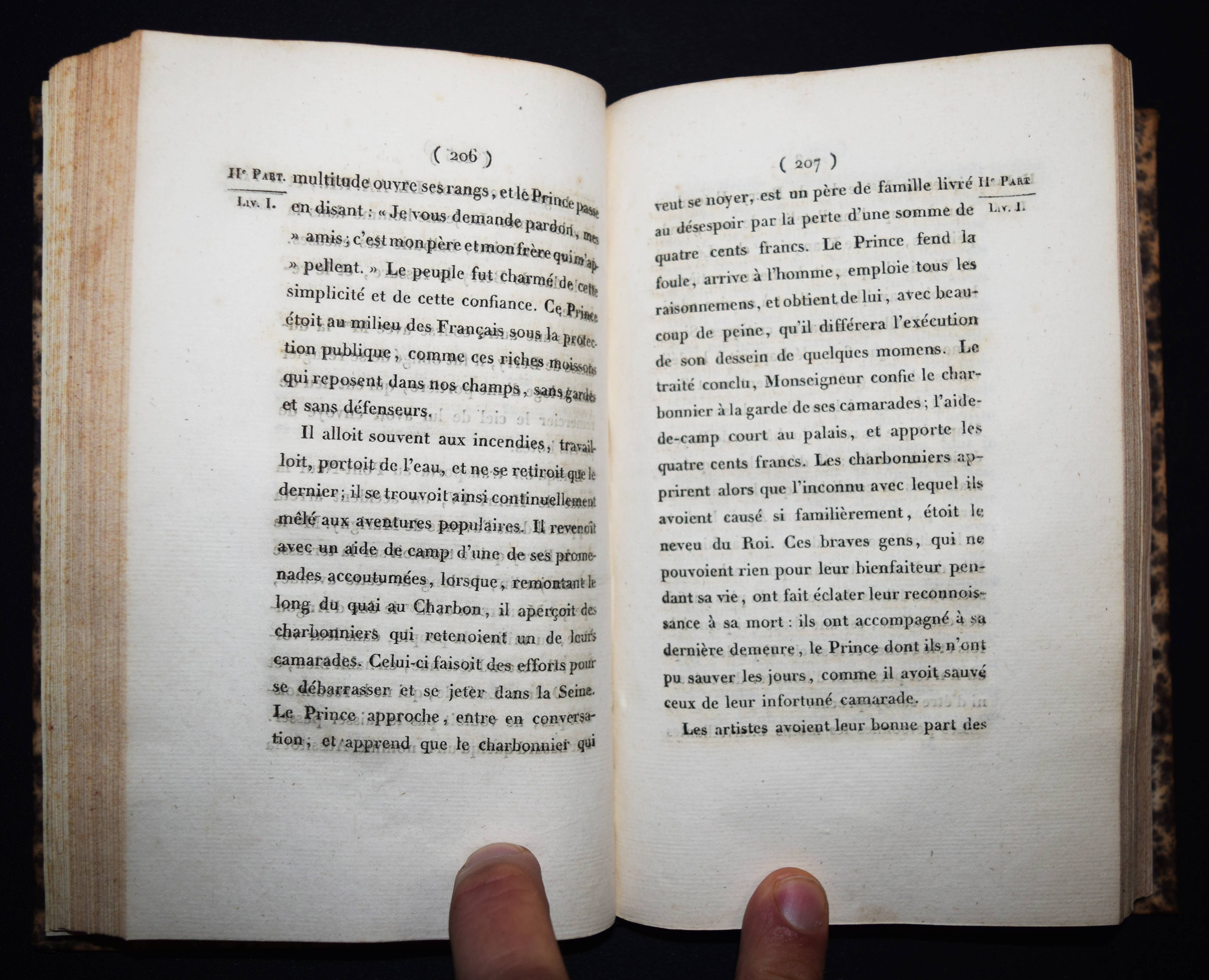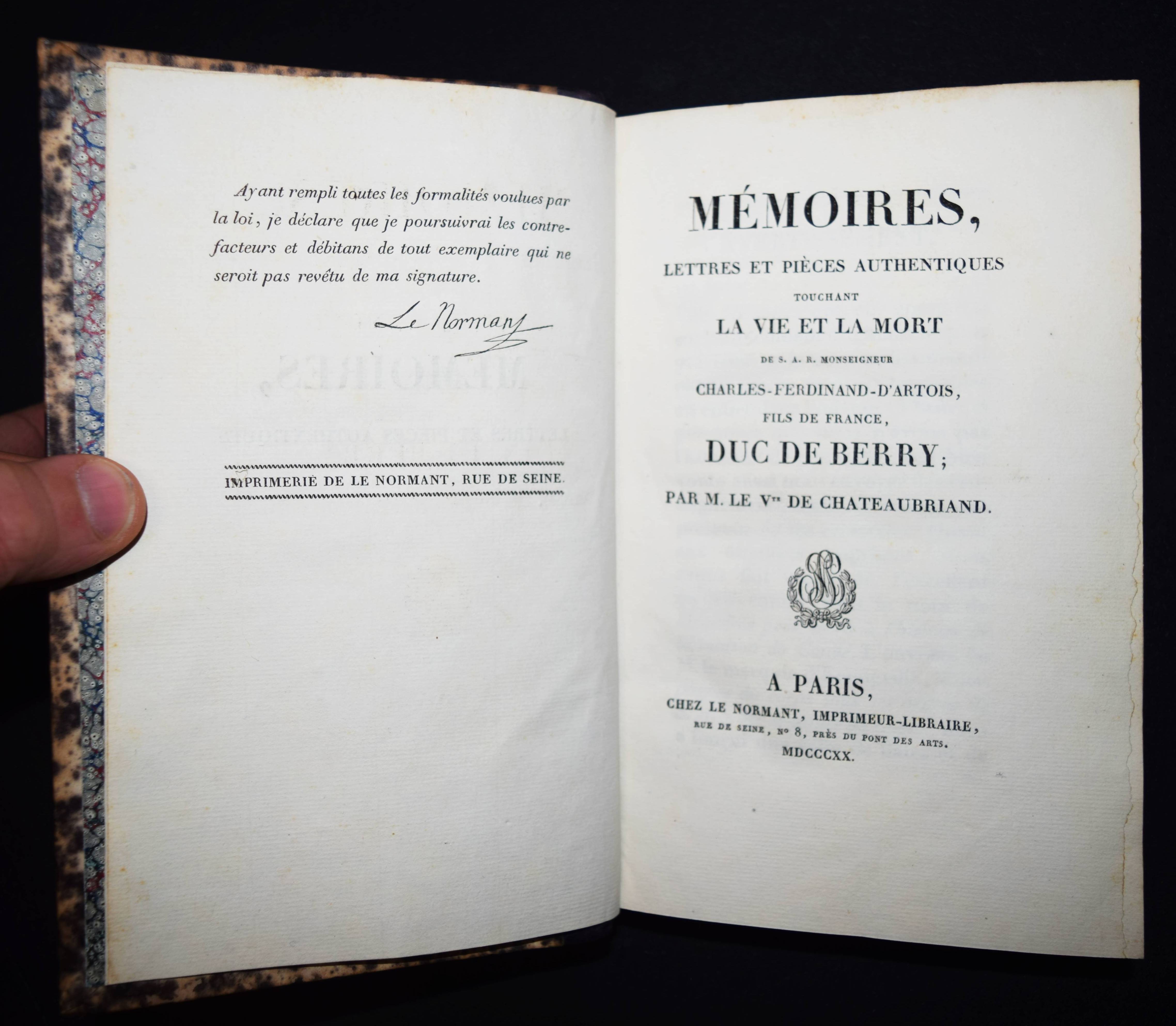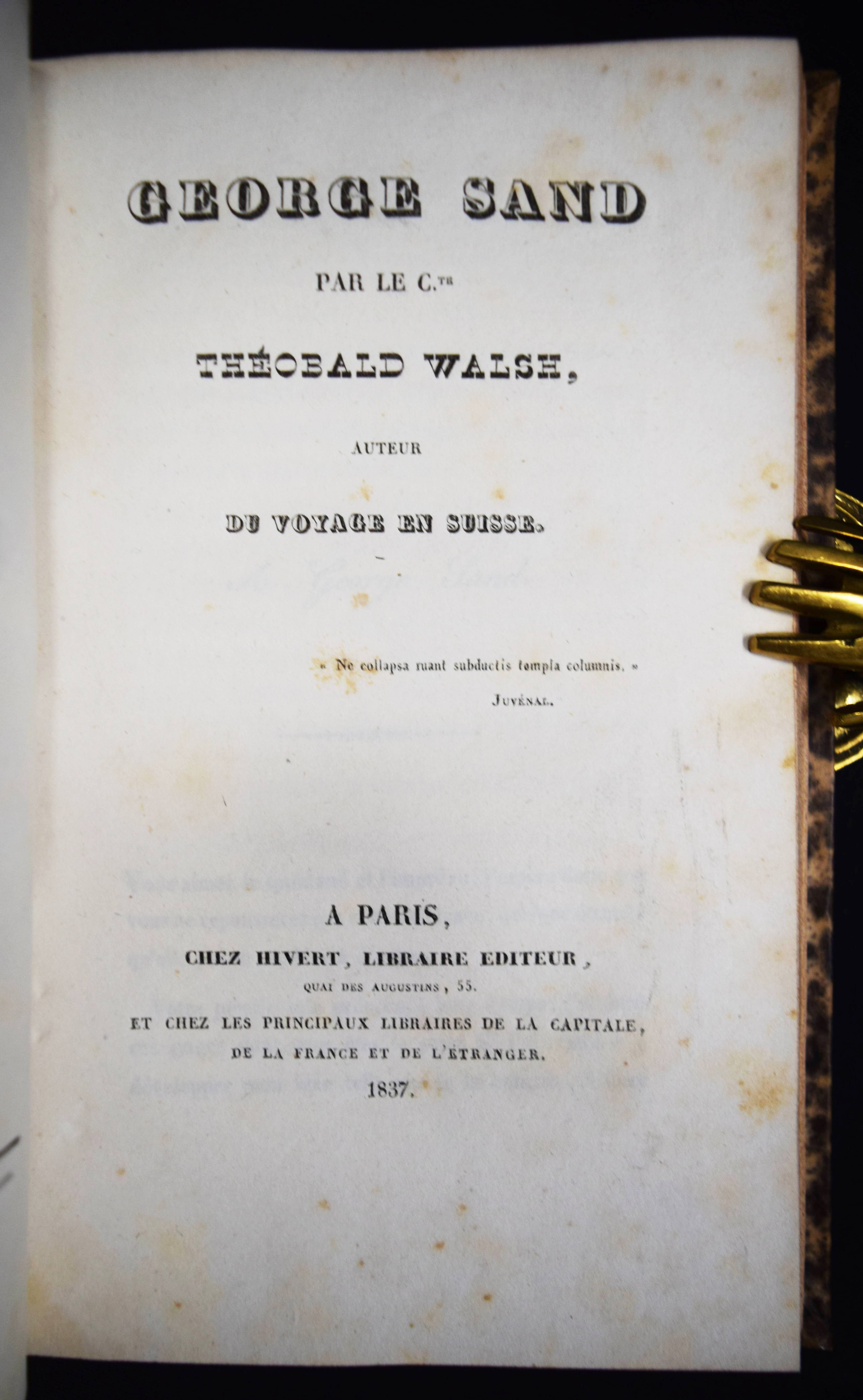 Chateaubriand, (François-René) de. Mémoires, lettres et pièces authentiques touchant la vie et la mort de S. A. R. Monseigneur Charles-Ferdinand d’Artois, fils de France, Duc de Berry. Beigebunden: Walsh, (Antoine Olivier) Théobald. George Sand. 2 Werke in 1 Band. Paris, Le Normant und Hivert 1820 und 1837. 8°. [2] Bl., II, 299 S.; XIV, 232 S. Halblederband der Zeit mit goldgepr. Rückentitel und Rückenvergoldung. I. Hoefer 10, 101. Oettinger 1729. Querard I, 152. – Seltene erste Ausgabe der Biographie und Streitschrift zum Mord am Duc de Berry, verfasst von einem der ärgsten und wortgewaltigsten Gegenspieler des Ministers Decazes. Vom Verleger Le Normant signiert. – II. Vicaire VII, 329. – Erste Ausgabe – T. Walsh analysiert u. a. ausführlich den Roman „Lélia“ (1833) von G. Sand. – George Sand (d. i. Amantine Aurore Lucile Dupin de Francueil, 1804-1876) lebte 1838 bis 1839 mit Frédéric Chopin auf Mallorca. – Gestoch. Wappen-Exlibris (″Comte d’Antioche“), interessanter Sammelband aus einer franz. Adels-Bibliothek.