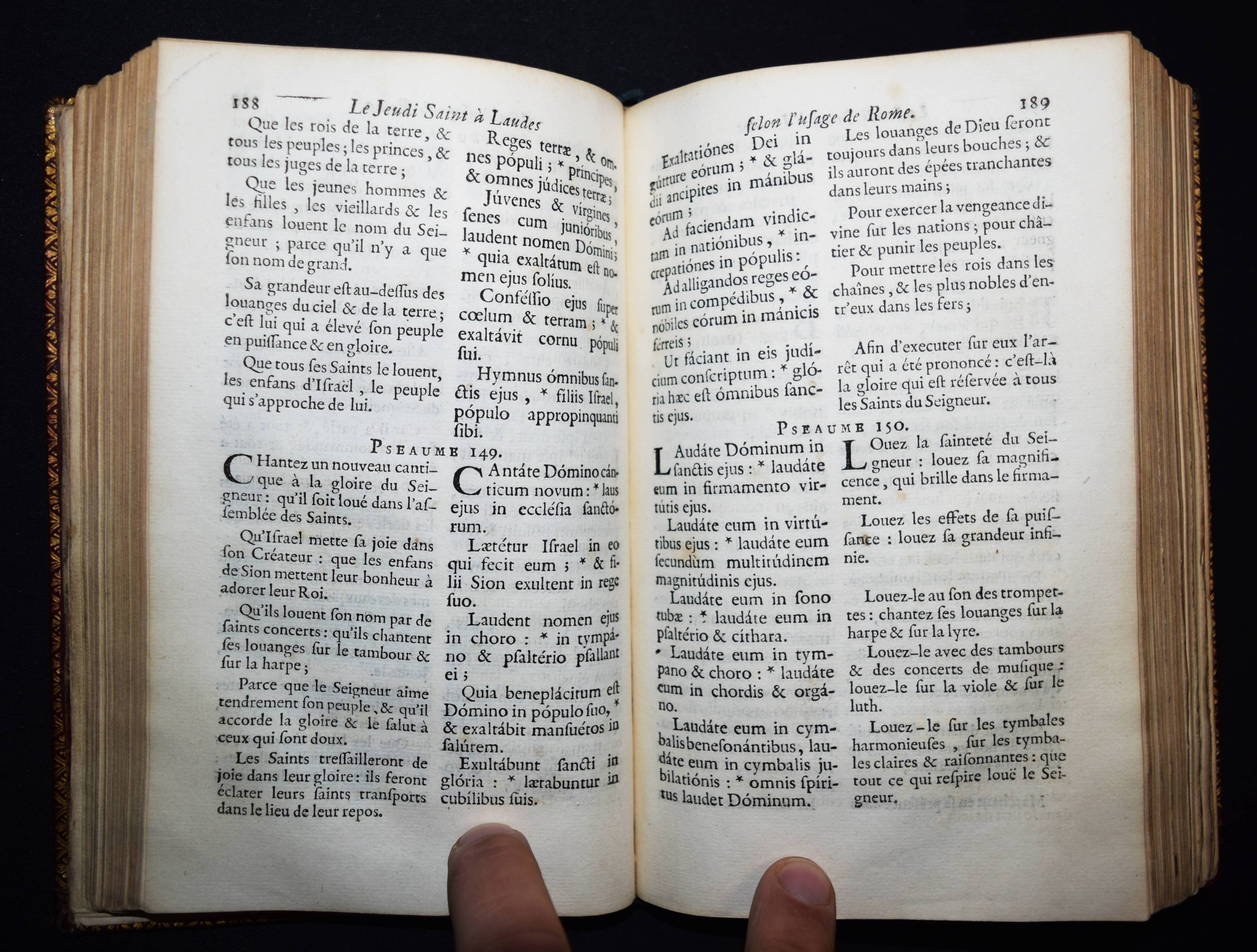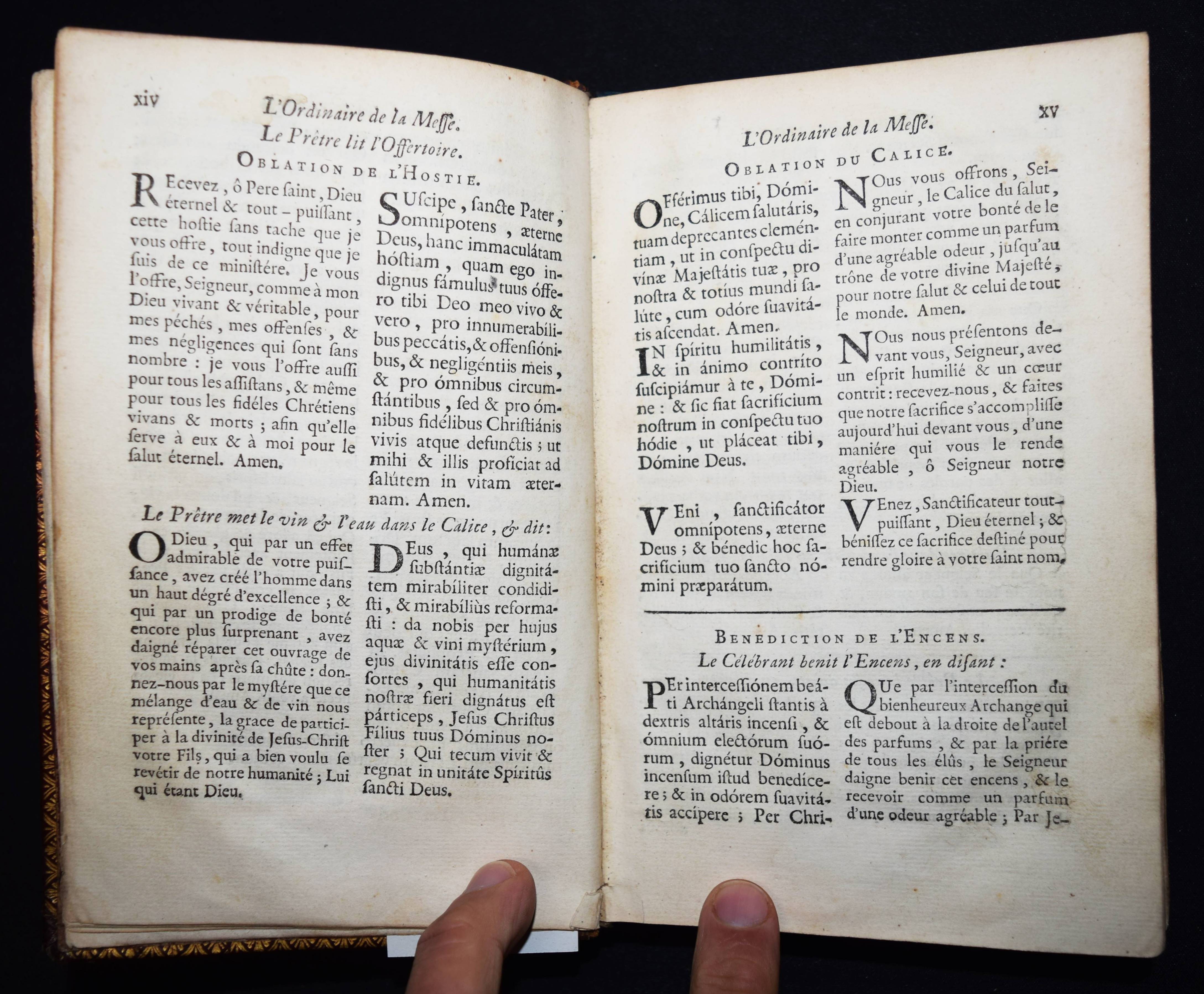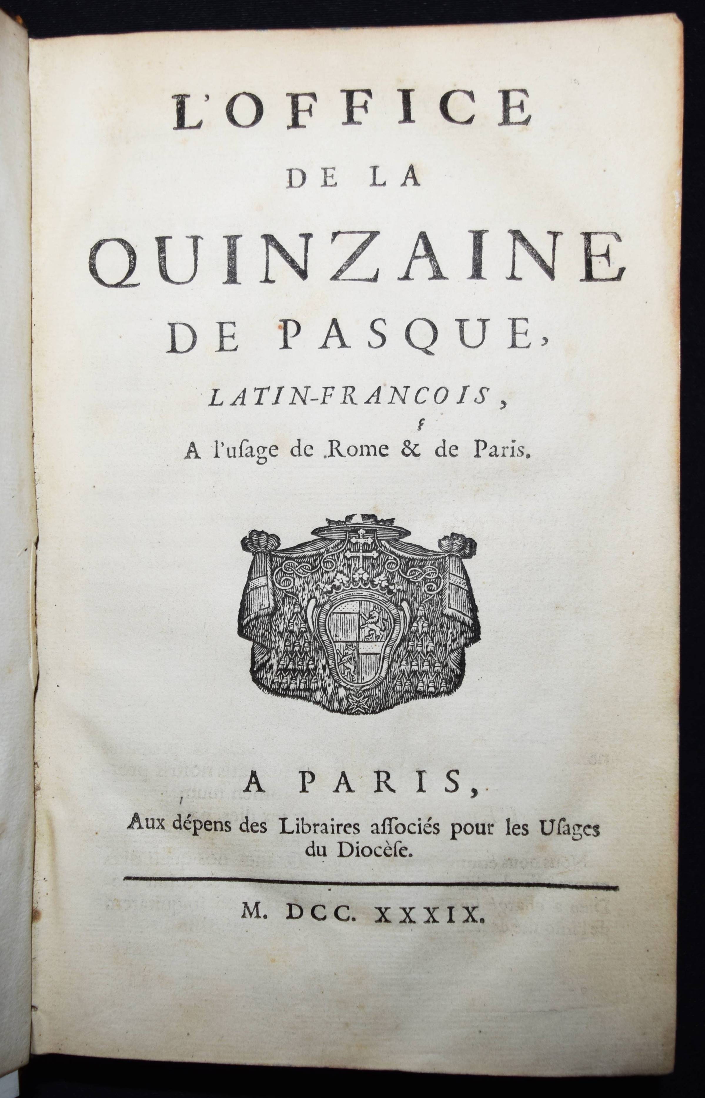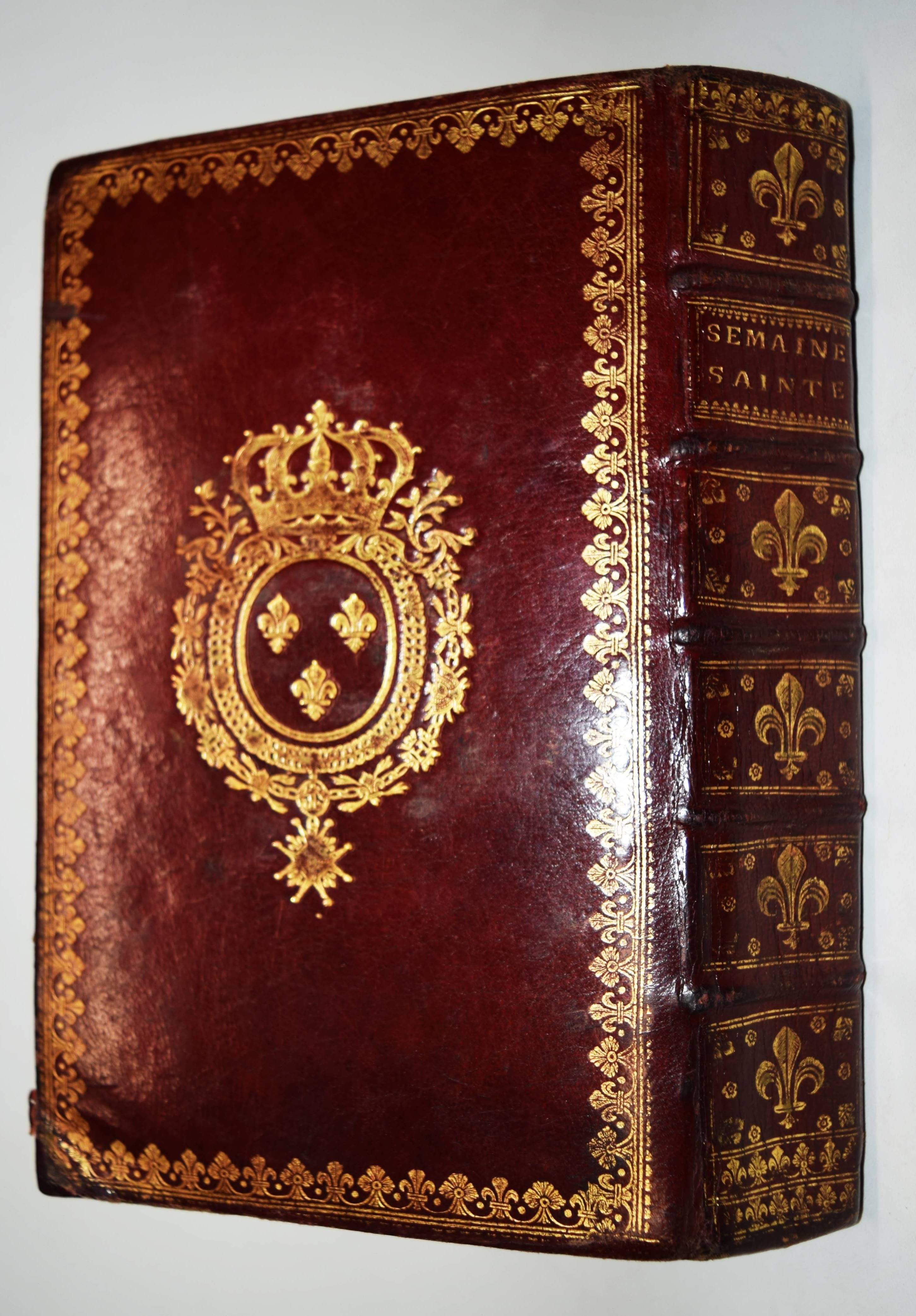 Einband – Weinroter Maroquin-Ledereinband mit dekorativer Rückenvergoldung, goldgepr. Deckelfiletten, Wappen-Supralibros (Louis XV., König von Frankreich) und Innenkantenvergoldung und Goldschnitt sowie marmorierten Vorsätzen. Inhalt: L’Office de la quinzaine de Pasque, Latin-François, à l’usage de Rome & de Paris. Paris, aux dépens des Libraires associés pour les usages du Diocèse (1739). 8° (19,5 x 12,5 cm.). XXXIV, 631 S., [1] Bl. Prachtvoller Barock-Einband aus der Bibliothek von Ludwig XV., König von Frankreich (1710-1774). – Louis XV wurde vom „Volk „der Vielgeliebte“ (französisch le Bien-Aimé) und später „der Ungeliebte“ (französisch le Mal-Aimé) genannt. Unter seiner Regierung wurde der jahrhundertealte Gegensatz zwischen Frankreich und Österreich beigelegt und die neue Allianz durch die Heirat Marie-Antoinettes, der Tochter Maria Theresias von Österreich, mit seinem Enkel, dem späteren Ludwig XVI., besiegelt. Bekannt ist seine Beziehung zu seiner Mätresse Marquise de Pompadour. Nach ihm ist die Stilepoche Louis-quinze benannt“ (Wikipedia). – Sehr gut erhalten. – Reliure aux armes de France Louis XV.