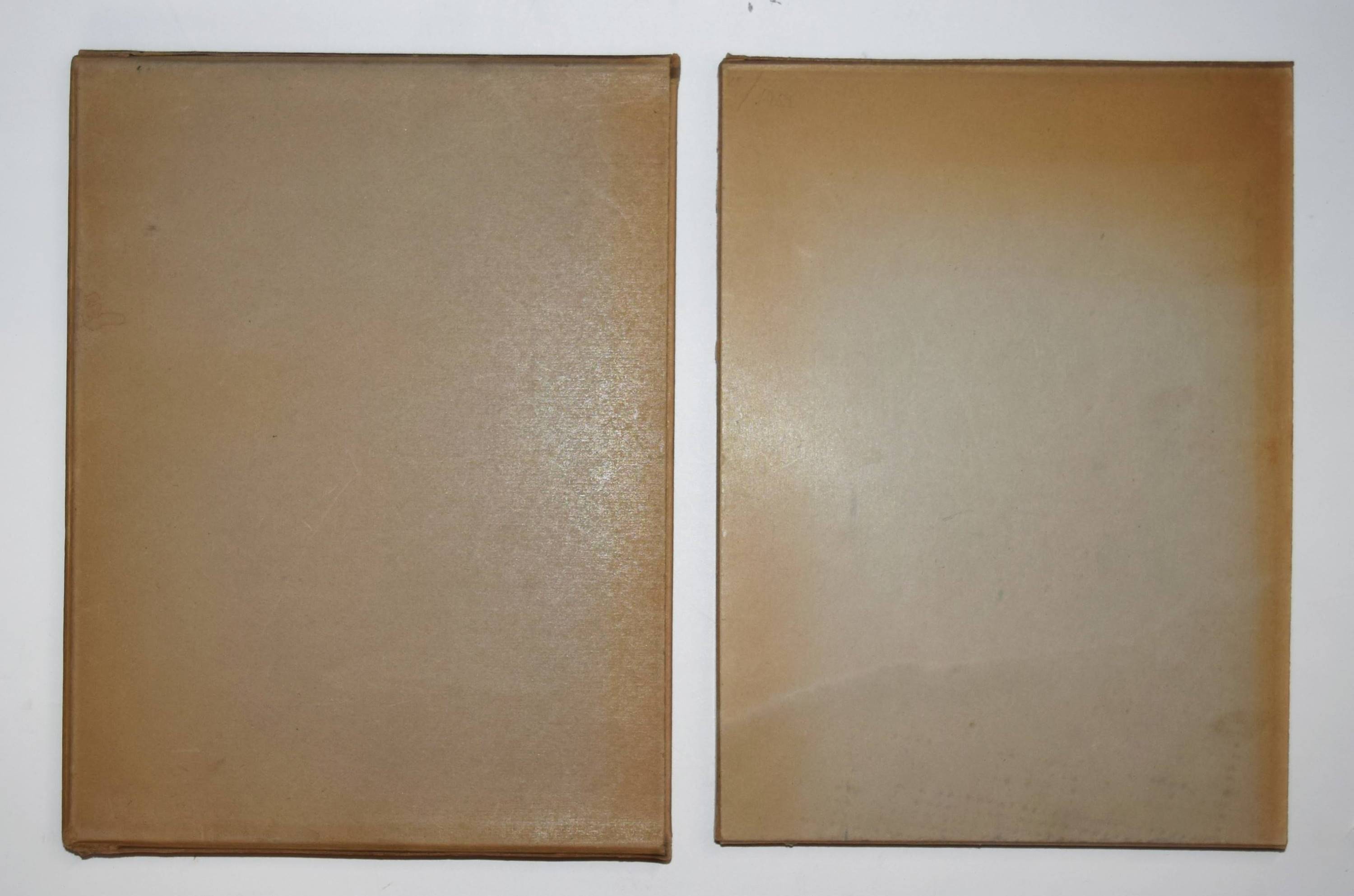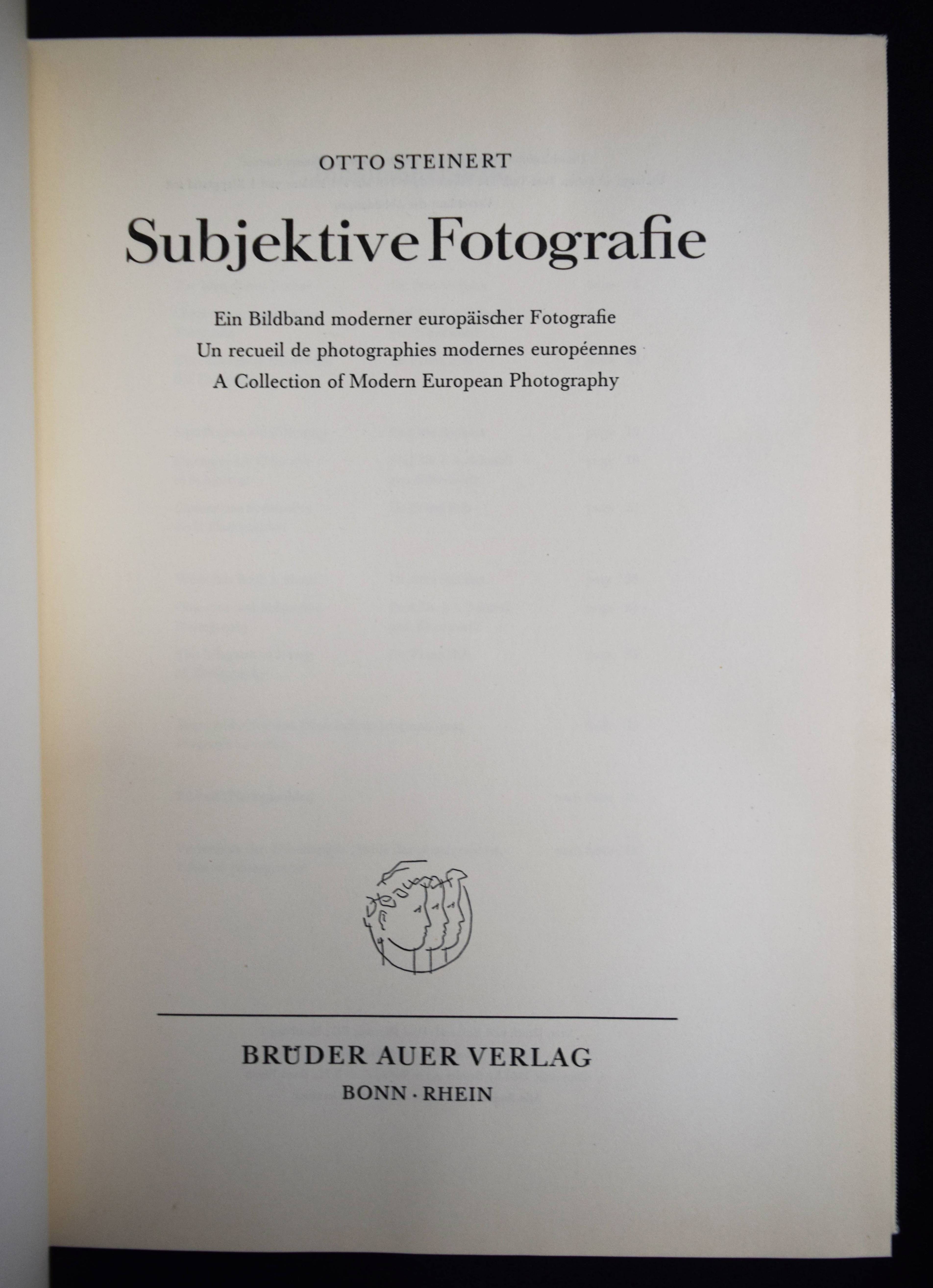 Steinert, Otto (Hugo Wilhelm). Subjektive Fotografie. Ein Bildband moderner Fotografie. (Mit Texten von J. A. Schmoll gen. Eisenwerth, Franz Roh u. O. Steinert). – Und: Ders. Subjektive Fotografie 2. Ein Bildband moderner Fotografie. Mit einem Textbeitrag von J. A. Schmoll gen. Eisenwerth: Vom Sinn der Fotografie. 2 Bände. München, Brüder Auer Verlag 1952 und 1955. 4°. 40 S., 111 Tafeln, 1 gefalt. Bl.; 39, (1) S., 111 Tafeln, 1 gefalt. Bl. Orig.-Leinenbände mit illustr. Orig.-Schutzumschlägen und Orig.-Pappschubern. Auer 352. Heidtmann 10781 . Koetzle 439 f. Parr/Badger I, 205. The Open Book 156 f. – Erste Ausgaben. – Beide Bände erschienen anlässlich der zwei wichtigen Ausstellungen „subjektive fotografie“ (Saarbrücken 1951-1955), 1958 folgte eine dritte Ausstellung. Erster umfassender Versuch, „die gestalterischen Möglichkeiten des Mediums Fotografie in Deutschland wieder aufzuzeigen“ (T. Koenig). – Mit Bildbeiträgen von Moholy-Nagy, Man Ray, H. Bayer, P. Keetman, E. Bourbat, F. Brill, W. Bischof, Chargesheimer, H. List, H. Hajek-Halke, R. Groebli, F. Roiter, R. Hausmann, Y. Ishimoto u.v.a. – „Otto Steinert war der einflussreichste Mentor der westdeutschen Fotografie nach 1945. … Die Betonung der eigengesetzlichen Mittel der Fotografie in Optik und Chemie sind Grundlage seines Schaffens – ein fast naturwissenschaftlich anmutendes Credo, das sich in gelegentlich etwas sterilen, zugleich aber von enormer formaler Dichte geprägten Darstellungen artikulierte“ (U. Pohlmann in Koetzle). – „Its exhibitions, as well as the two ‚Subjektive Fotographie‘ (Subjective Photography) books published by Steinert, were highly influential, and iis approach to photography might be compared to the kind of formalist work being made around the same time at the Chicago Institute of Design and other teaching centers in the United States. … Thus although ‚Subjektive Fotografie‘ was a widely influential book for a while, its significance waned fairly quickly and the movement withered away through the 1960s“ (Parr/Badger). – Die Pappschuber etwas fleckig, gebräunt und angestaubt, außergewöhnlich gute Exemplare des wichtigen Werks.