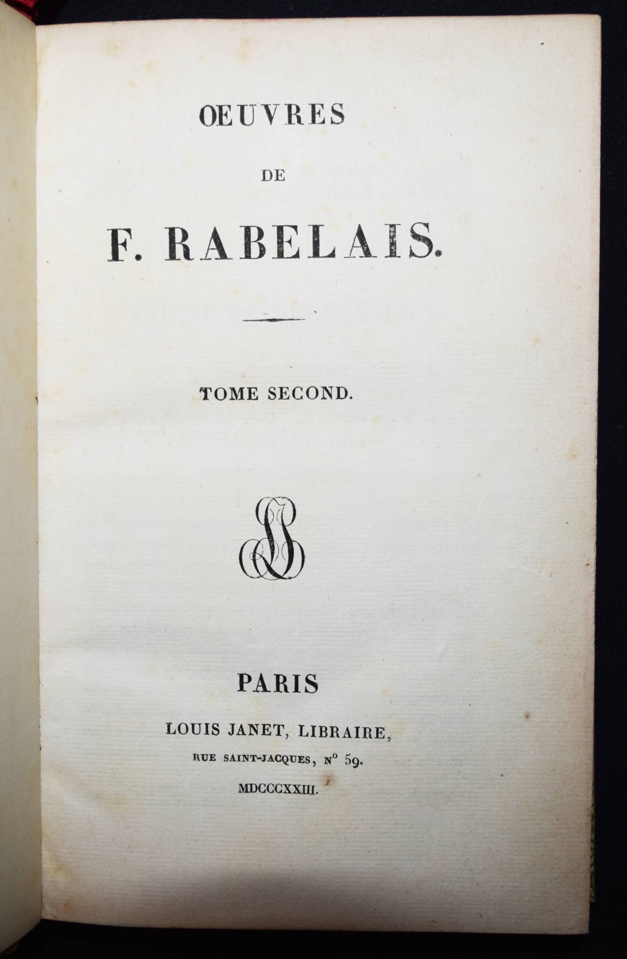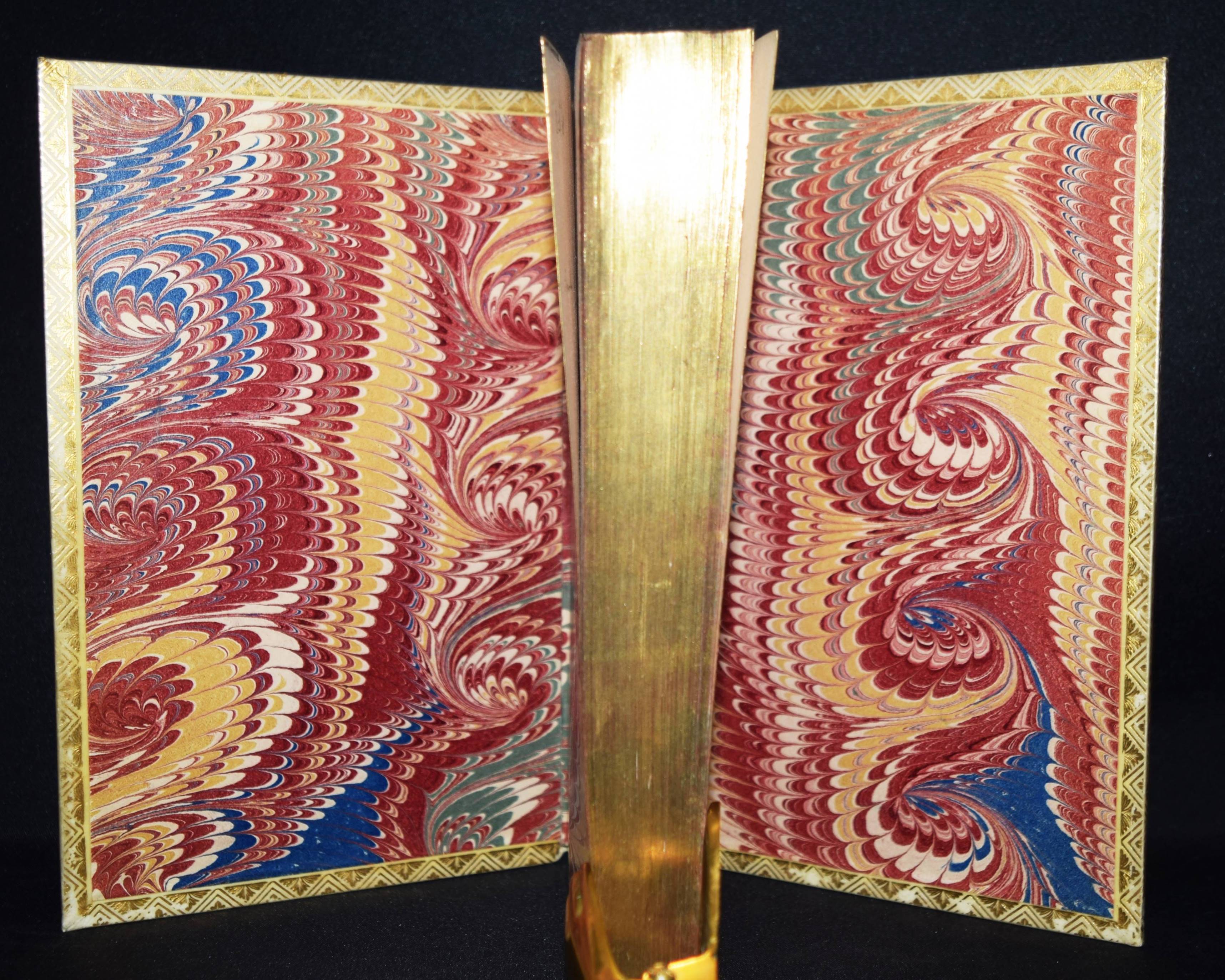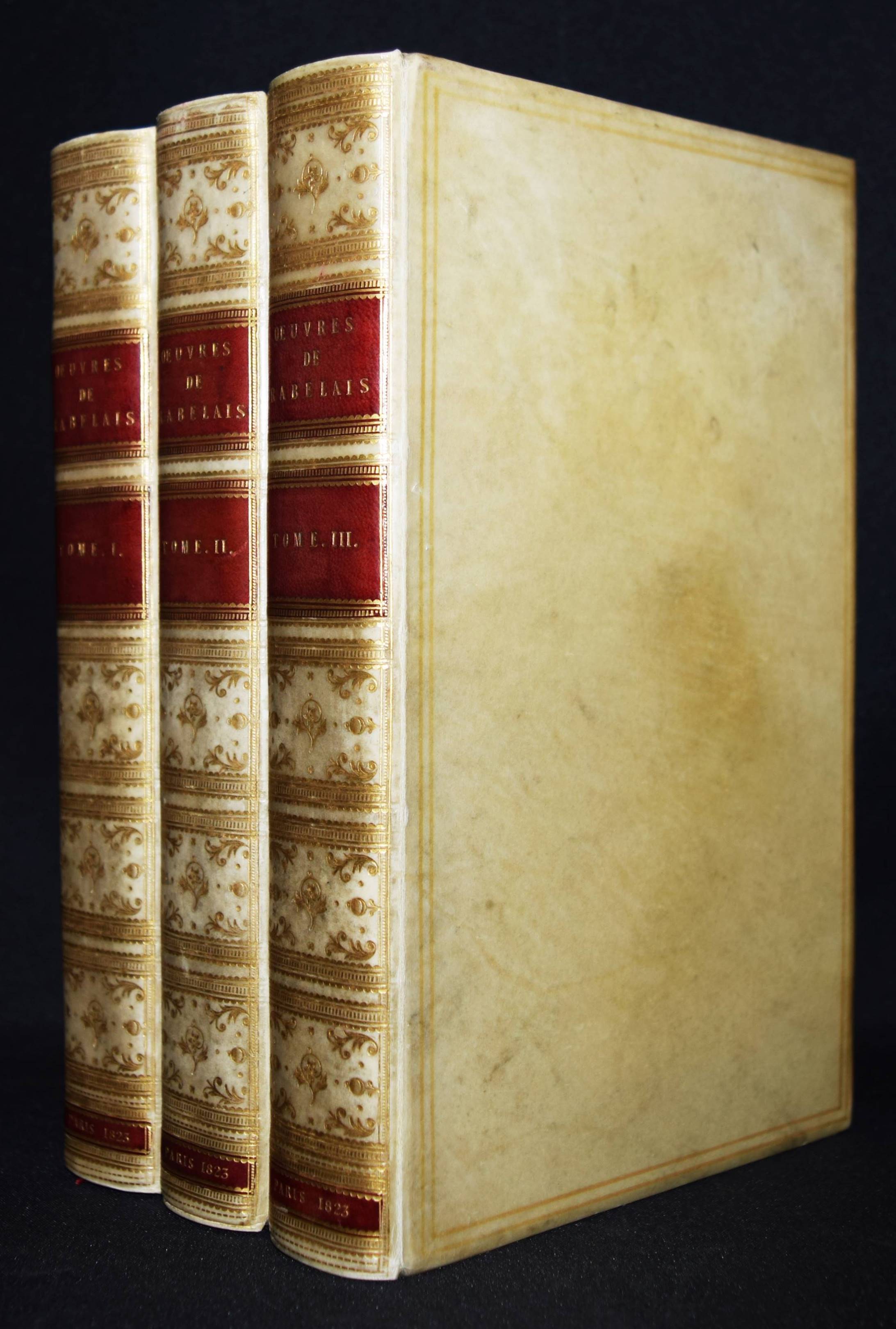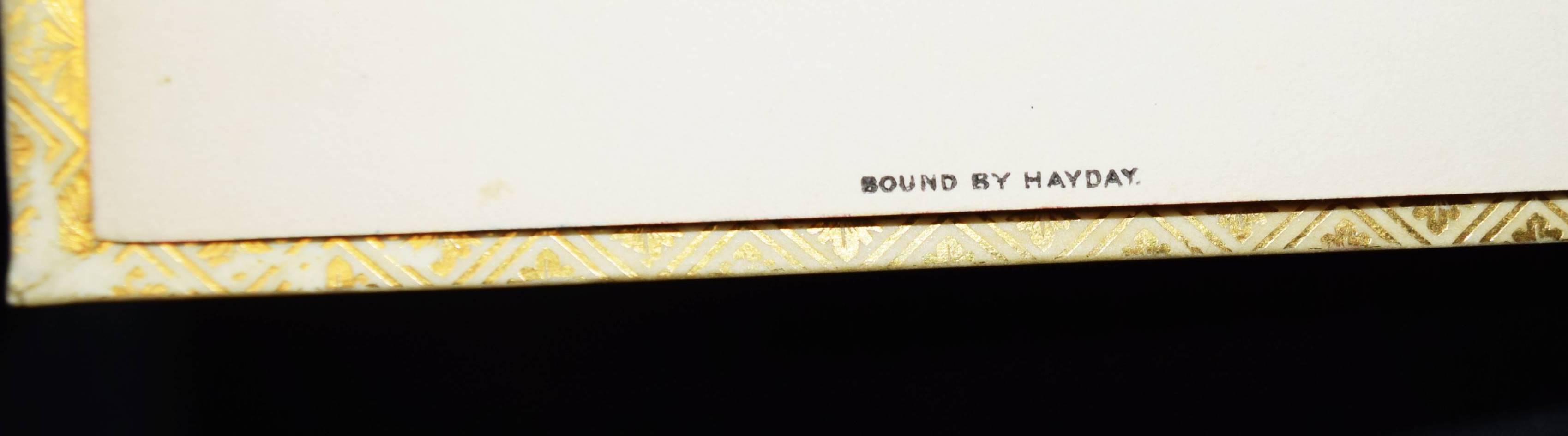 Einbände – Pergamenteinbände um 1850 mit jeweils 2 goldgepr. Rückenschildern, floraler Rückenvergoldung, goldgepr. Deckelfiletten, Innenkantenvergoldung und Goldschniitt (signiert (James) Hayday „white 24 Pall Mall“). Inhalt: Rabelais, (François). Oeuvres. 3 Bände. Paris, Louis Janet 1823. 8° (20 x 12,5 cm.). Titel, 615 S.; Titel, 580 S.; Titel, IX, 672 S. Prachtvolle Handeinbände des bedeutenden Londoner Buchbinders James Hayday (1796-1872). Hayday, Schüler des auf Pergamenteinbände spezialisierten Buchbinders Charles Marchant, eröffnete 1833 eine Buchbinder-Werkstatt in der Little Queen Street 31 in London. – „Works bound by Hayday became famous, and his name attached to a book raised its value twenty-five per cent. Edward Gardner of the Oxford Warehouse, 7 Paternoster Row, secured Hayday’s services for the Oxford books exclusively. William Pickering, bookseller, of 57 Chancery Lane, gave him the benefit of his long experience, and introduced him to many wealthy patrons. After entering into a brief partnership with Mr. Boyce, ‘a finisher,’ he again started on his own account at 31 Little Queen Street. Unable to compete with other and cheaper binders, he was adjudicated a bankrupt on 10 June 1861. He sold the use of his name to William Mansell, who succeeded to the bookbinding establishment. Retiring to St Leonards-on-Sea, Hayday died there on 19 March 1872, aged 76“ (Wikipedia). – Der Text stellenweise etwas braunfleckig, schönes Exemplar in prachtvollen Handeinbänden.
