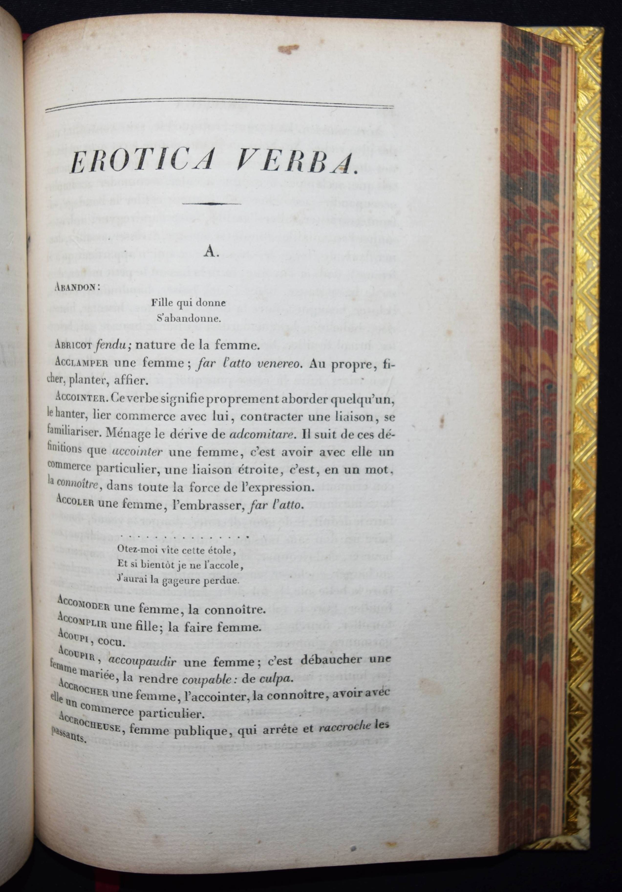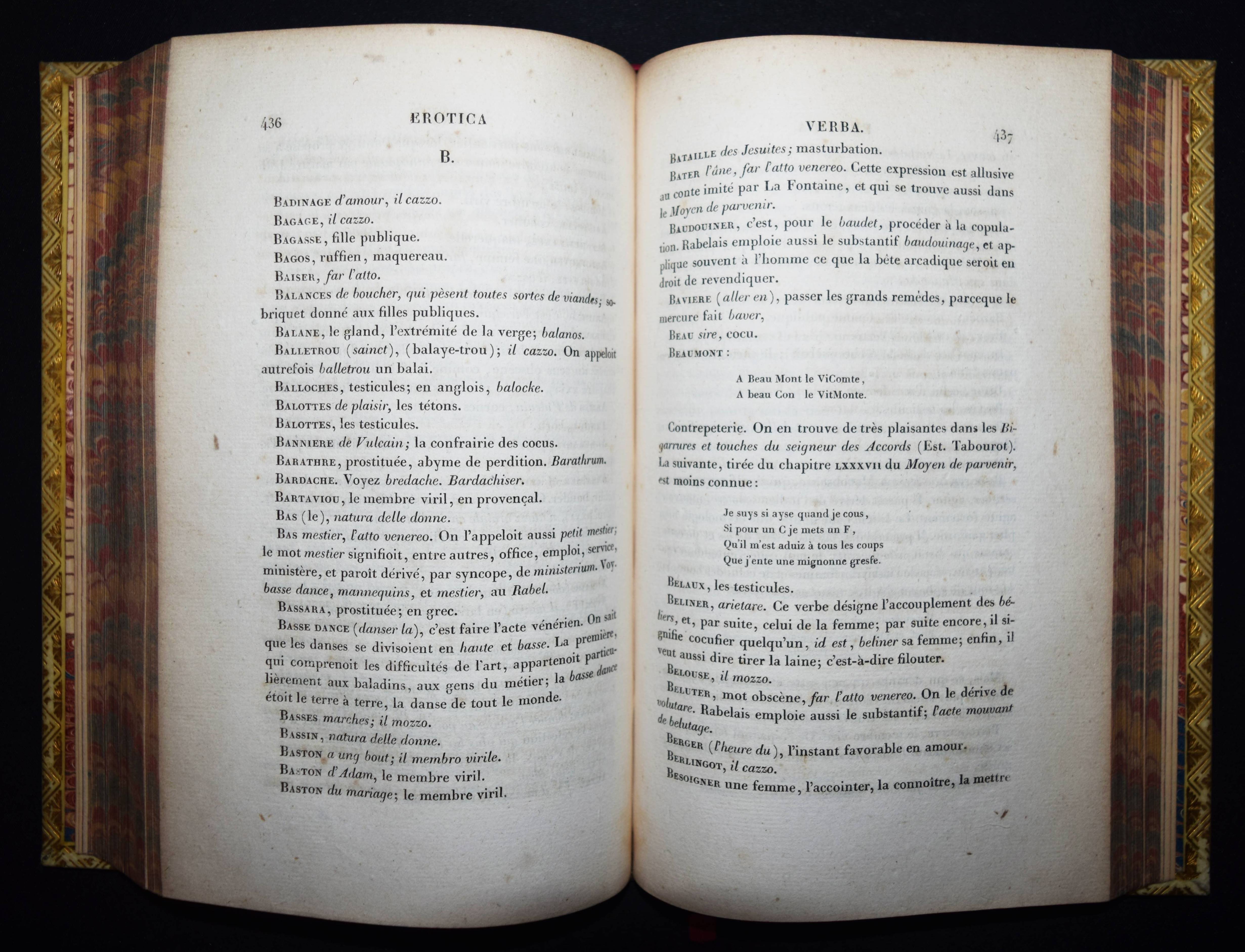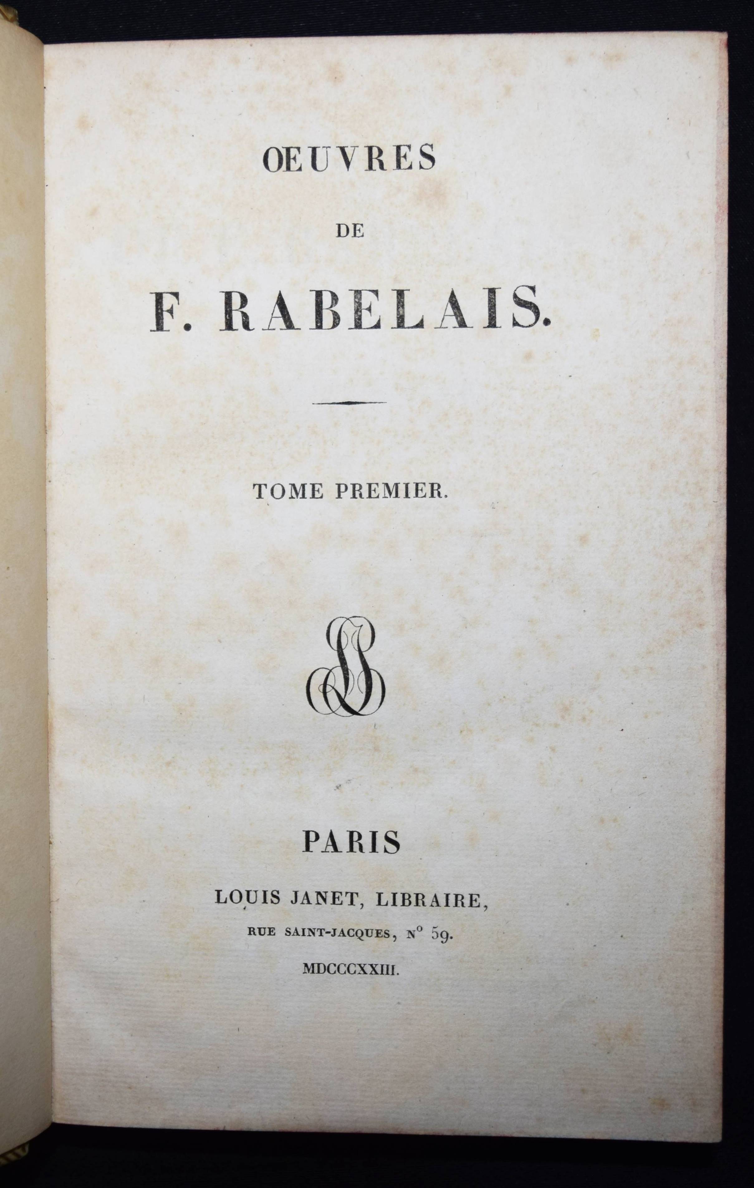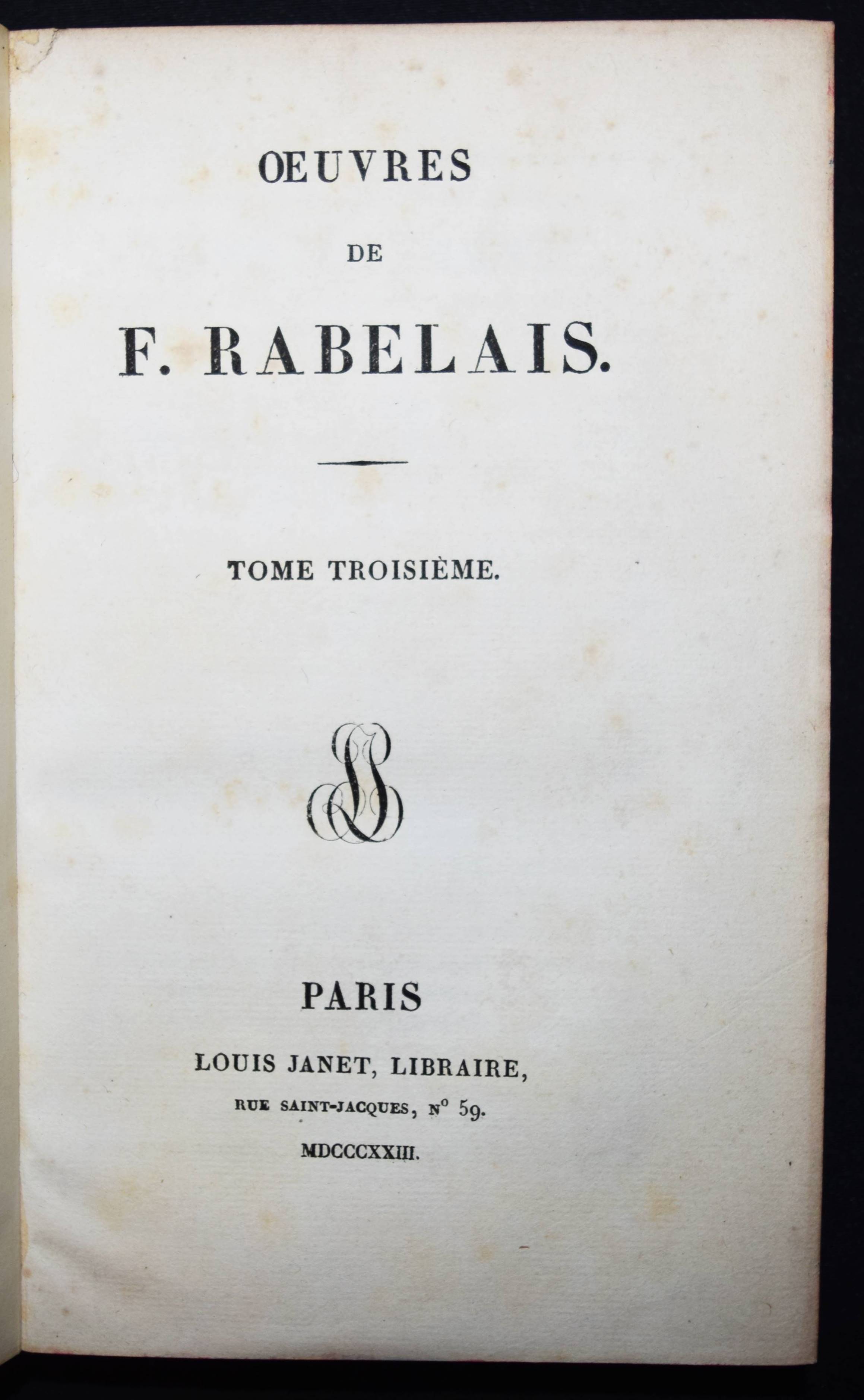 Einbände – Pergamenteinbände um 1850 mit jeweils 2 goldgepr. Rückenschildern, floraler Rückenvergoldung, goldgepr. Deckelfiletten, Innenkantenvergoldung und Goldschniitt (signiert (James) Hayday „white 24 Pall Mall“). Inhalt: Rabelais, (François). Oeuvres. 3 Bände. Paris, Louis Janet 1823. 8° (20 x 12,5 cm.). Titel, 615 S.; Titel, 580 S.; Titel, IX, 672 S. Prachtvolle Handeinbände des bedeutenden Londoner Buchbinders James Hayday (1796-1872). Hayday, Schüler des auf Pergamenteinbände spezialisierten Buchbinders Charles Marchant, eröffnete 1833 eine Buchbinder-Werkstatt in der Little Queen Street 31 in London. – „Works bound by Hayday became famous, and his name attached to a book raised its value twenty-five per cent. Edward Gardner of the Oxford Warehouse, 7 Paternoster Row, secured Hayday’s services for the Oxford books exclusively. William Pickering, bookseller, of 57 Chancery Lane, gave him the benefit of his long experience, and introduced him to many wealthy patrons. After entering into a brief partnership with Mr. Boyce, ‘a finisher,’ he again started on his own account at 31 Little Queen Street. Unable to compete with other and cheaper binders, he was adjudicated a bankrupt on 10 June 1861. He sold the use of his name to William Mansell, who succeeded to the bookbinding establishment. Retiring to St Leonards-on-Sea, Hayday died there on 19 March 1872, aged 76“ (Wikipedia). – Der Text stellenweise etwas braunfleckig, schönes Exemplar in prachtvollen Handeinbänden.