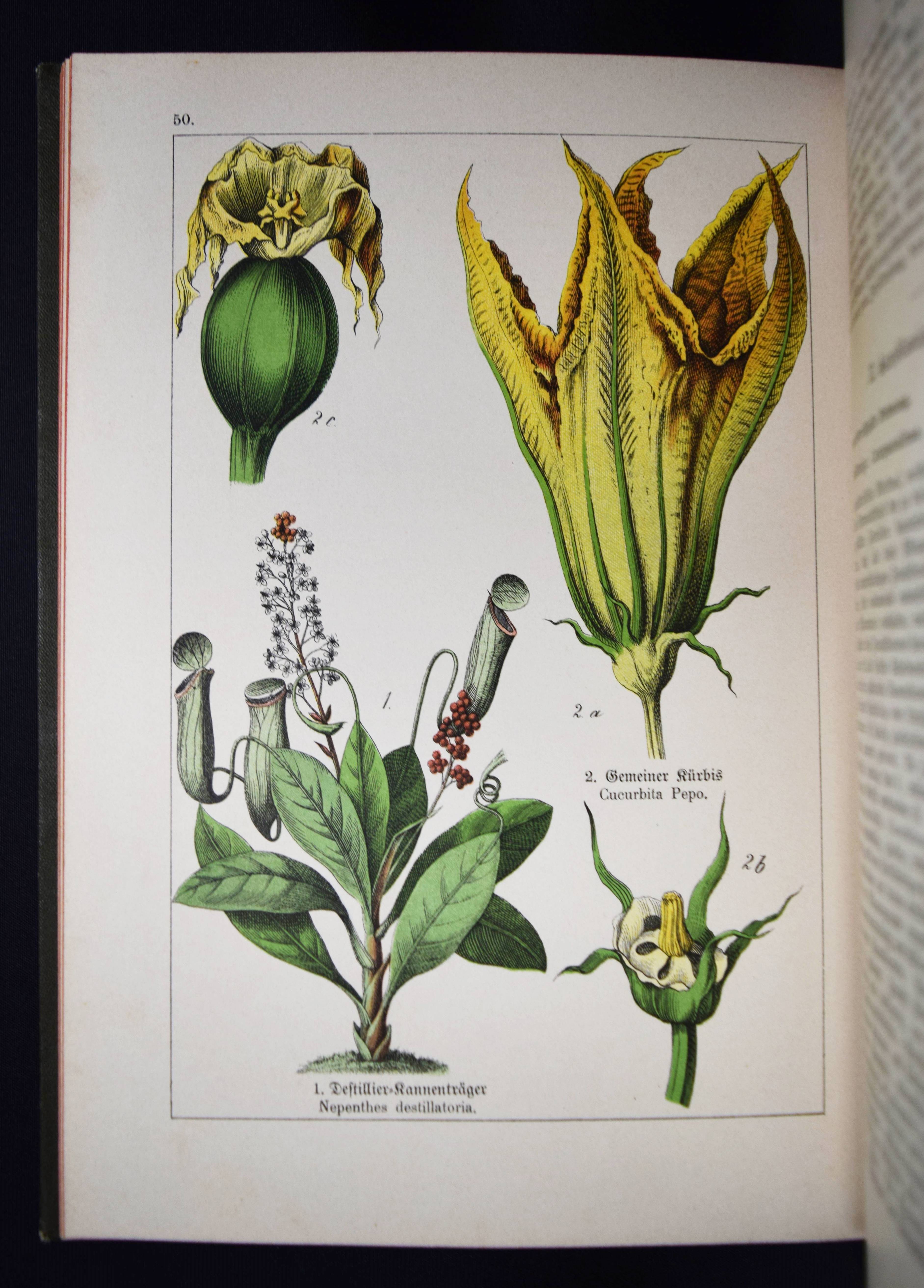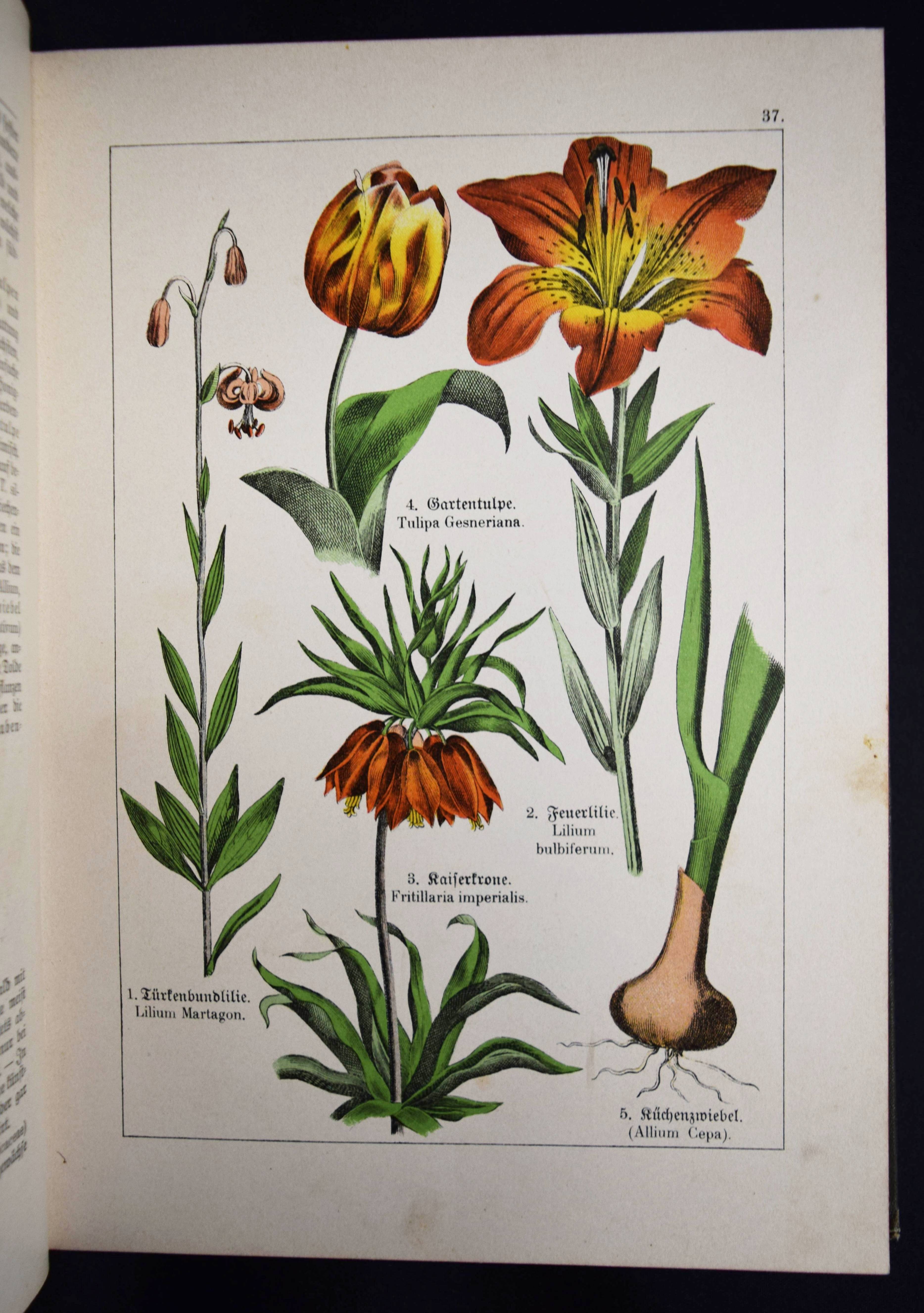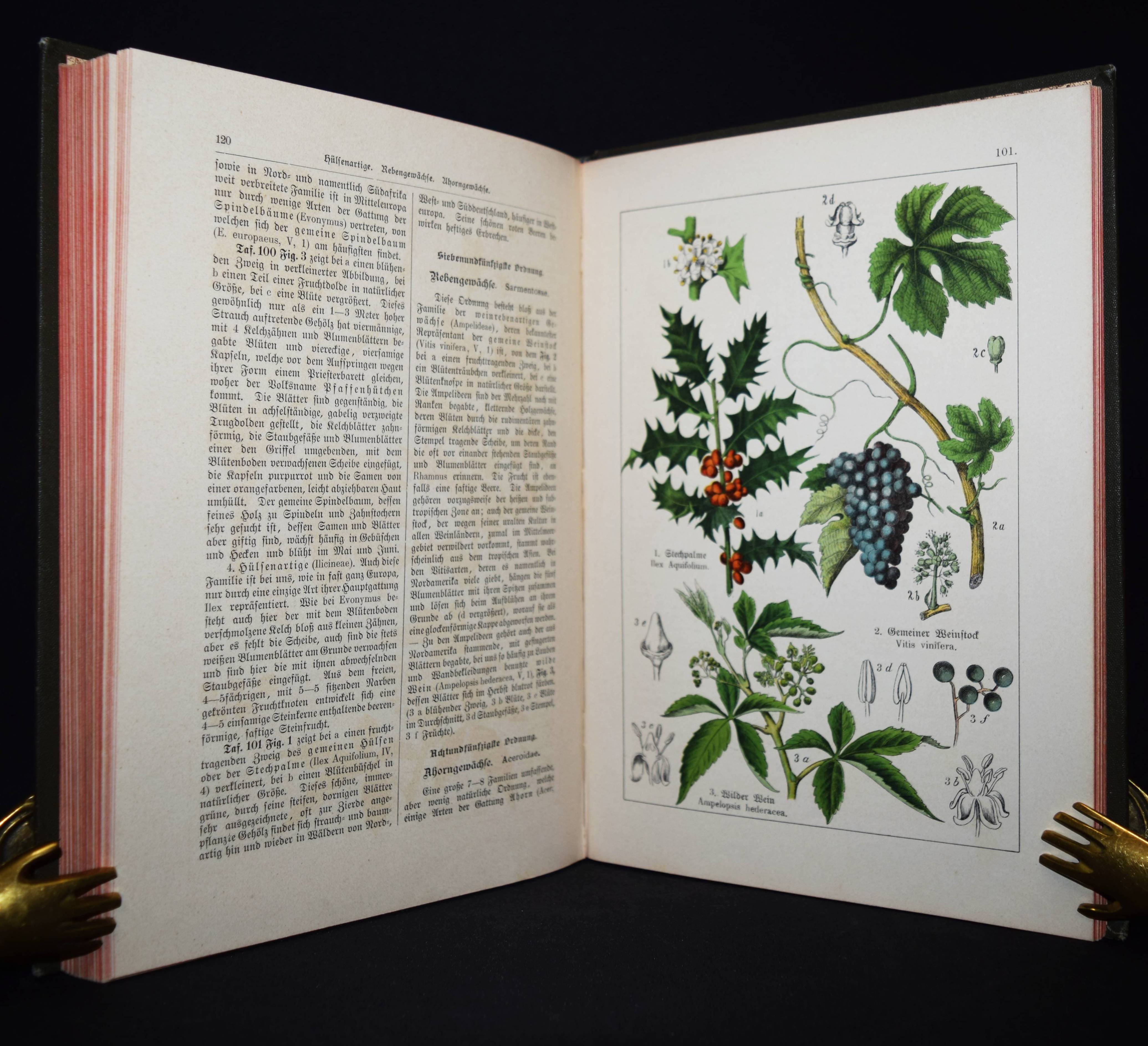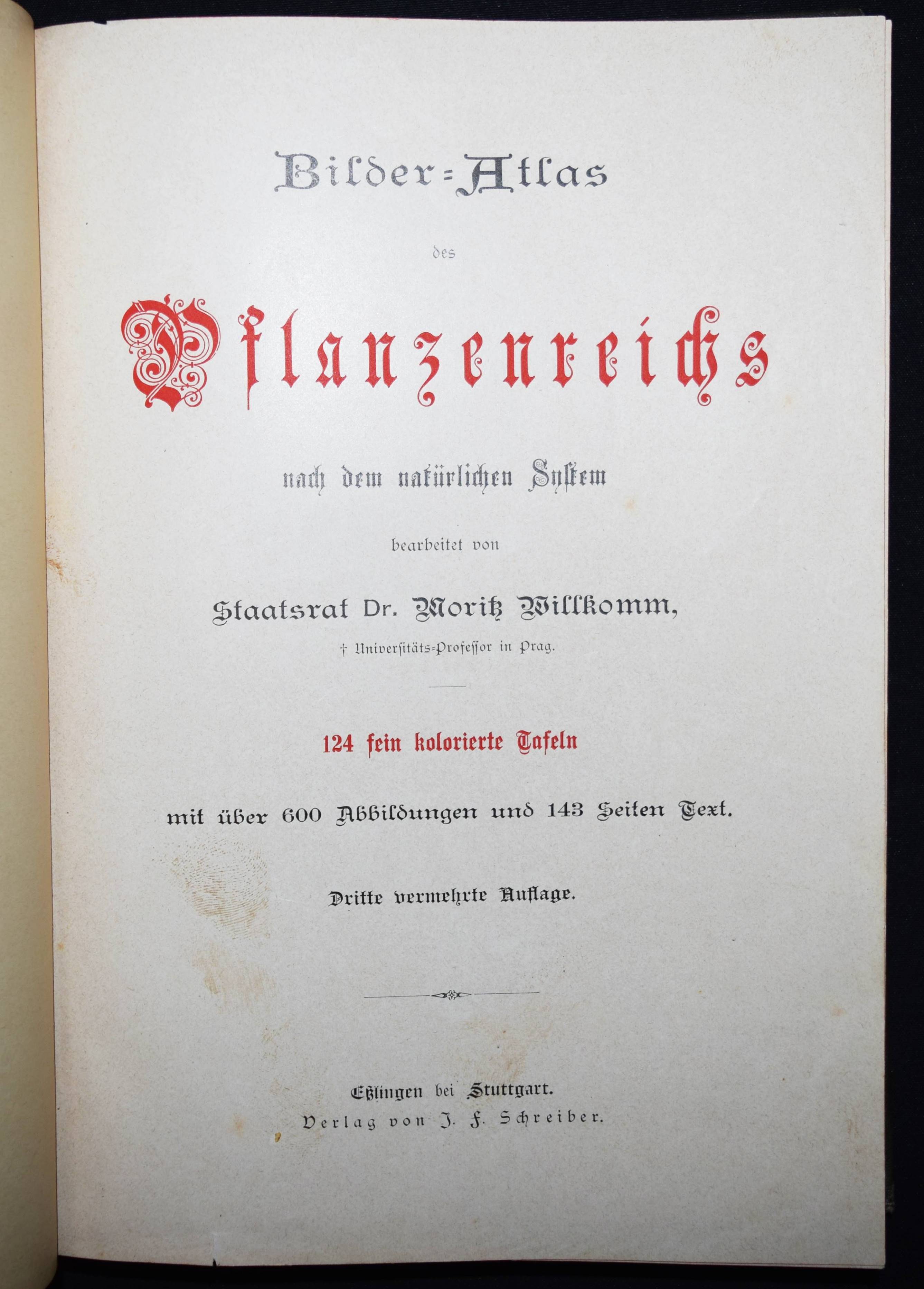 Willkomm, Moritz. Bilder-Atlas des Pflanzenreichs. Nach dem natürlichen System bearbeitet. 3. vermehrte Auflage. Esslingen, J. F. Schreiber (1895). Gr.-8°. X, 143, (1), XVI S. mit 124 chromolithogr. Tafeln und über 600 Abb. Orig.-Leinenband mit farblithogr. Deckelbild. Nicht bei Nissen. – Schönes Exemplar.