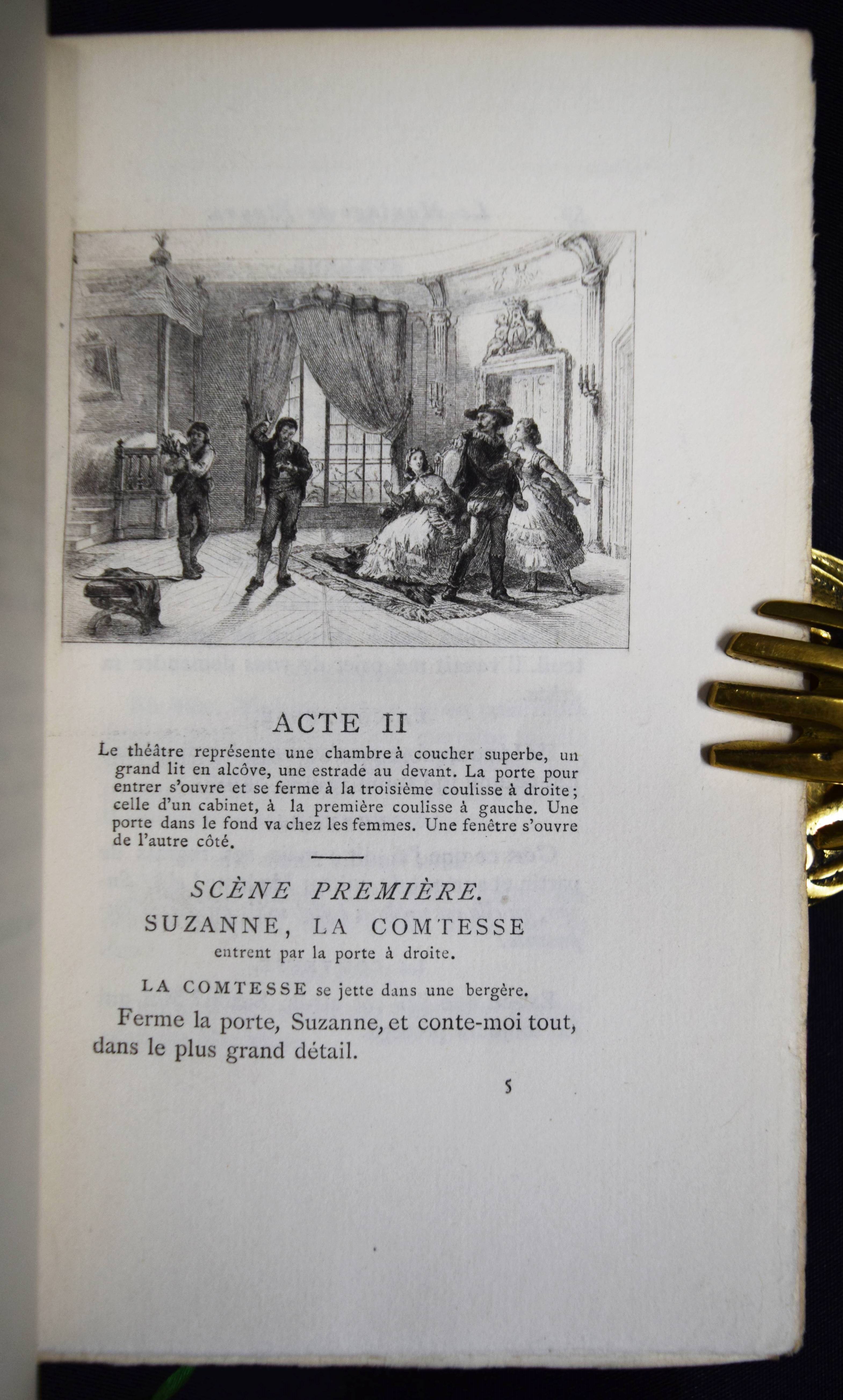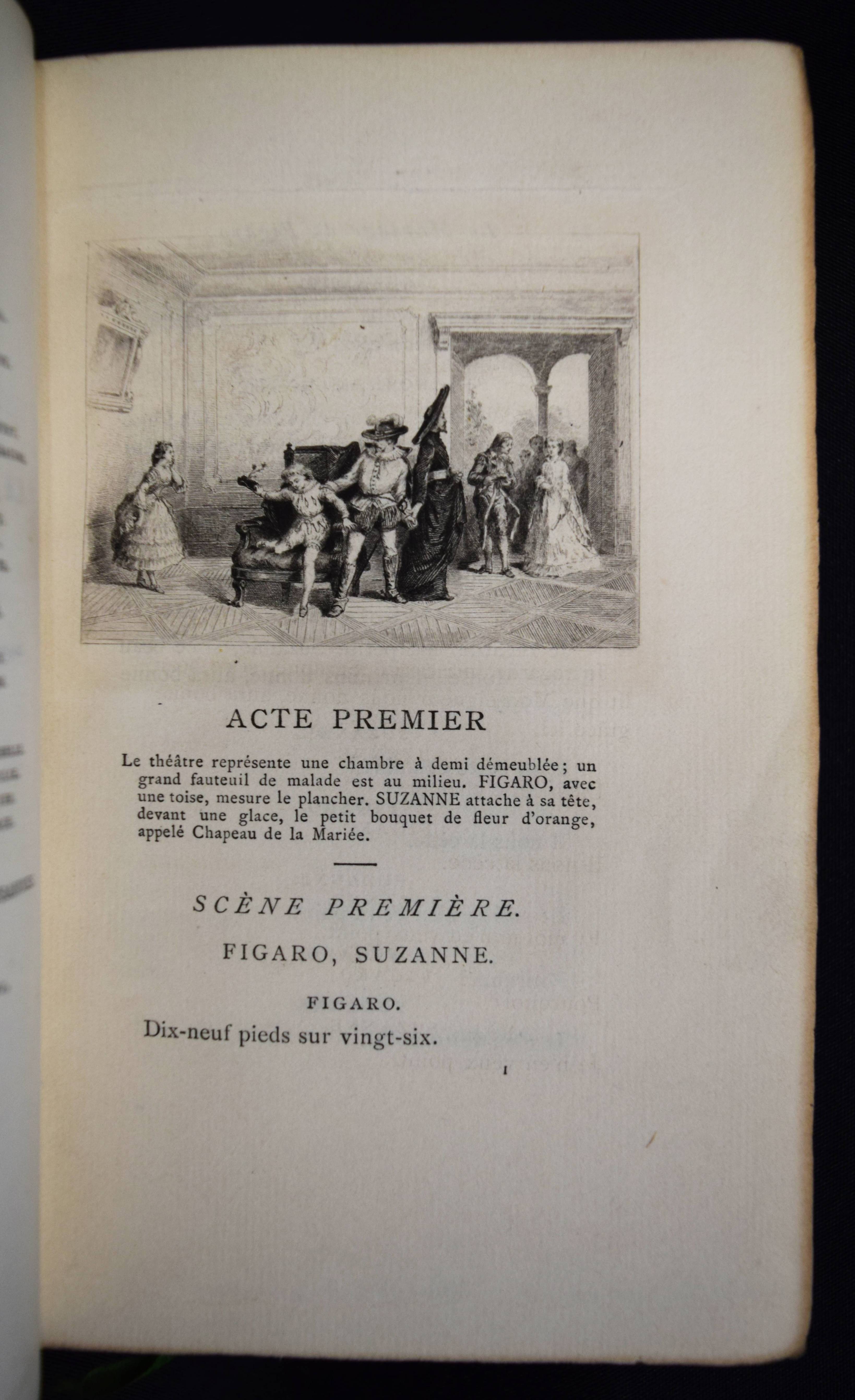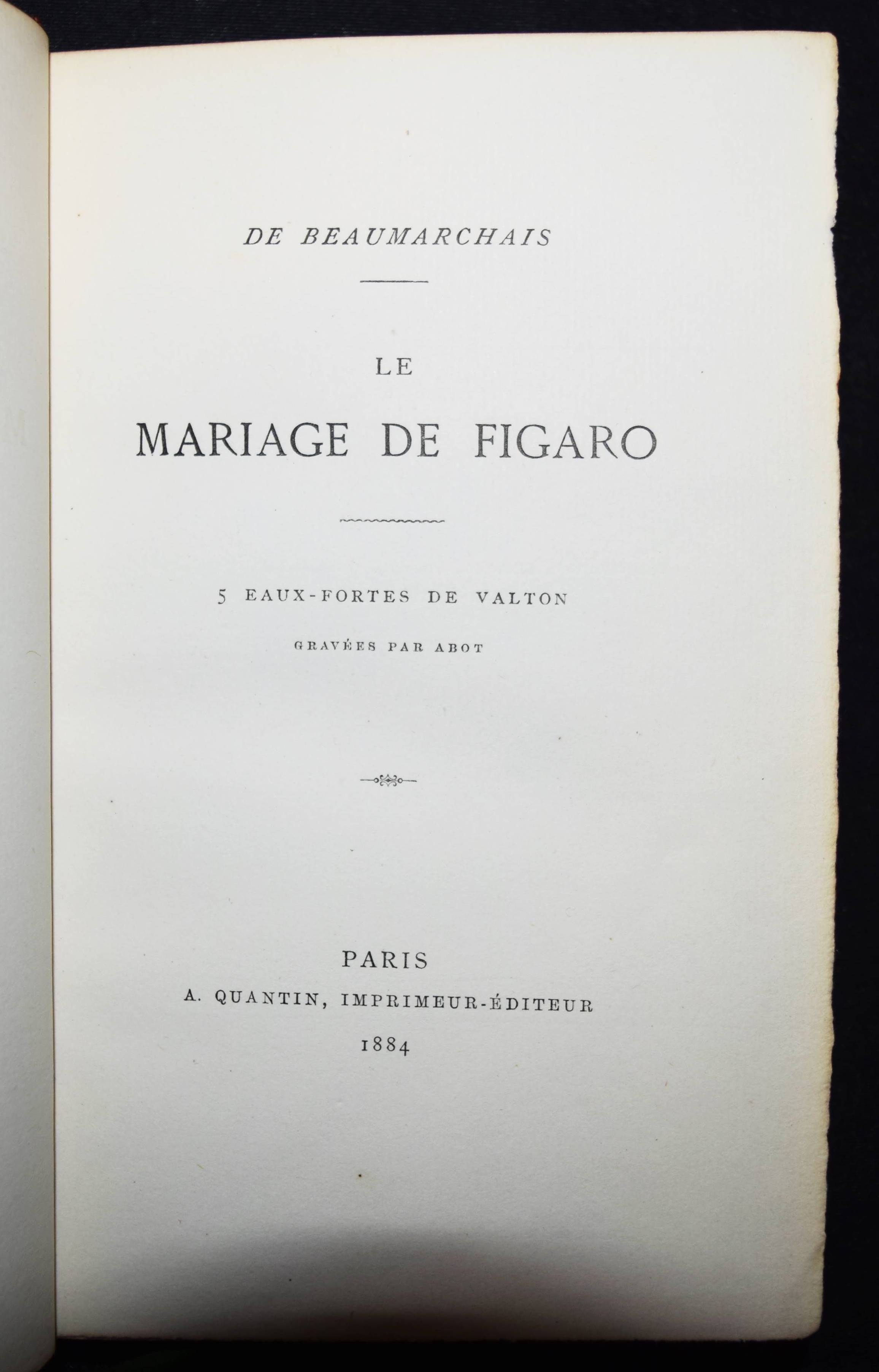 Beaumarchais, (Pierr-Augustin Caron) de. Le Mariage de Figaro. 5 Eaux-Fortes de (Edmond Eugène) Valton gravées par Abot. Paris, A. Quantin o. J. (1884). 8°. [3] Bl., 255 S. mit 5 Radierungen. Weinroter Halbmaroquin-Lederband der Zeit mit goldgepr. Rückentitel, reicher Rückenvergoldung, Deckelfiletten und Kopfgoldschnitt. Erste Ausgabe mit diesen Illustrationen. – Der franz. Maler E.-E. Valton (1836-1910), Schüler von Célestin Nanteuil (1813–1873), Paul Delaroche (1797–1856), Merry-Joseph Blondel (1781–1853) David d’Angers (1788–1856) und Thomas Couture (1815–1879), war einer der Gründer der Société des Artistes Indépendants und 1904 bis 1909 deren Präsident. – Das Lustspiel, durch das ital. Libretto von L. Da Ponte zur Mozarts Oper weltberühmt, wurde zuerst im September 1783 auf Schloß Vaudreuil und dann im April 1784 in der Comédie Francaise aufgeführt. Ein „Stück, dessen Aufführung in mehrjährigem Kampf gegen die königliche Zensur durchgesetzt werden mußte und das schließlich einen in der Geschichte der berühmten Pariser Bühne nahezu beispiellosen, skandalumwitterten Erfolg erzielte“ (KLL). – Sehr schönes dekorativ gebundenes Exemplar.