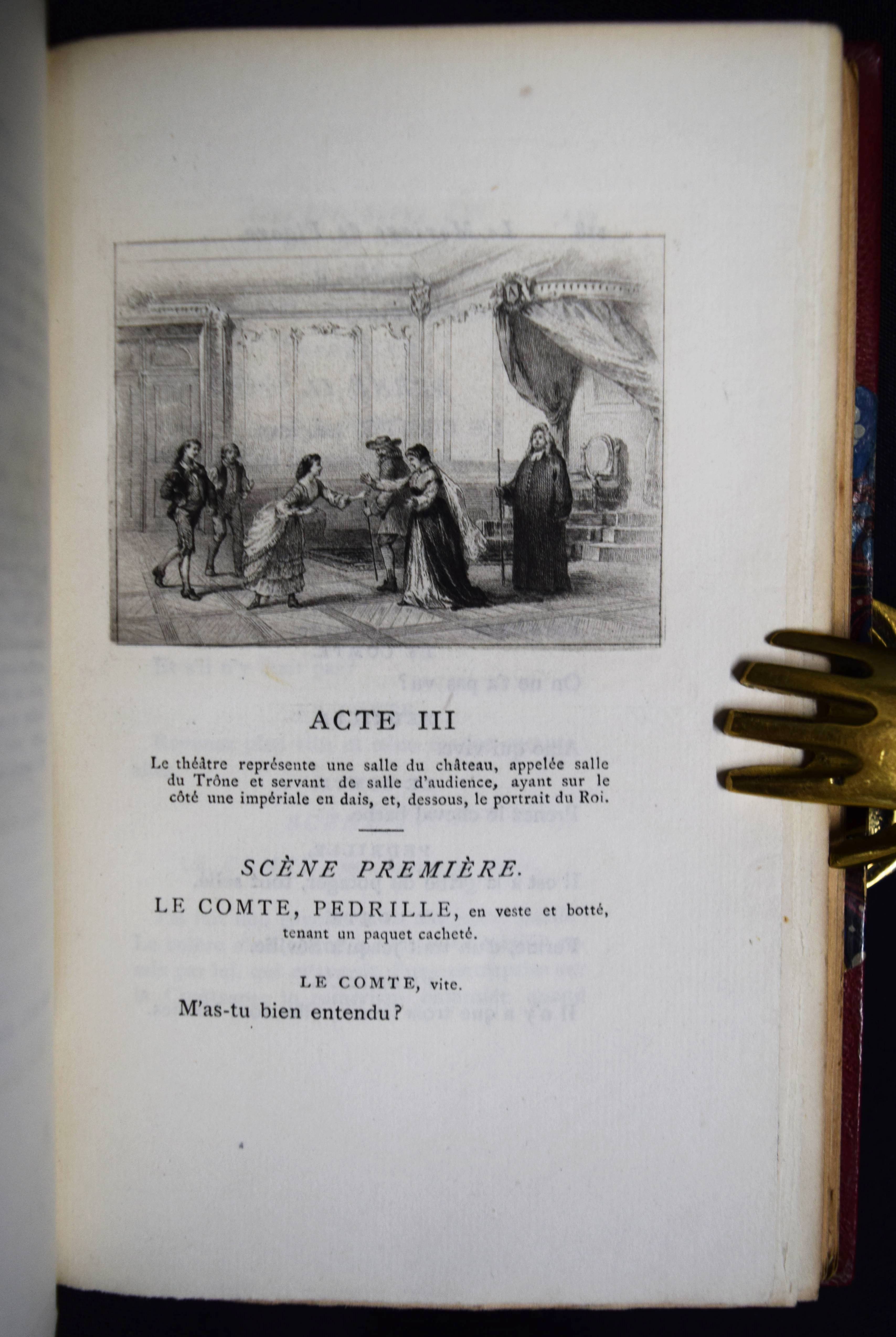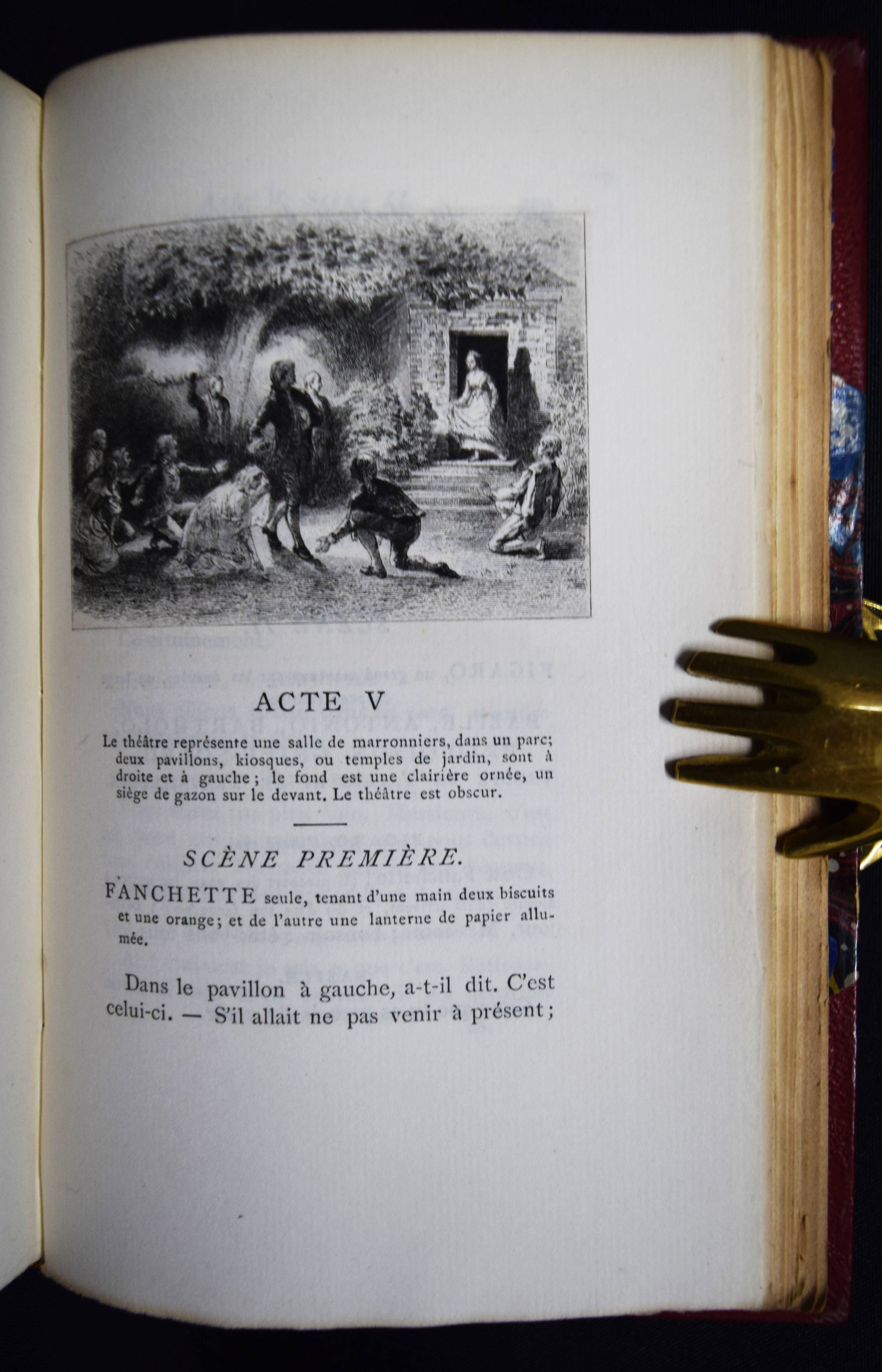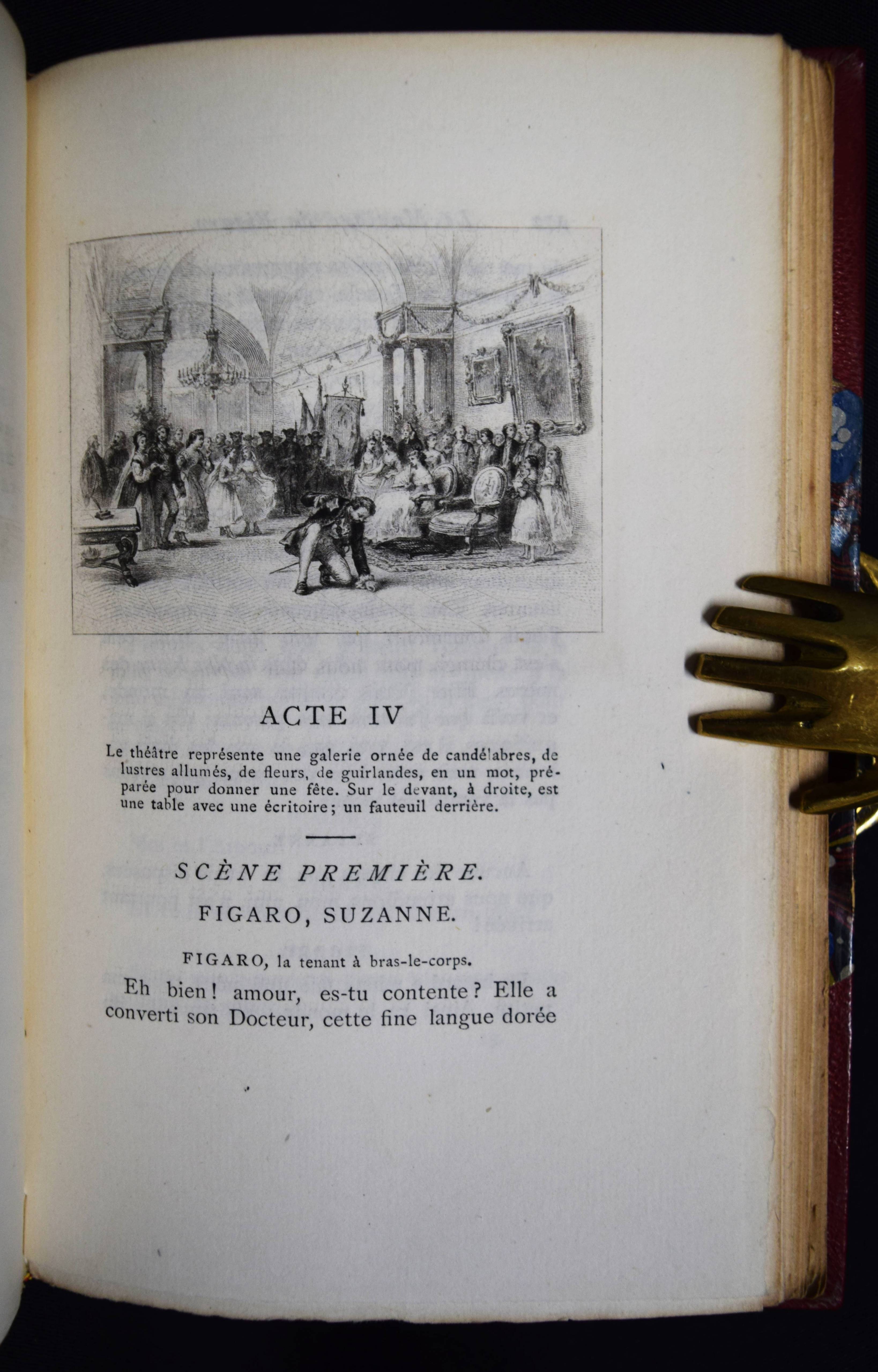 Beaumarchais, (Pierr-Augustin Caron) de. Le Mariage de Figaro. 5 Eaux-Fortes de (Edmond Eugène) Valton gravées par Abot. Paris, A. Quantin o. J. (1884). 8°. [3] Bl., 255 S. mit 5 Radierungen. Weinroter Halbmaroquin-Lederband der Zeit mit goldgepr. Rückentitel, reicher Rückenvergoldung, Deckelfiletten und Kopfgoldschnitt. Erste Ausgabe mit diesen Illustrationen. – Der franz. Maler E.-E. Valton (1836-1910), Schüler von Célestin Nanteuil (1813–1873), Paul Delaroche (1797–1856), Merry-Joseph Blondel (1781–1853) David d’Angers (1788–1856) und Thomas Couture (1815–1879), war einer der Gründer der Société des Artistes Indépendants und 1904 bis 1909 deren Präsident. – Das Lustspiel, durch das ital. Libretto von L. Da Ponte zur Mozarts Oper weltberühmt, wurde zuerst im September 1783 auf Schloß Vaudreuil und dann im April 1784 in der Comédie Francaise aufgeführt. Ein „Stück, dessen Aufführung in mehrjährigem Kampf gegen die königliche Zensur durchgesetzt werden mußte und das schließlich einen in der Geschichte der berühmten Pariser Bühne nahezu beispiellosen, skandalumwitterten Erfolg erzielte“ (KLL). – Sehr schönes dekorativ gebundenes Exemplar.