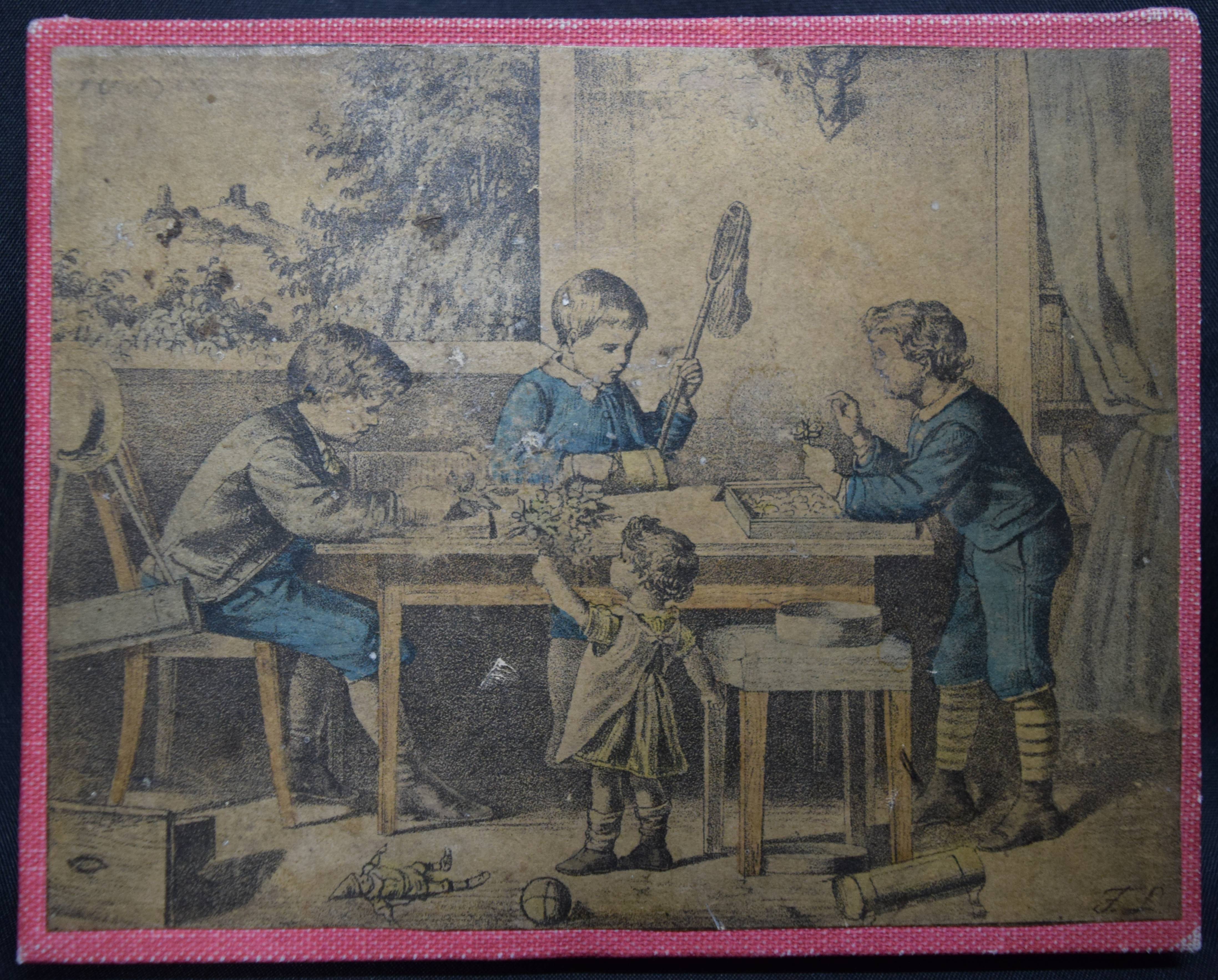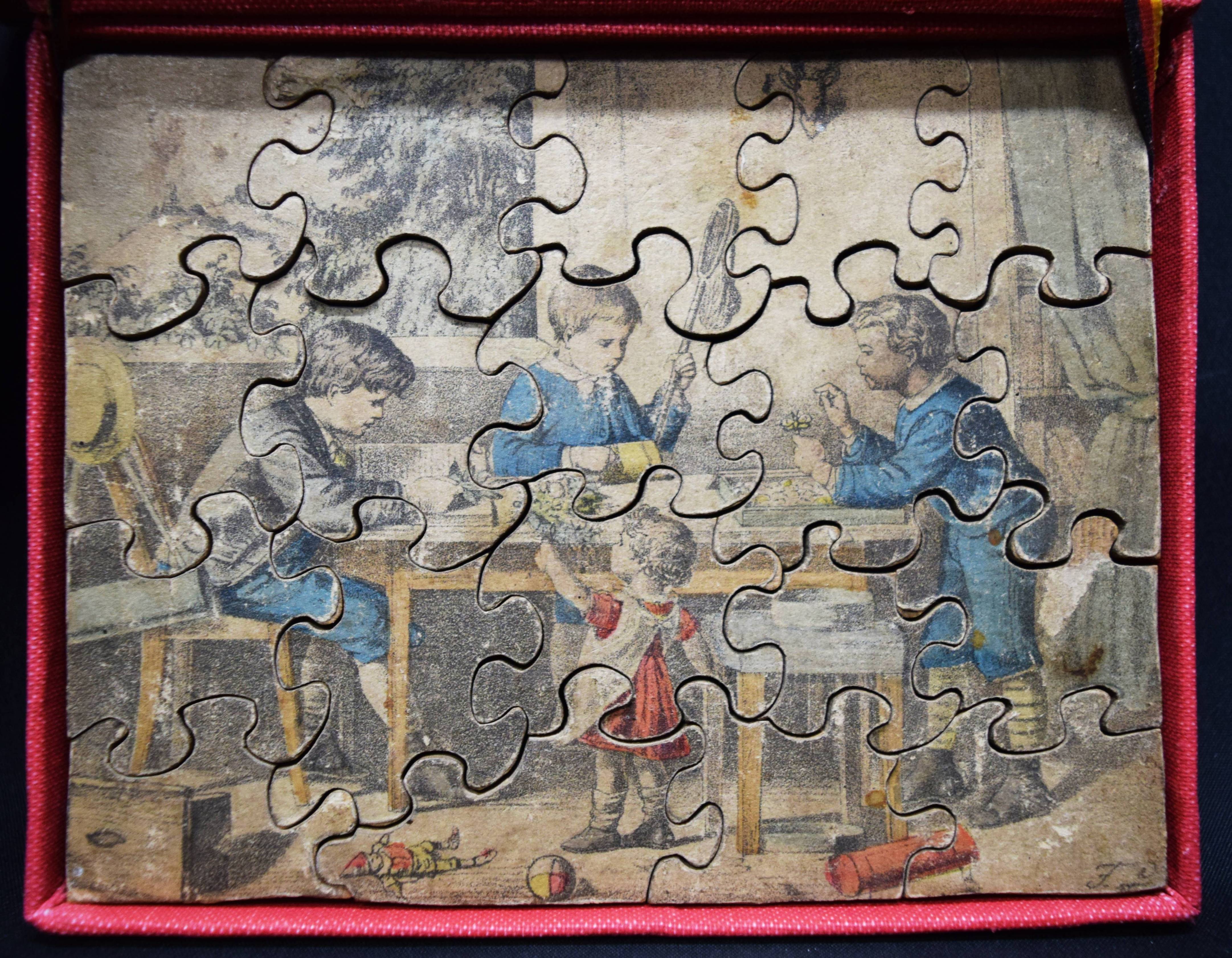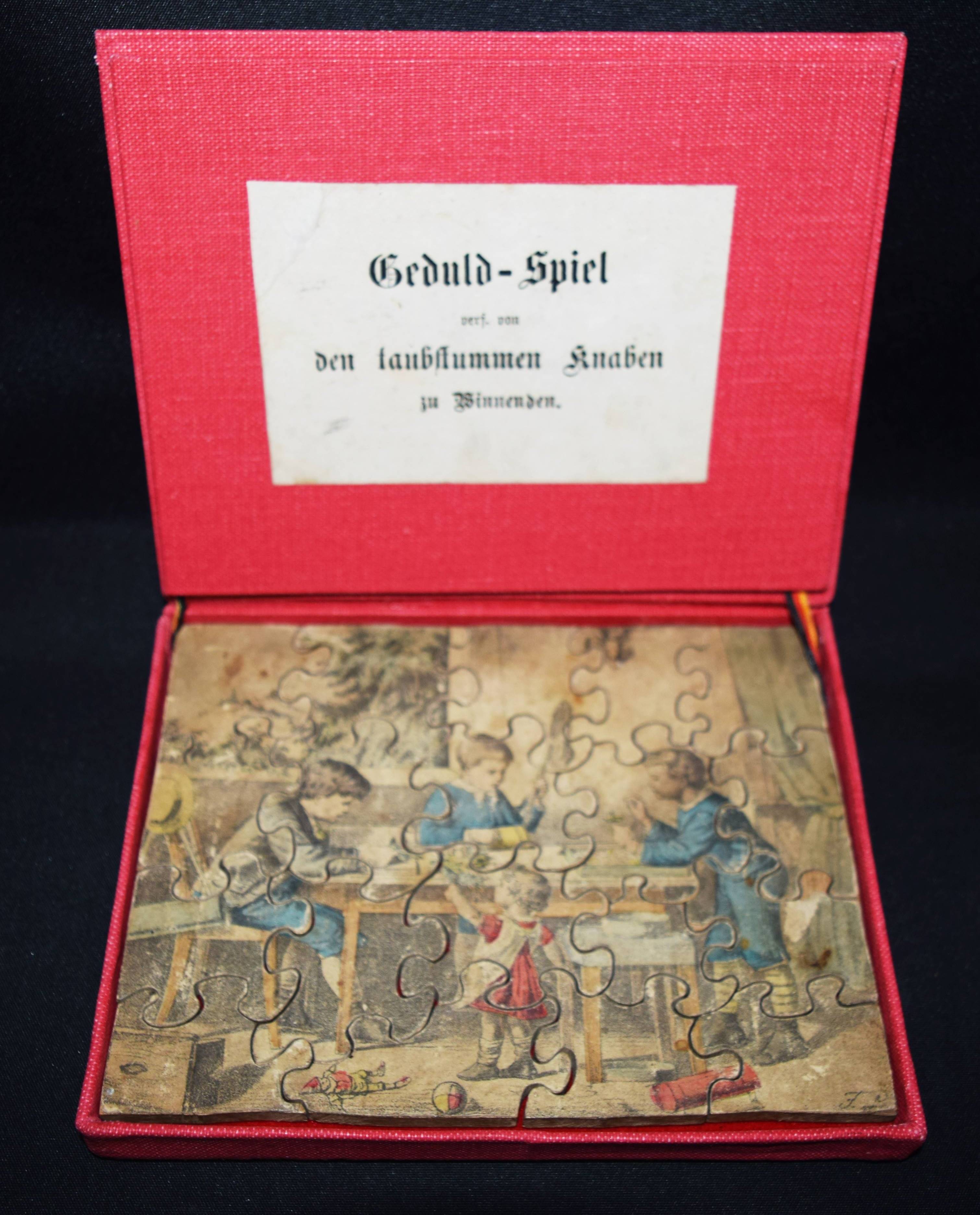 | Spiele – L(ipps), F(riedrich). Geduld-Spiel verf(ertigt) von den taubstummen Knaben zu Winnenden. Winnenden o. J. (um 1875). 14 x 17 cm. Farblithographie (12,5 x 16,3 cm.) auf Holz, als Puzzle-Spiel ausgesägt (19 Teile). Moderne Leinen-Kassette mit farblithogr. Deckelbild. Vgl. Bekkering, Spaß und Geduld. Zur Geschichte des Puzzlespiels in Deutschland S. 32 ff. – Dargestellt sind vier Kinder beim Spielen an einem Tisch. – „Gegen Ende des 19. Jh. sind spielende Kinder am häufigsten auf Puzzlespielen abgebildet“ (Geert Bekkering). – F. Lipps (biogr. Daten unbekannt) arbeitete von 1875 bis zur Jahrhundertwende für verschiedene Stuttgarter Kinderbuchverlage. – Die Lithographien etwas gebräunt.