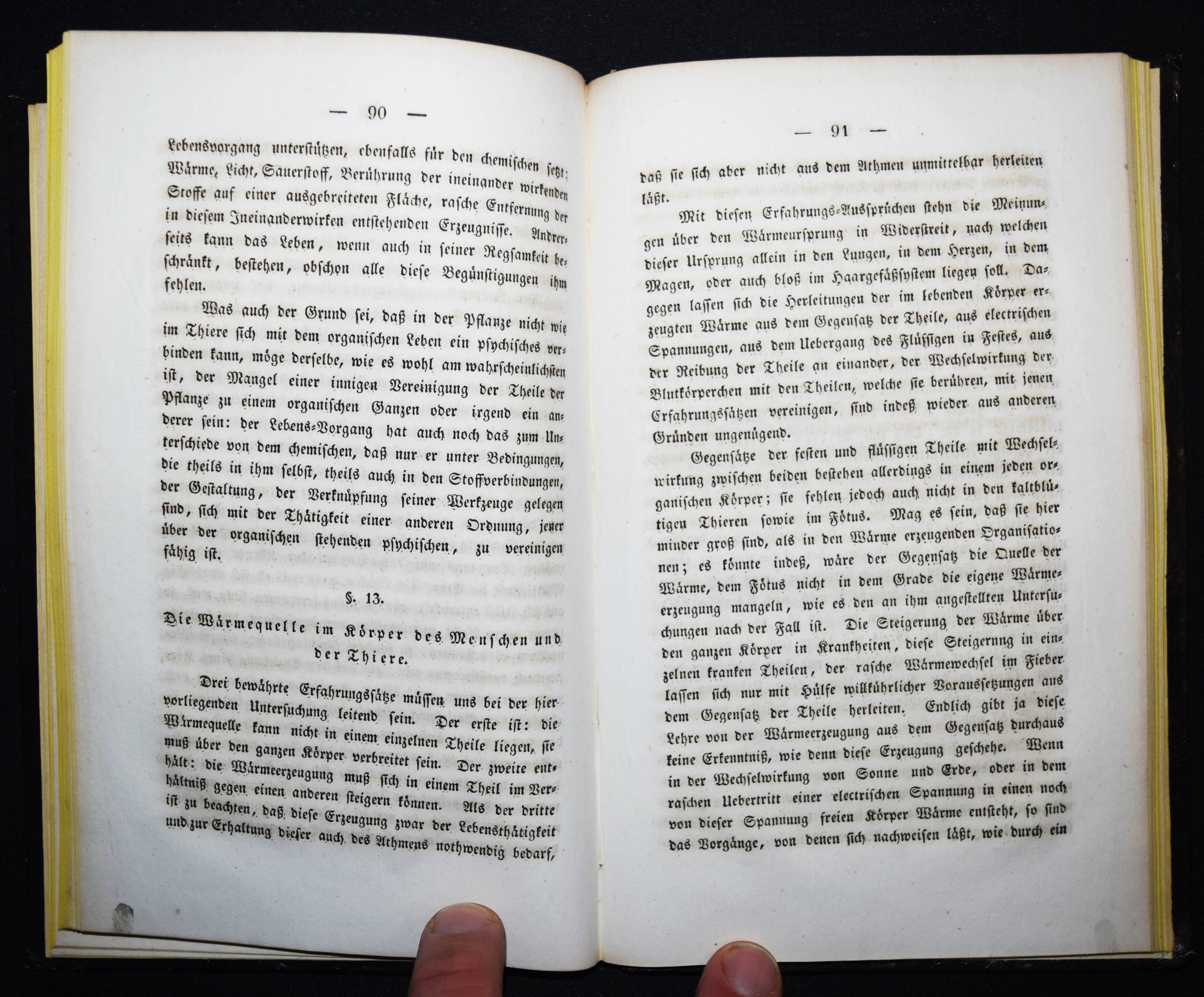 Nasse, (Christian) Fr(iedrich). Verbrennung und Athmen, chemische Thätigkeit und organisches Leben. Bonn, Eduard Weber 1846. 8°. VI, 154 S. Pappband der Zeit mit ornamentverziertem Lackpapier. Hirsch/Hüb. IV, 325. NDB XVIII, 741 f. – Erste Ausgabe. – Der Internist und Psychiater C. F. Nasse (1778-1851) „gilt als erster deutscher Kliniker, der die physiologische Diagnostik am Krankenbett ausgeübt und in die Vorlesungen eingebracht hat. Das Lehren am Krankenbett, die sorgfältige Beobachtung seiner Patienten wie auch das Eingehen auf deren Lebensumstände wurde bald schon als „Nasse-Schulung“ gerühmt. … Neben einer physiologischen Grundlegung der Heilkunde und einer Ausweitung der Therapeutik auf alle Bereiche der Praxis strebte N. die Grundlegung einer medizinischen Anthropologie an, die er „die Lehre von dem ganzen Sein und Leben des Menschen“ nannte. Als Spezialist auf vielen Gebieten habe der „anthropologische Arzt“ ein „Zeuge der großen und kleinen Szenen des Lebens“ zu sein. Bereits 1819 hatte N. für Bonn eine „Klinik für psychiatrische Krankheiten“ mit einem eigenen „Psychiatrischen Klinikum“ gefordert; für seine Studenten richtete er das „Siegburger Hauspraktikum“ in der 1825 von Jacobi übernommenen Siegburger Anstalt ein“ (H. Schipperges in NDB). – Zeitgenöss. Besitzvermerk und Stempel auf dem Vorsatz, sehr gutes Exemplar.