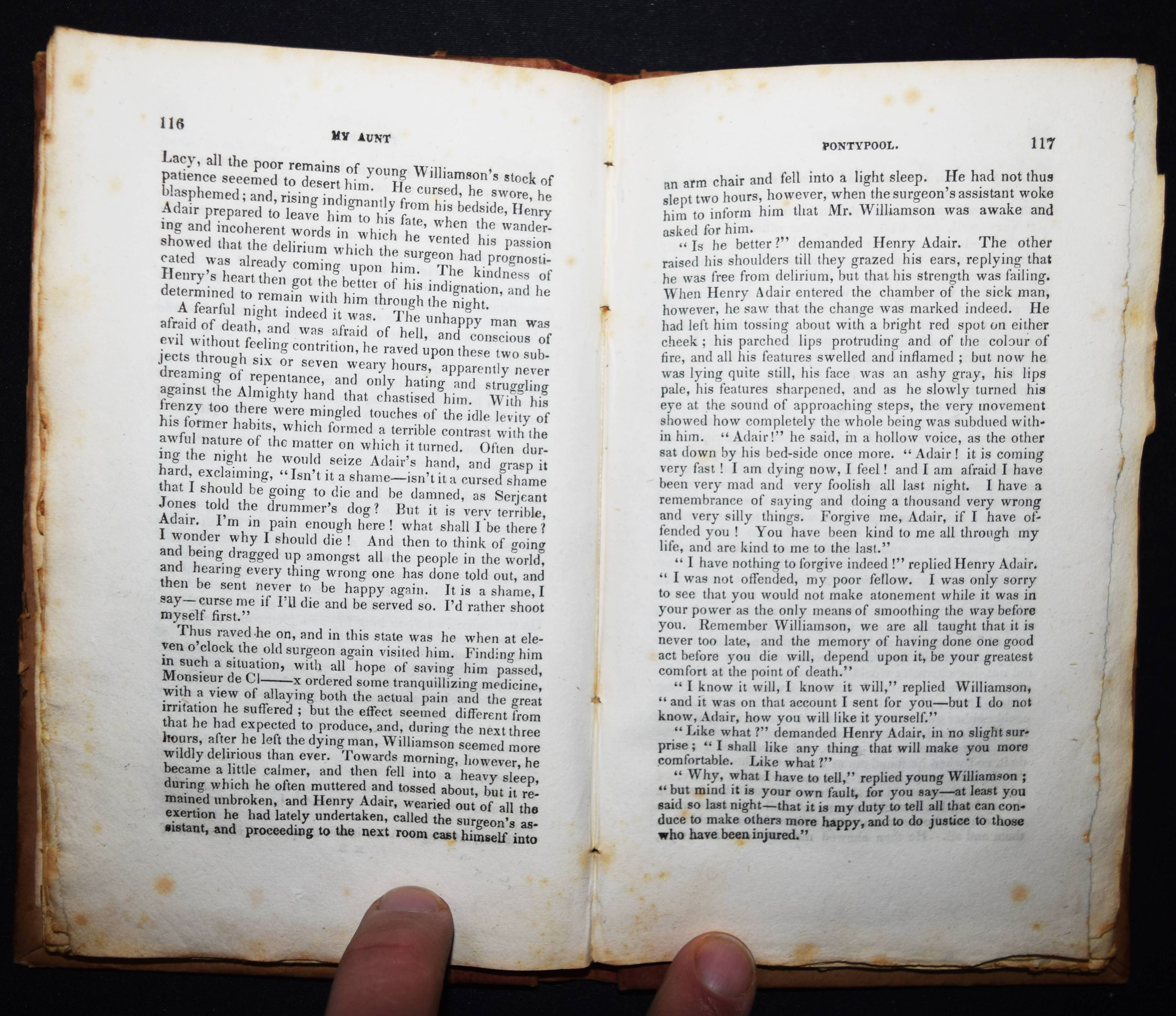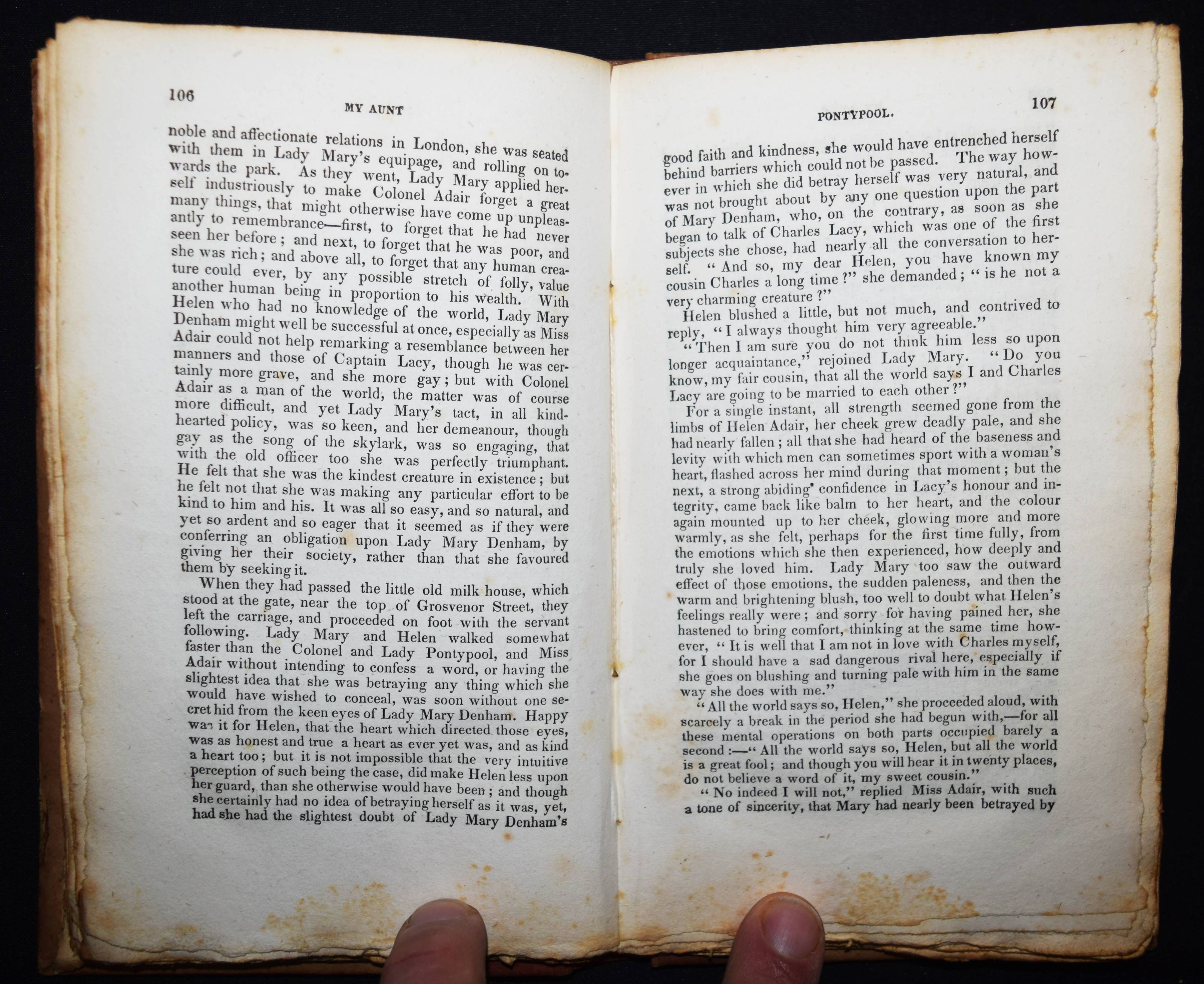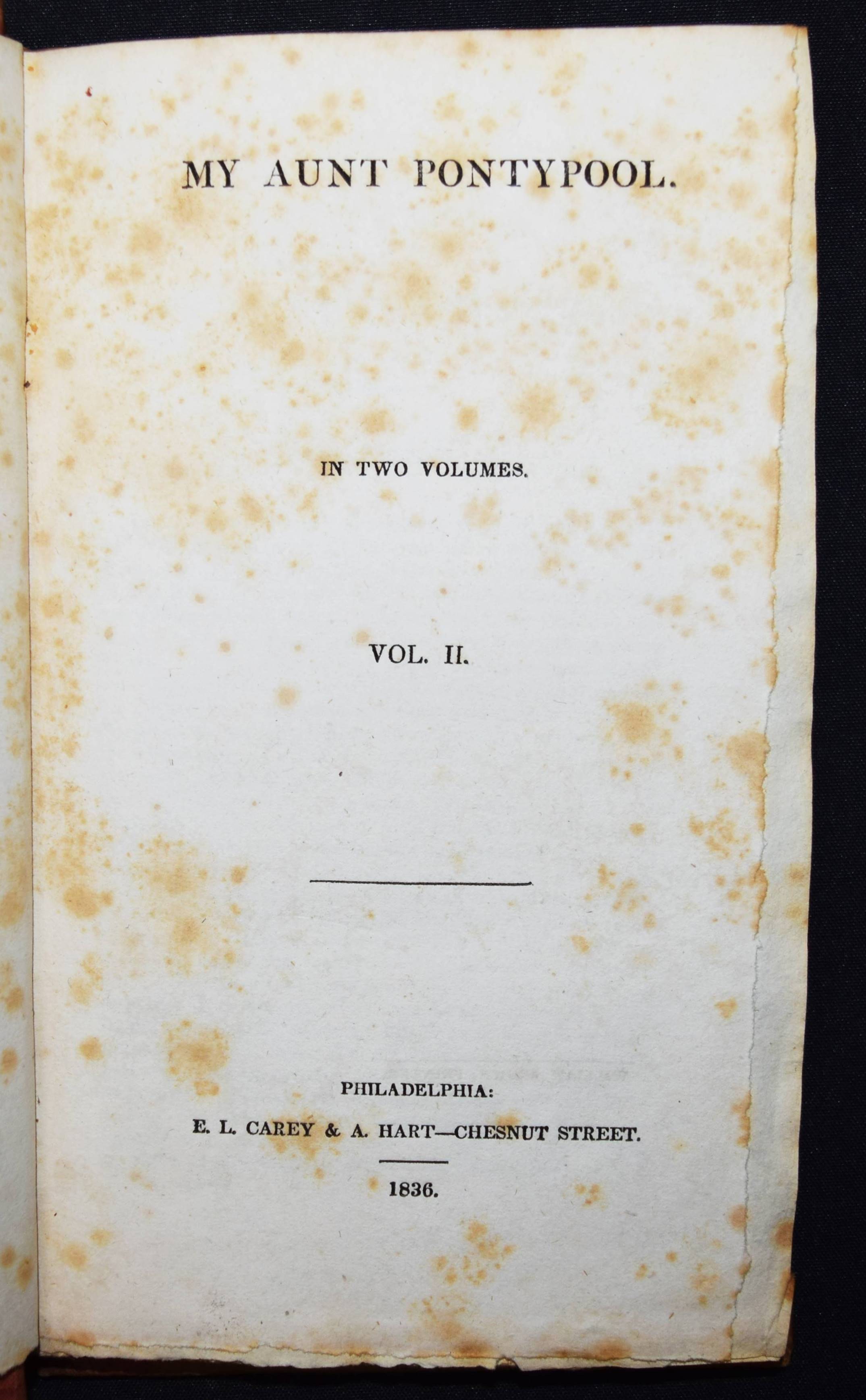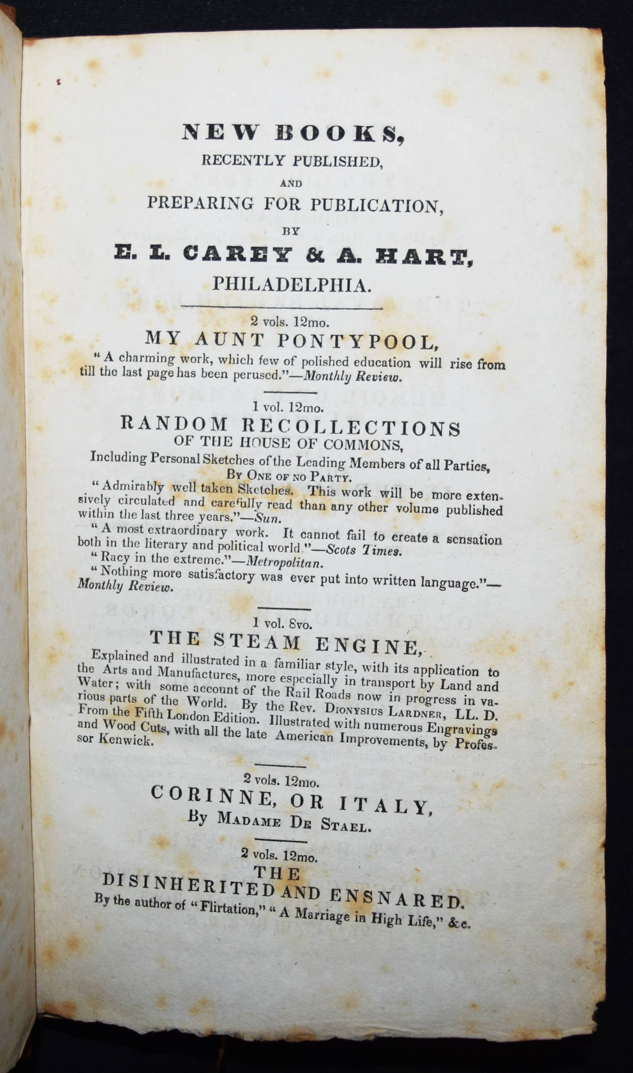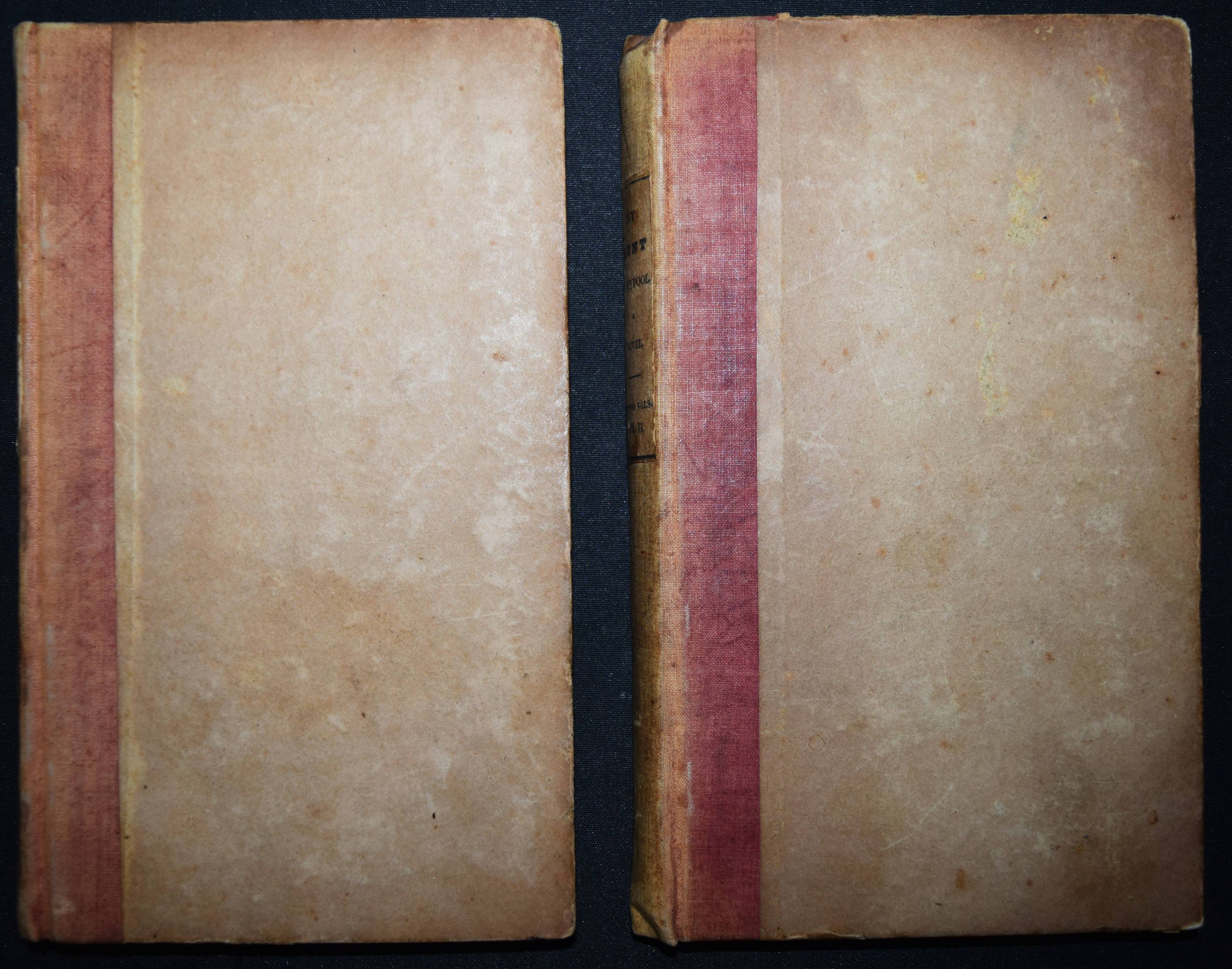 (James, George Payne Rainsford). My aunt Pontypool. 3 Teile in 2 Bänden. Philadelphia, E. L. Carey & A. Hart 1836. 8°. 4, 207 S.; 206 S. Orig.-Halbleinenbände mit Rückenschildern. Erste amerikanische Ausgabe; die erste Ausgabe erschien 1835 in London bei Saunders and Otley. – „George Payne Rainsford James was born in Hanover Square in London on August 9, 1799. His father was an American Revolutionary war veteran and physician, and his mother died when he was a young child. At a young age, James learned several Eastern and Western languages, among them, Persian, French, Italian, and German, (although he failed to master Arabic). At age thirteen, however, he told his father he had decided not to obtain a university education and requested permission to join the navy, to which his father replied: „You may go into the army if you’d like; it’s the life of a dog, but the navy is a life of a damned dog, and you shan’t try it“ (Joline 8). Thus, James joined the army and was wounded in battle. After his release from the army, James had a series of encounters with prominent writers which helped launch his literary career. He had met Lord Byron as a boy, but it was his encounter with Washington Irving during his travels through Europe that encouraged James to write his first novel, Richelieu, in 1825. Published in 1829, Richelieu was publicly acclaimed, particularly by Sir Walter Scott, who after having read it „advised him to adopt literature as a profession“ (Joline 12). Only three years after finishing his first novel, he married Frances Thomas, a daughter of a physician, with whom he had two children. By 1830, James’s career had begun in earnest, averaging two to three novels per year, including works such as The String of Pearls (1832), The Gentleman of the Old School (1839), and Castleneau; or The Ancient Regime (1841). James’s career continued to expand and blossom when, during the final years of William IV’s reign, he was appointed Historiographer Royal. This post not only increased James’s professional career, leading him to write historical texts as well as novels, but it also widened his social sphere, giving him connections with members of the aristocracy such as the Duke of Wellington. Throughout the 1840s, he continued his prolific career, publishing dozens of novels, and no fewer than nine separate titles in 1847 alone. In 1850, James moved to the United States, settling at first in New York, then in Massachusetts, where he became active in the literary community, meeting Nathanial Hawthorne and Henry Wadsworth Longfellow. Soon after, in 1852, he was appointed the post as the British Consul, in Norfolk, Virginia. Gradually, his health deteriorated, and as a result, he requested to obtain the General Consul at Venice, in the hopes that the Mediterranean climate would improve his health. The request granted, James moved to Venice in 1858 where he published The Cavalier, his 91st and last publication. On June 9, 1860, James died of an apoplectic stroke in Venice, though the exact location of his interment is still disputed“ (Whitney Helms, University of Nebraska). Rücken aufgehellt und berieben, stellenweise teils stärker stockfleckig, gutes seitlich und unten unbeschnittenes Exemplar in den Original-Verlagseinbänden.