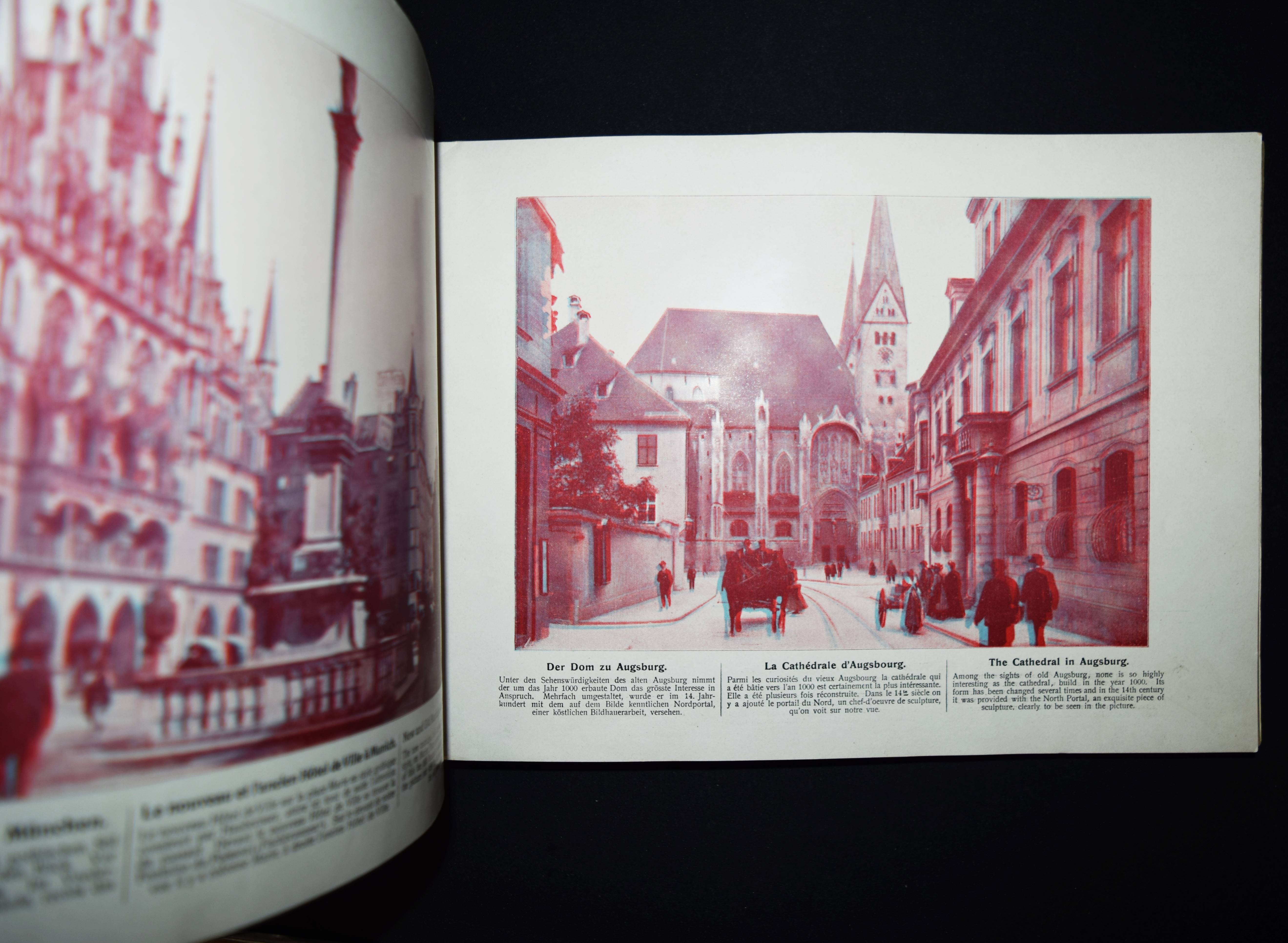Stereo-Photographie – Skladanowsky, Max (Richard). Plastische Weltbilder. Vues plastographiques. – Plastographical views of the world. – Plastographische Orignalaufnahmen. – Serie I (von 2). Heft 1-10. 10 Hefte. Berlin, Deutscher Verlag o. J. (1902-1904). Quer-4° (24 x 32 cm.). Jeweils [8] Bl. mit 15 Tafeln in Anaglyphendruck und beilieg. Orig.-Rot-Grün-Brille. Illustr. Orig.-Kartonumschläge in Orig.-Halbleinen-Flügelmappe. Heidtmann 18519. NDB XXIV, 486 f. – Interessante Stereofotografie-Folge mit 10 Orig.-Plastograph-Brillen für die 3-D-Betrachtungsweise. – I. Eine Knipsfahrt durch Berlin. – II. Eine Blitzfahrt durch Süddeutschland. – III. Rheinwanderweg. – IV. Potsdam, Charlottenburg und die Mark. – V. Niederrhein und Nordseestädte. – VI. Die Weltstadt London. – VII. Ein Ausflug nach Paris. – VIII. Kreuz und quer durch Ostdeutschland. – IX. Niederländische Fahrten. – X. Im Herzen Deutschlands. – M. R. Skladanowsky (1863-1939) „gehört zu der kleinen Gruppe von Filmpionieren, die weltweit zwischen 1892 und 1896 am Problem der Filmaufnahme und -projektion arbeiteten. Wenn auch seine Erfindung technisch nicht wegweisend war, gehörte er zu den wenigen, denen eine funktionierende Projektion von Bewegtbildern vor Publikum gelang. S.s Berliner Straßenszenen von 1896 haben bleibenden kulturhistorischen Wert. Seine Filme sind die ersten kinematographischen Szenen, die in Deutschland aufgenommen wurden“ (J. Castan in NDB). – Die Flügelmappe etwas angestaubt und berieben, 1 Flügel lose, sonst sehr gut erhalten und mit allen 10 Anaglyphen-Brillen.