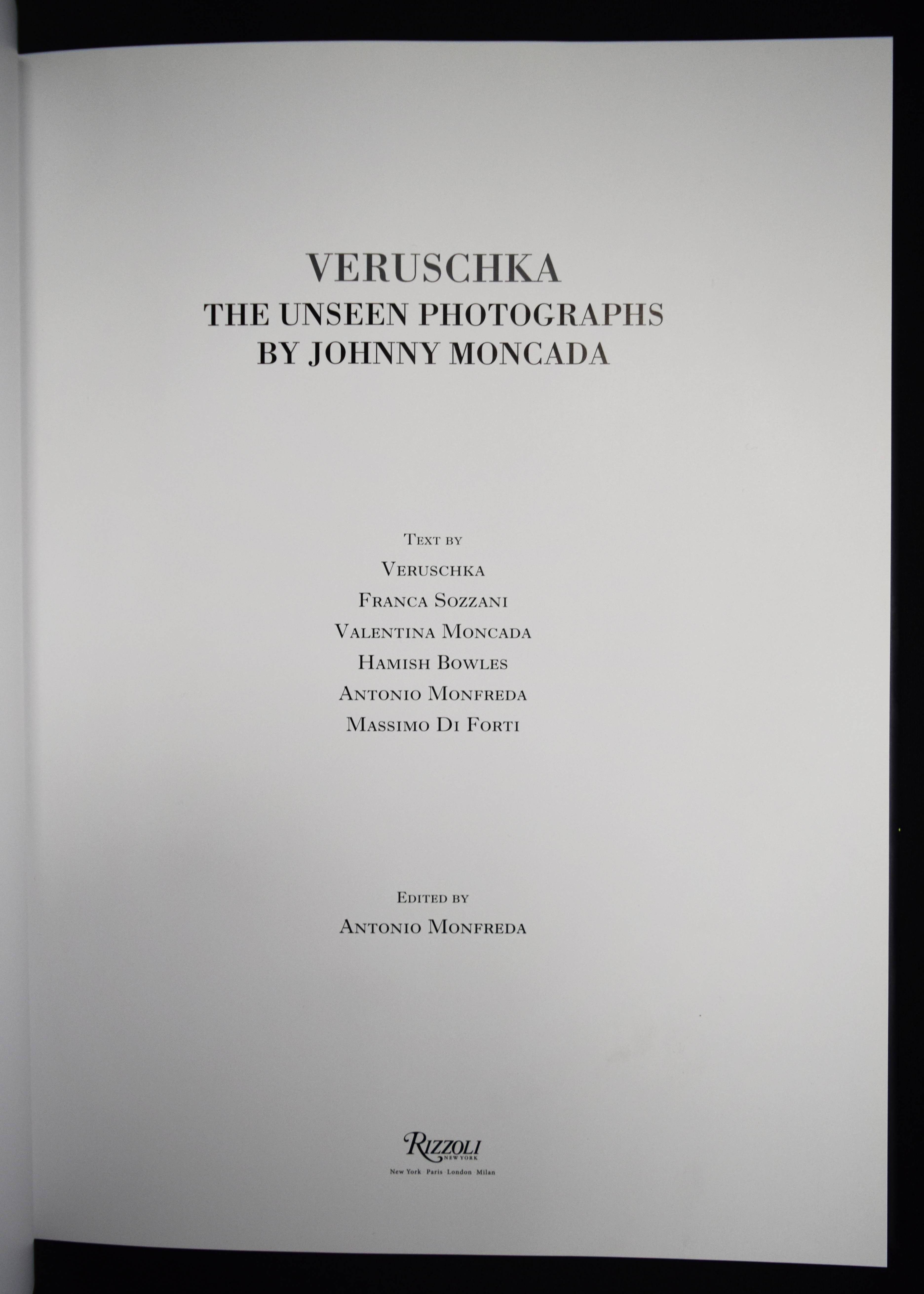 Moncada – Monfreda, Antonio (Hrsg.). Veruschka. From Vera to Veruschka. The unseen photographs by Johnny Moncada. New York, Rizzoli (2014). Folio ( XXI S., [61] Bl. mit teils doppelblattgr. und farb. Tafeln. Orig.-Pappband mit farbig illustr. Orig.-Schutzumschlag. Erste Ausgabe. – „When photographer Johnny Moncada opened a trunk of his archives that had been locked for thirty years, he and his daughter found over ten thousand unseen and unpublished photographs. Of these, three thousand of them were of the gorgeous fashion icon, Veruschka. This lavish volume presents a single series of these images where Moncada photographed Veruschka over the course of a month-long holiday in Capri and Rome, Italy. Using a mixture of quiet moments and posed artistic shots, Moncada was able to capture not only the style, fashion, and energy of the 1960s, but he was also able to witness rare moments and the glamorous intrigue and poise of Veruschka. Moncada’s exquisite fashion photographs embody elegance, and this volume captures the romance, beauty, and grace of Veruschka and timeless glamour and decadence“ (Rizzoli). – Die Schauspielerin, Malerin und Fotografin Vera Anna Gottliebe Gräfin von Lehndorff (auch Veruschka, geb. 1939) „gilt als das „erste deutsche Supermodel“… In den 1960er Jahren wurde die hochgewachsene von Lehndorff (1,90 m) bei einem Aufenthalt in Florenz als Fotomodell entdeckt. Sie legte sich das Pseudonym Veruschka (Koseform von Vera) zu, vermarktete sich so als Kunstfigur und wurde international bekannt“ (Wikipedia). – Sehr gutes Exemplar.