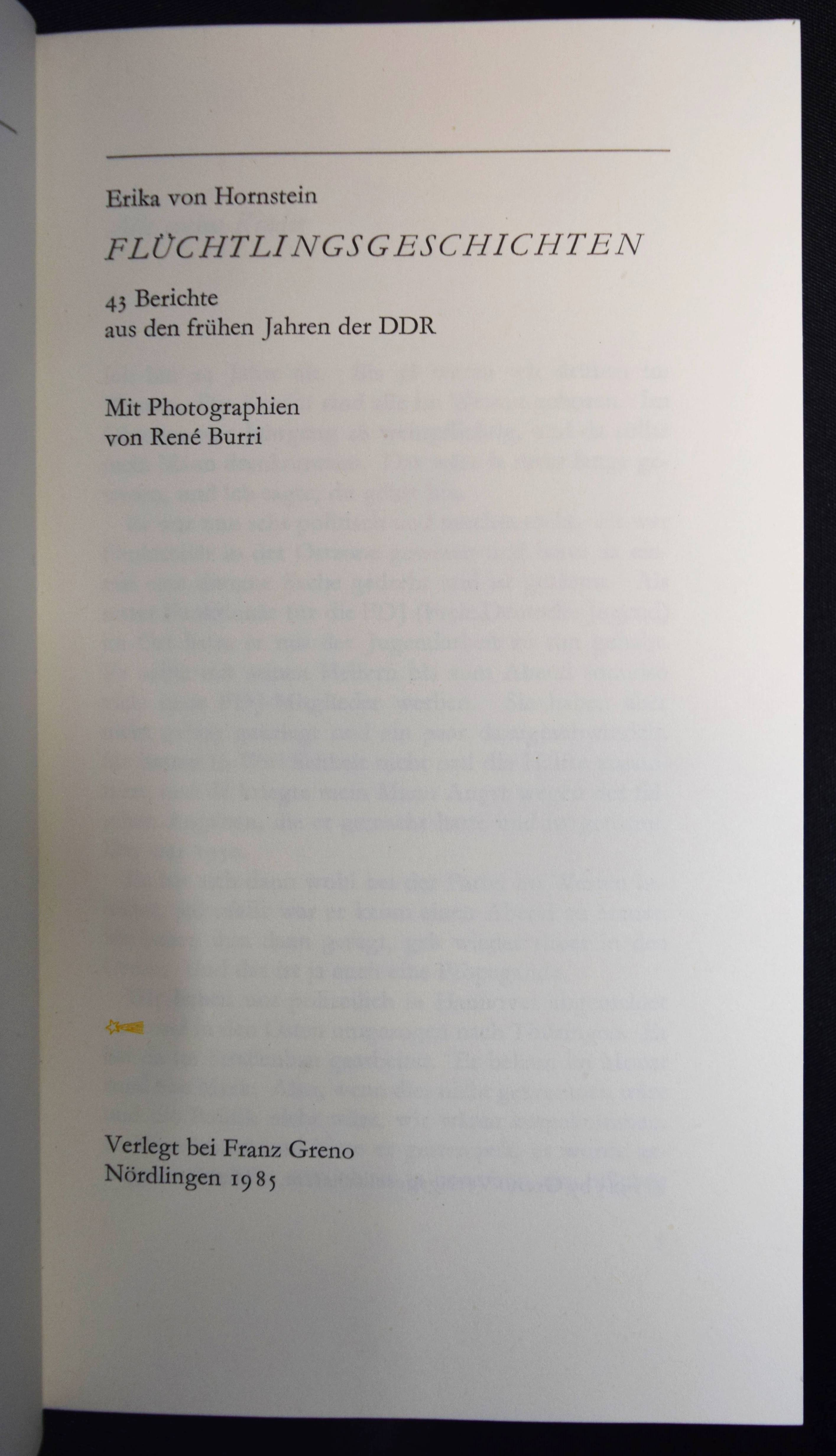 Burri – Hornstein, Erika v. Flüchtlingsgeschichten. 43 Berichte aus den frühen Jahren der DDR. Mit Photographien von René Burri. 1.-10. Tsd. Nördlingen, Greno (1985). 8°. 451, (3) S. mit 28 teils doppelblattgr. Duotone-Tafeln und 1 Orig.-Photographie (Brandenburger Tor, 1961). Orig.-Pappband mit Umschlag (Handbütten à Fleur), Pergamin-Schutzumschlag und Orig.-Lederschuber. (Die andere Bibliothek, Band 8). Eines von 999 num. Exemplaren mit der beiligenden Orig.-Photographie. – „Die Photographien von René Burri sind in den Jahren 1957 bis 1961 entstanden.“ – Sehr gutes Exemplar.