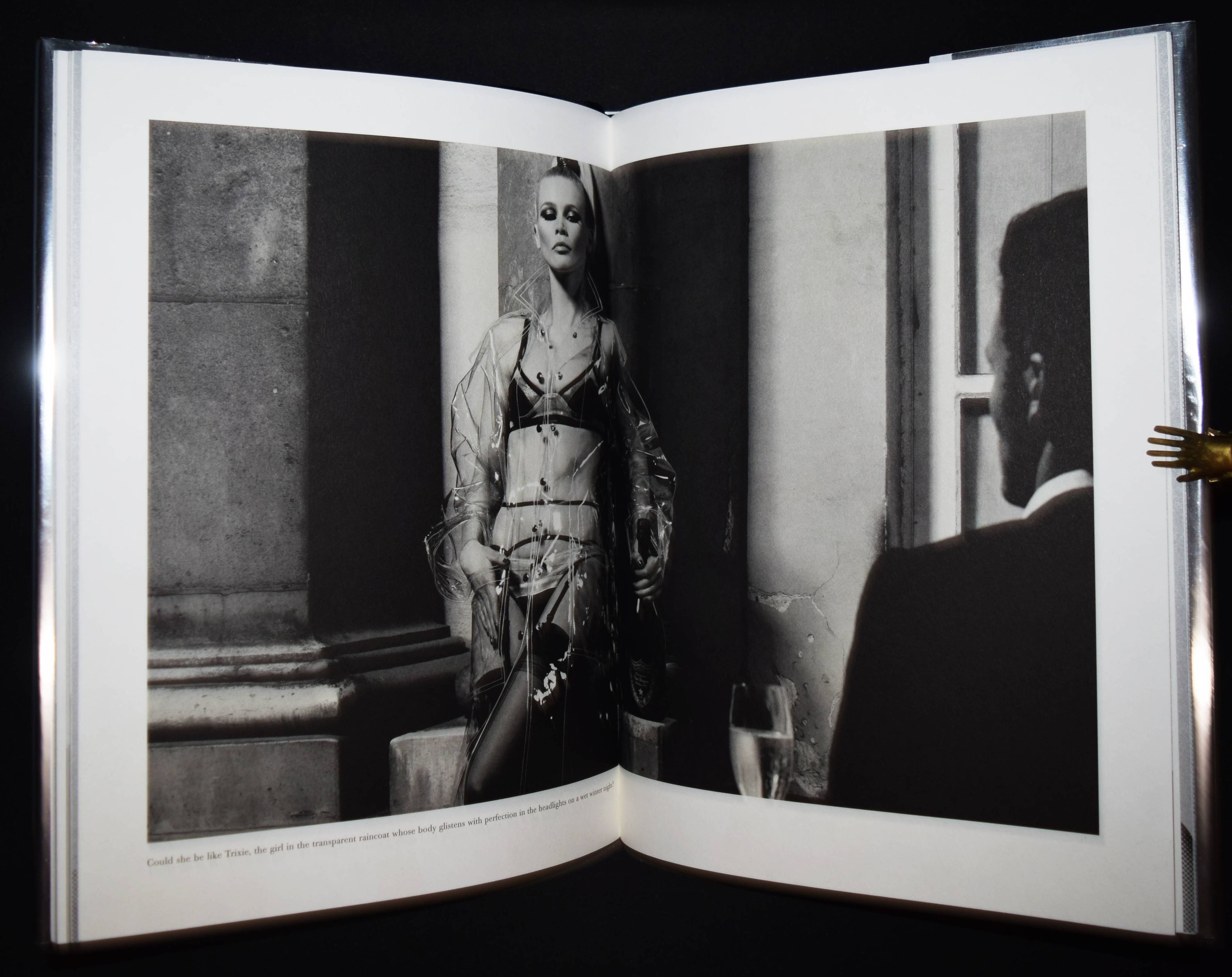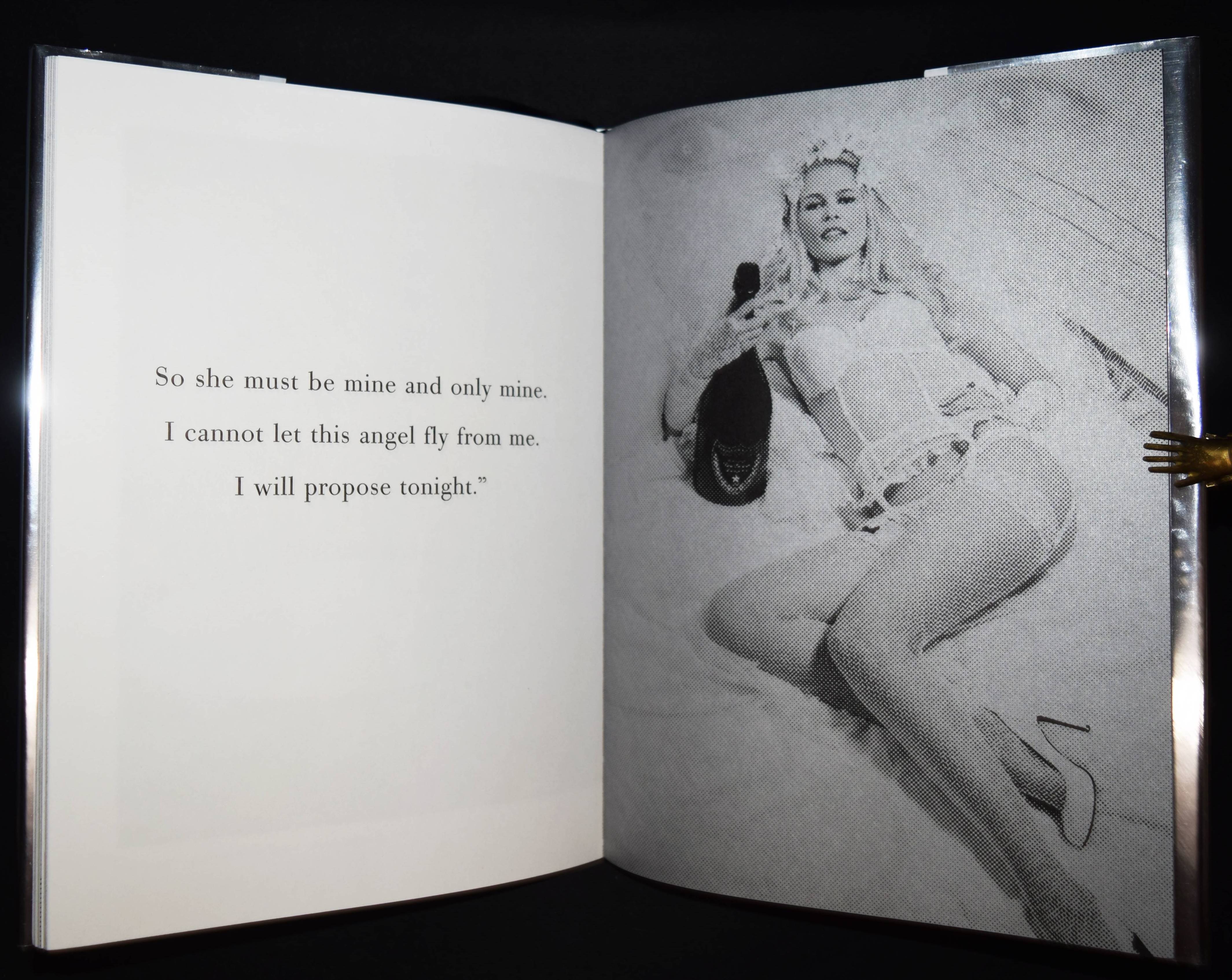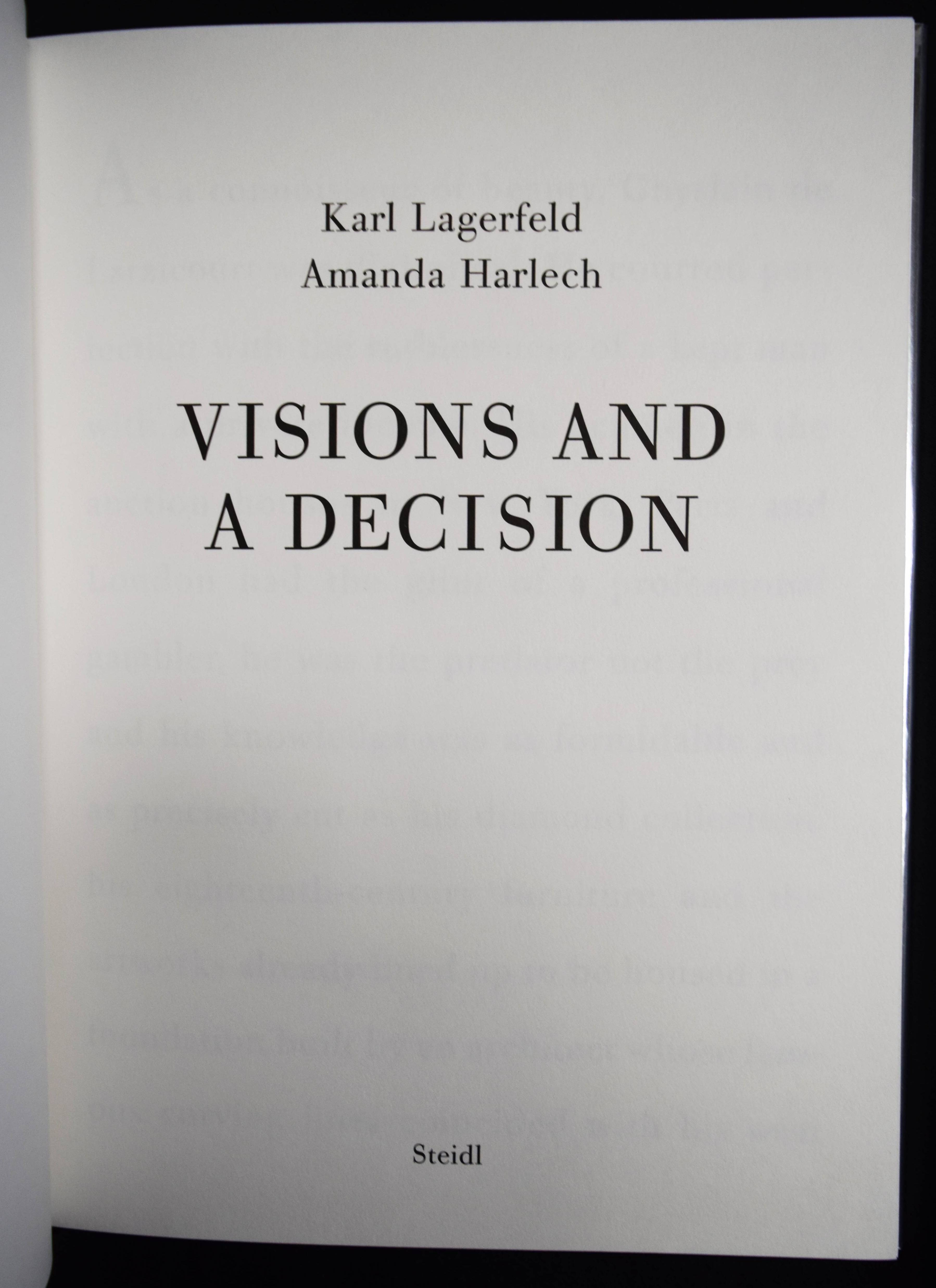 Lagerfeld, Karl and Amanda Harlech. Visions and a decision. Göttingen, Steidl (2007). 4°. [28] Bl. mit 34 teils doppelblattgr. Duotone-Tafeln. Orig.-Halbleinenband mit Silberschnitt und illustr. Orig.-Schutzumschlag. „Karl Lagerfeld has run Chanel for the last 24 years, with Lady Amanda Harlech at his side for half of that time in the role of a personal and professional muse. Visions and Decision, their second collaborative book, combines Lagerfeld’s black-and-white photographs of Claudia Schiffer, Brad Kroenig and Sebastien Jondeau from a 1993 Dom Perignon Oenotheque advertising campaign with a story by Harlech. Her tale charts the sensual fantasies of a young bachelor, Ghyslain, and Malvina, his bride-to-be; he is charming and ruthless, she is beautiful and demure. „This is a story of a young, handsome, old-money couple,“ explains Lagerfeld. „Everything is perfect, they’re just a little bored.“ With Dom Perignon as the catalyst, Ghyslain fantasizes about transforming his prim fiancee into a cast of seductive characters. Harlech’s darkly humorous sensibility, which informs the Chanel aesthetic, is pitch perfect in this story of decadent ennui and passive seduction. Modeled on a traditional fairy-tale book with a title plaque embossed in silver, a black cloth bookmark and silver printing throughout, Visions and a Decision is perhaps not without a playful moral. Suppressing our desires is a dangerous thing; liberating them could be the beginning of a delectable existence“ (Steidl). – Tadellos.