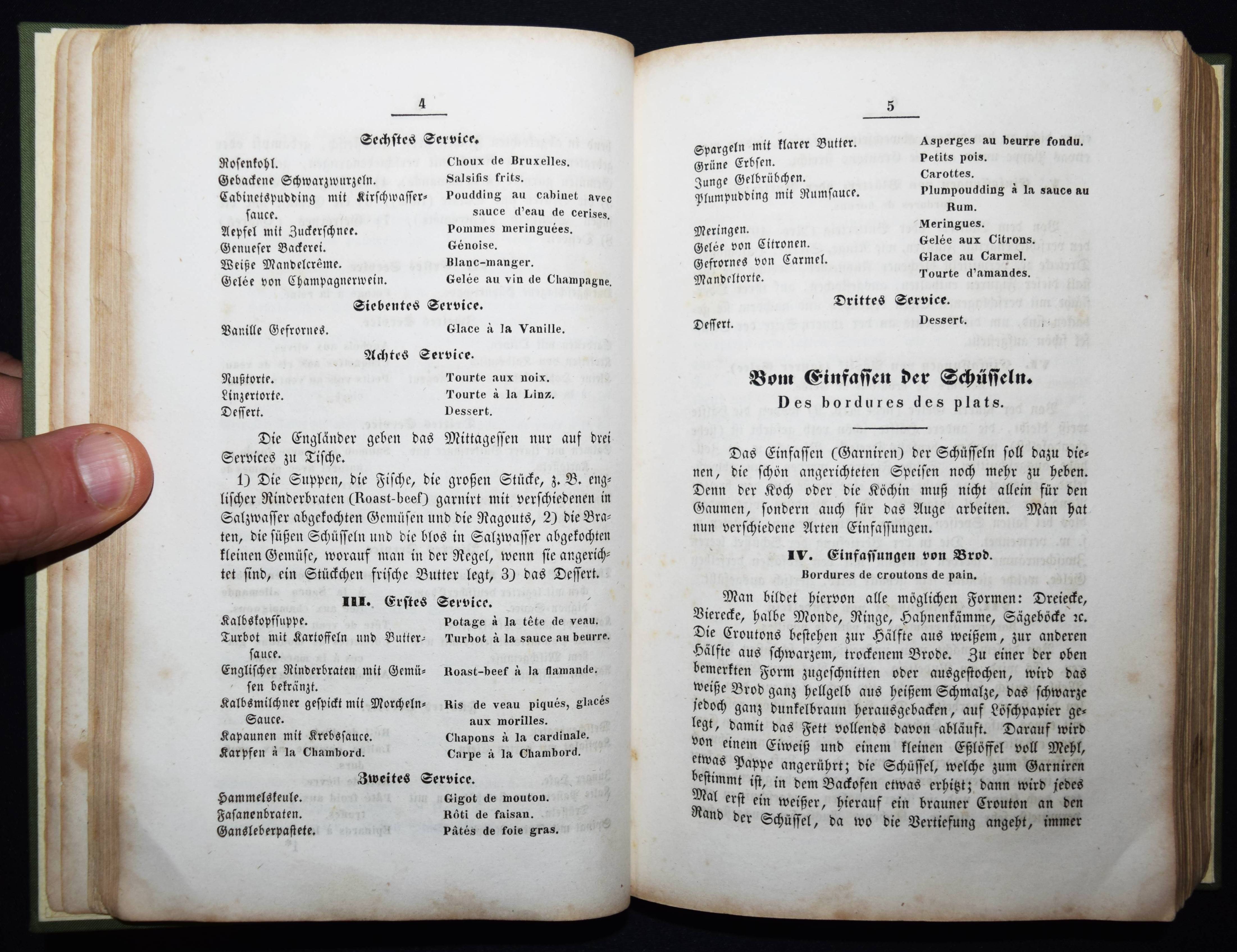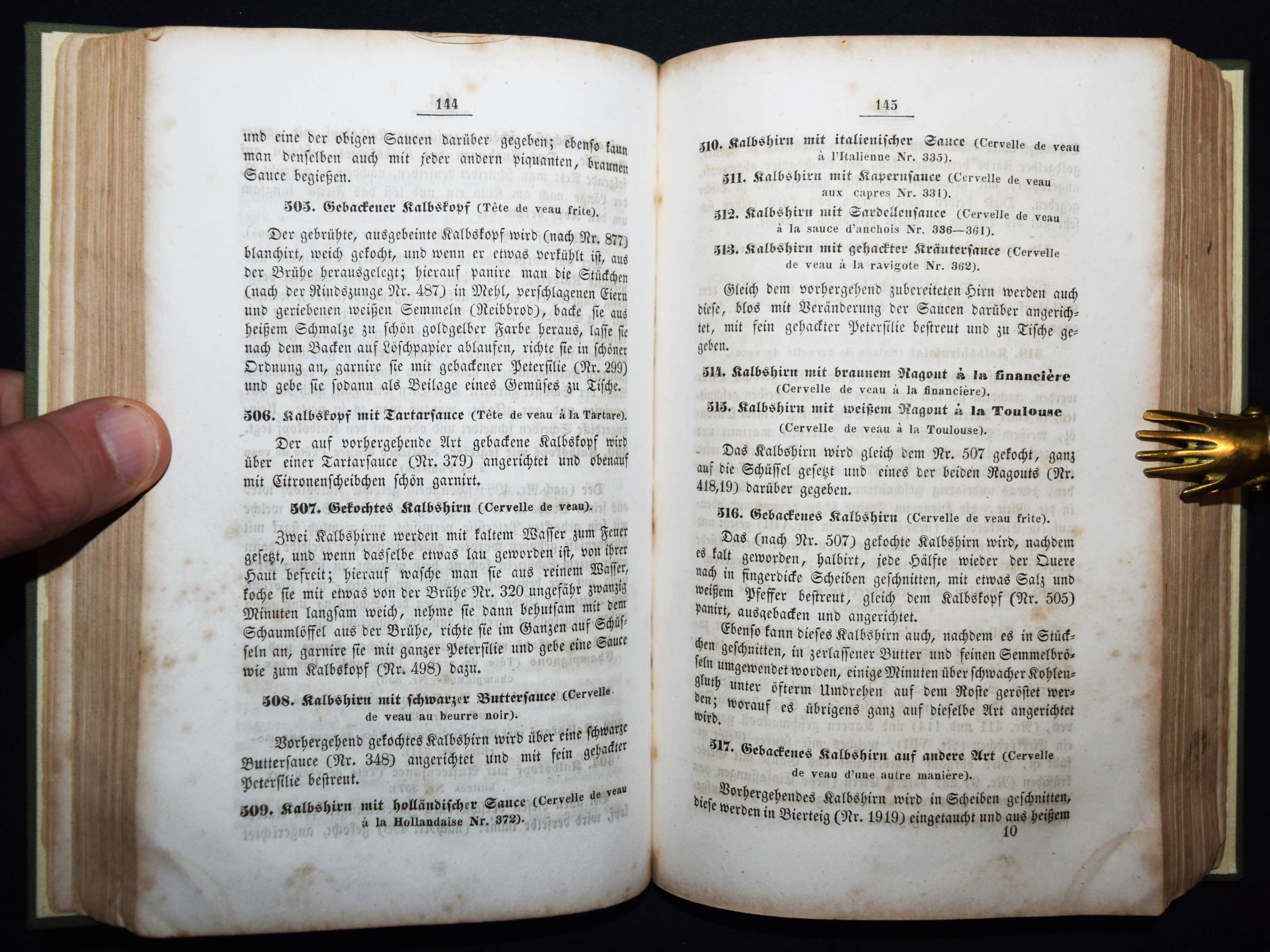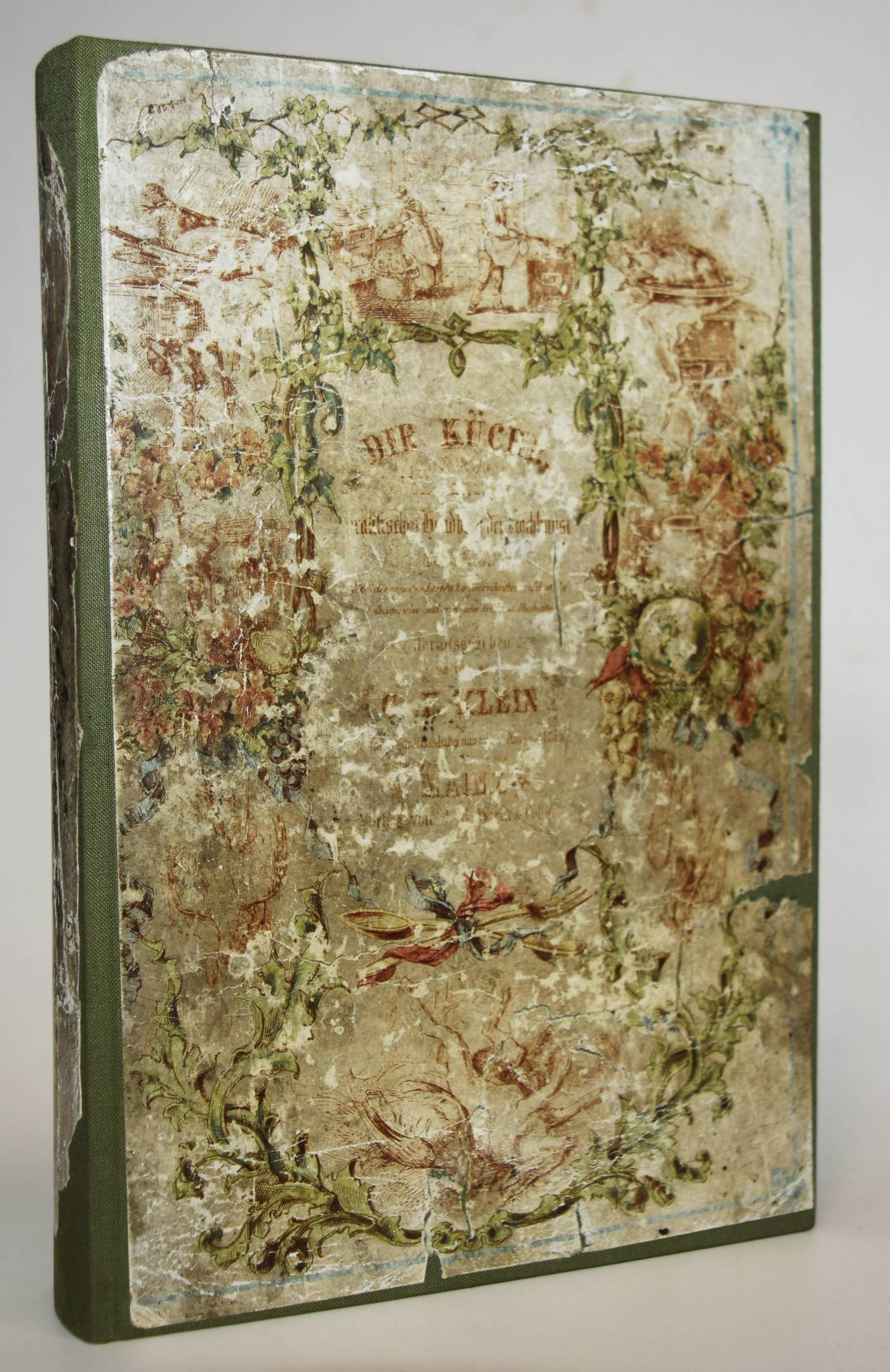Klein, C(arl) F(riedrich). Die Küche. Vollständiges praktisches Handbuch der Kochkunst für die feinere und gewöhnliche Küche. Enthaltend: 2095 der neuesten, besten Kochvorschriften auf deutsche, französische und englische Art, in 68 Abschnitten. Mit einer Einleitung über die zweckmäßigste Einrichtung der Küche und Speisekammer; genauere Angabe des Spickens, Dressieren des Geflügels, … etc. mit besonderer Berücksichtigung der in Blechbüchsen aufbewahrten Gemüse und Fleischspeisen. 2. Auflage. Mainz, J. G. Wirth 1856. 8°. LXX S., [1] Bl., 499 S. Moderner Leinenband mit mont. farbig illustr. Orig.-Umschlag. Georg 1227. Weis 1897. – Die erste Ausgabe von 1850 war nach Weiss „eines der ersten von einem Restaurateur geschriebenen Kochbücher“ (Restaurateur und Gasthalter zum rothen Haus in Mainz, vorher u.a. Küchenchef des Vier Jahreszeiten in Wiesbaden und Hofkoch der Herzöge Wilhelm zu Nassau und Ferdinand v. Württemberg). – Der Umschlag stärker berieben, Exlibris (Kaltnadel-Radierung von Hans Meid), durchgehend etwas braunfleckig.