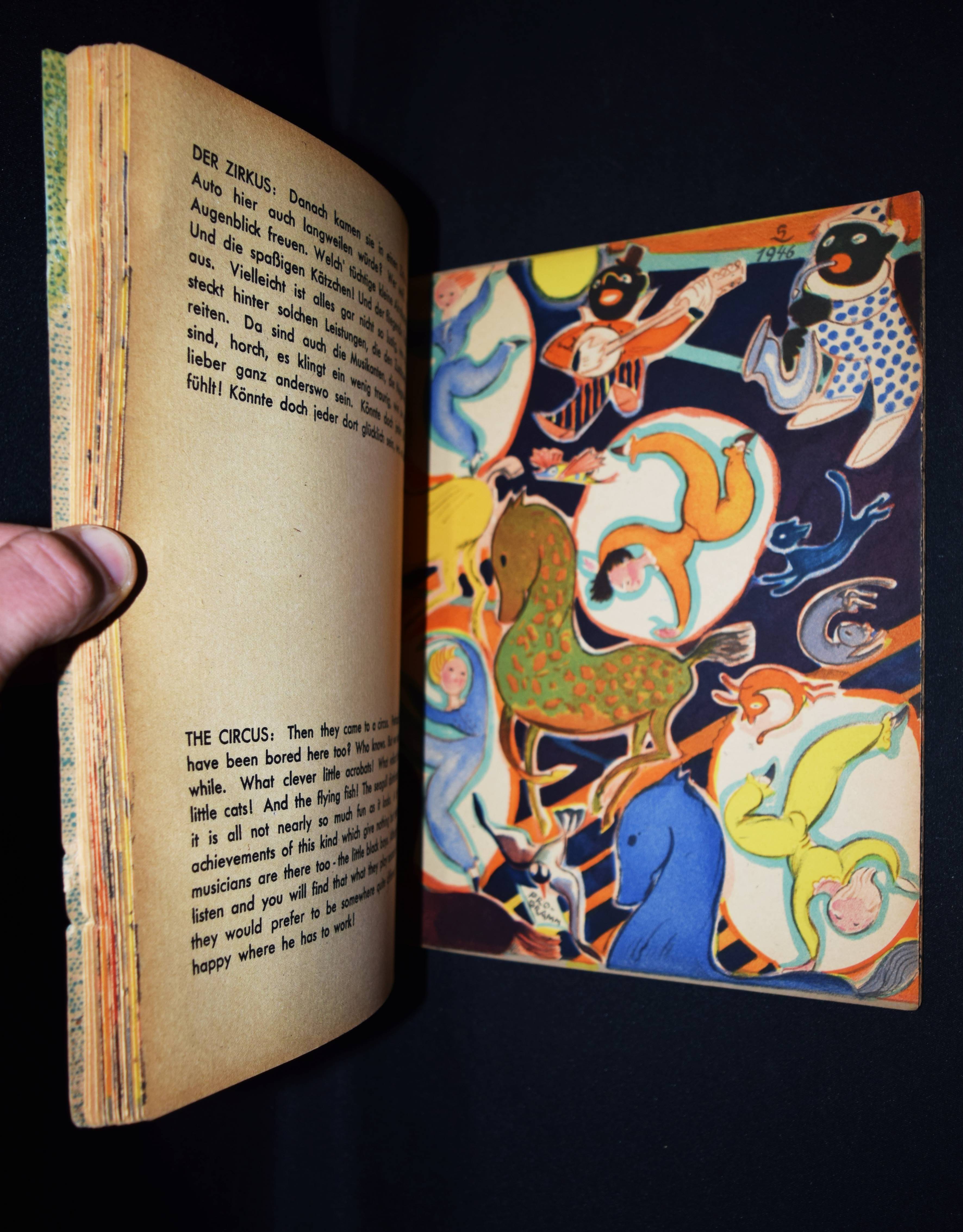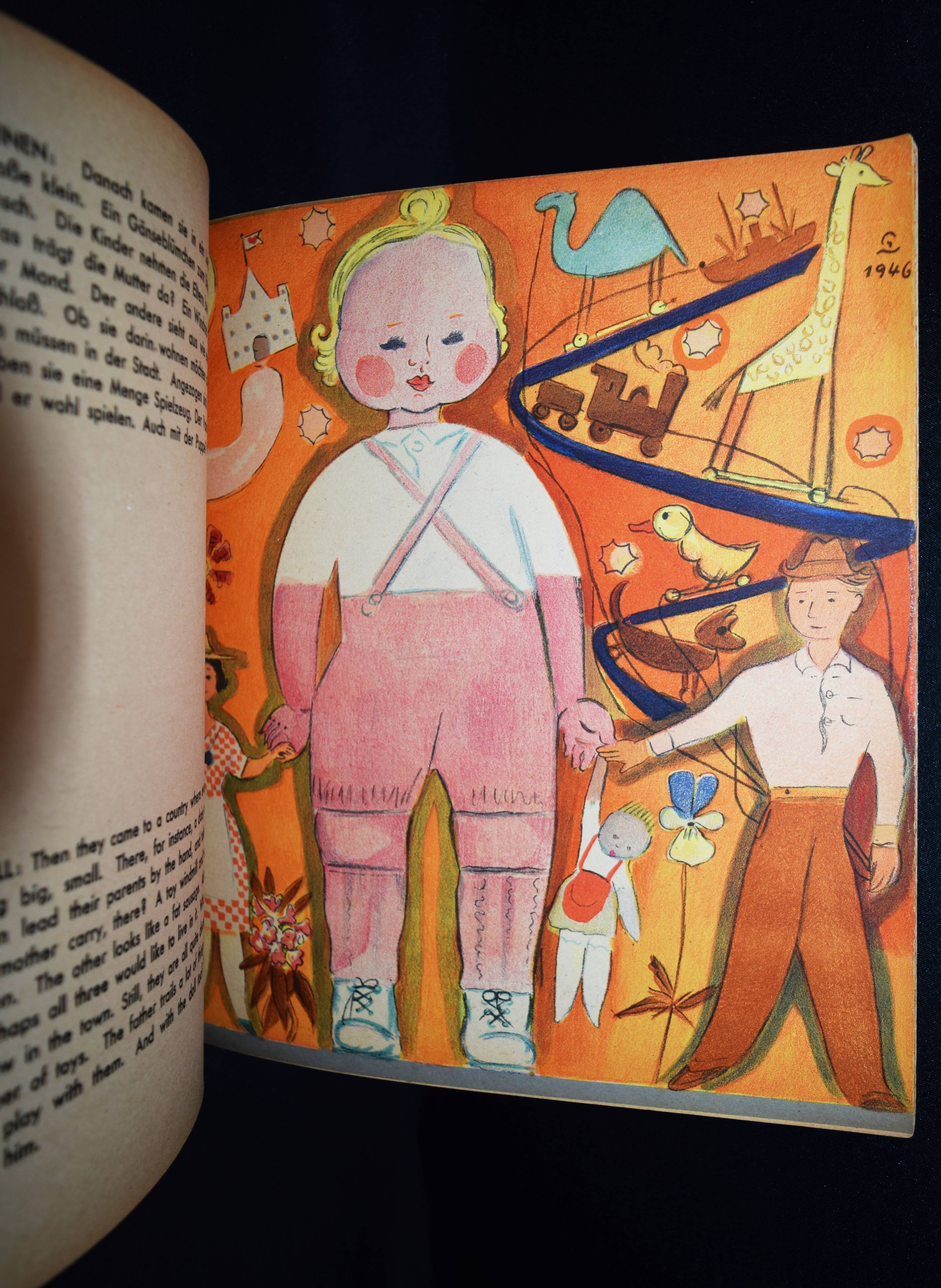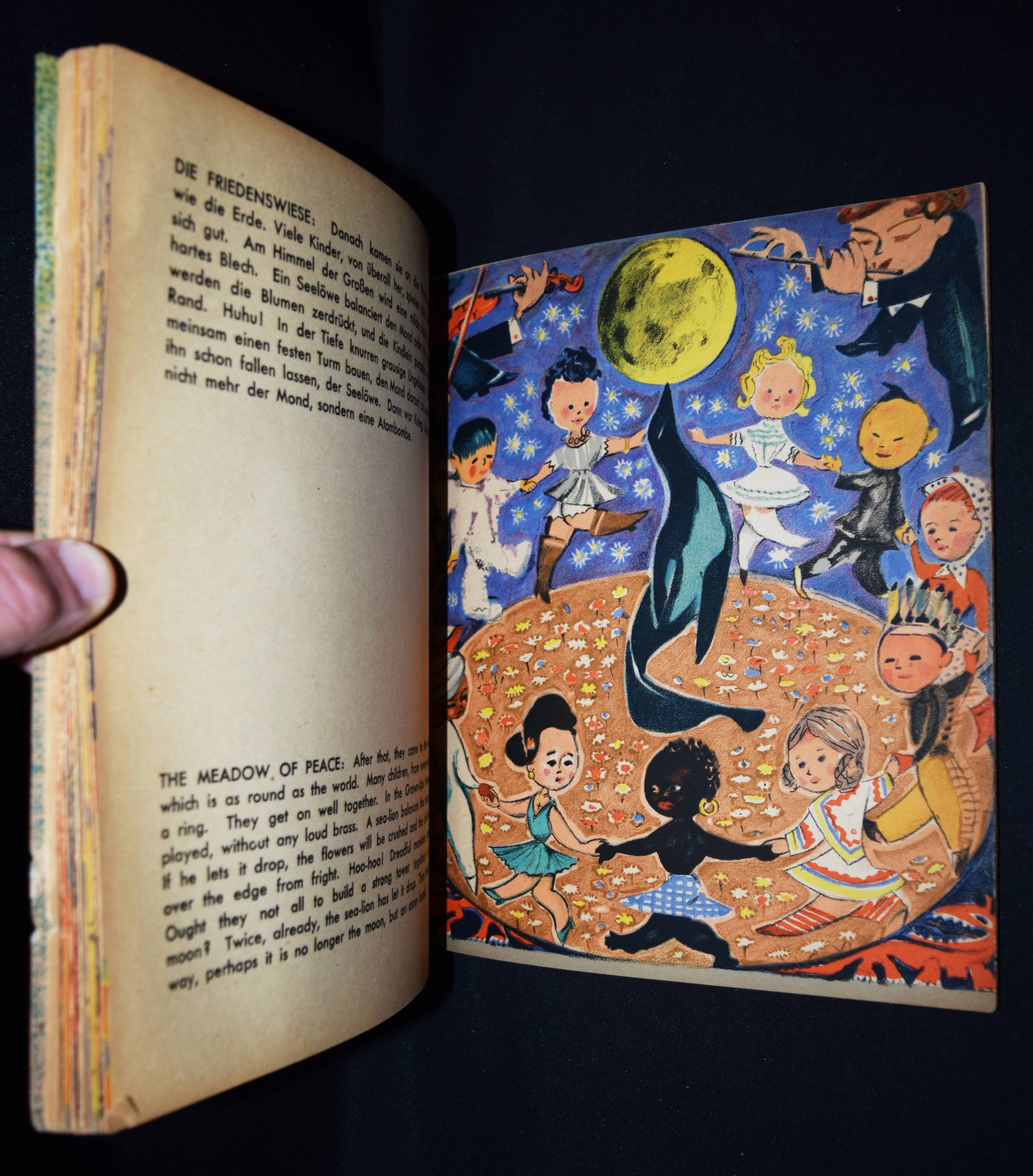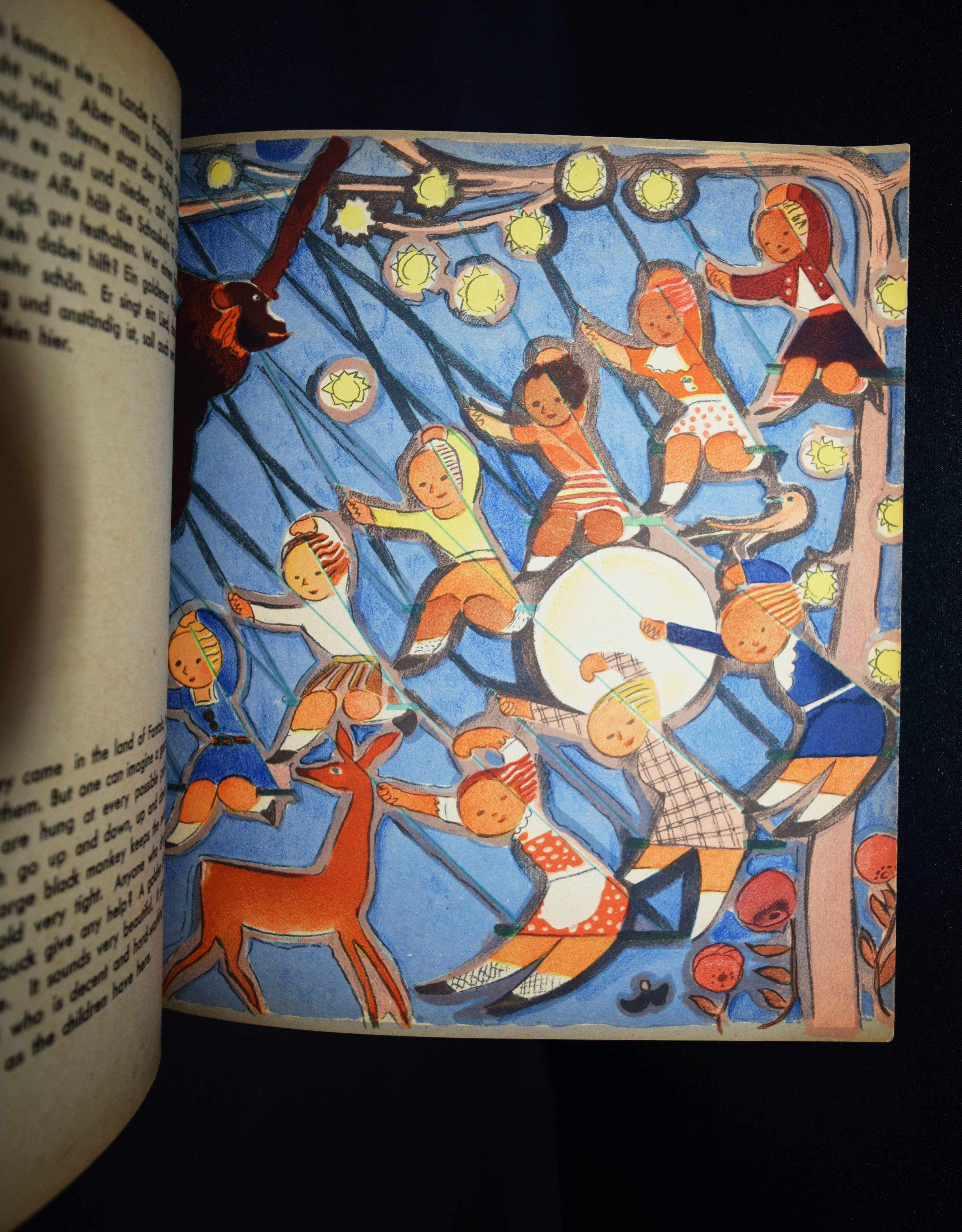 Leip, Hans. Das Zauberschiff. The Magic Ship. Ein Bilderbuch nicht nur für Kinder. A Picture Book not only for Children. Hamburg, Hammerich & Lesser (1947). 4°. [16] Bl. mit 13 Farbtafeln. Farbig illustr. OKart. (als Blockbuch gebunden). Bilderwelt 785. Doderer-Müller 1318. Duwe 115. Raecke-Hamburg 110. Stuck-Villa II, 248.– Zweite Ausgabe. – „Das Zauberschiff ist ein Vaterbilderbuch – aber es ist nicht nur für die Tochter geschrieben. Was mir vorschwebte, war die Erinnerung an die eigene Kindheit, wo ich wenig Genüge gefunden hatte an den üblichen kindlichen Bilderbüchern, in denen ich vermisste, was ich später als das Phantastische, Geheimnisvolle und Beziehungsreiche zu benennen lernte. Nicht ‚verstehen‘ wollte ich im Sinne der Erwachsenen, sondern ahnen“ (H. Leip im Vorwort zur Neuausgabe von 1973). – „Das ursprünglich nur seinen vier Töchtern zugedachte Bilderbuch enthält zu dreizehn von ihm selbst entworfenen klarfarbigen expressionistischen Kompositionen kleine Texte als Erlebnisfolge eines Kindes, in deutscher und englischer Sprache“ (M. Dierks in LKJ II, 333). – Rücken und kleine Fehlstelle am Vorderdeckel unauffällig restauriert, papierbedingt wie immer gebräunt, sehr gutes Exemplar eines der schönsten deutschen Kinderbücher nach 1945.