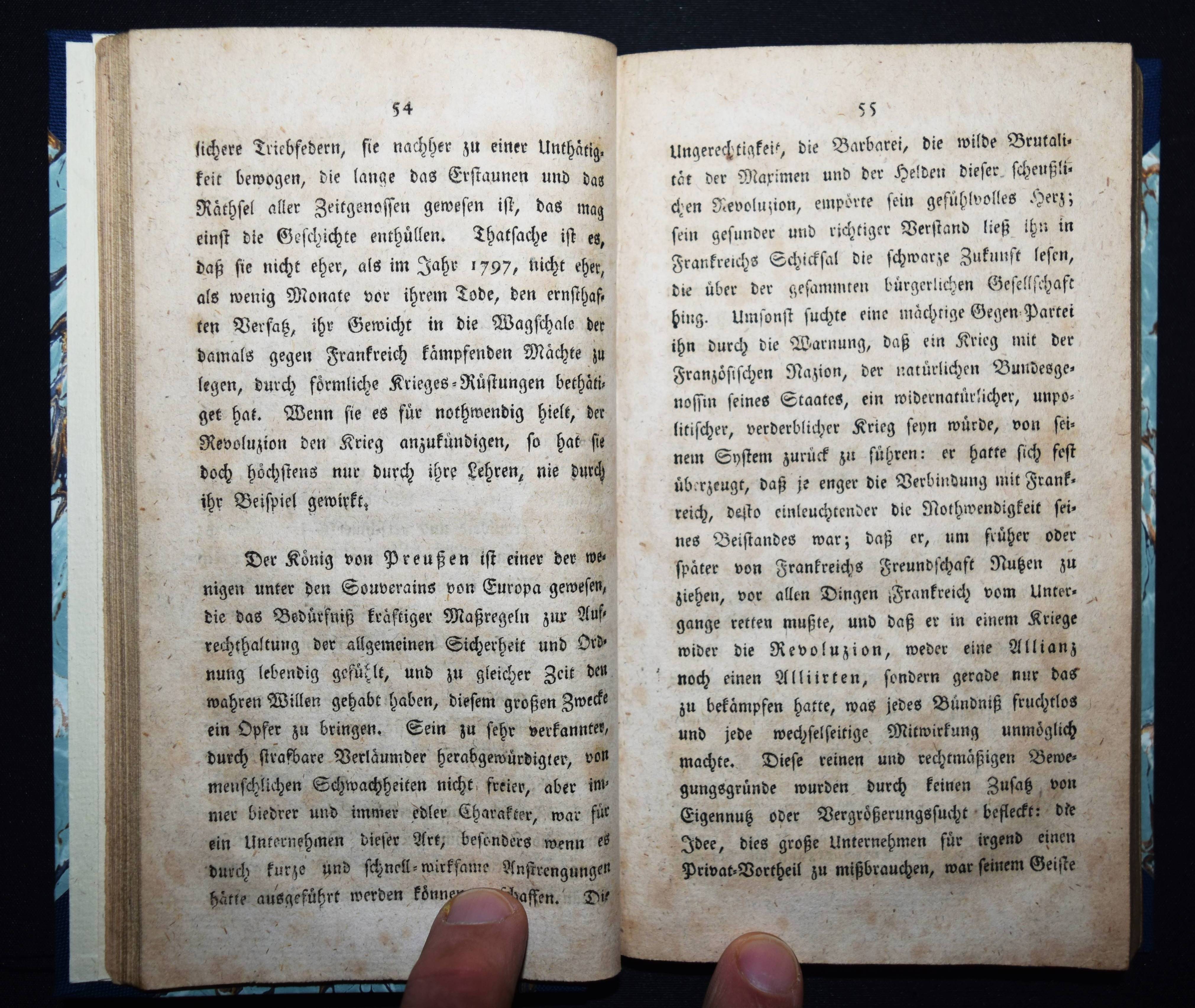 Gentz, Friedrich v. Ueber den Ursprung und Charakter des Krieges gegen die Französische Revoluzion. Berlin, Heinrich Frölich 1801. 8°. Titel, 333 S. Moderner Halbleinenband mit goldgepr. Rückentitel. ADB VIII 580. Kircheisen, Gentz 105. Goedeke VI, 191, 16. Humpert 7677 (Titel und Verlag ungenau). NDB VI, 190 ff. – Erste Ausgabe des glänzend geschriebenen Buches, eine Fortsetzung seines „Historischen Journals“. Gentz bezeichnet die Jakobiner als Urheber des Krieges und erklärt die französischen Erfolge mit der Zaghaftigkeit Preußens und Österreichs, die den Krieg gegen die Republik nur als Verteidigungskrieg geführt hätten. „Diese Arbeit gehört unstreitig zu dem Besten, was Gentz schrieb“ (Beer in ADB). – F. v. Gentz (1764-1832), einer der wichtigsten Gegner Napoleons, „sein im Sinne einer eigengesetzlichen Dynamik entwickelter Revolutionsbegriff und die klare Kennzeichnung der Phasen und des Endes der Revolution waren aufsehenerregende Leistungen. Aber erst seit der Kriegspolitik Bonapartes kam bei G. – sichtbar in der Verwerfung der Projekte ewigen Friedens und einer Rechtfertigung des Krieges – ein politischer Realismus zum Durchbruch; aus dem pazifistischen Streiter wider die Prinzipien der Französischen Revolution wurde der Herold des Kampfes um die Wiederherstellung der politischen Grundordnung Europas, des von Frankreich zerstörten Gleichgewichts der Mächte. Ließ schon diese Tendenz die preußische Regierung abrupt von G. abrücken, so gefährdete er seine Sonderstellung in Preußen, als er 1801 die von Hauterive verkündete Europapolitik des bonapartistischen Frankreich desillusionierte, England als den Hort der Freiheit Europas pries und die Überwindung des deutschen Dualismus forderte, um den Kontinent vor einer Unterwerfung durch den Hegemoniewillen Napoleons zu bewahren“ (H. Rumpel in NDB). – Durchgehend teils stärker braunfleckig.