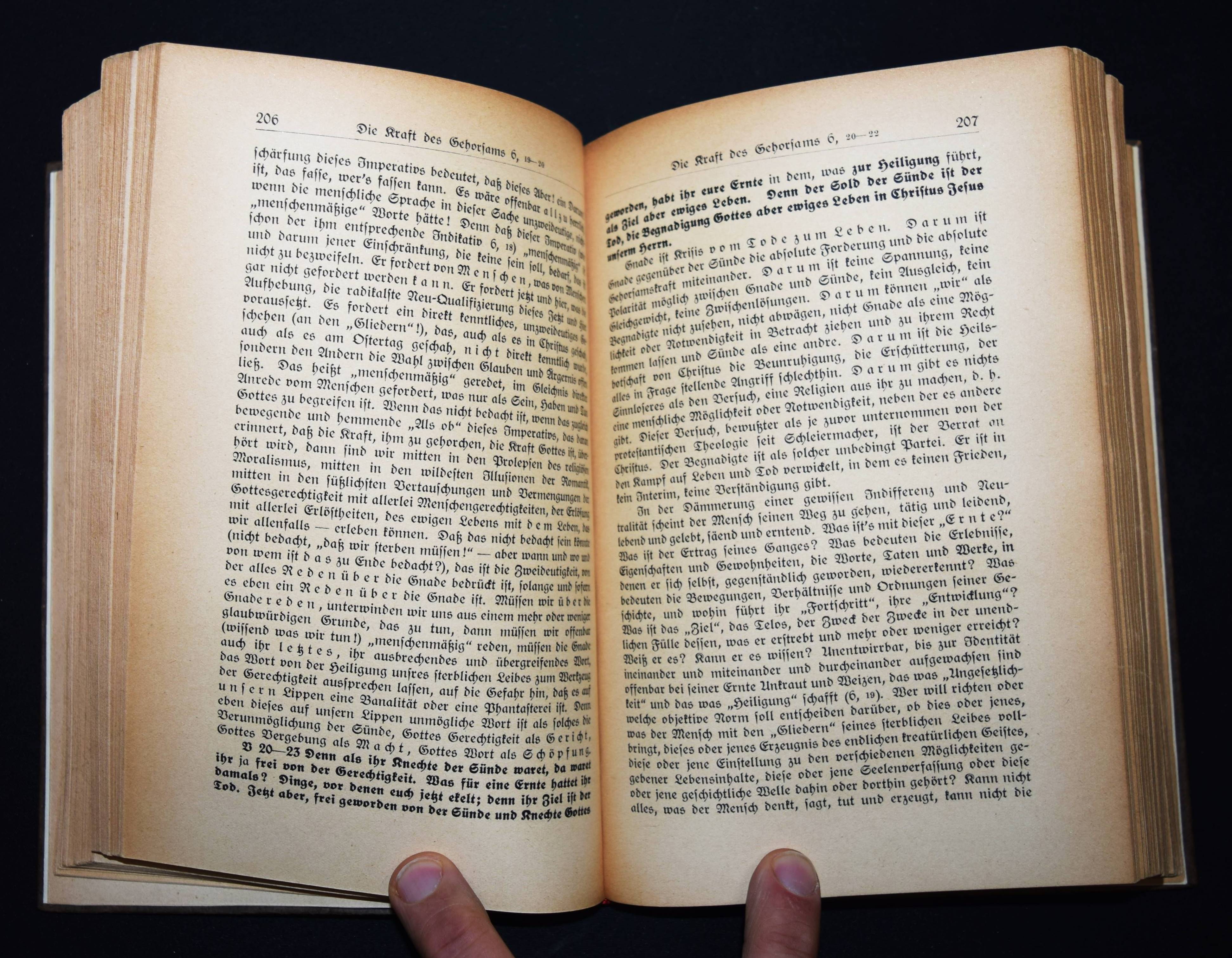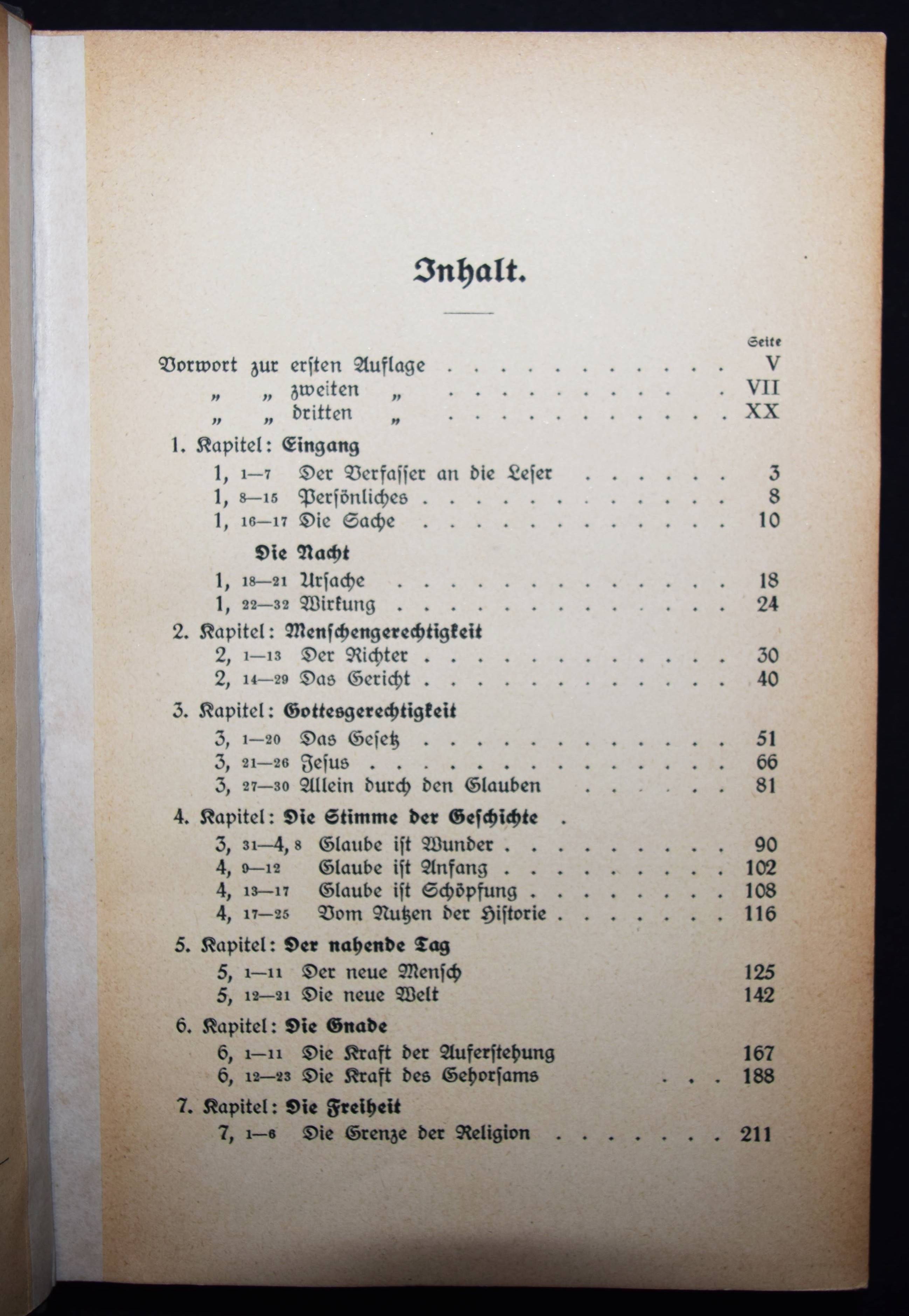 Barth, Karl. Der Römerbrief. Zweiter Abdruck der neuen Bearbeitung. 4. – 7. Tsd. München, Chr. Kaiser 1923. Gr.-8°. XXIV, 528 S. Orig.-Halbleinenband. Ziegenfuss I, 78. – Maßgebliche zweite Ausgabe des Hauptwerks. Die erste Ausgabe erschien 1919 in Bern und nur wenige Exemplare konnten verkauft werden; der Verleger Bäschlin verkaufte die meisten Exemplare an den Münchener Ch. Kaiser-Verlag, der diese unter seinem eigenen Signet weiter vertrieb. – „Die zweite Auflage des „Römerbriefs“ und die um sie gruppierten Arbeiten von 1921/22 zeigten Barth auf dem Höhepunkt dieser „dialektischen Theologie“, die in der Theologiekritik Franz Overbecks (1837–1905), dem Neukantianismus in der Interpretation seines Bruders Heinrich Barth (1890–1965) und, zumindest begrifflich, in der Paradoxdialektik Søren Kierkegaards (1813–1855) Inspirationsquellen fand. Fruchtbar für den weiteren Weg wurden neben der lebenslangen Freundschaft mit Thurneysen Begegnungen mit Friedrich Gogarten (1887–1967) und Emil Brunner (1889–1966) sowie der Austausch mit Rudolf Bultmann (1884–1976). Ihr gemeinsames Diskussionsforum fand diese Gruppe von 1922 bis zu ihrem Zerfall 1933 in der Zeitschrift „Zwischen den Zeiten“, die als Organ des Aufbruchs galt“ (M. Beintker in NDB online). – Rücken und Vorsätze fachgerecht erneuert, papierbedingt wie meist etwas gebräunt, sehr gutes Exemplar.