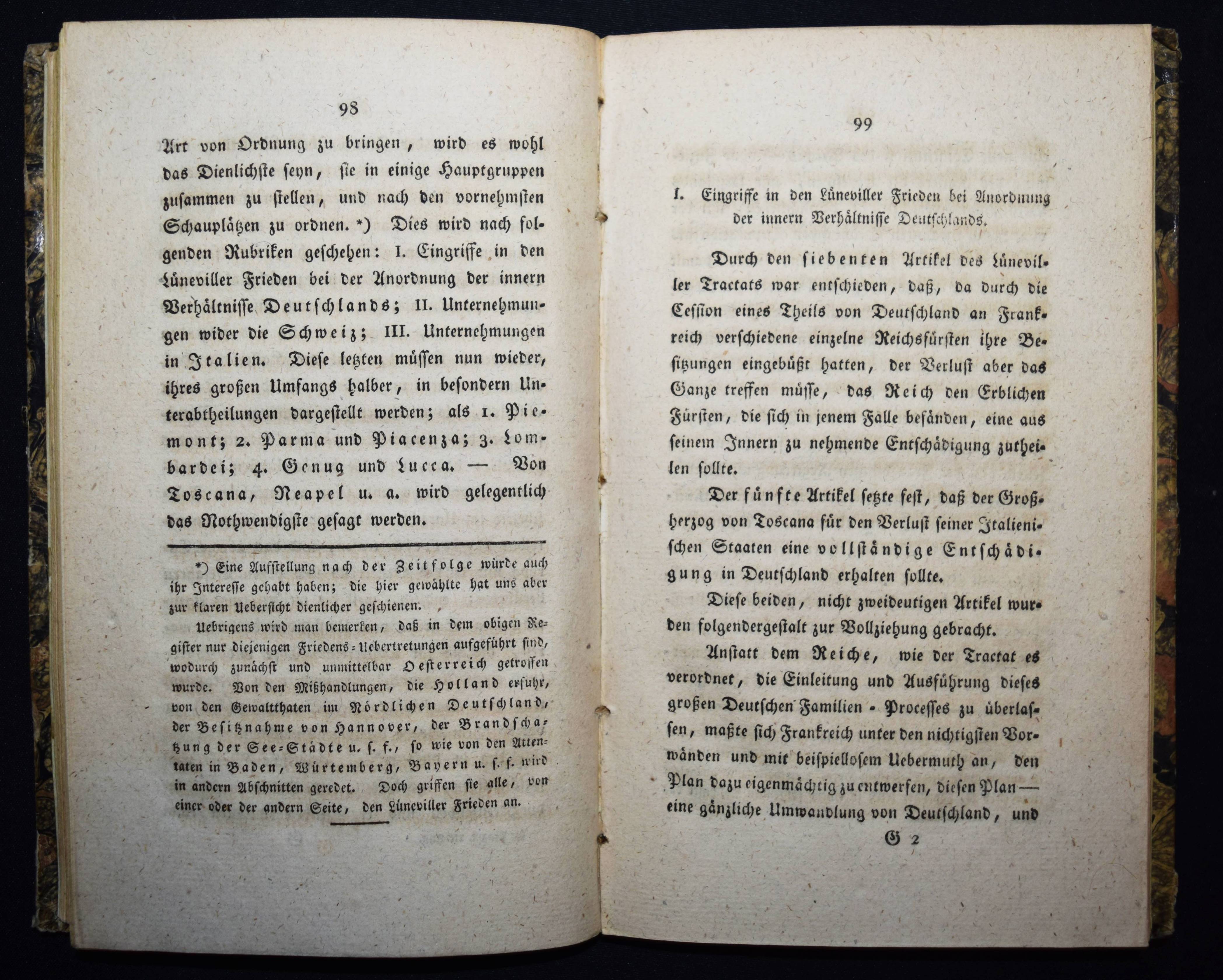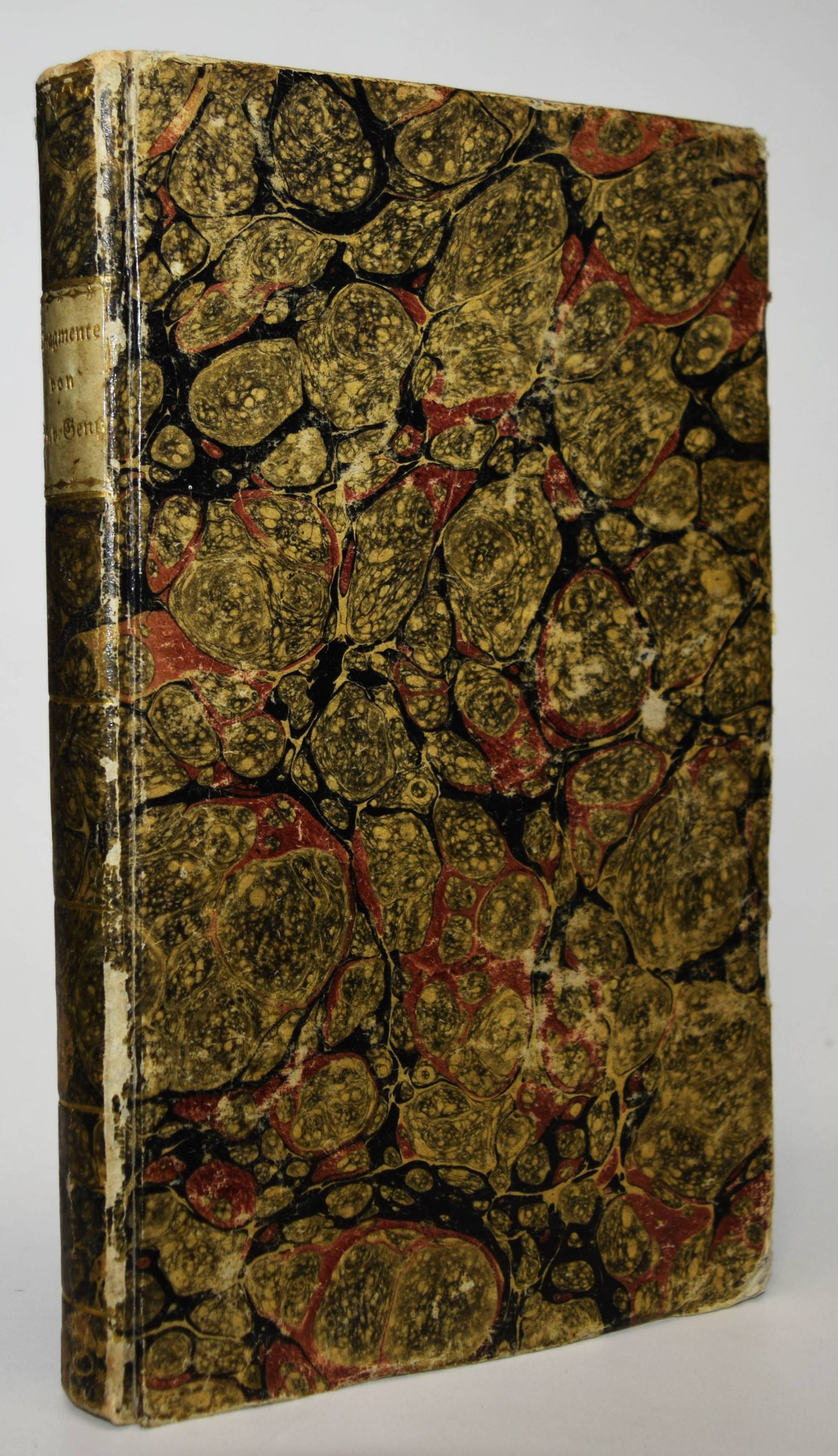 Gentz, Friedrich v. Fragmente aus der neuesten Geschichte des politischen Gleichgewichts in Europa. 2. Aufl. St. Petersburg (eig. Riga), Johann Friedrich Hartknoch 1806. 8°. LIV, 264 S. Marmorierter Pappband der Zeit mit goldgepr. Rückenschild und Linienvergoldung. Goedeke VI, 191, 17. Weller, Druckorte 205. – Die erste Ausgabe erschien im selben Jahr mit abweichender Paginierung. – „Die Auswirkungen der französischen Expansionspolitik auf die europäischen Staatenwelt, der Napoleons Machtergreifung 1799 eine neue Dimension gab, machte aus dem Revolutionskritiker Gentz den Analytiker der europäischen Ordnung, der die Gefahr einer französischen Hegemonie anprangerte … Sein Wirken als antinapoleonischer Publizist erreichte mit den Fragmenten … einen Höhepunkt“ (Killy IV,114). – „Schärfer konnten die Fehler der Regierungen, die Verirrungen des öffentlichen Geistes der Völker nicht gegeißelt werden, als es in der umfangreichen Vorrede, die fast zu einem selbständigen Werk anschwoll, geschah“ (ADB VIII, 582). – Einband etwas berieben, stellenweise etwas braunfleckig, gutes Exemplar.