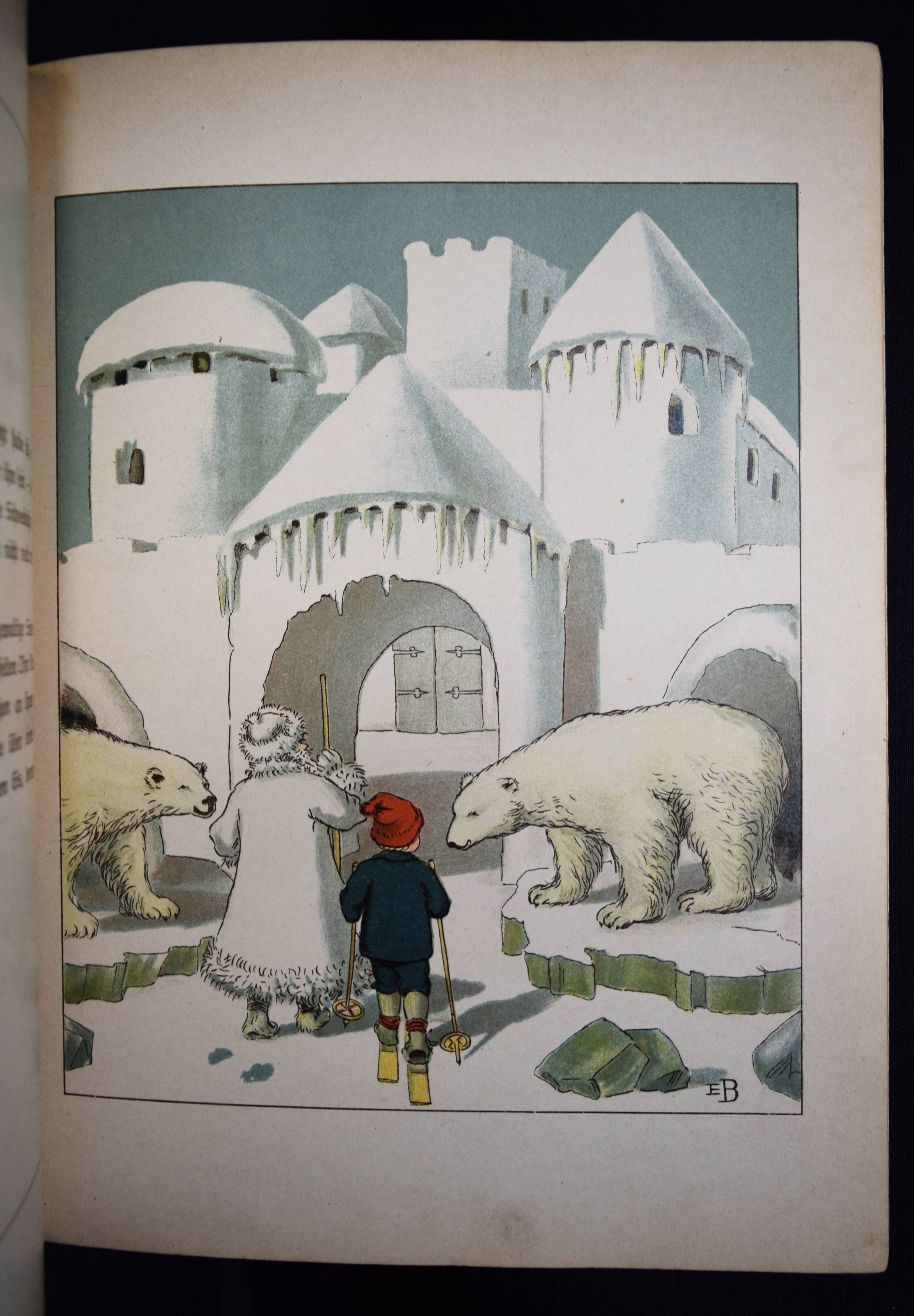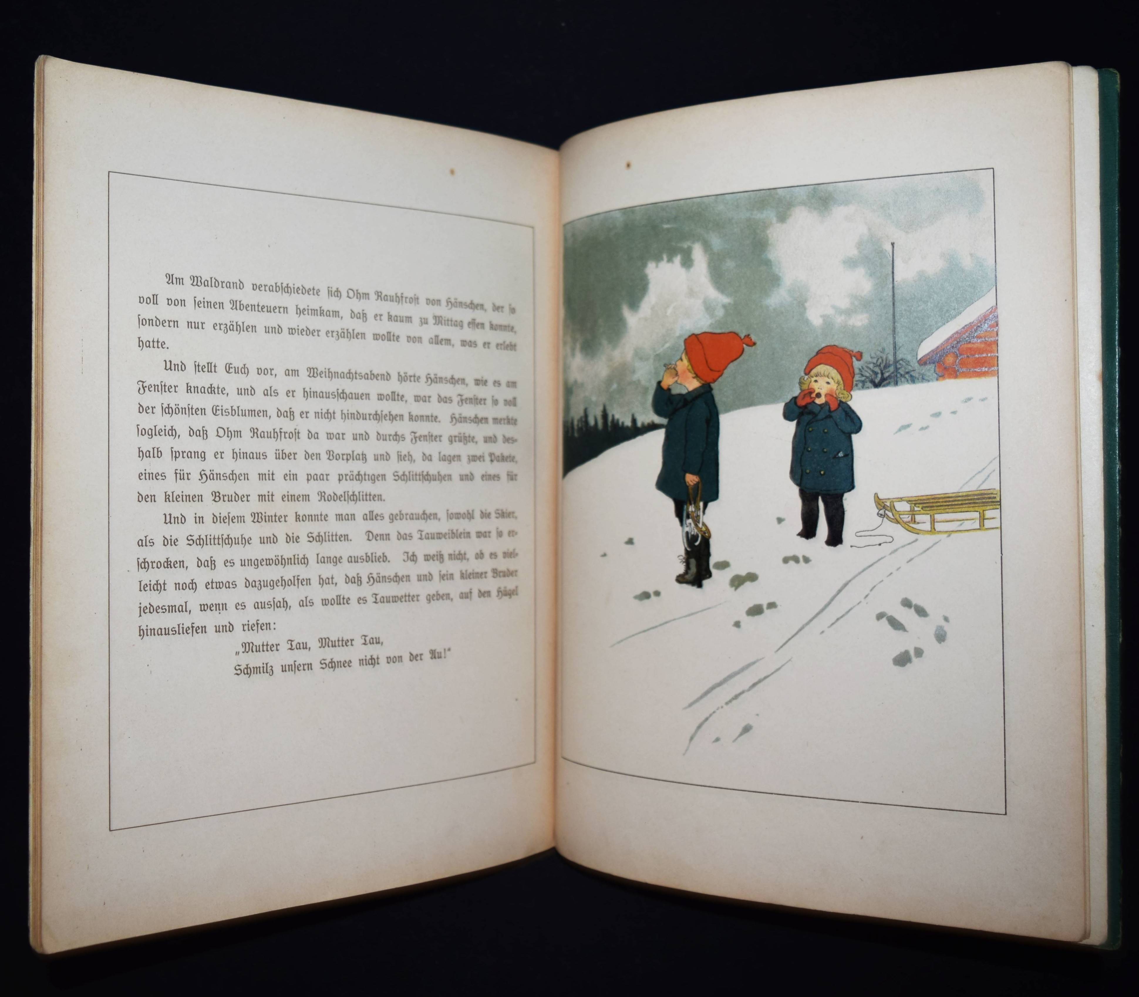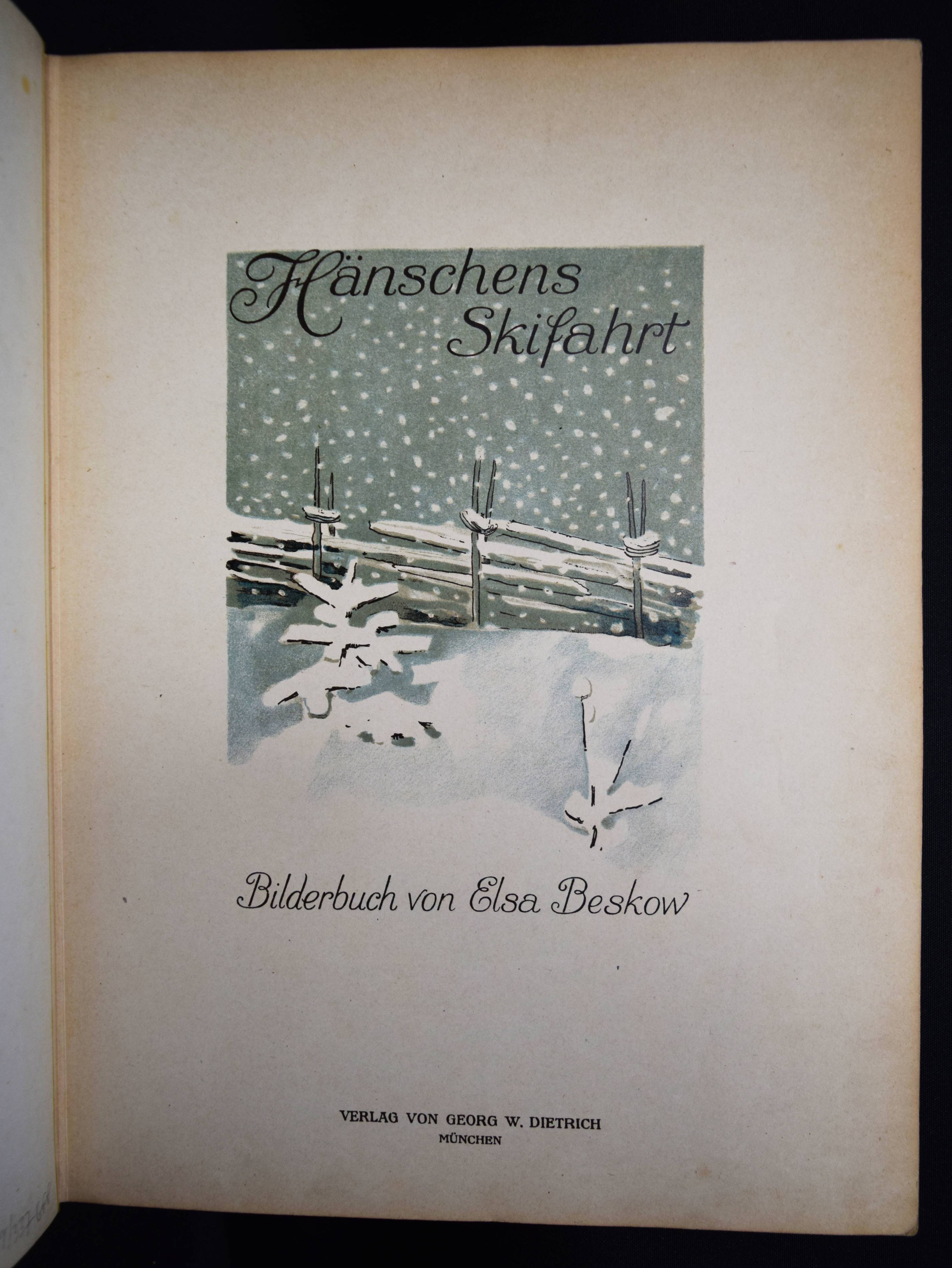 Beskow, Elsa. Hänschens Skifahrt. Bilderbuch. (Text von M. Cornelius). München, Georg W. Dietrich o. J. (1908). 4°. [15] Bl. mit farbig illustr. Titel und 14 (13 ganzs.) farblithogr. Illustrationen. Farbig illustr. Orig.-Halbleinenband mit illustr. Vorsätzen (Hänschen beim Skifahren). (Dietrichs Münchener Künstler-Bilderbücher, Band 2). Bilderwelt 2828. LKJ I, 143. Liebert, Dietrich 2. Ries 435, 3. – Erste deutsche Ausgabe des wohl ersten Bilderbuchs zum Skifahren. Die schwedische Orig.-Ausgabe erschien 1907 in Stockholm mit dem Titel „Olles skidfärd“ mit Versen von E. Beskow. – „Olle’s Ski Trip. (1907) zeigt kindgemäße Bild- und Textkomposition zum Schilauf eines kleinen Jungen und eine eindringliche Wiedergabe des schwedischen Winters. Künstlerische Anstöße kommen aus dem Schaffen W. CRANES – eine Ausstellung seiner Werke in Stockholm 1896 beeinflußte ihre Arbeit nachhaltig“ (H. Künnemann in LKJ). – Einband etwas angestaubt und leicht fleckig, im unteren Blattrand leicht fingerfleckig, gutes Exemplar.