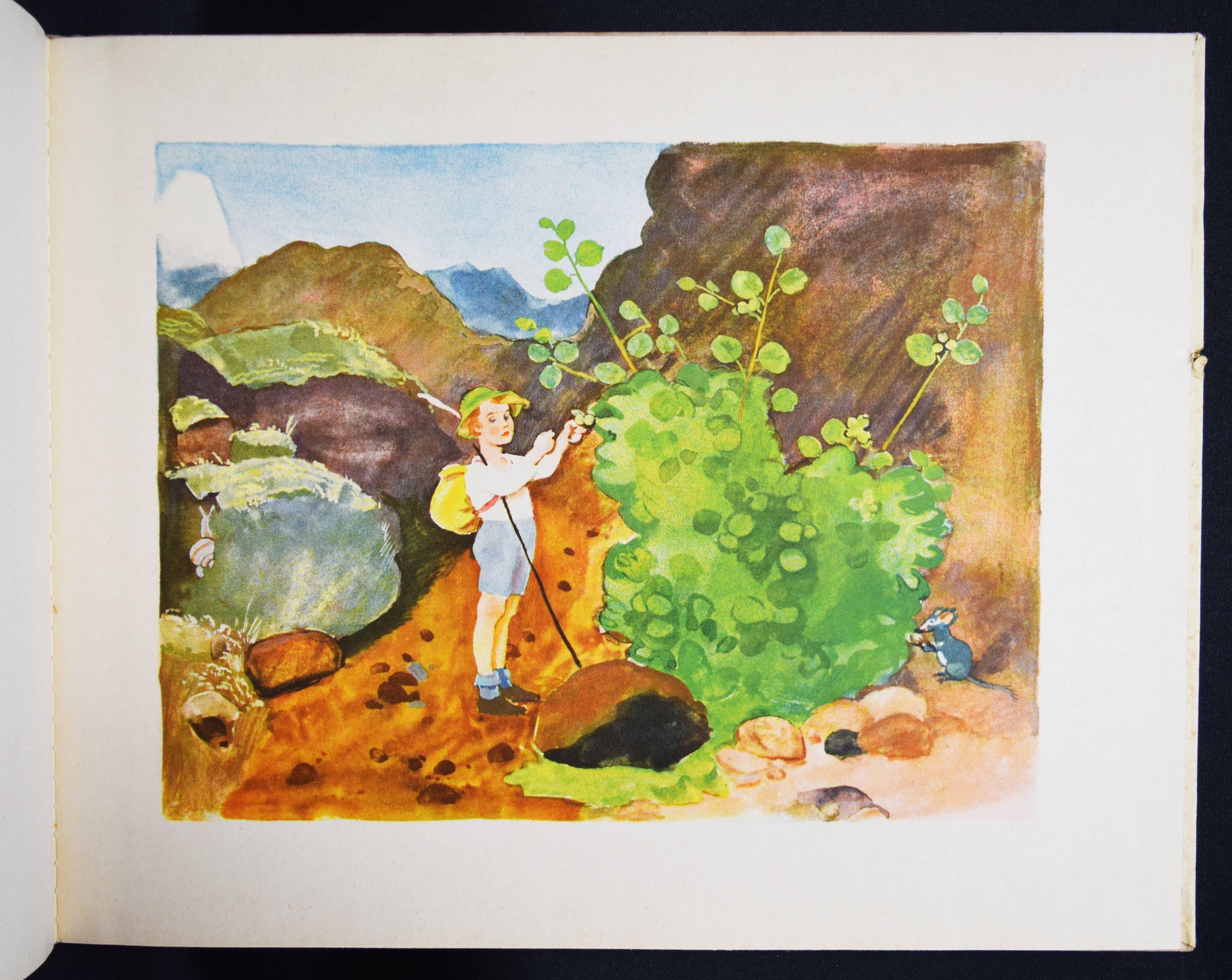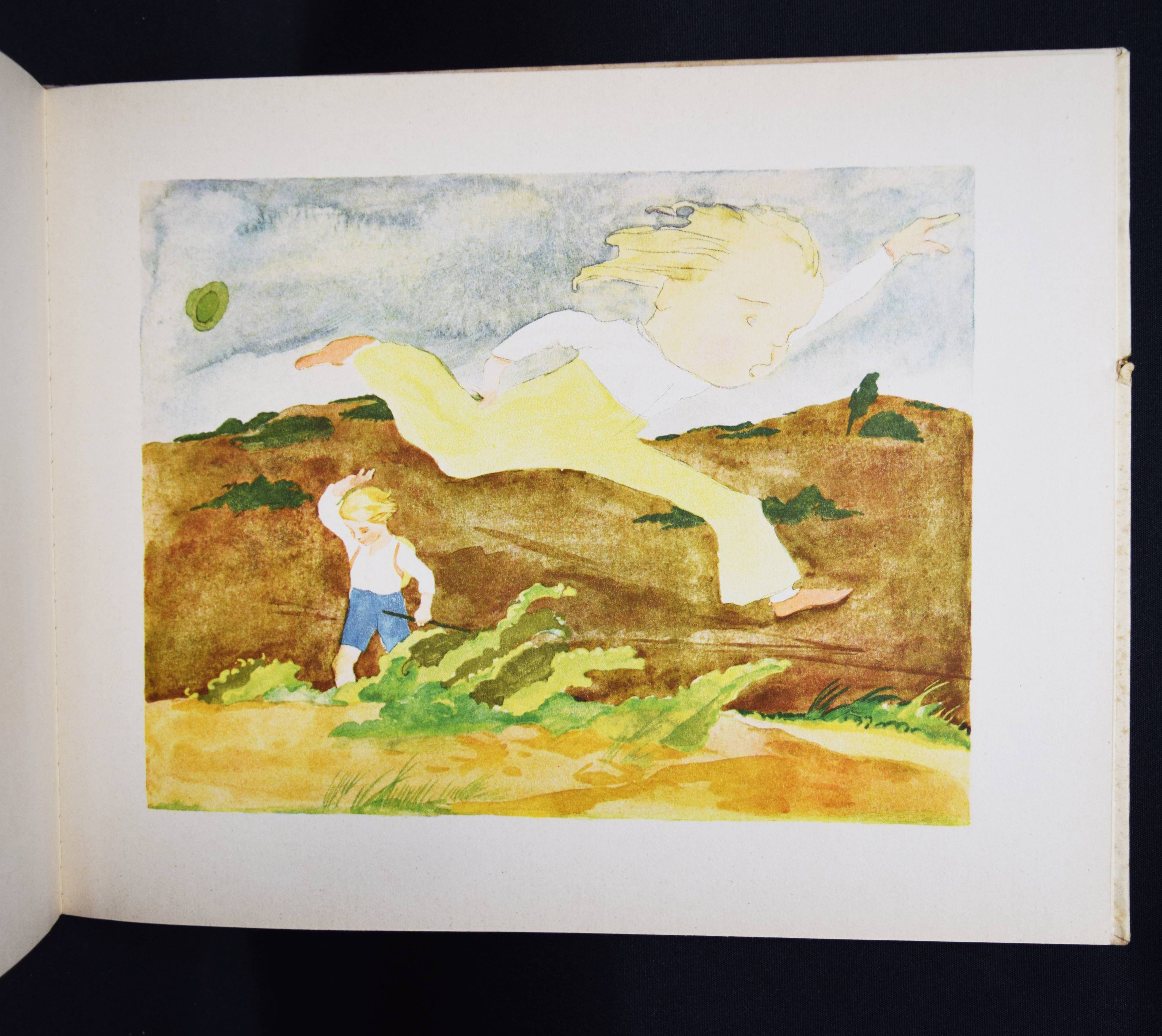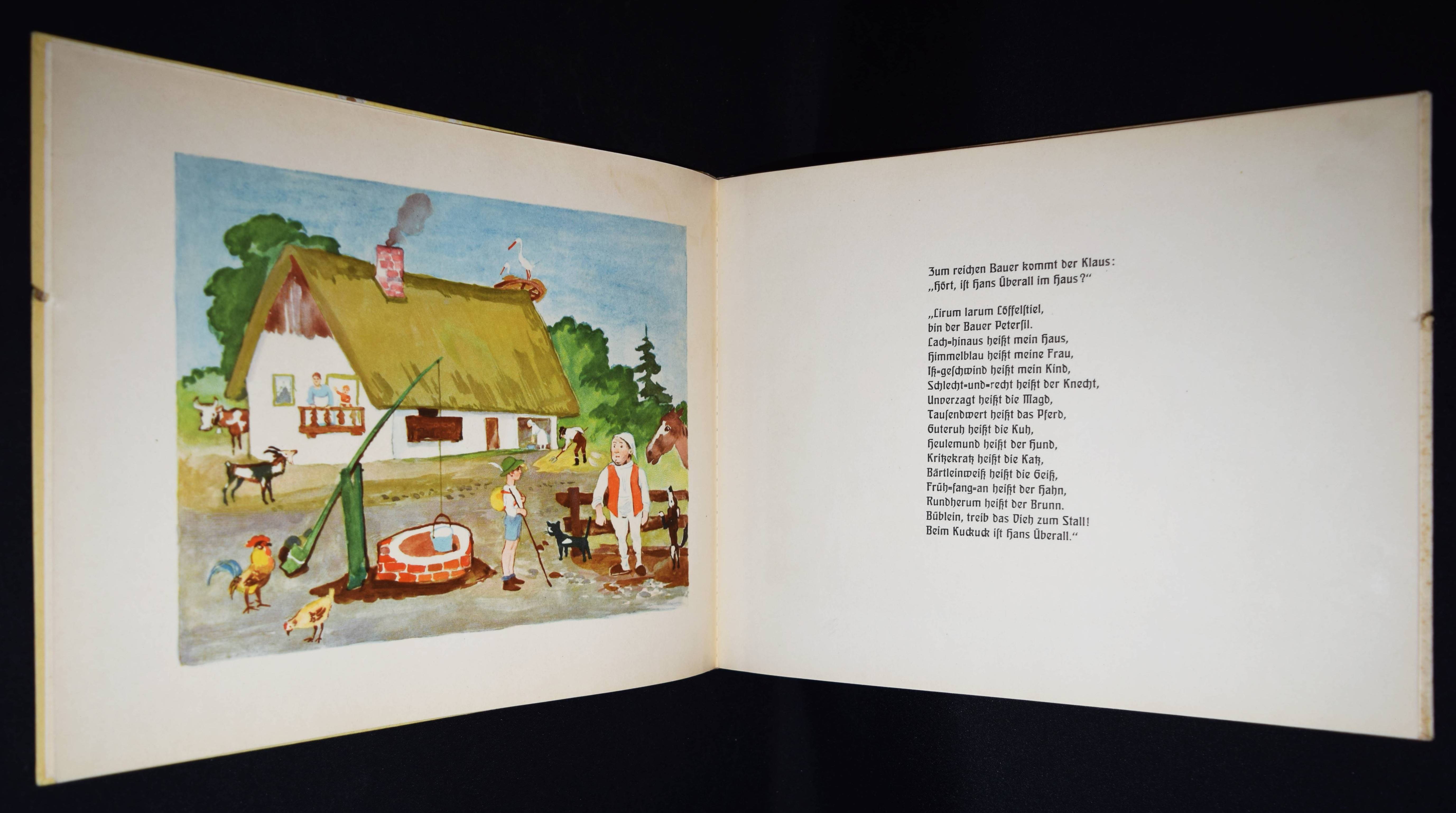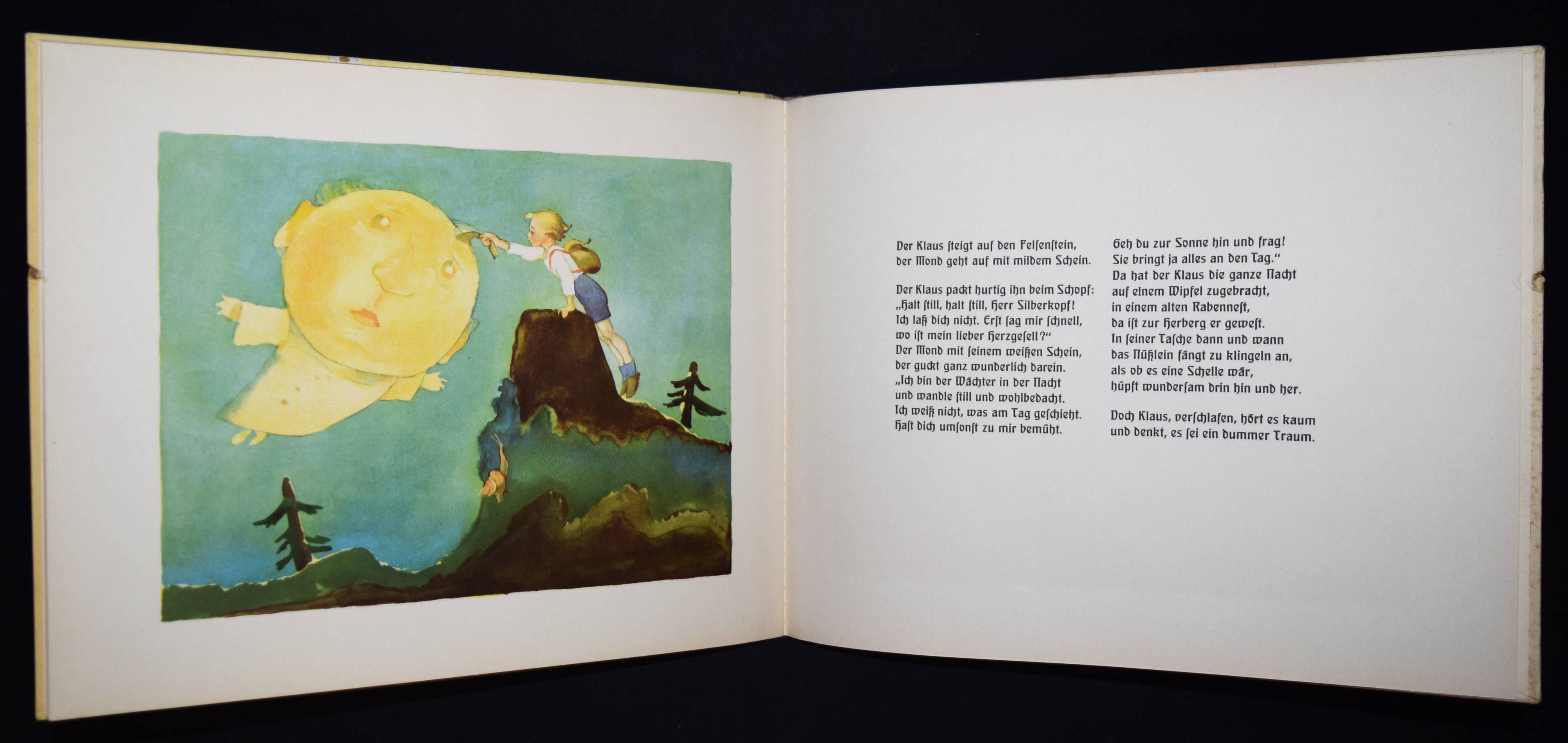 Watzlik, Hans. Wo steckt Hans Überall. Bilder von Georg Walter Rössner. Köln, Herrmann Schaffstein 1932. Quer-4°. [13] Bl. mit farb. illustr. Titel u. 12 ganzs. farb. Illustrationen. Farbig illustr. Orig.-Halbleinenband. Slg. Hürlimann 1670. Klotz 7938/18. – Einzige Ausgabe dieses seltenen Künstler-Bilderbuchs. – Der Maler und Graphiker G. W. Rössner (geb. 1885 in Leipzig) war Schüler von L. Corinth und seit 1920 Professor an der Staatlichen Kunstschule in Berlin, später (seit 1934) an der Staatlichen Hochschule für bildende Künste (vgl. Vollmer IV, 91). – Der aus Böhmen stammende Romanschriftsteller und Jugendbuchautor H. Watzlik (1879-1948) hat vorwiegend Märchen und Sagenstoffe für Kinder bearbeitet (vgl. H. Bertlein in LKJ III, 766 f., verz. vorliegenden Titel nicht). – „Diese gereimte Kindermythologie trägt der kindlichen Vorstellung urhafter Dinge Rechnung und führt schalkisch und abenteuerlich in den tiefen deutschen Wald hinein zu Bauer und Jäger und seltsamem Getier, zu den Geschöpfen des Märchens, zu Wassergeist, Moosfrau, Glühebold und Himmelsvogel und endlich zu Wind und Mond und Sonne“ (H. Watzlik in der Verlagswerbung). – Deckel an der Vorderkante geringf. beschädigt, lädierter Orig.-Schutzumschlag liegt bei, sehr gutes sauberes Exemplar.