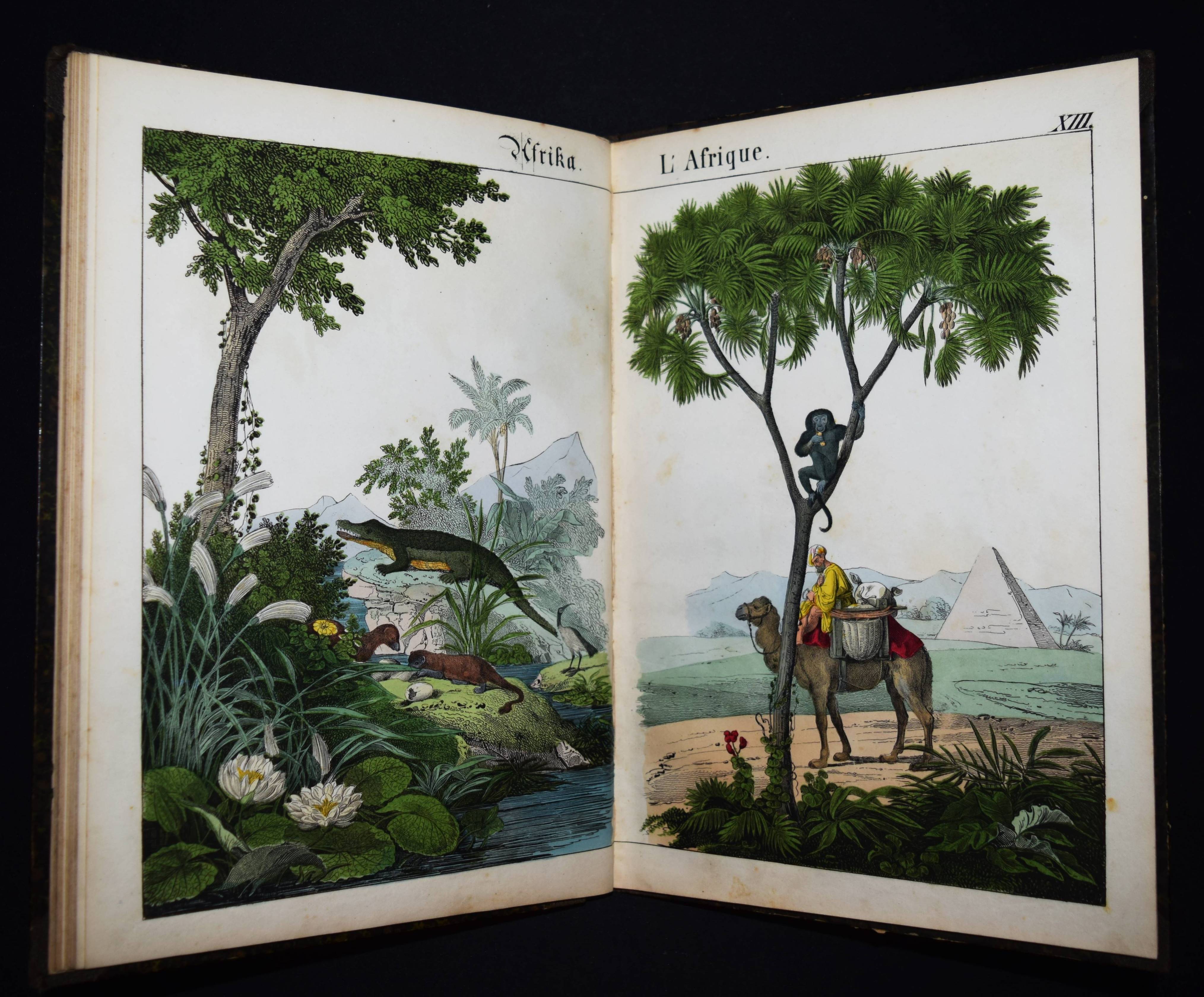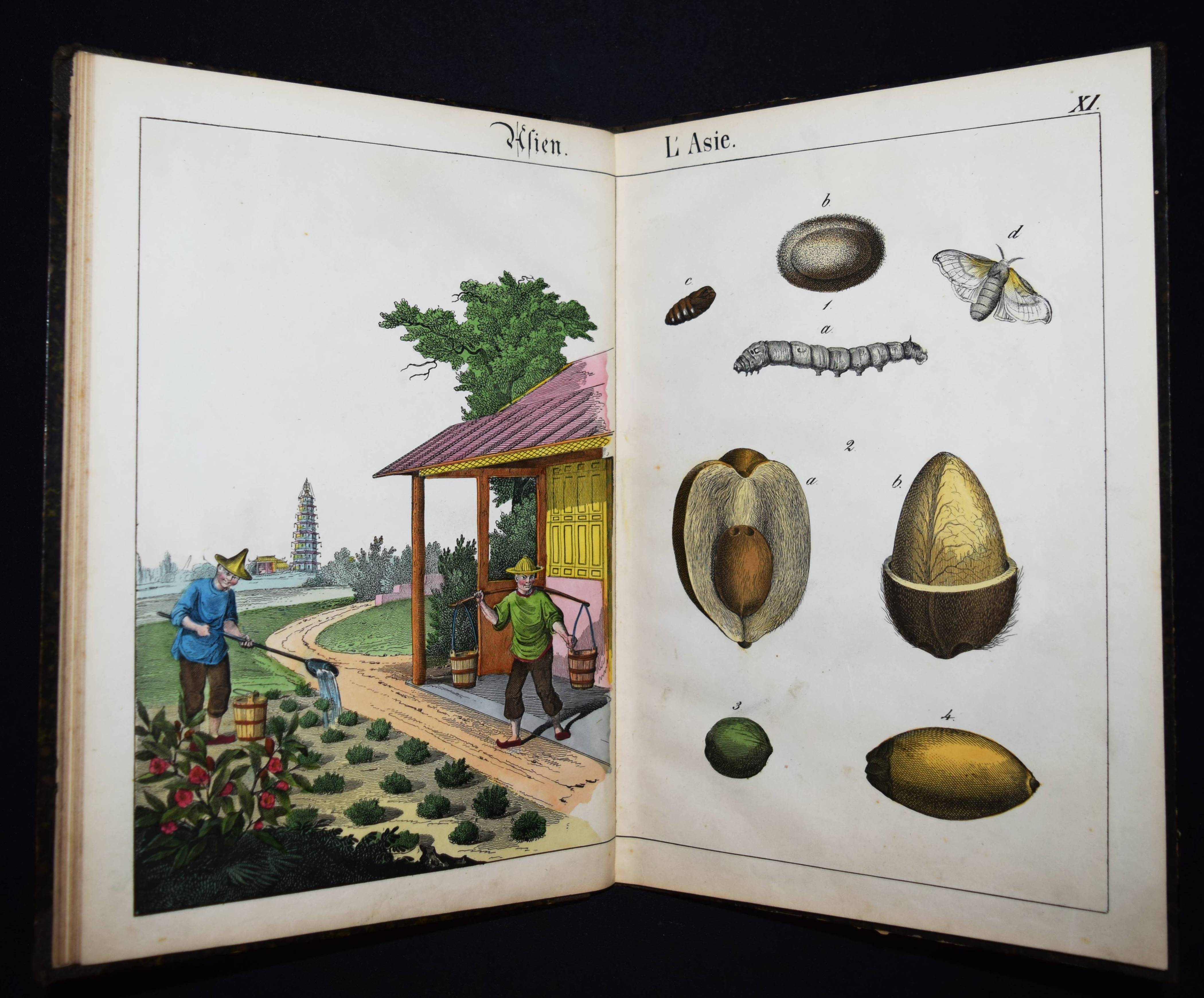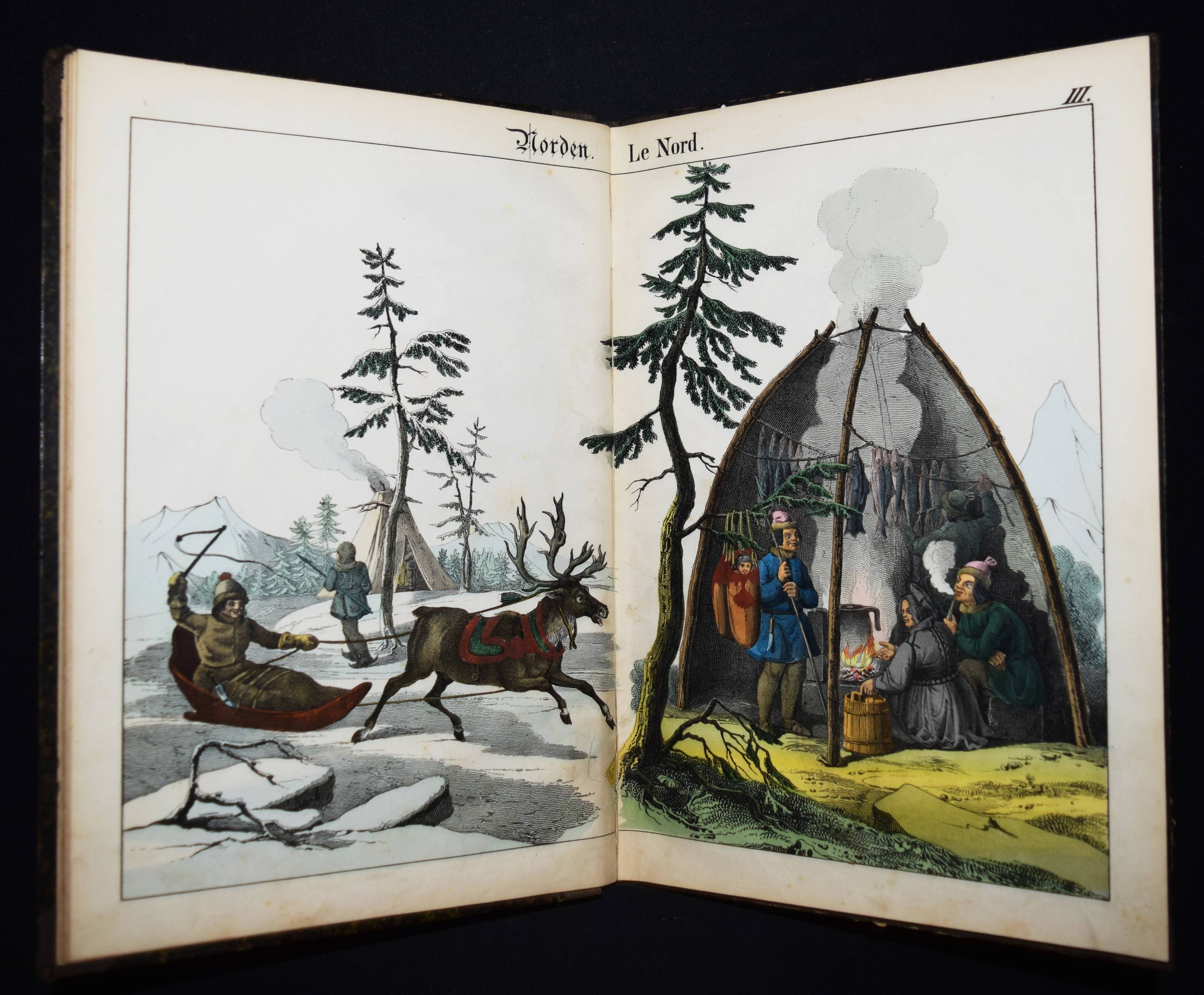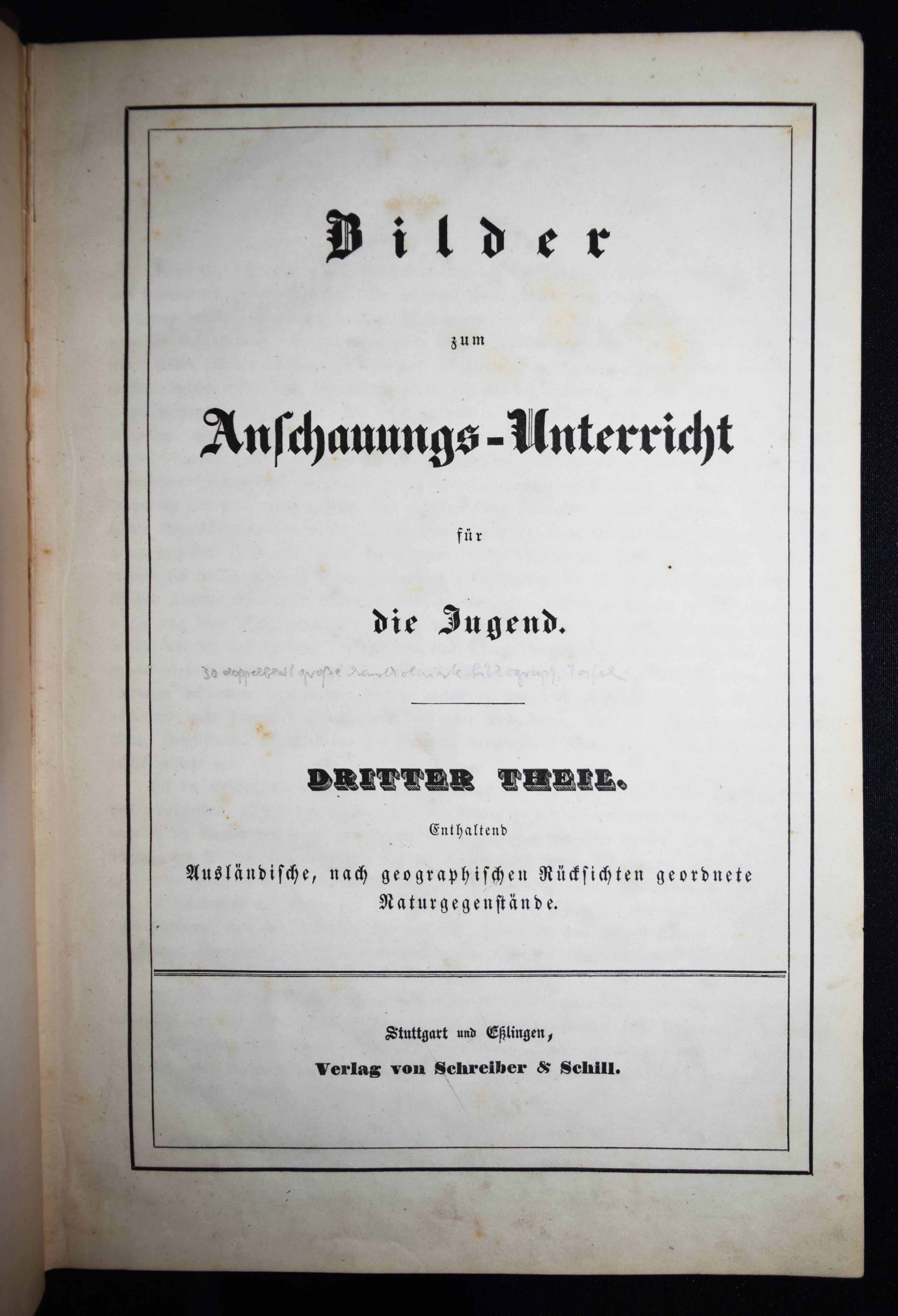 (Schmid). Bilder zum Anschauungs-Unterricht für die Jugend. Dritter Theil. Enthaltend ausländische, nach geographischen Rücksichten geordnete Naturgegenstände. Stuttgart und Esslingen, Schreiber & Schill o.J. (1846). 4°. [2] Bl., 26 S. (Text) und 30 doppelblattgr. handkol. lithogr. Tafeln von D(avid) Englert (u. a. ?). Halbleinenband der Zeit. Brunken-Hurrelmann-Pech 79 Anm. Doderer/Müller 153. Klotz, Bilderbücher 1279/1. – Zweite Ausgabe des seltenen dritten Teils dieses erfolgreichen Anschauungsbilderbuchs; die erste Ausgabe erschien 1844. Der Verlag hat erst ab 1846 (bis 1862) als „Schreiber & Schill“ firmiert. Die Vorrede stammt von Rektor Schmid. – Die schönen sorgfältig kolorierten Tafeln zeigen Tiere, Pflanzen sowie die Lebens- und Arbeitsweisen der Menschen aus Afrika, Amerika, Asien und der Polarregion. Mit Inhaltsverzeichnis in Deutsch und Französisch. – Einband leicht berieben, sehr gutes sauberes Exemplar.
